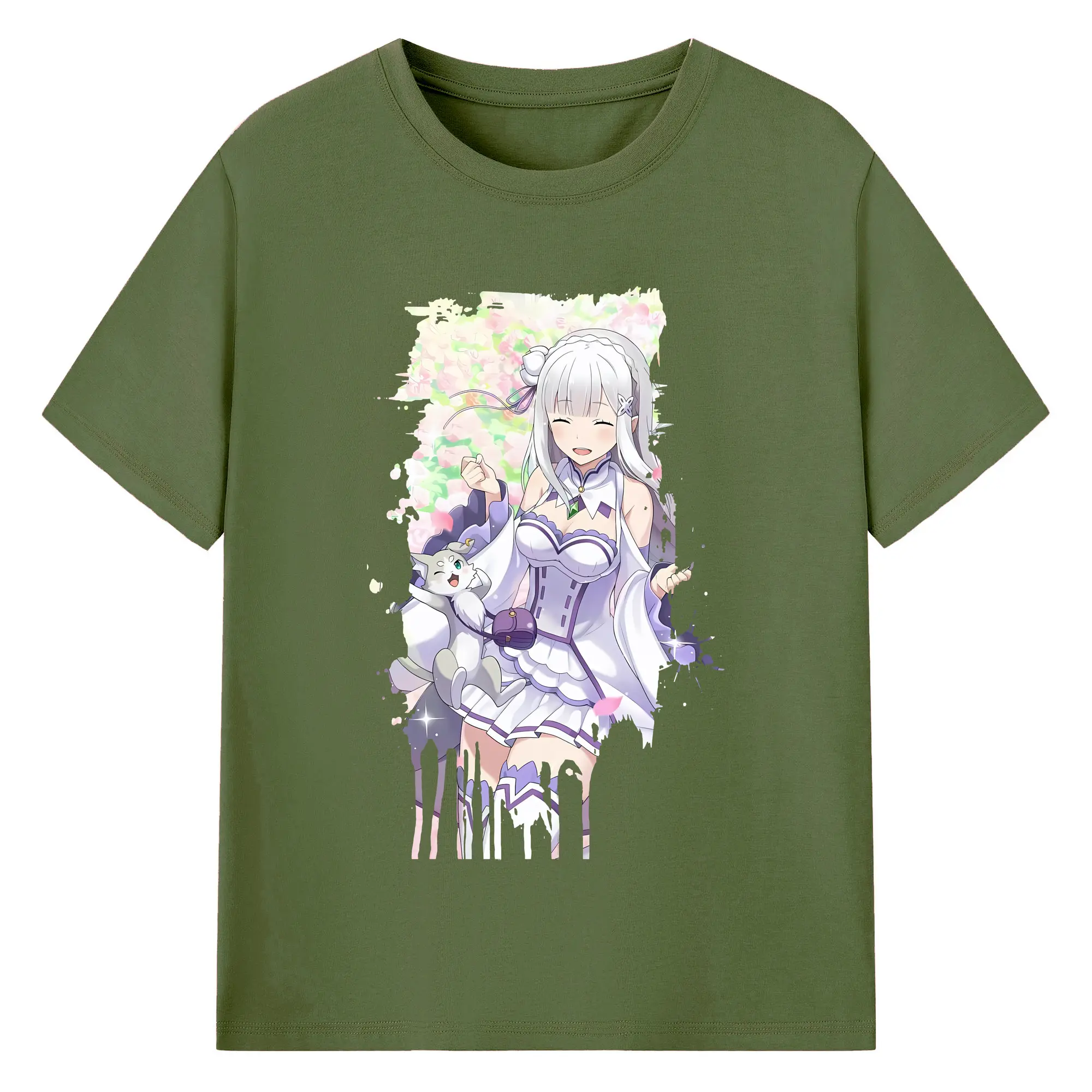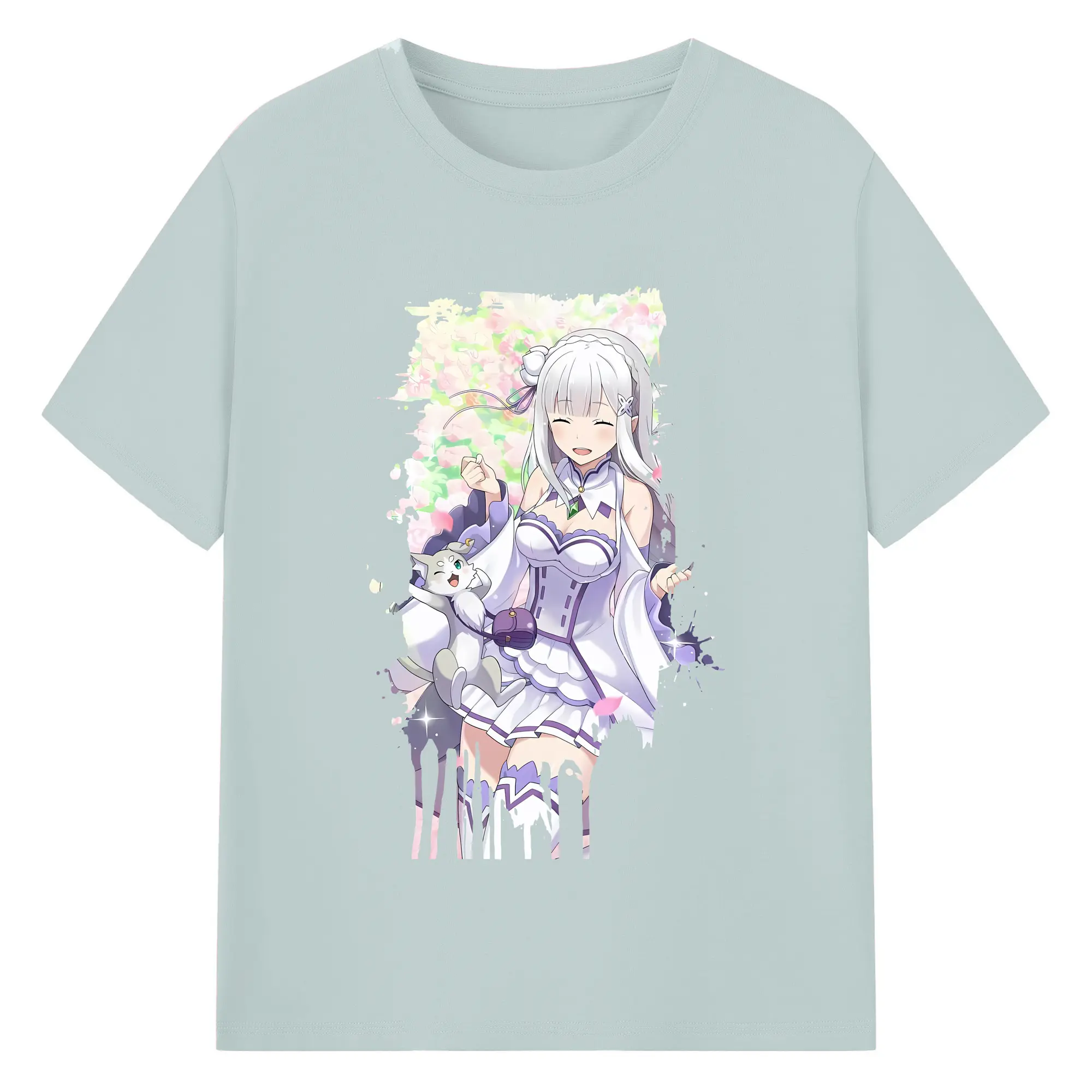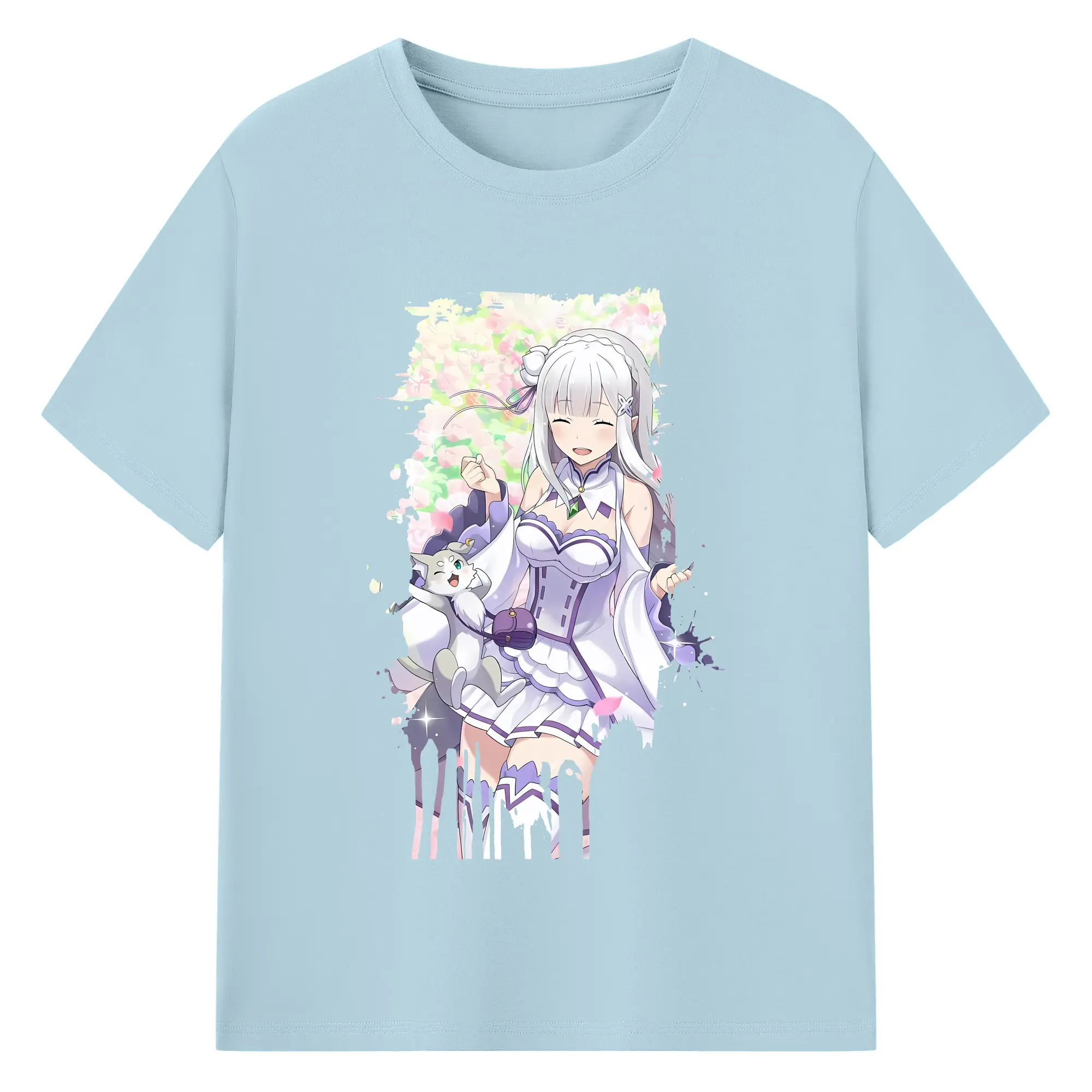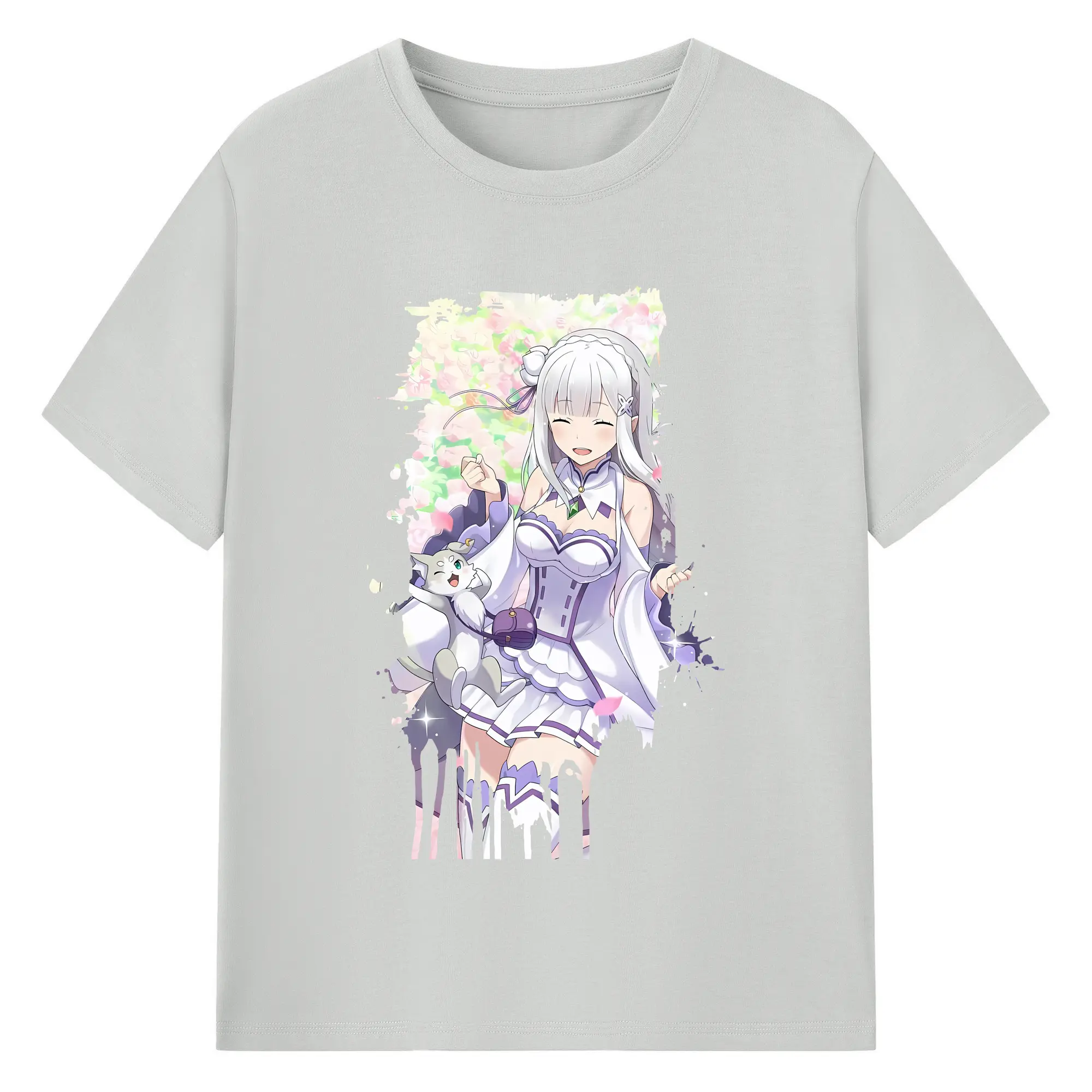 リゼロ グッズ エミリア - 綿100% 半袖Tシャツ ・ バックプリント ・ 快適 通気性 ・ 日常使い 散歩 スポーツ用