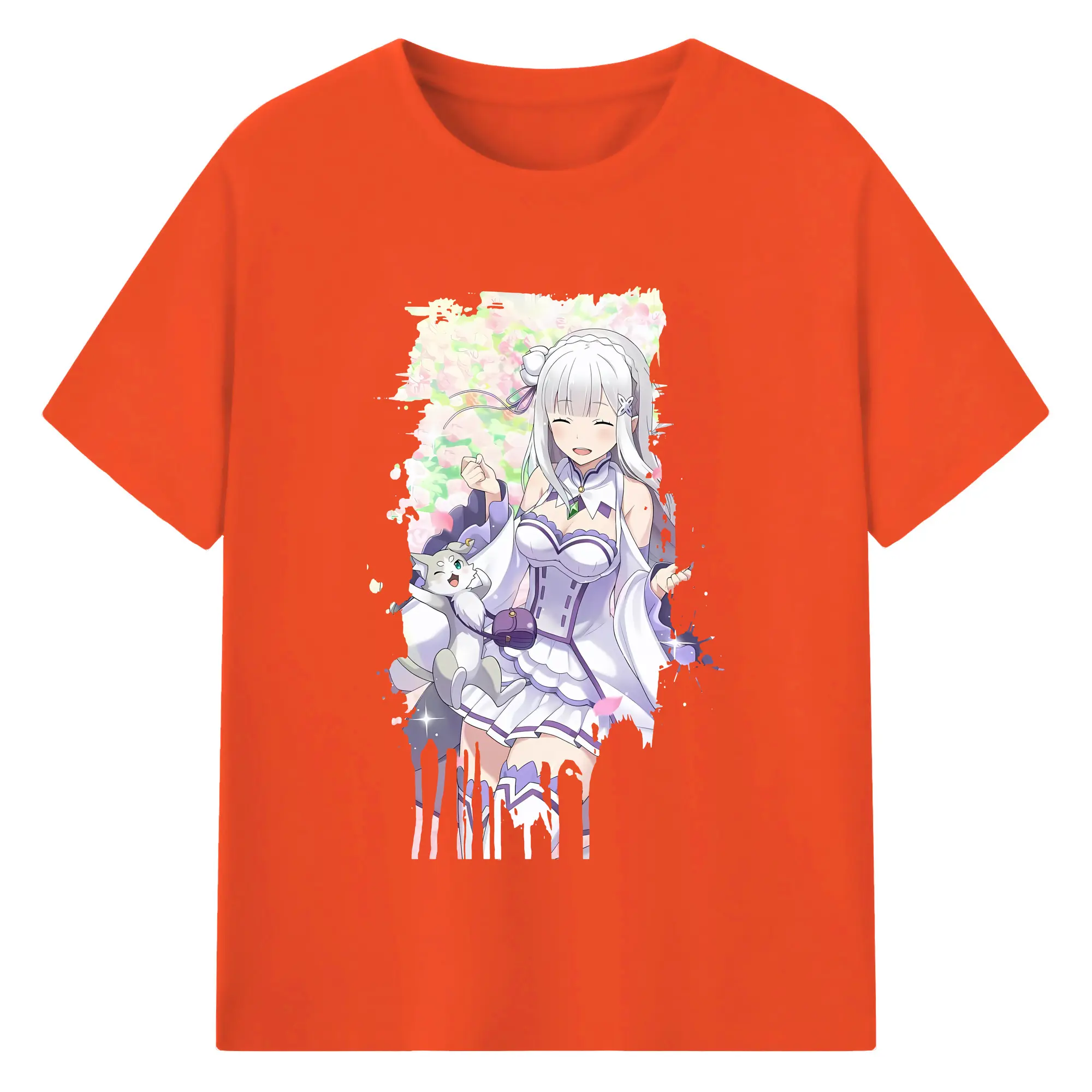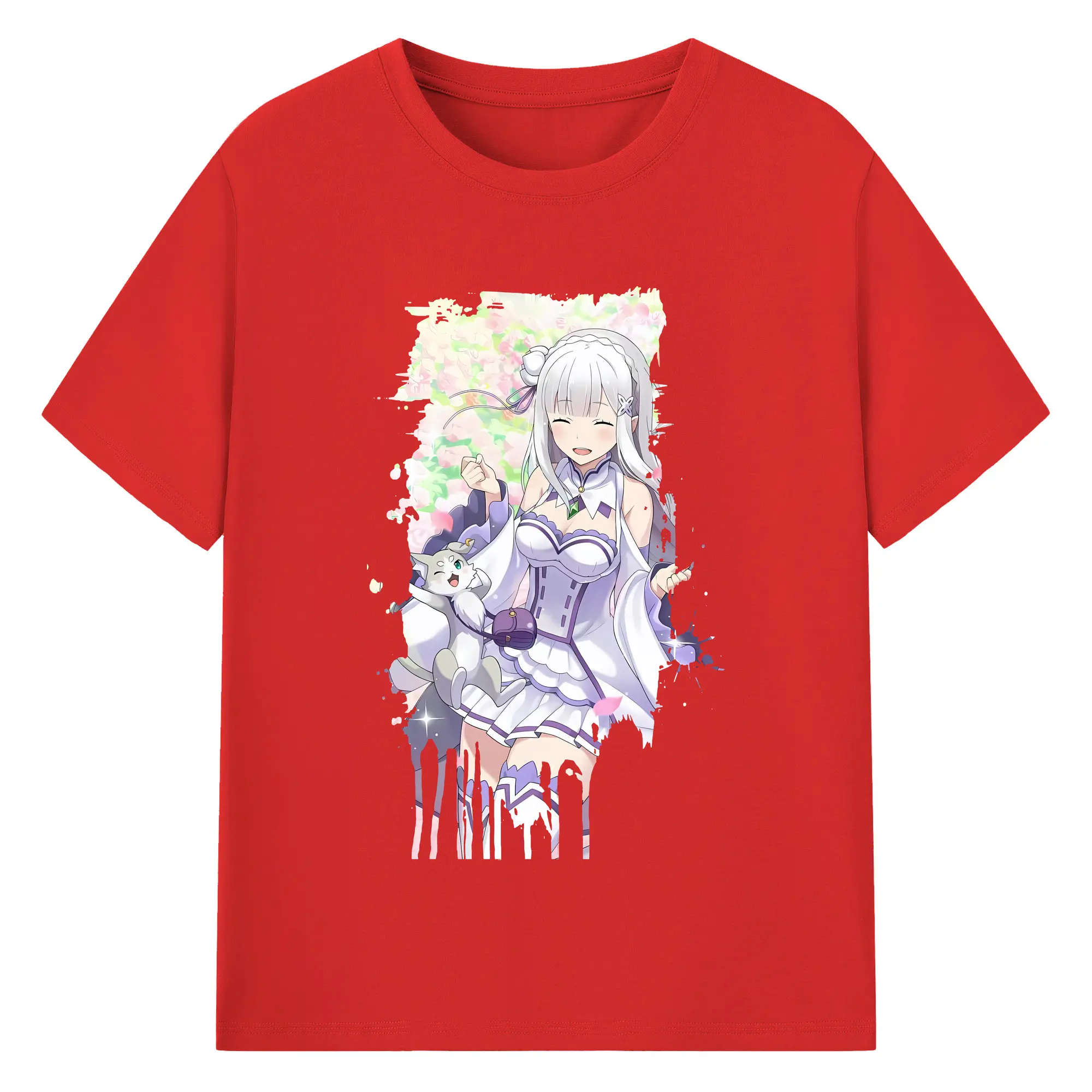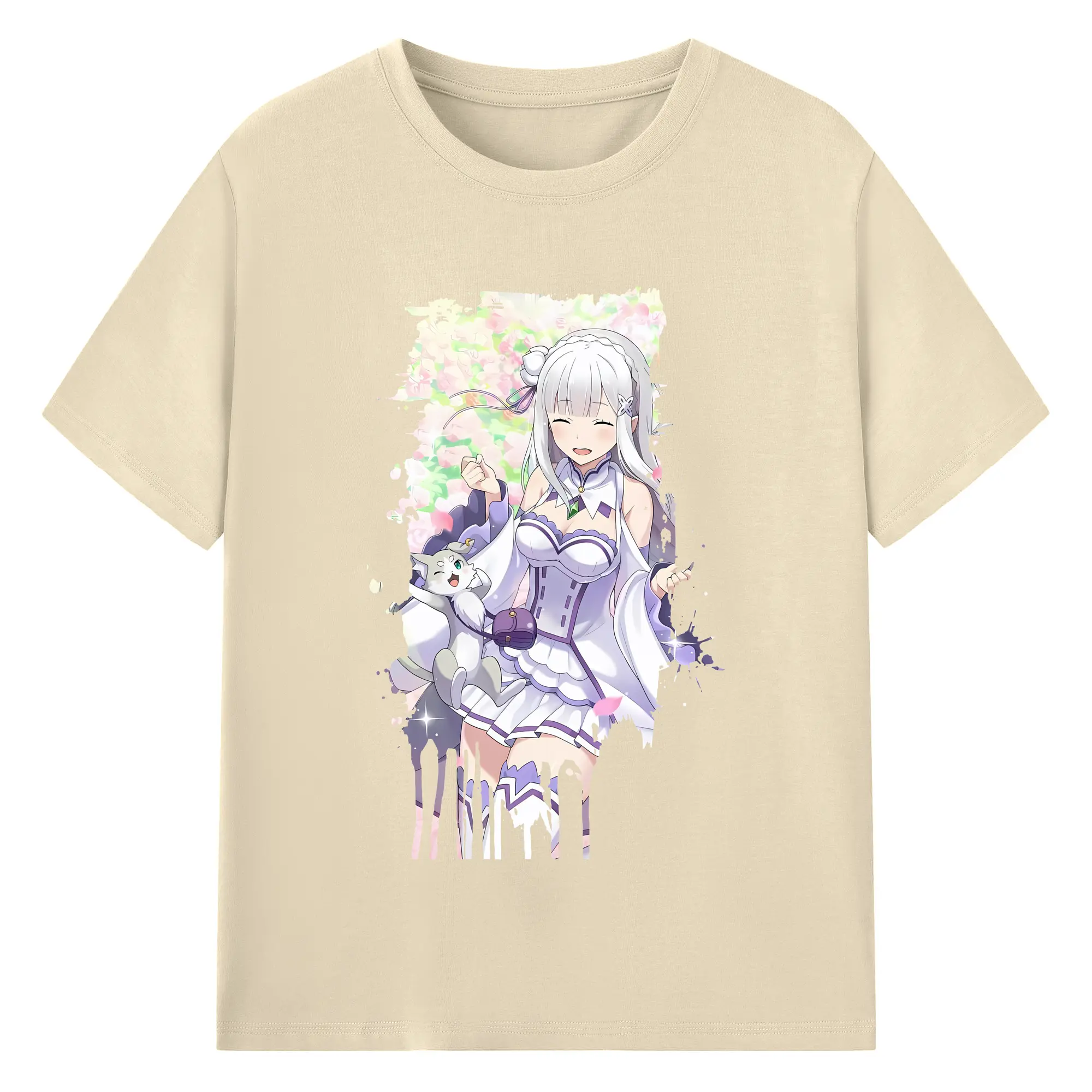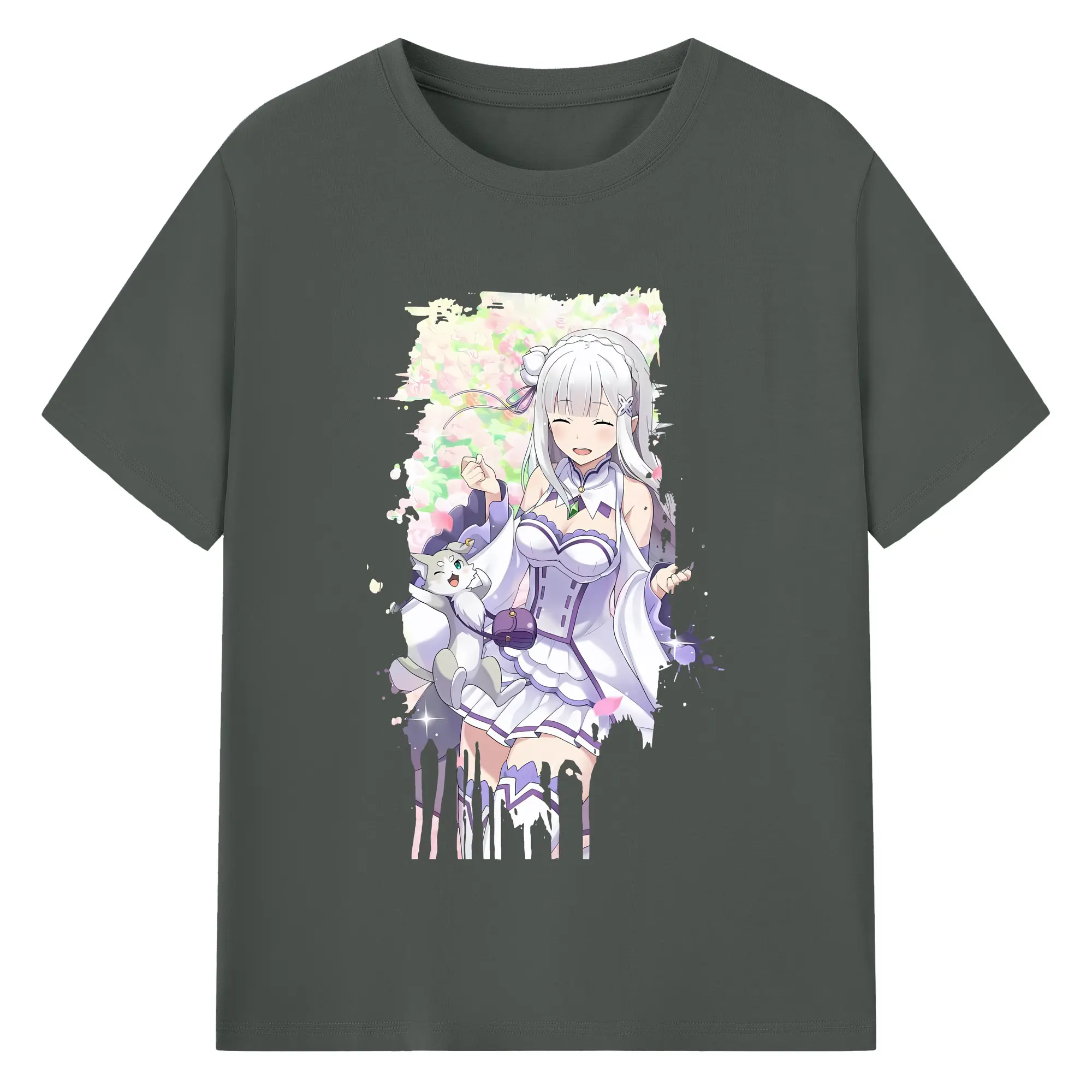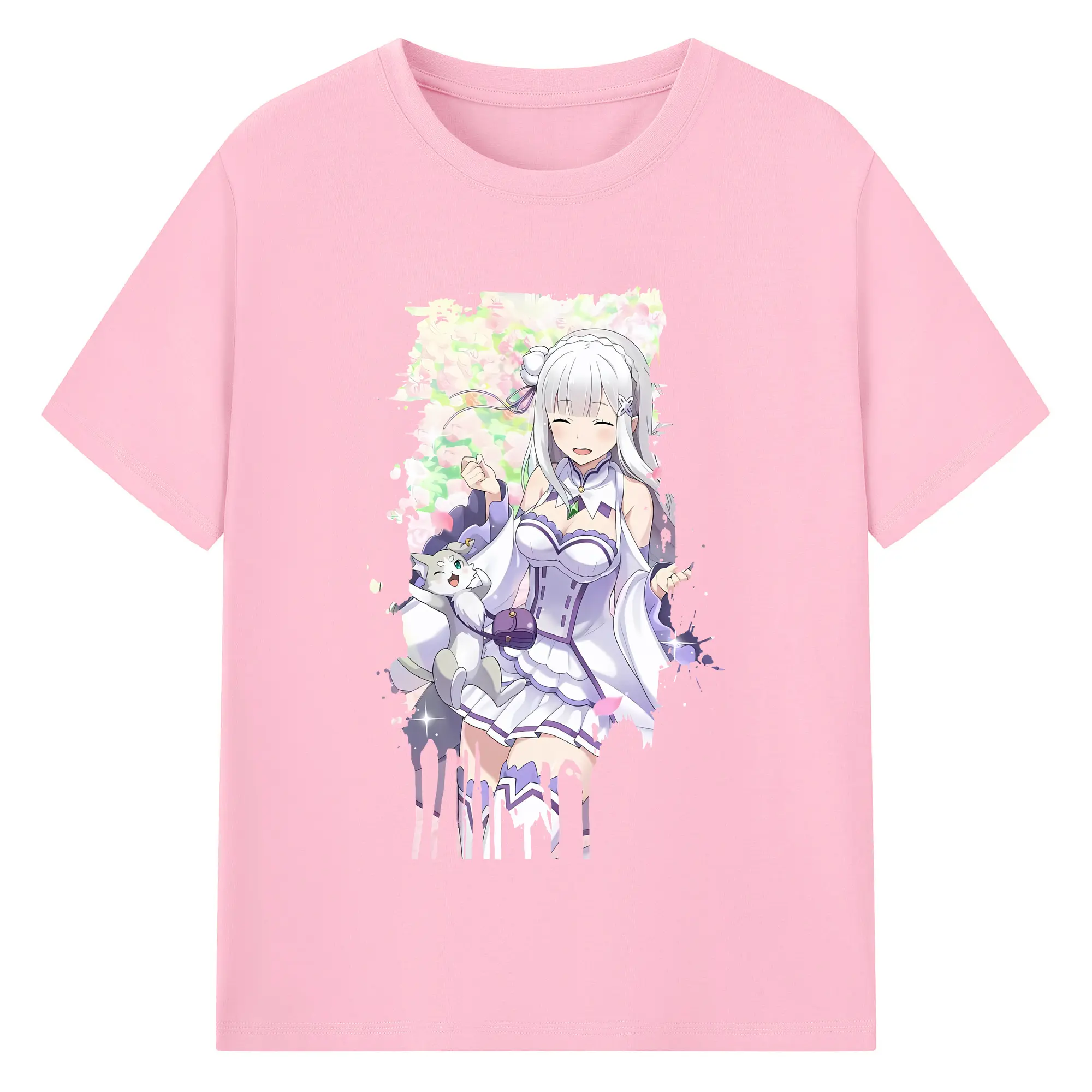 リゼロ グッズ エミリア - 綿100% 半袖Tシャツ ・ バックプリント ・ 快適 通気性 ・ 日常使い 散歩 スポーツ用