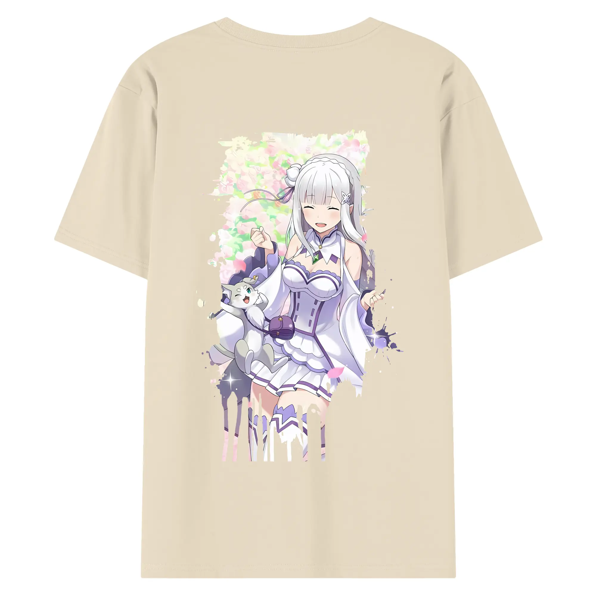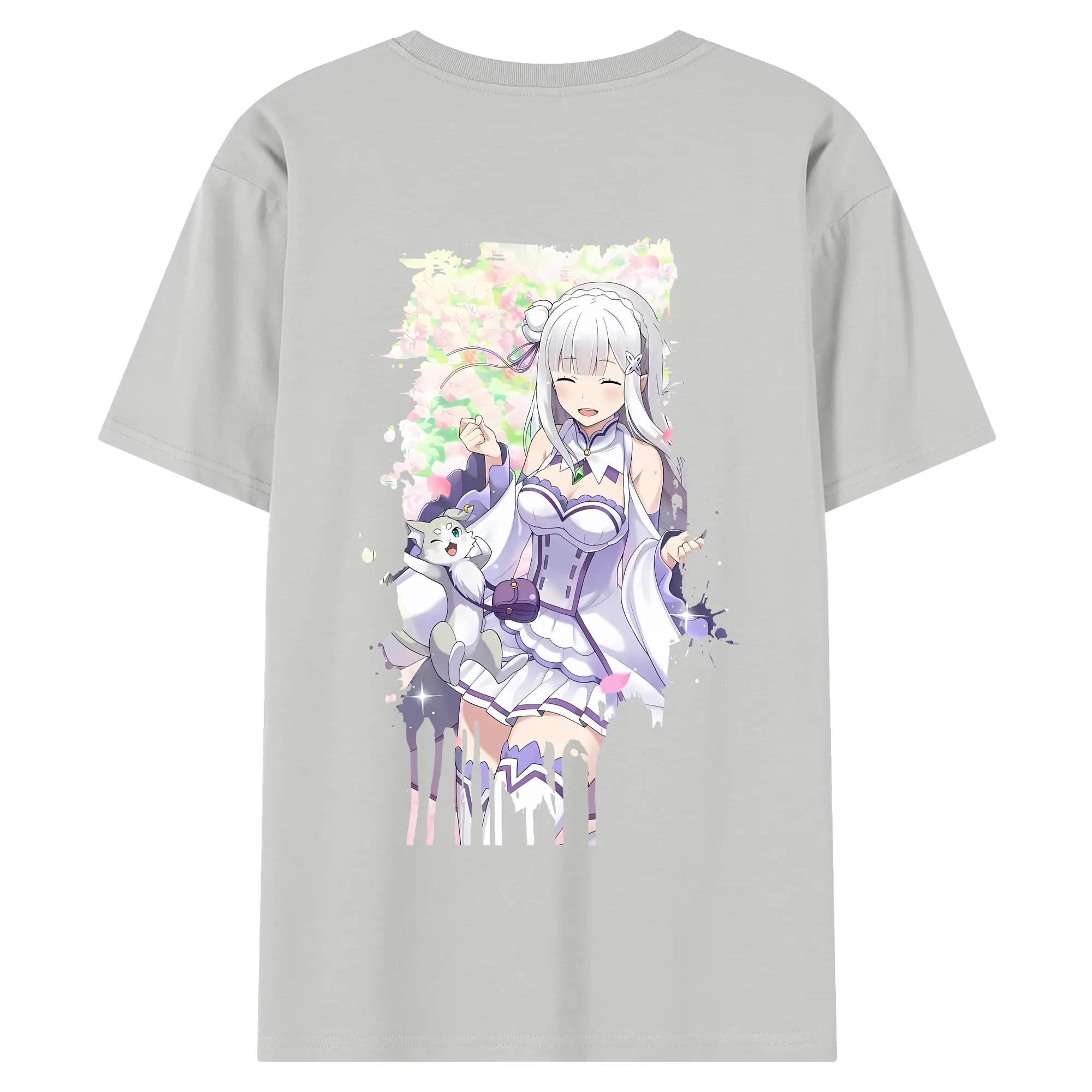 リゼロ グッズ エミリア - 綿100% ヴィンテージ風 半袖Tシャツ ・ 背面プリント ・ 柔らか肌触り ・ 通気性 快適 ・ スポーツ カジュアル 外出用