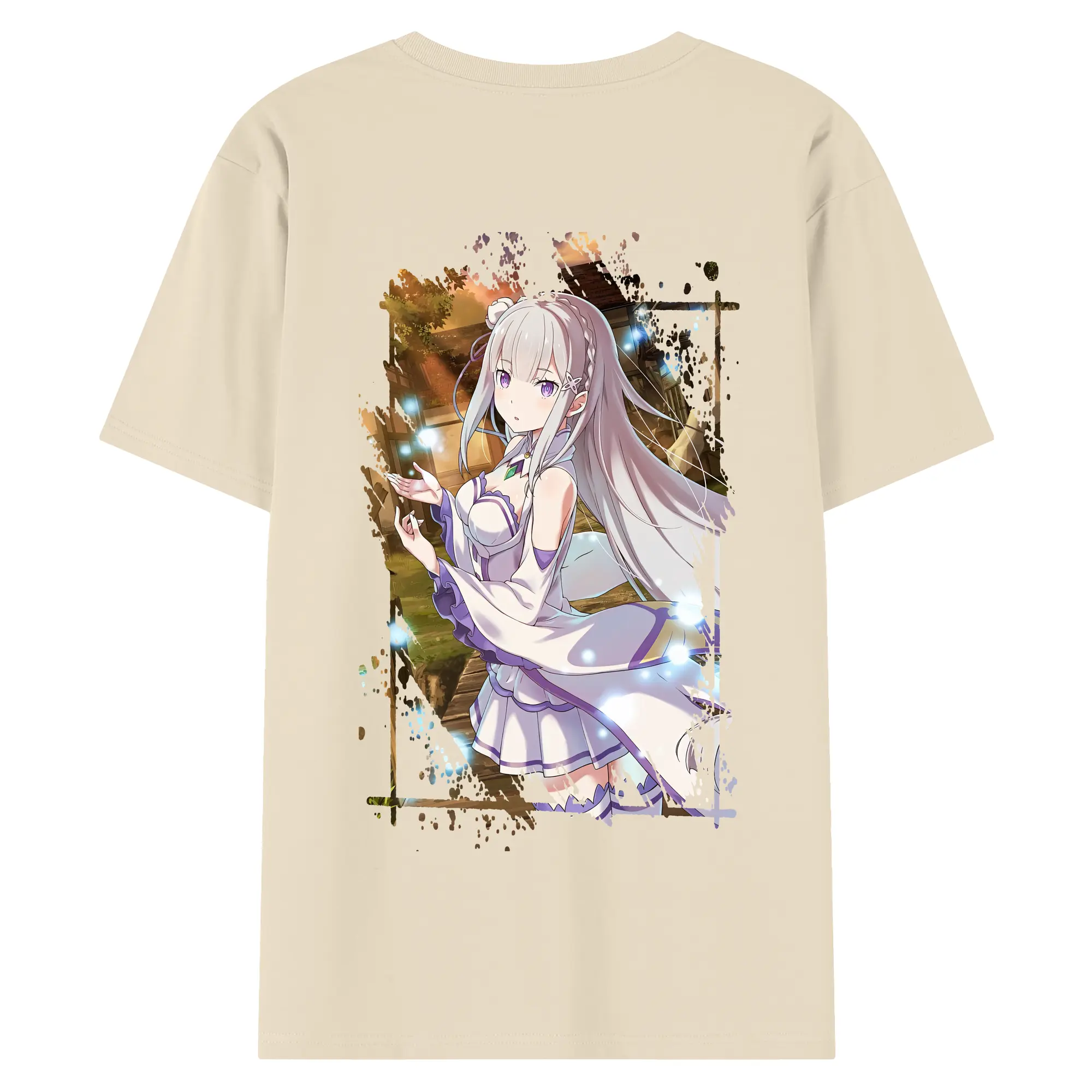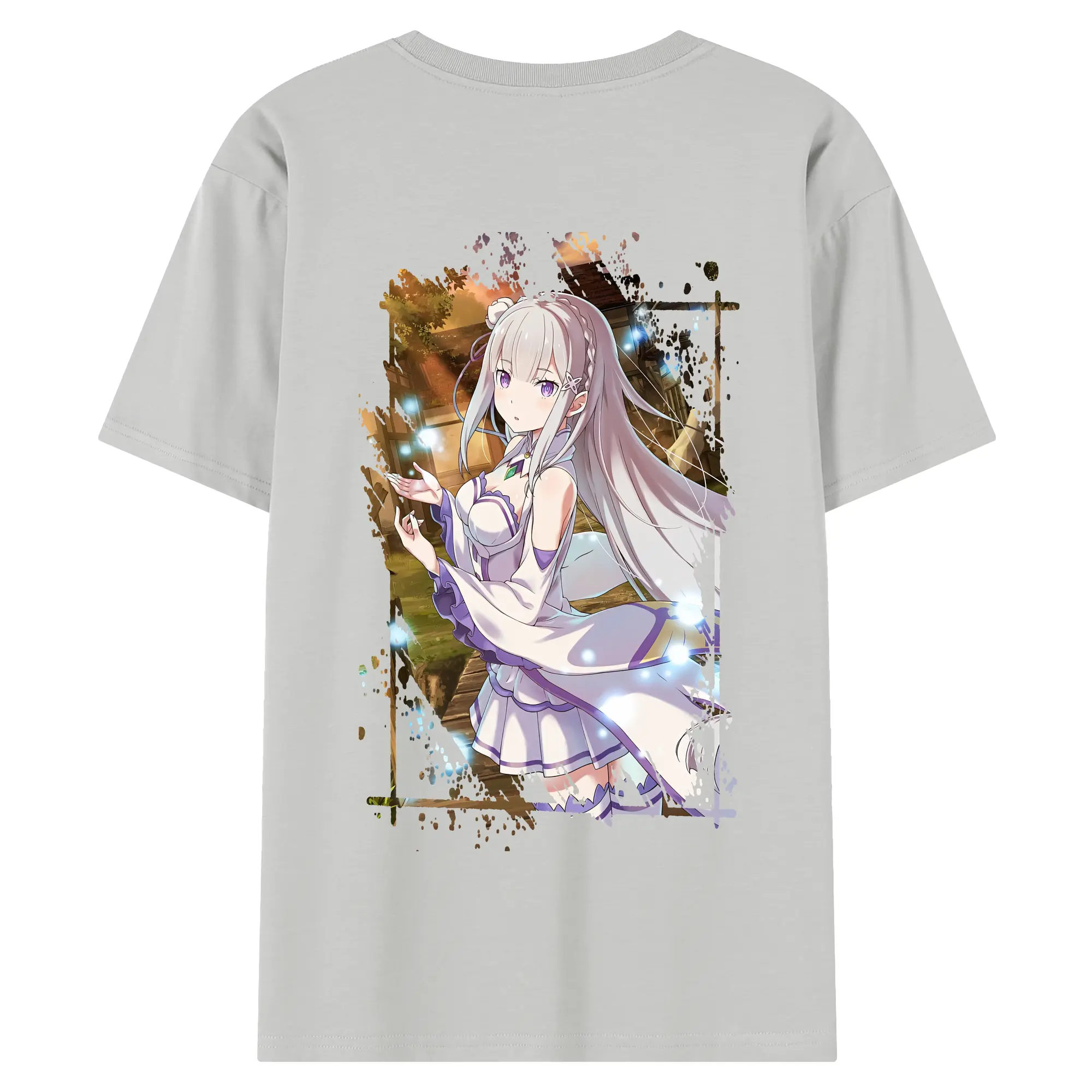 リゼロ グッズ エミリア - 綿100% ヴィンテージ風 半袖Tシャツ ・ 背面プリント ・ 柔らか肌触り ・ 通気性 快適 ・ スポーツ カジュアル 外出用