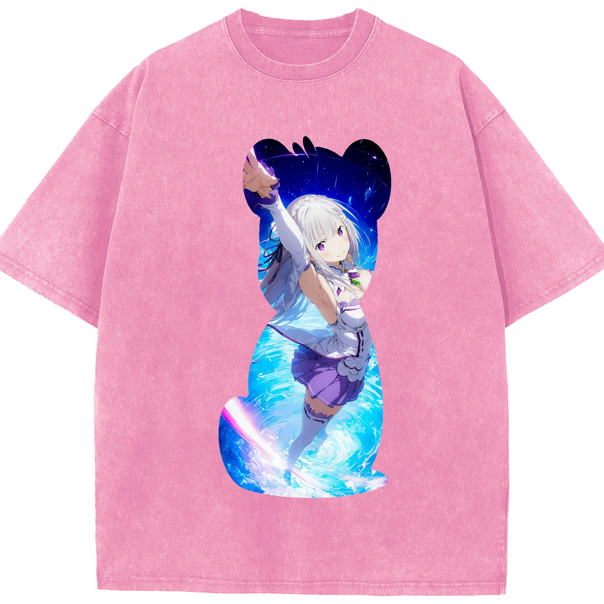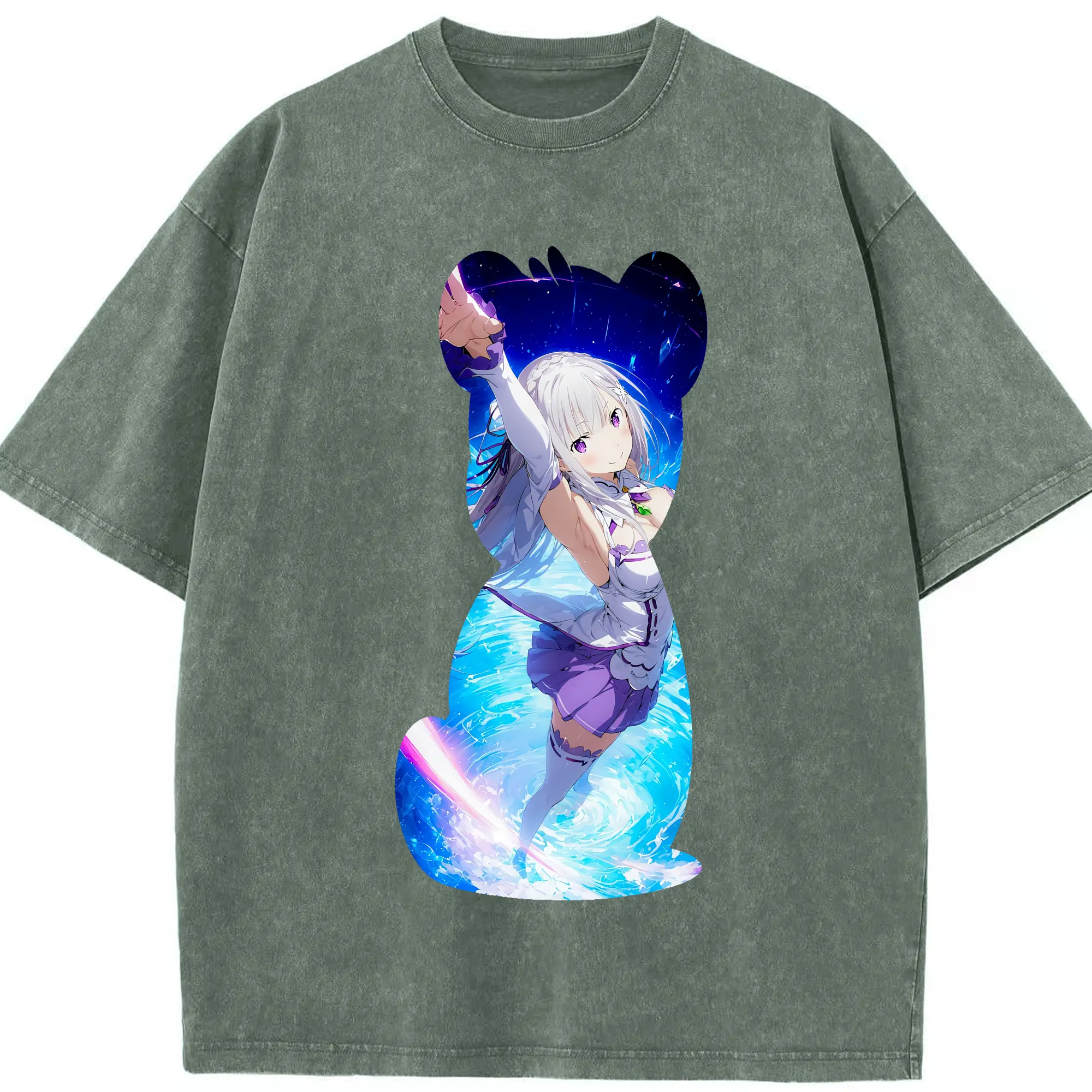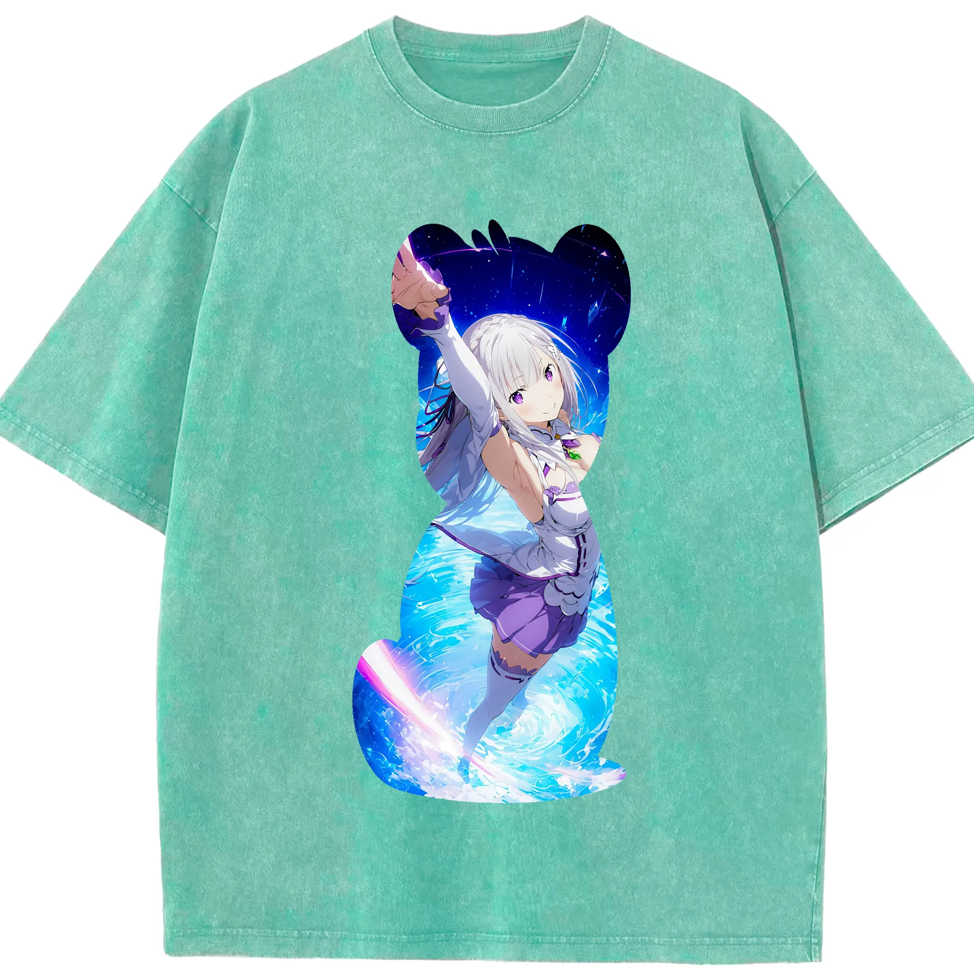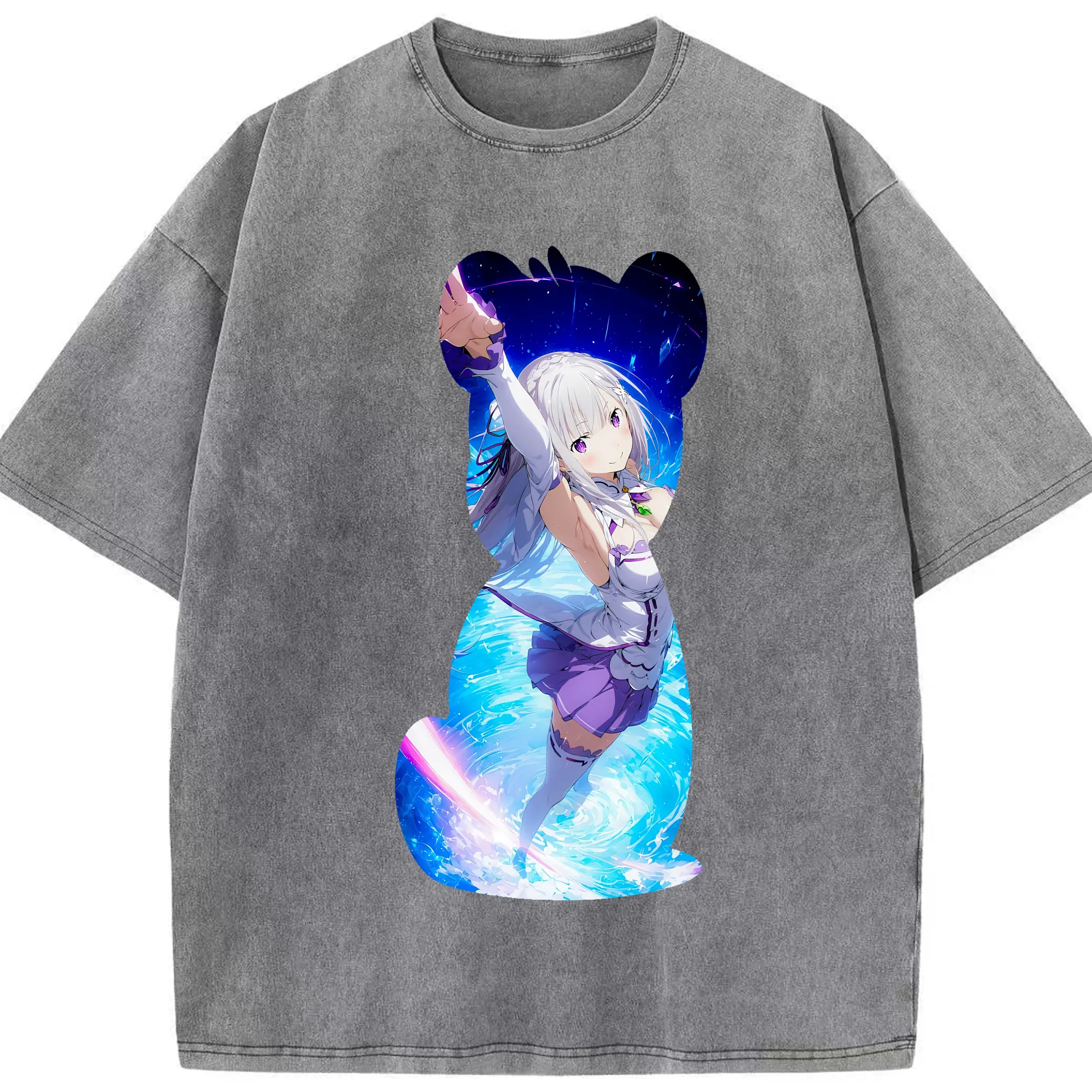 リゼロ グッズ エミリア - 綿100% ヴィンテージ風 半袖Tシャツ ・ 背面プリント ・ 柔らか肌触り ・ 通気性 快適 ・ スポーツ カジュアル 外出用