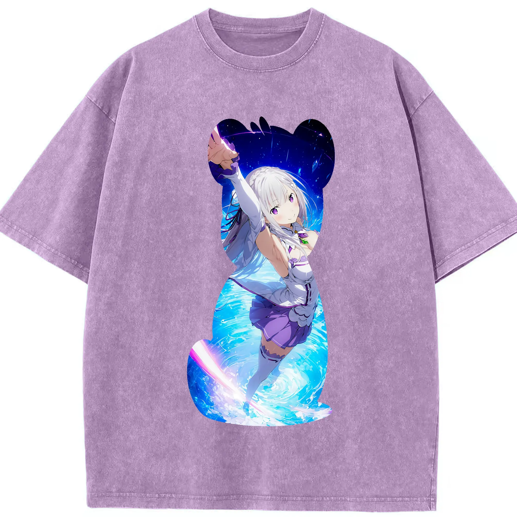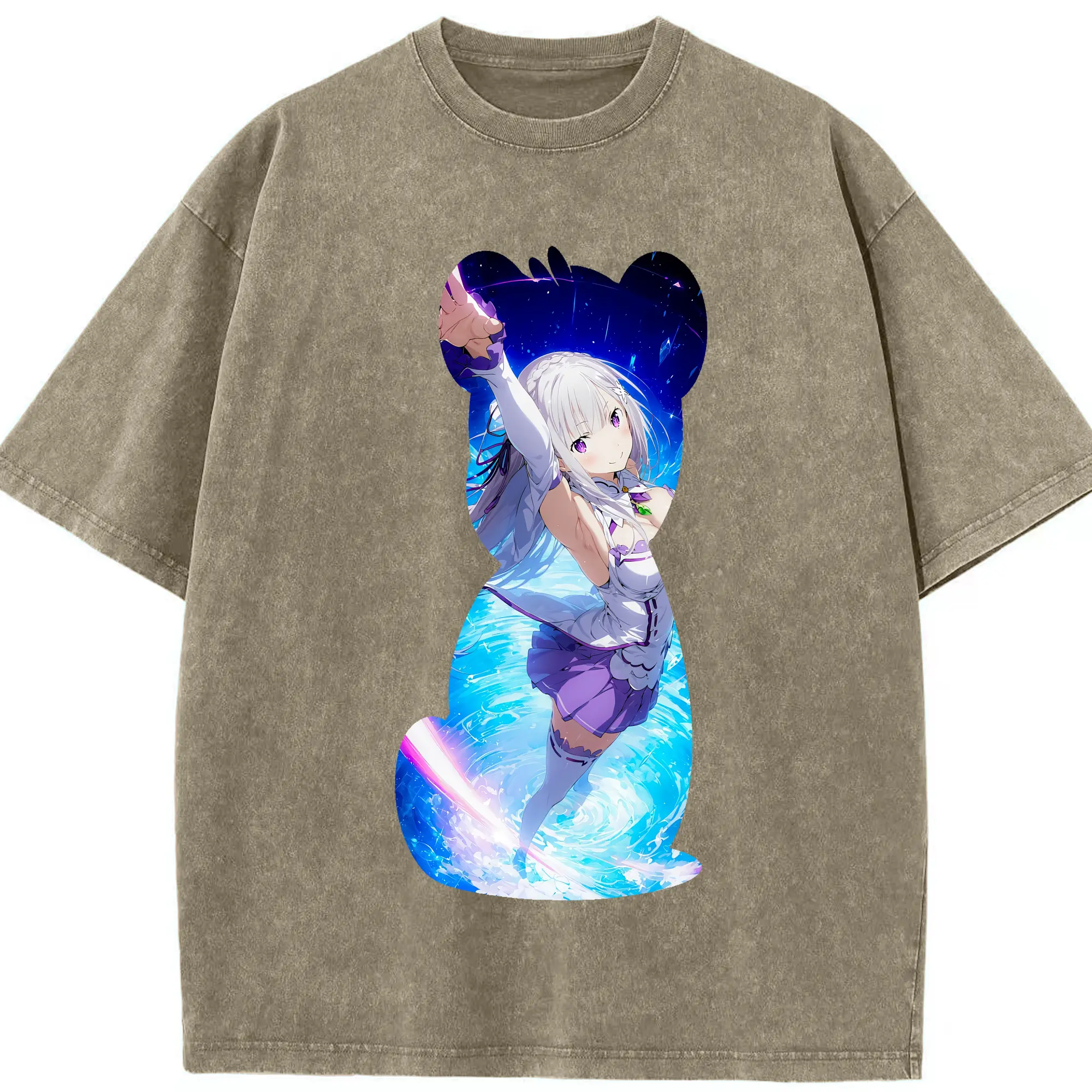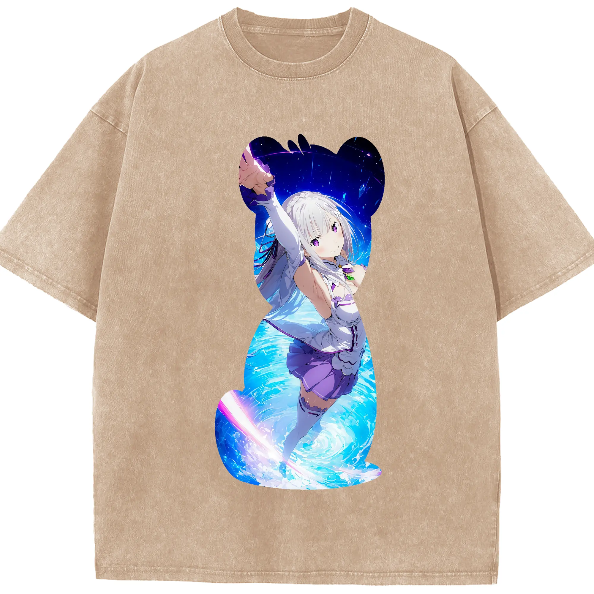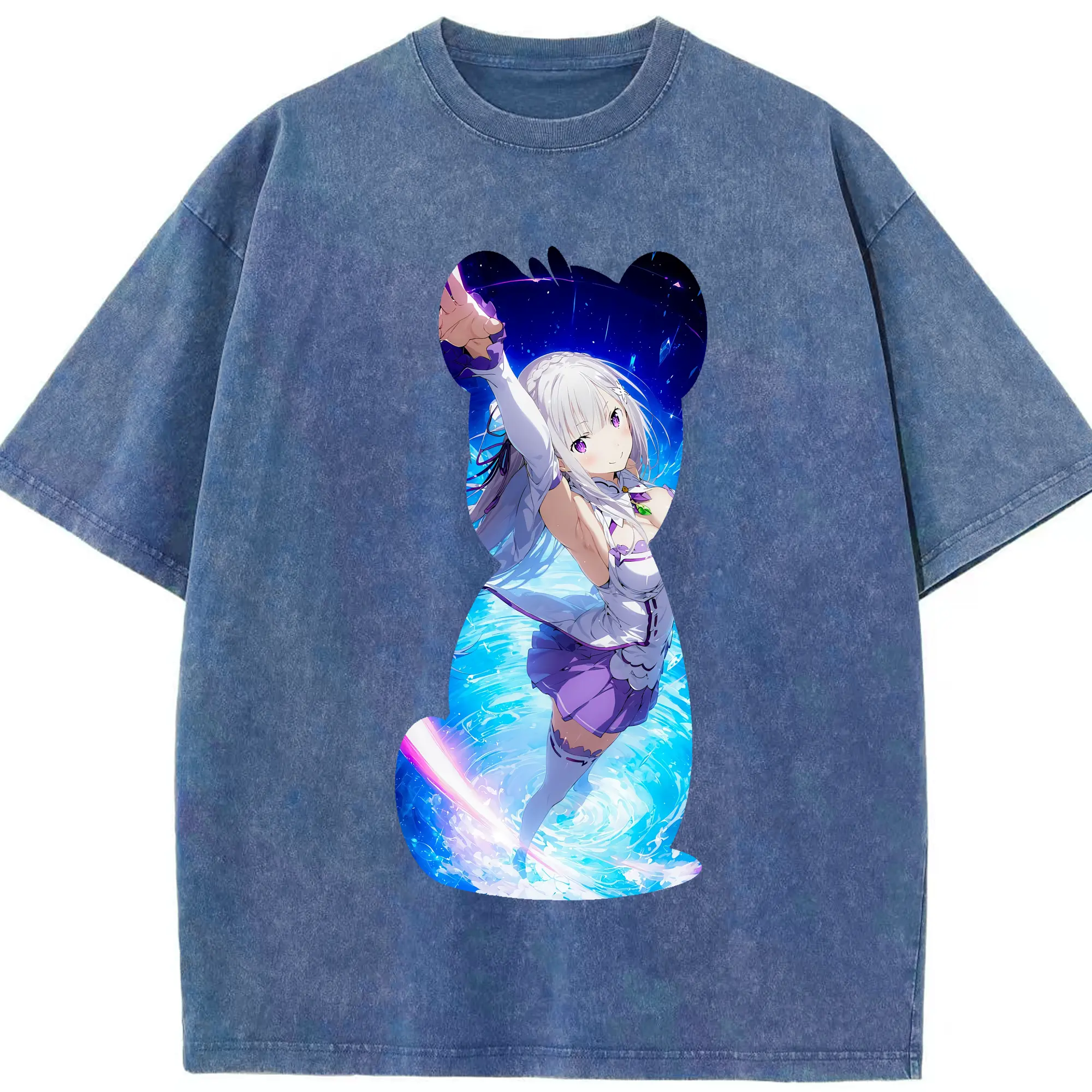 リゼロ グッズ エミリア - 綿100% ヴィンテージ風 半袖Tシャツ ・ 背面プリント ・ 柔らか肌触り ・ 通気性 快適 ・ スポーツ カジュアル 外出用