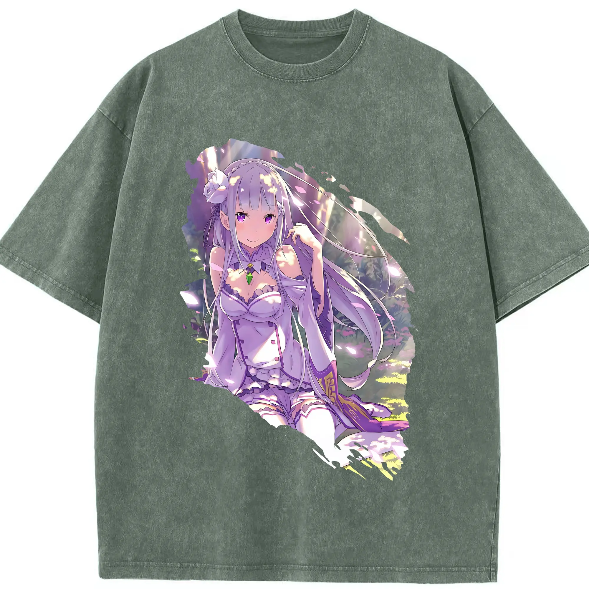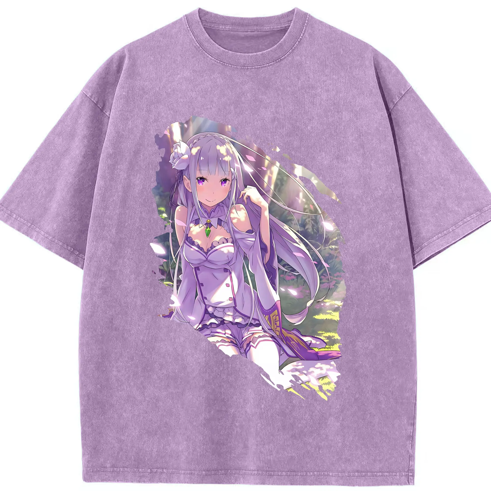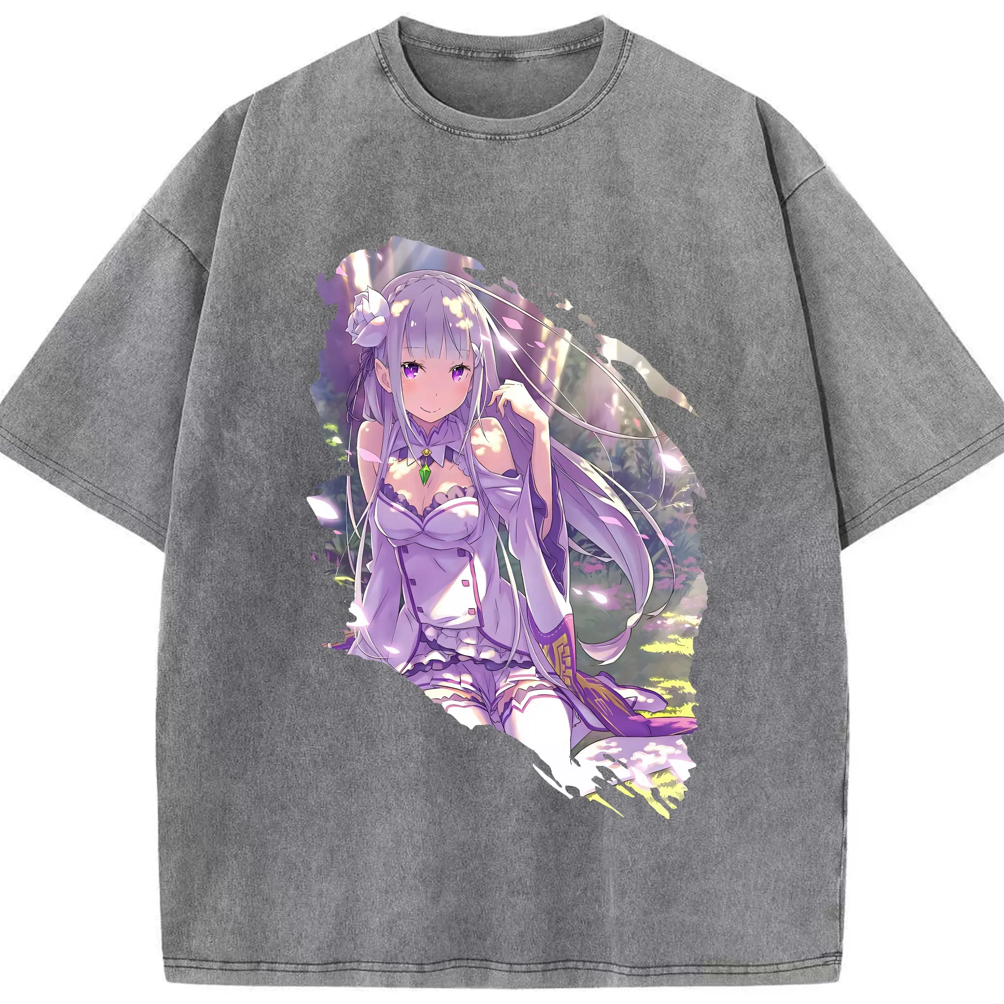 リゼロ グッズ エミリア - 綿100% ヴィンテージ風 半袖Tシャツ ・ 背面プリント ・ 柔らか肌触り ・ 通気性 快適 ・ スポーツ カジュアル 外出用