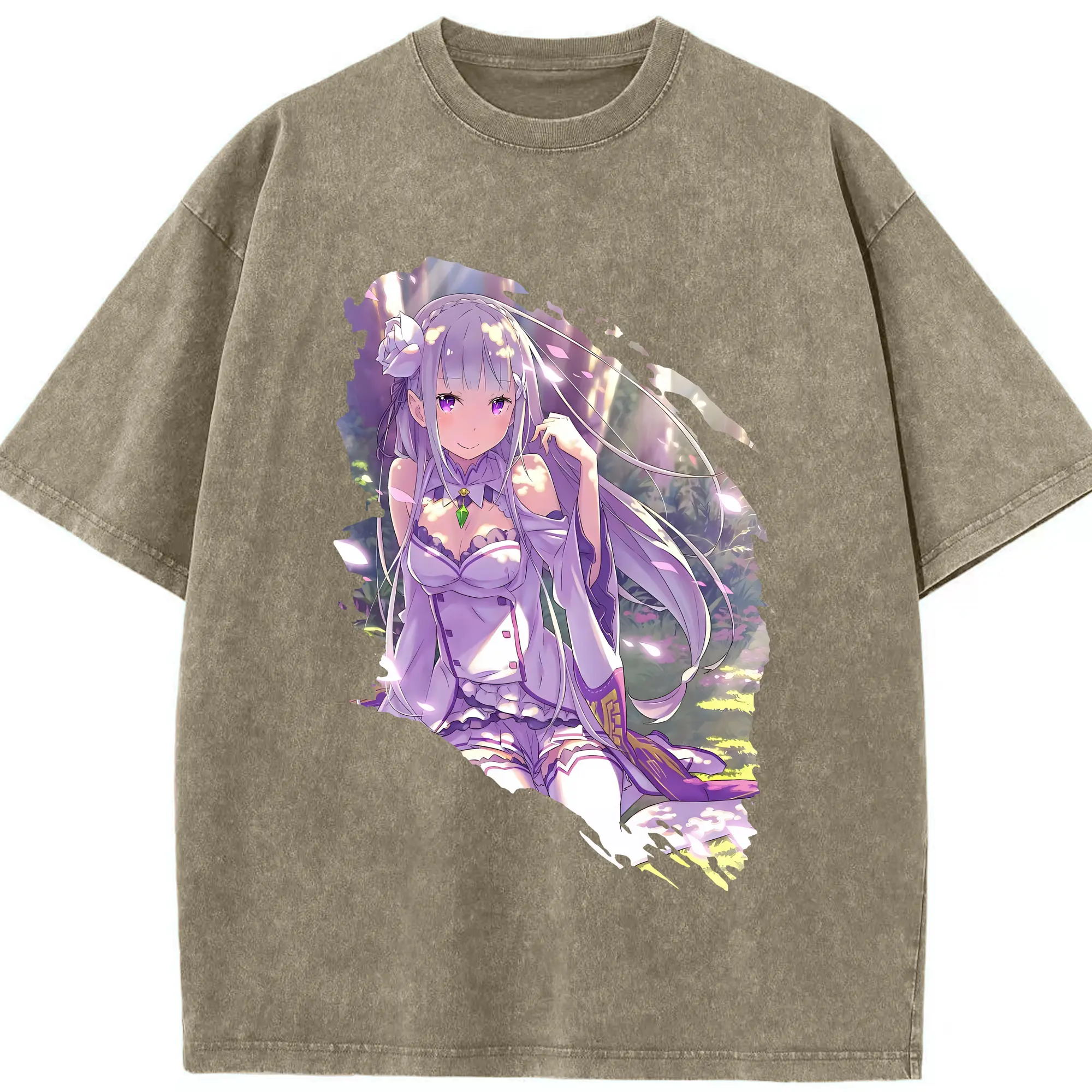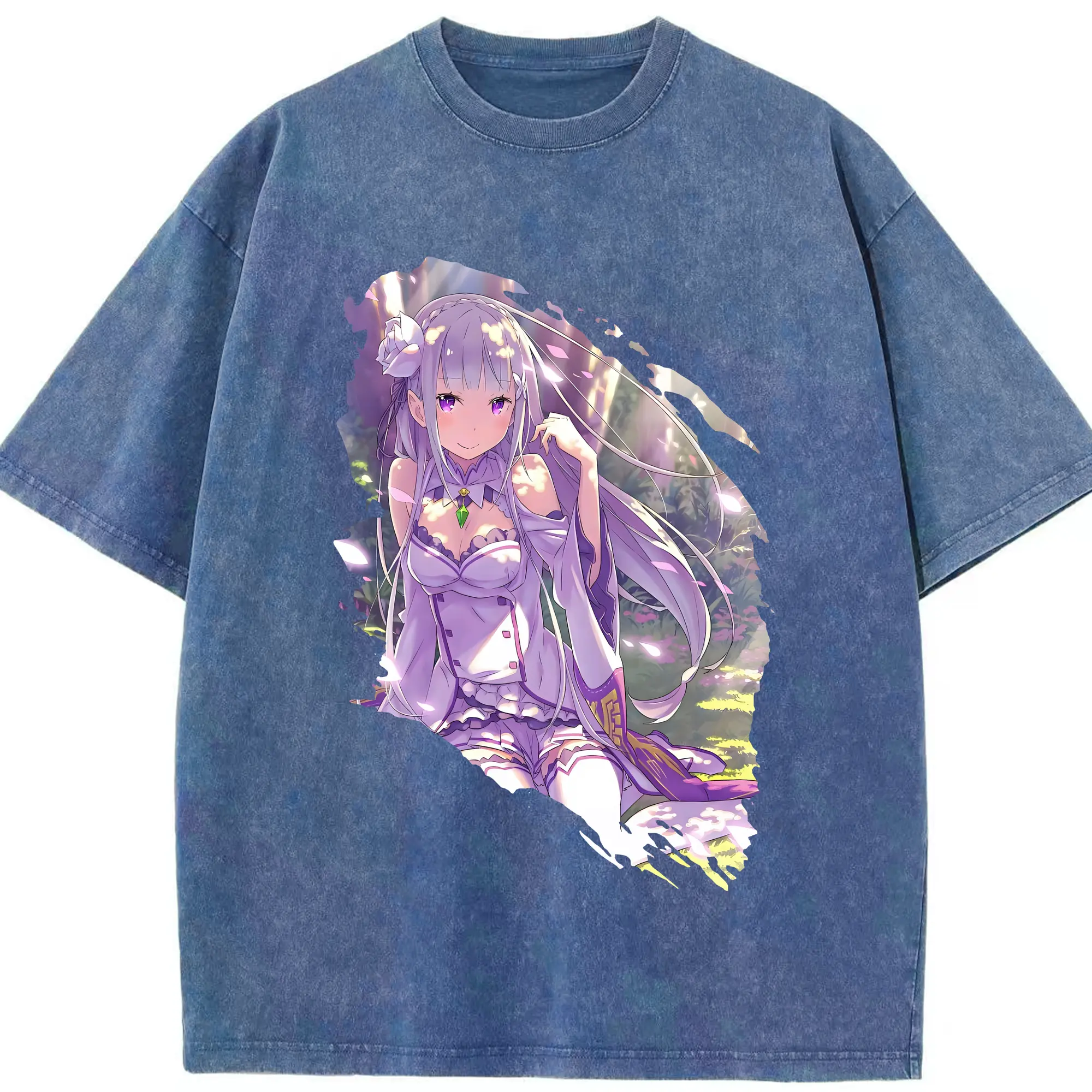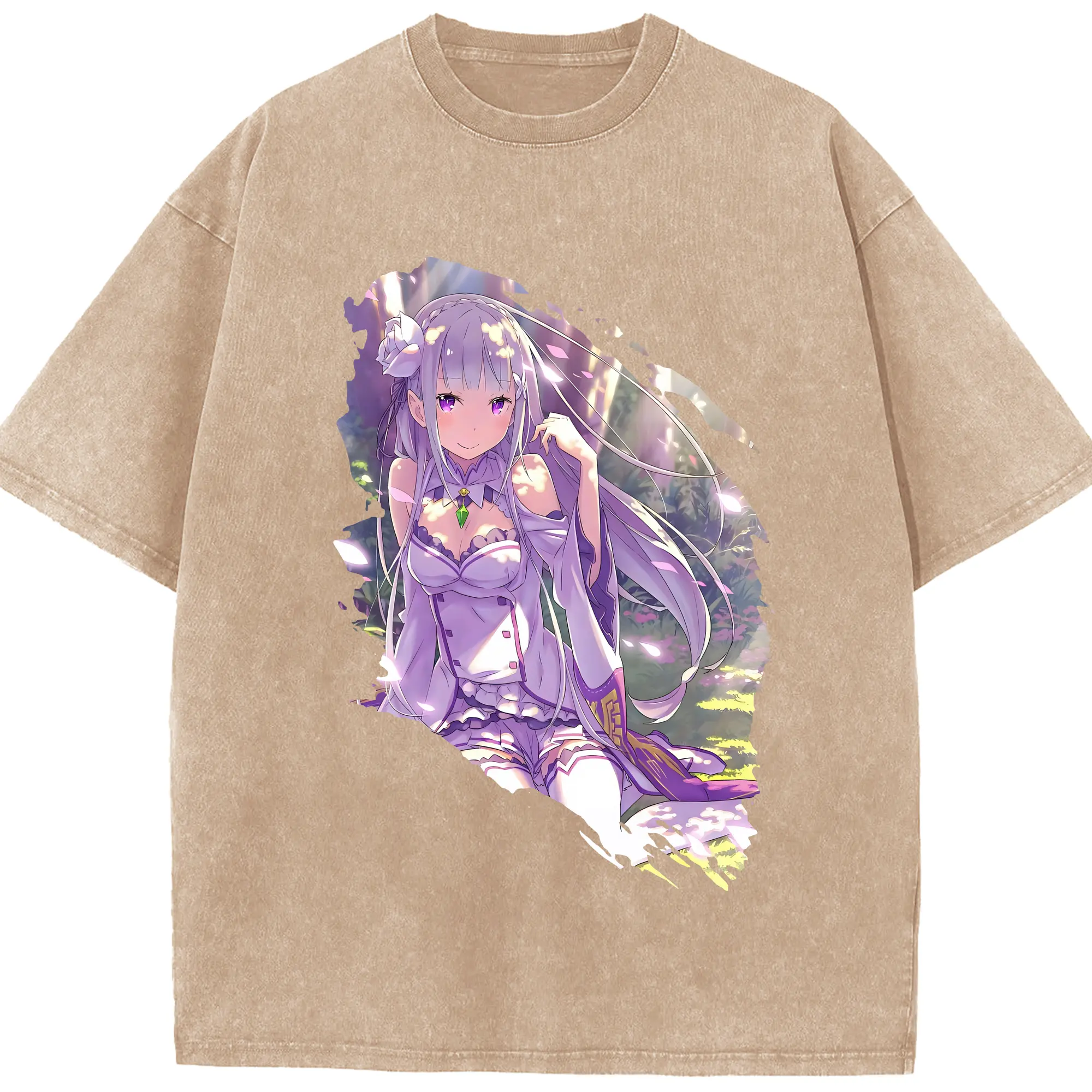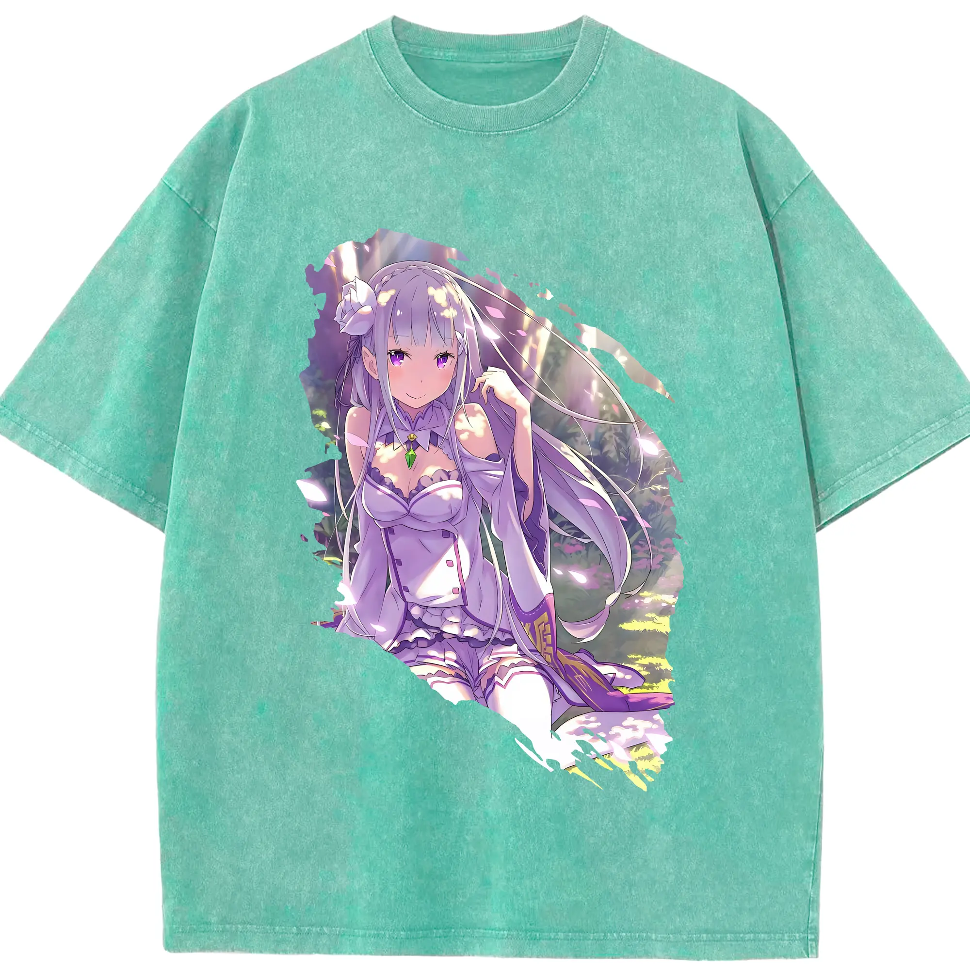 リゼロ グッズ エミリア - 綿100% ヴィンテージ風 半袖Tシャツ ・ 背面プリント ・ 柔らか肌触り ・ 通気性 快適 ・ スポーツ カジュアル 外出用