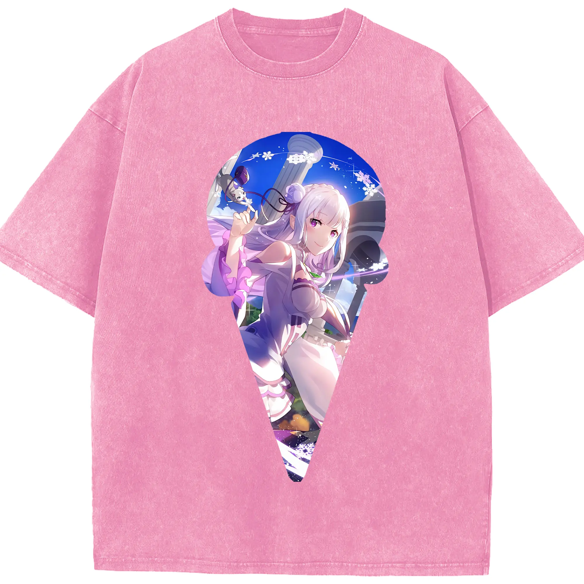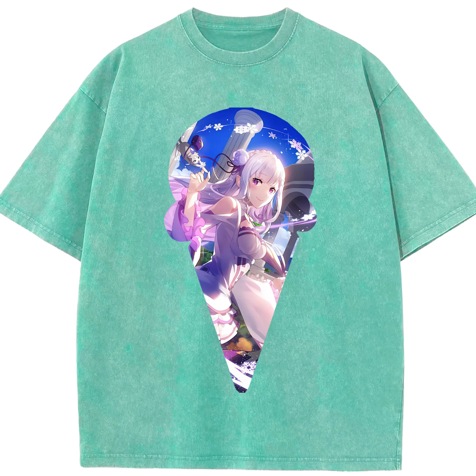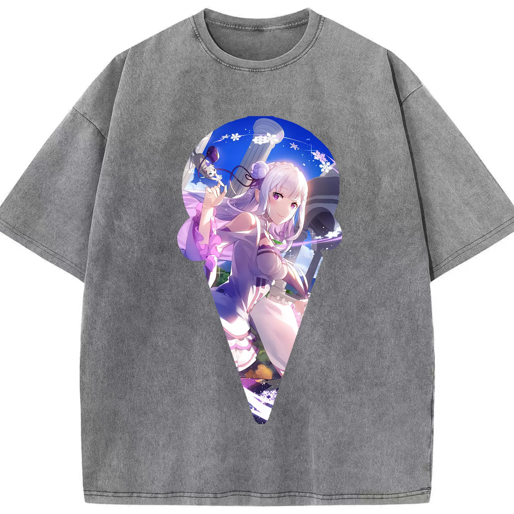 リゼロ グッズ エミリア - 綿100% ヴィンテージ風 半袖Tシャツ ・ 背面プリント ・ 柔らか肌触り ・ 通気性 快適 ・ スポーツ カジュアル 外出用