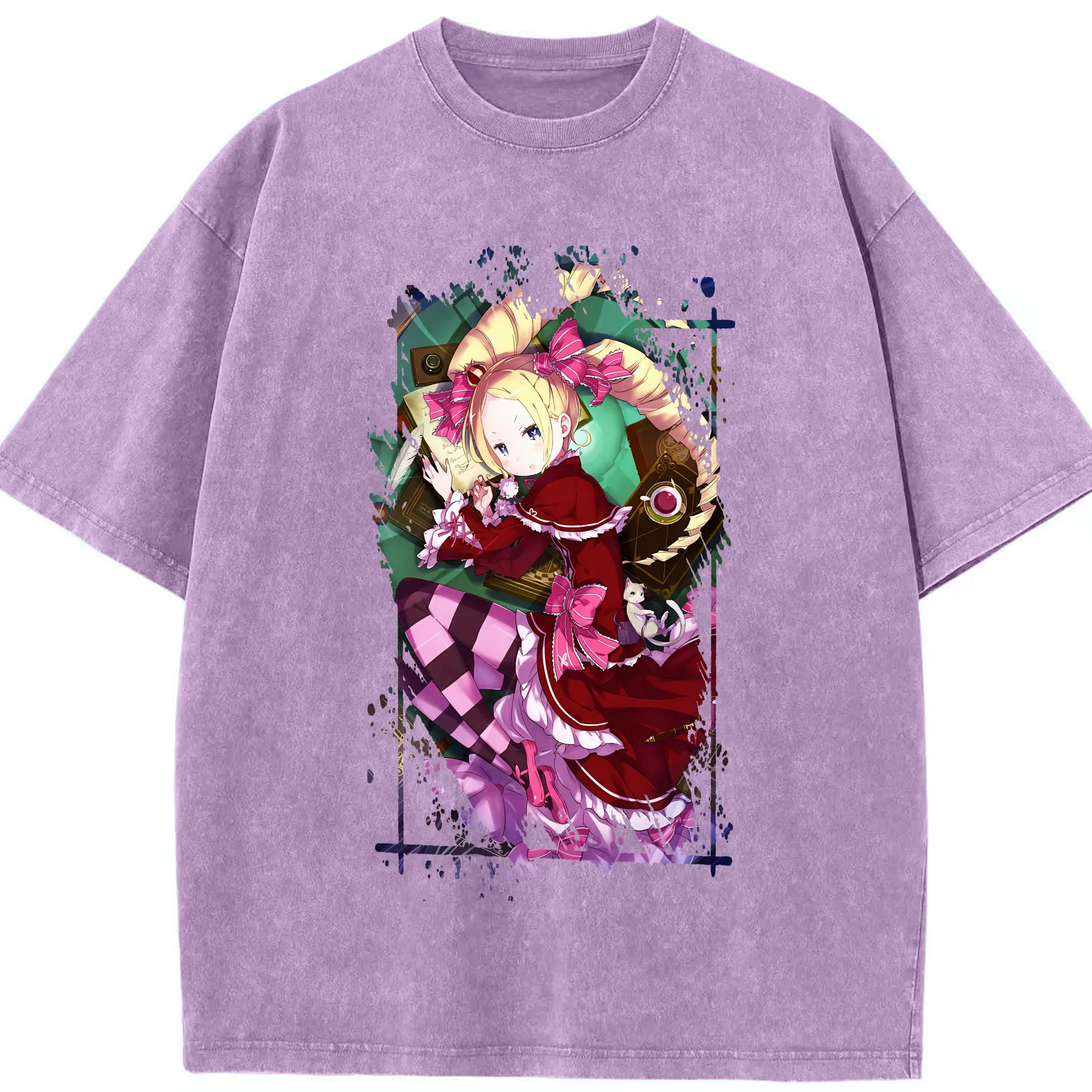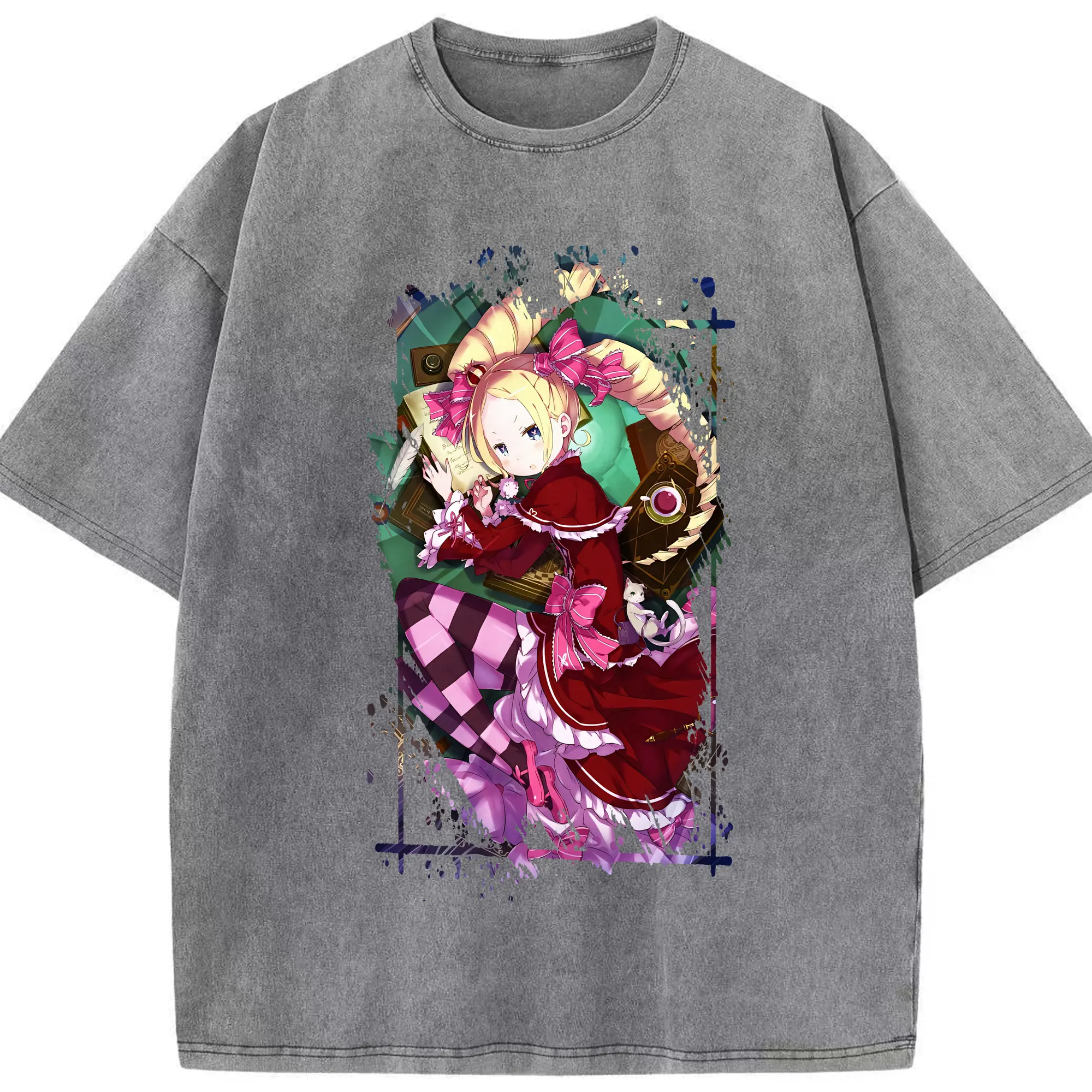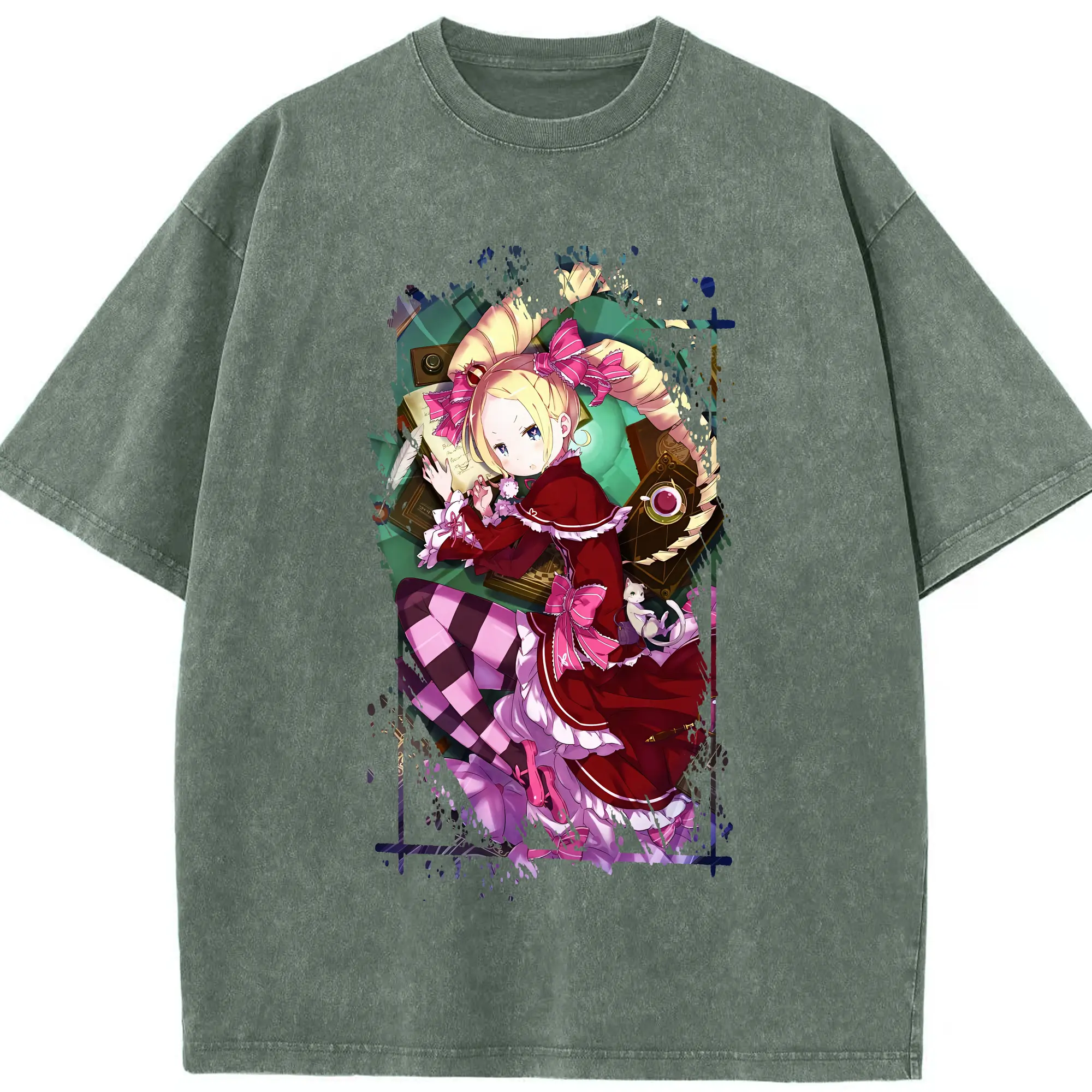 リゼロ グッズ ベアトリス - 綿100% ヴィンテージ風 半袖Tシャツ ・ 背面プリント ・ 柔らか肌触り ・ 通気性 快適 ・ スポーツ カジュアル 外出用