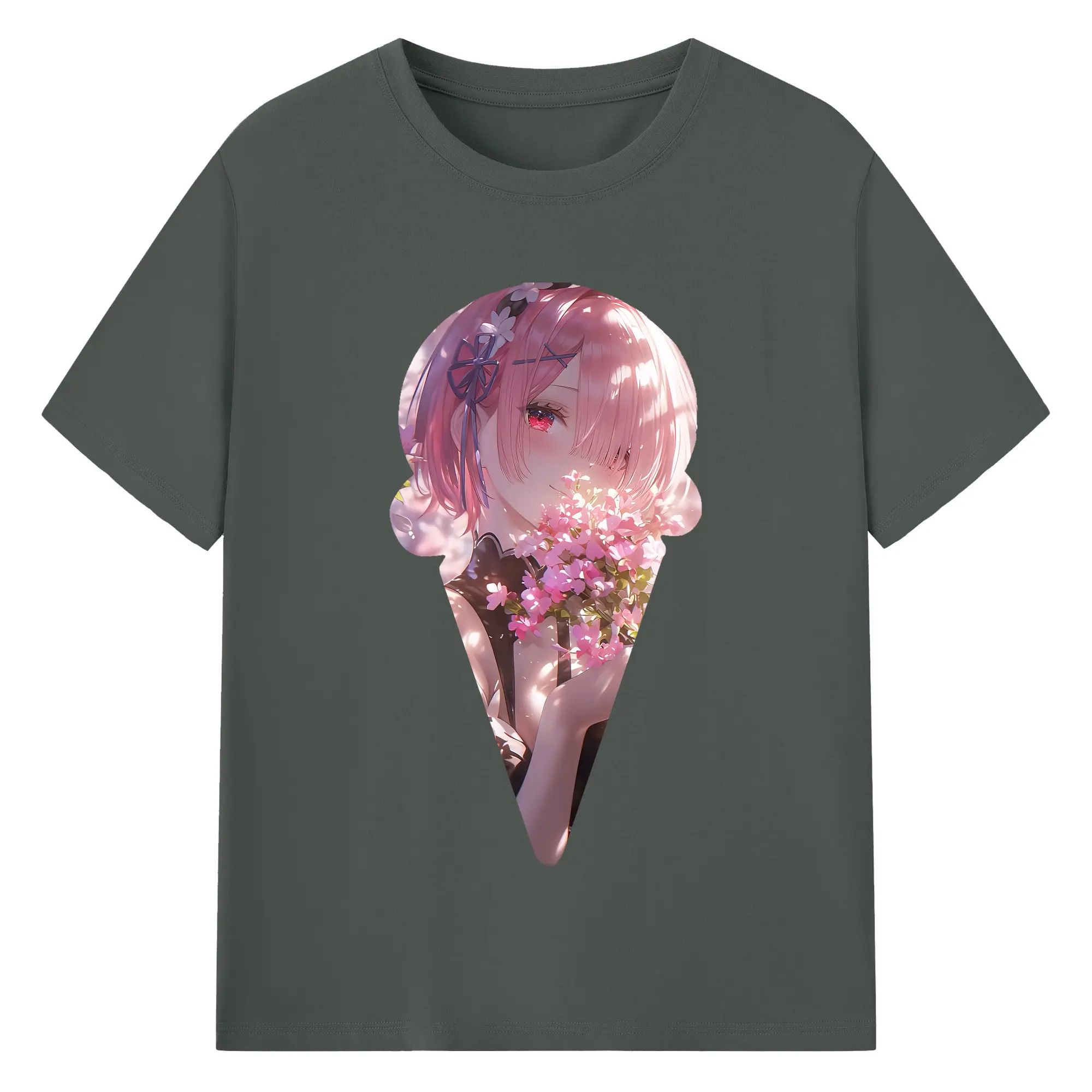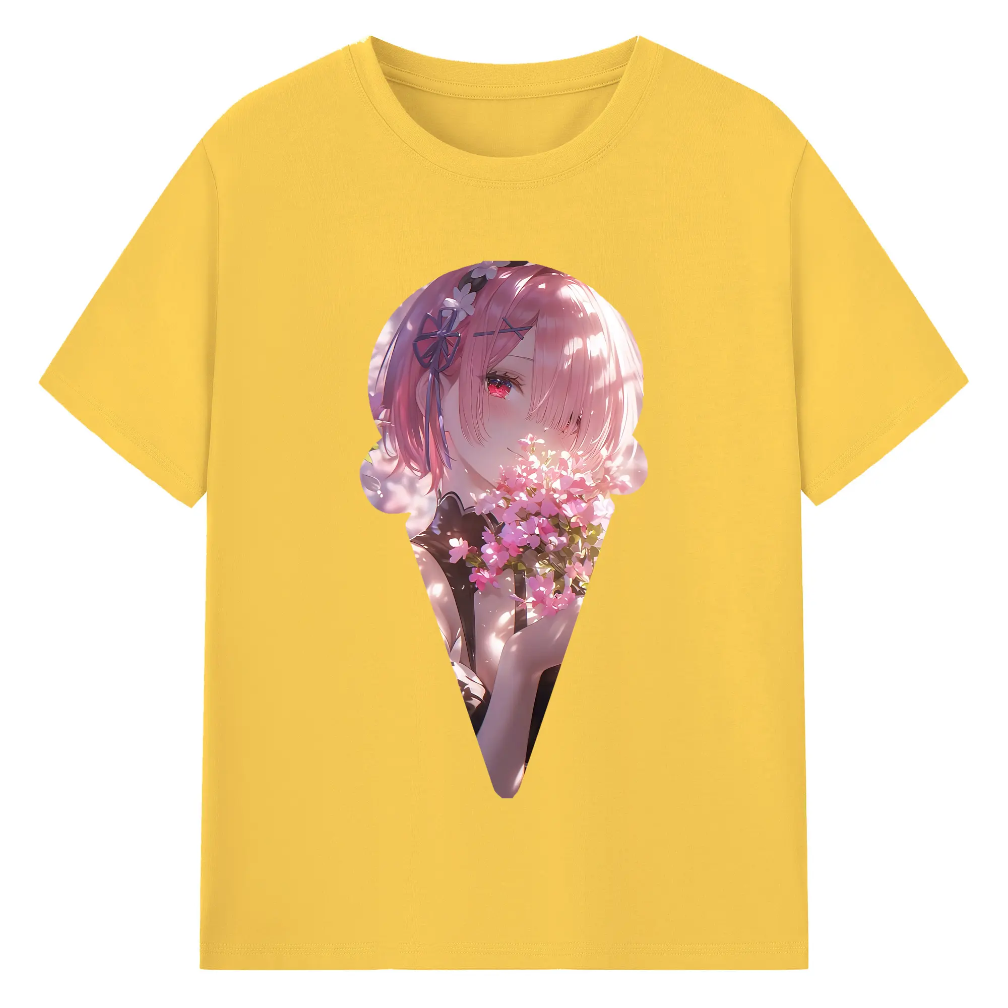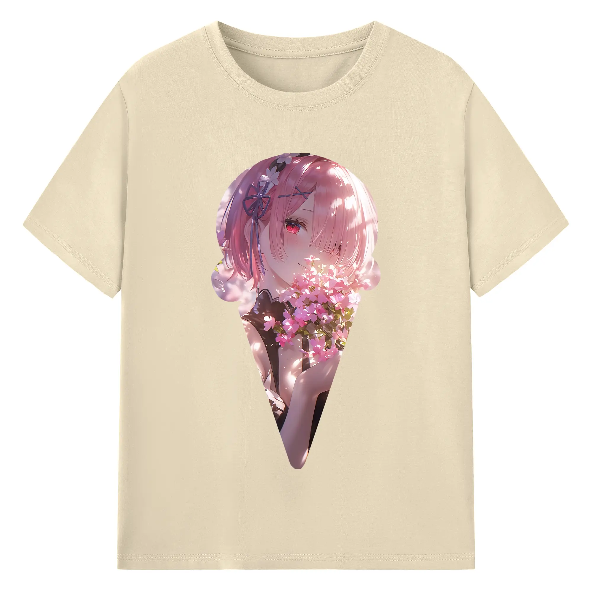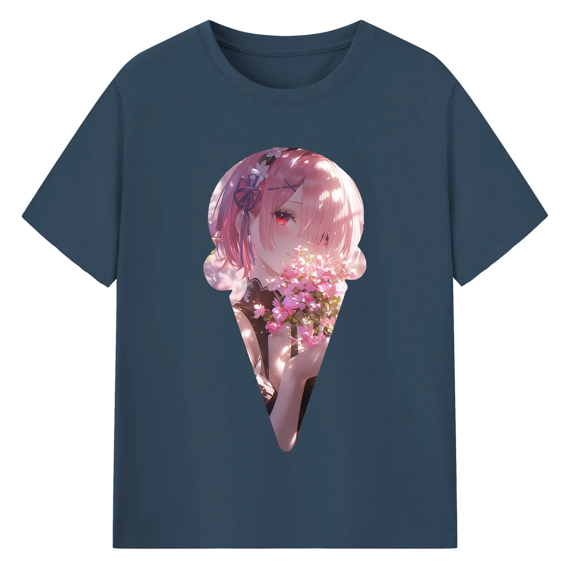 リゼロ グッズ ラム - 綿100% ヴィンテージ風 半袖Tシャツ ・ フロントプリント ・ 柔らか肌触り ・ 通気性 快適 ・ スポーツ カジュアル 外出用