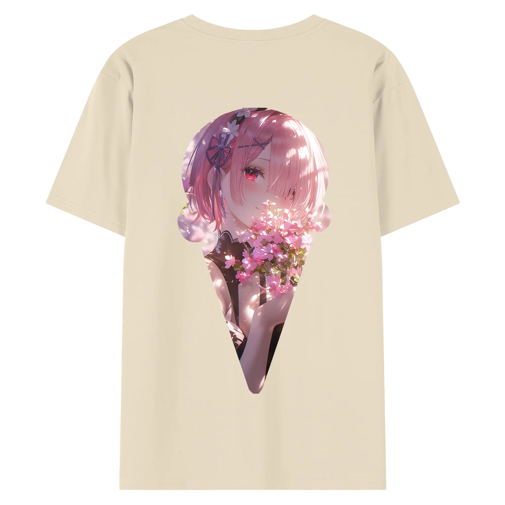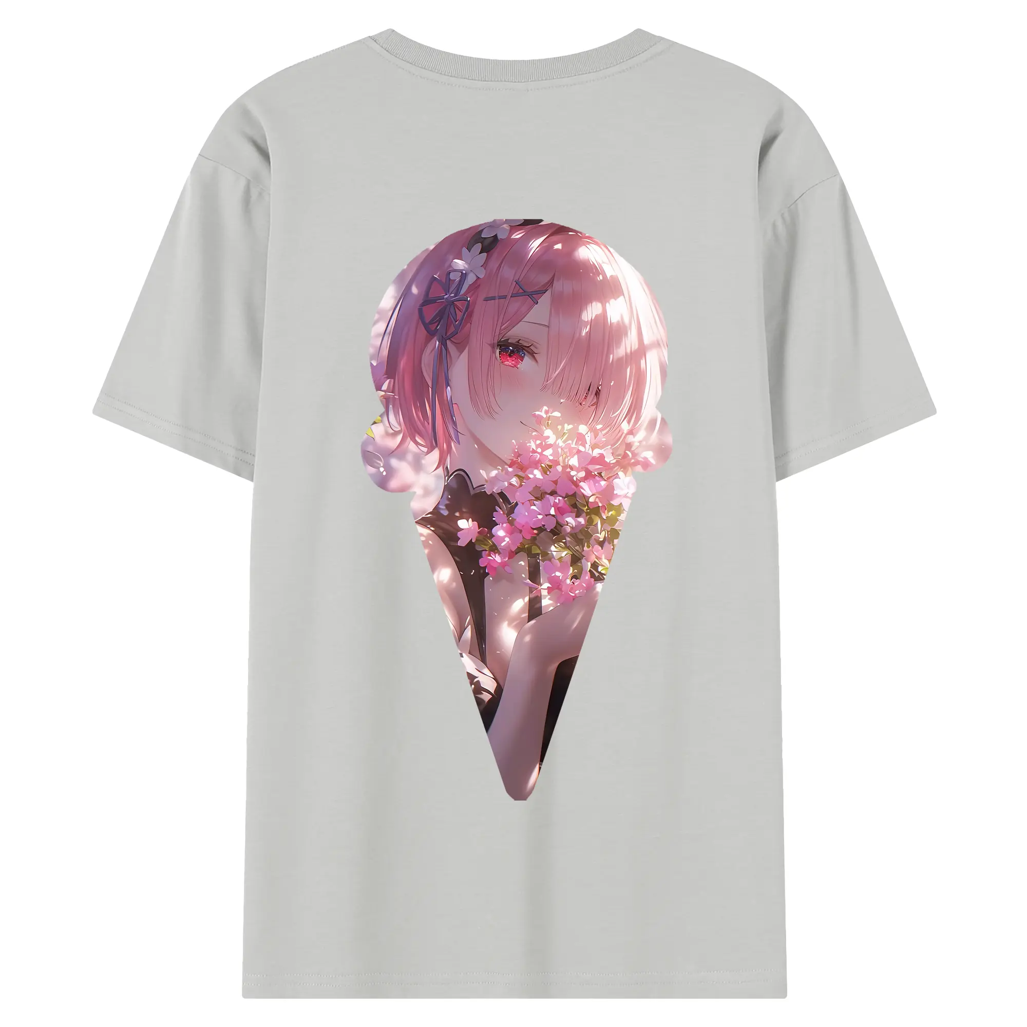 リゼロ グッズ ラム - 綿100% ヴィンテージ風 半袖Tシャツ ・ 背面プリント ・ 柔らか肌触り ・ 通気性 快適 ・ スポーツ カジュアル 外出用