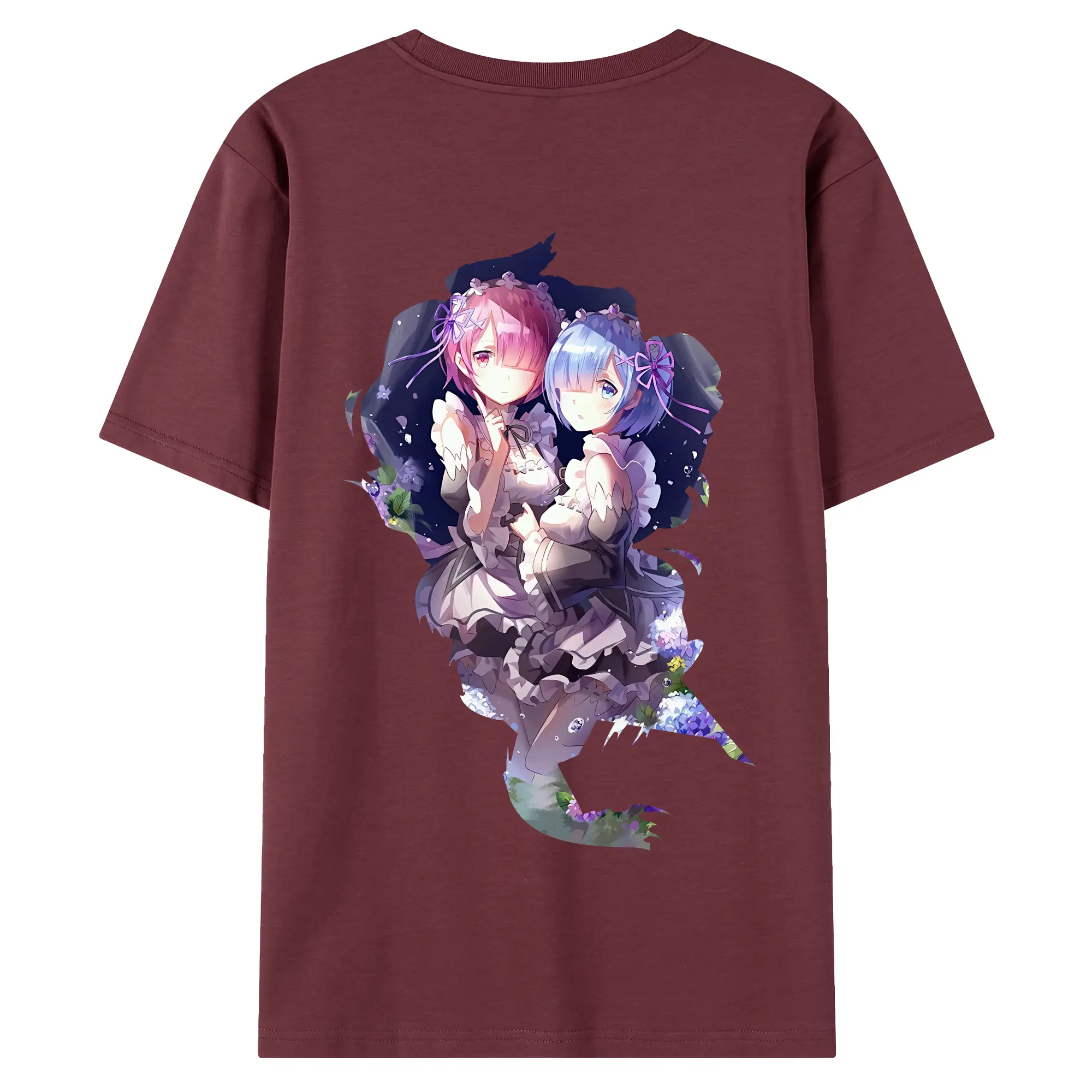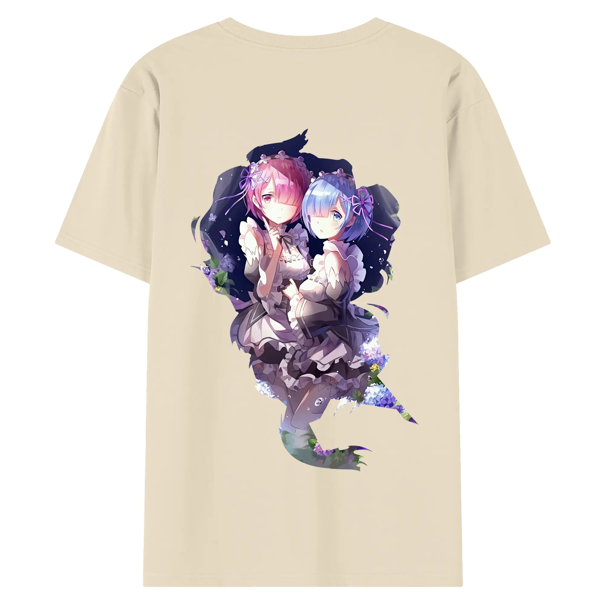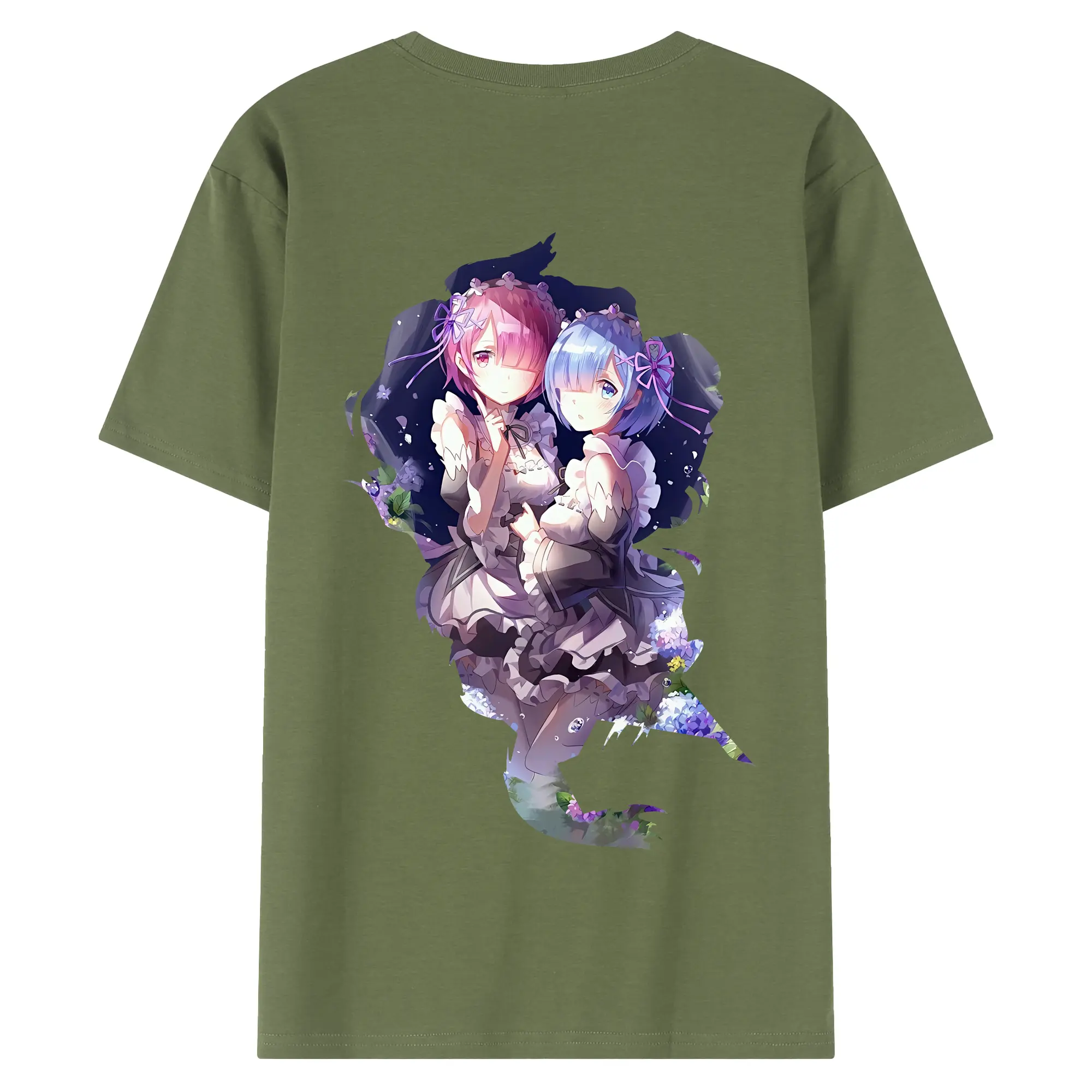 リゼロ グッズ ラム - 綿100% ヴィンテージ風 半袖Tシャツ ・ 背面プリント ・ 柔らか肌触り ・ 通気性 快適 ・ スポーツ カジュアル 外出用