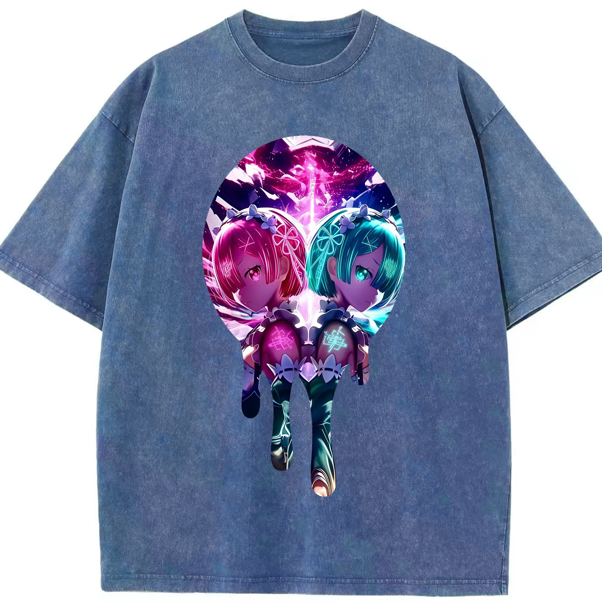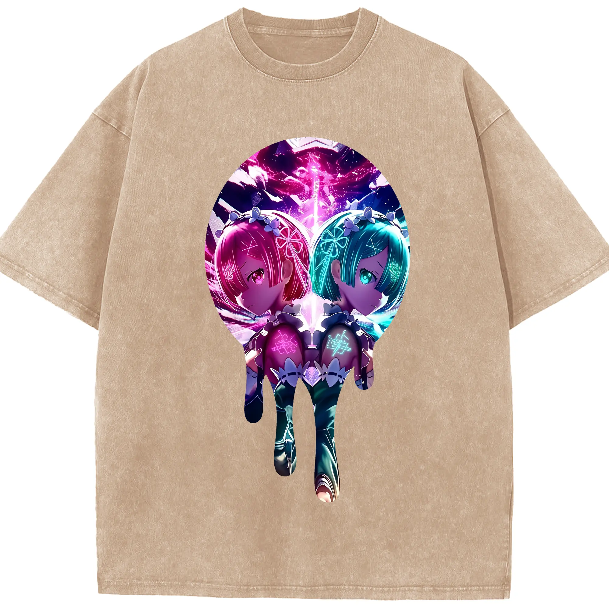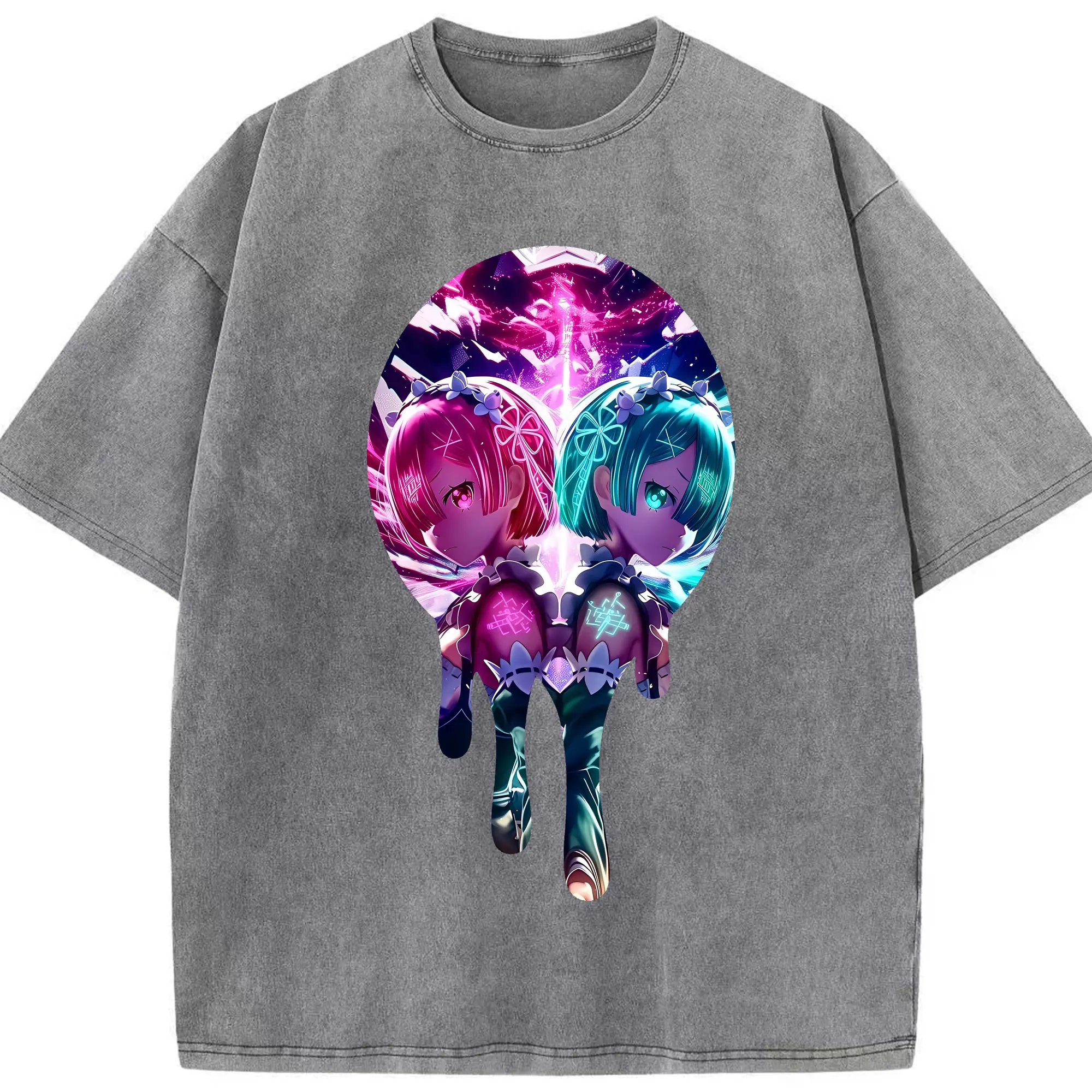 リゼロ グッズ ラム - 綿100% ヴィンテージ風 半袖Tシャツ ・ 背面プリント ・ 柔らか肌触り ・ 通気性 快適 ・ スポーツ カジュアル 外出用