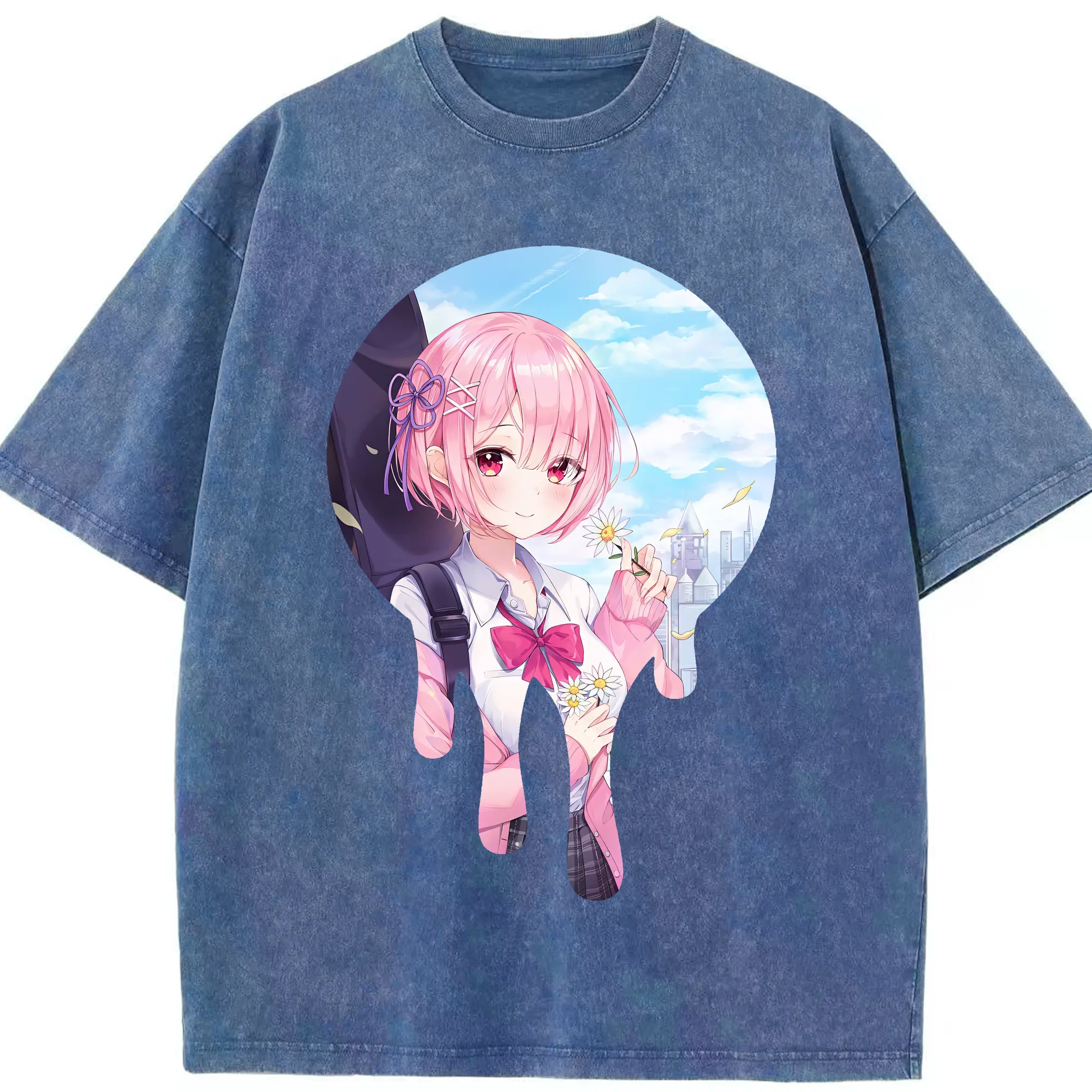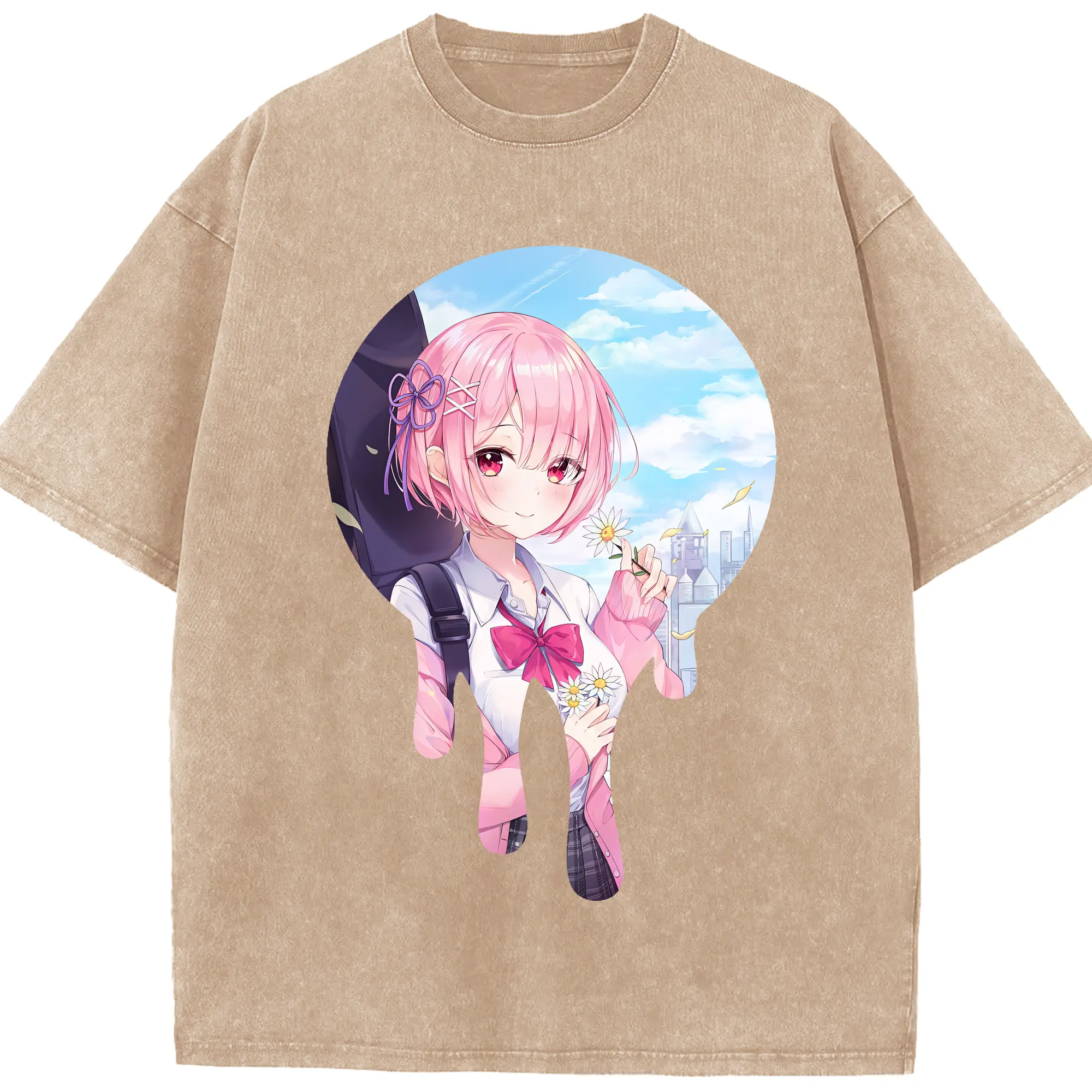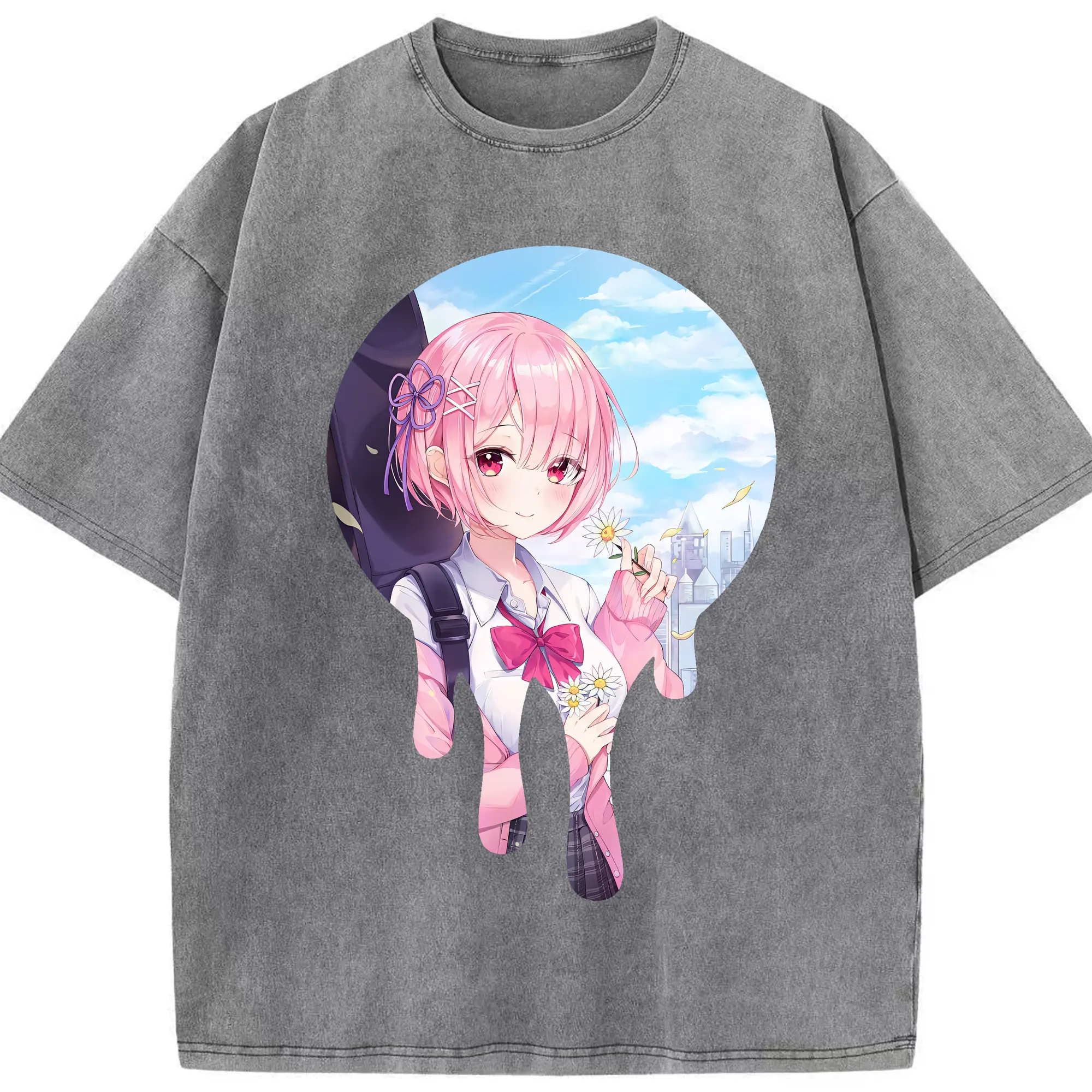 リゼロ グッズ ラム - 綿100% ヴィンテージ風 半袖Tシャツ ・ 背面プリント ・ 柔らか肌触り ・ 通気性 快適 ・ スポーツ カジュアル 外出用