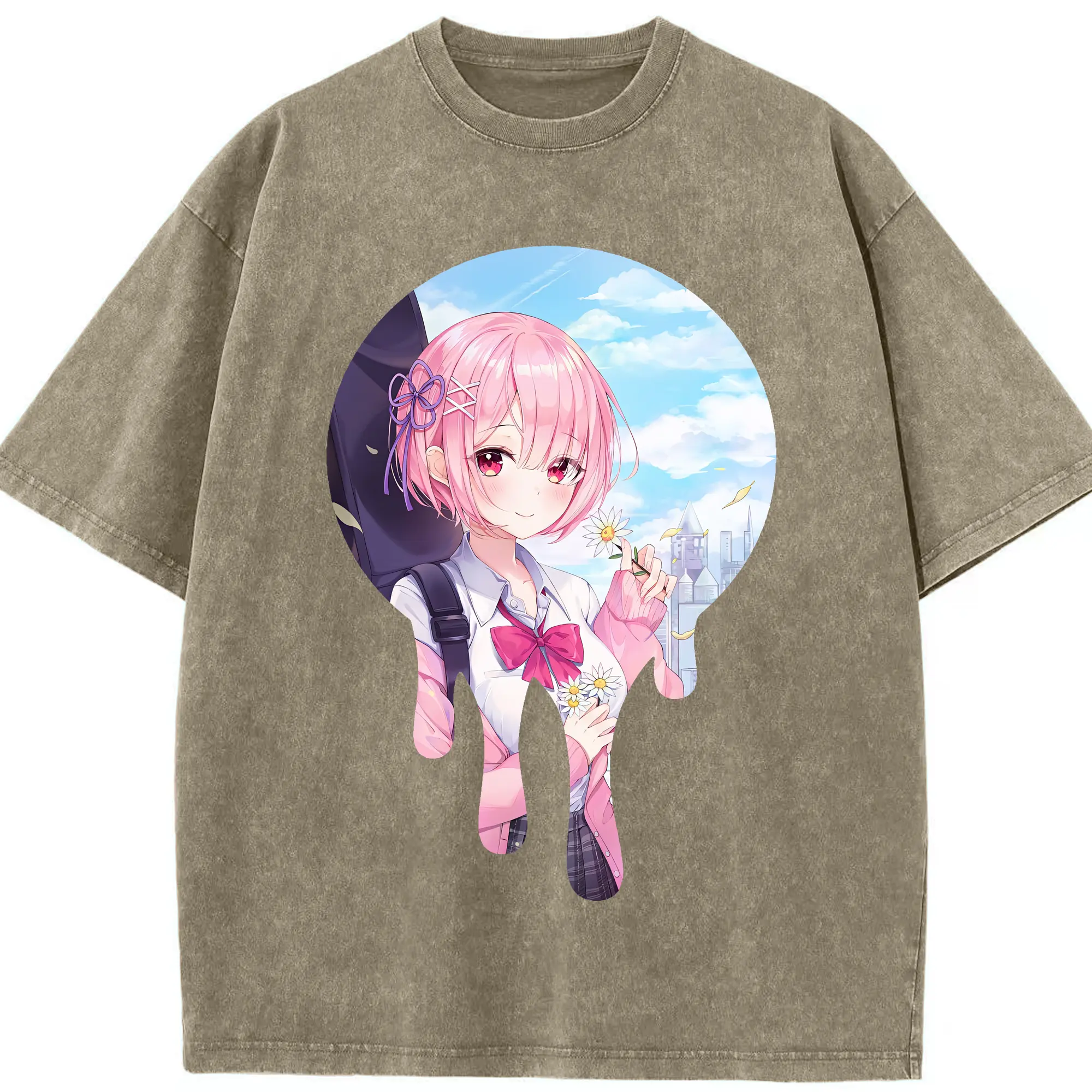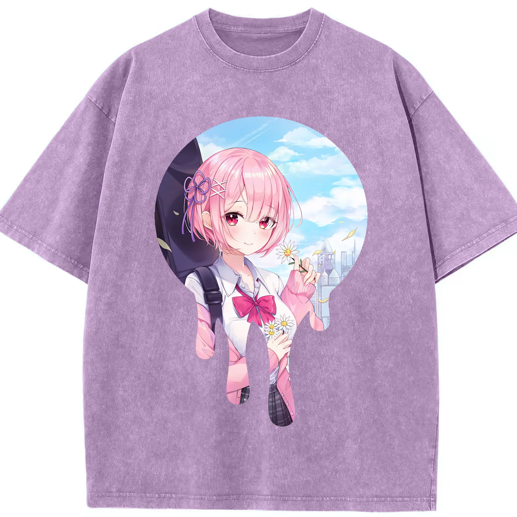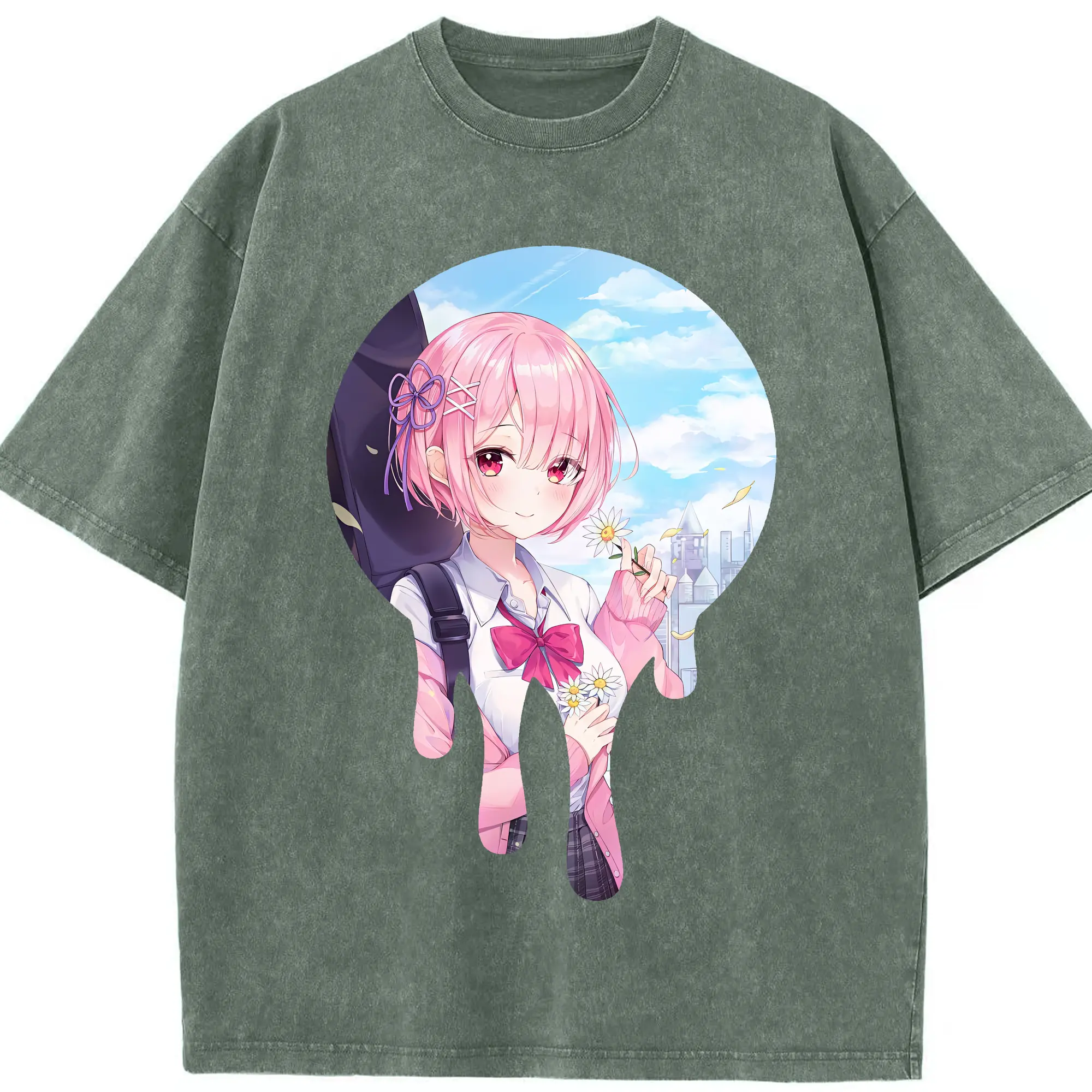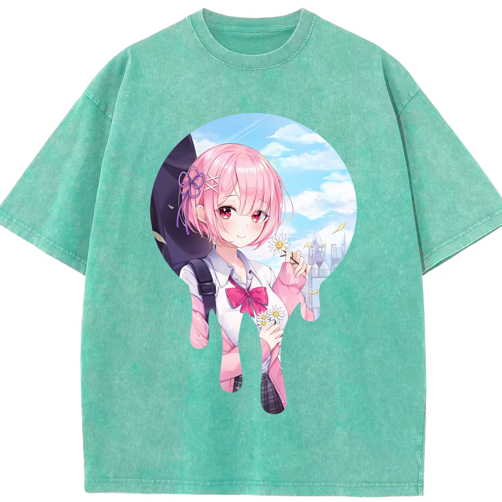 リゼロ グッズ ラム - 綿100% ヴィンテージ風 半袖Tシャツ ・ 背面プリント ・ 柔らか肌触り ・ 通気性 快適 ・ スポーツ カジュアル 外出用