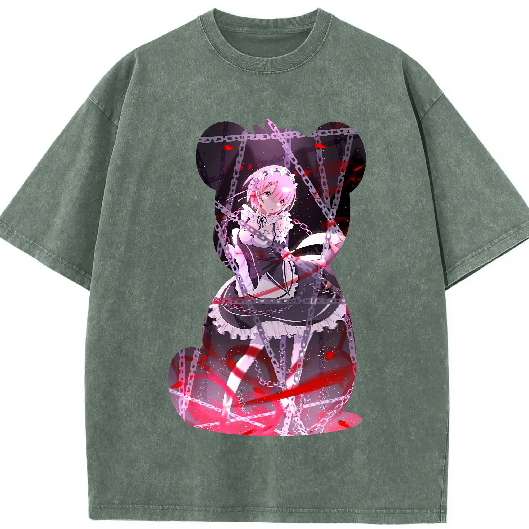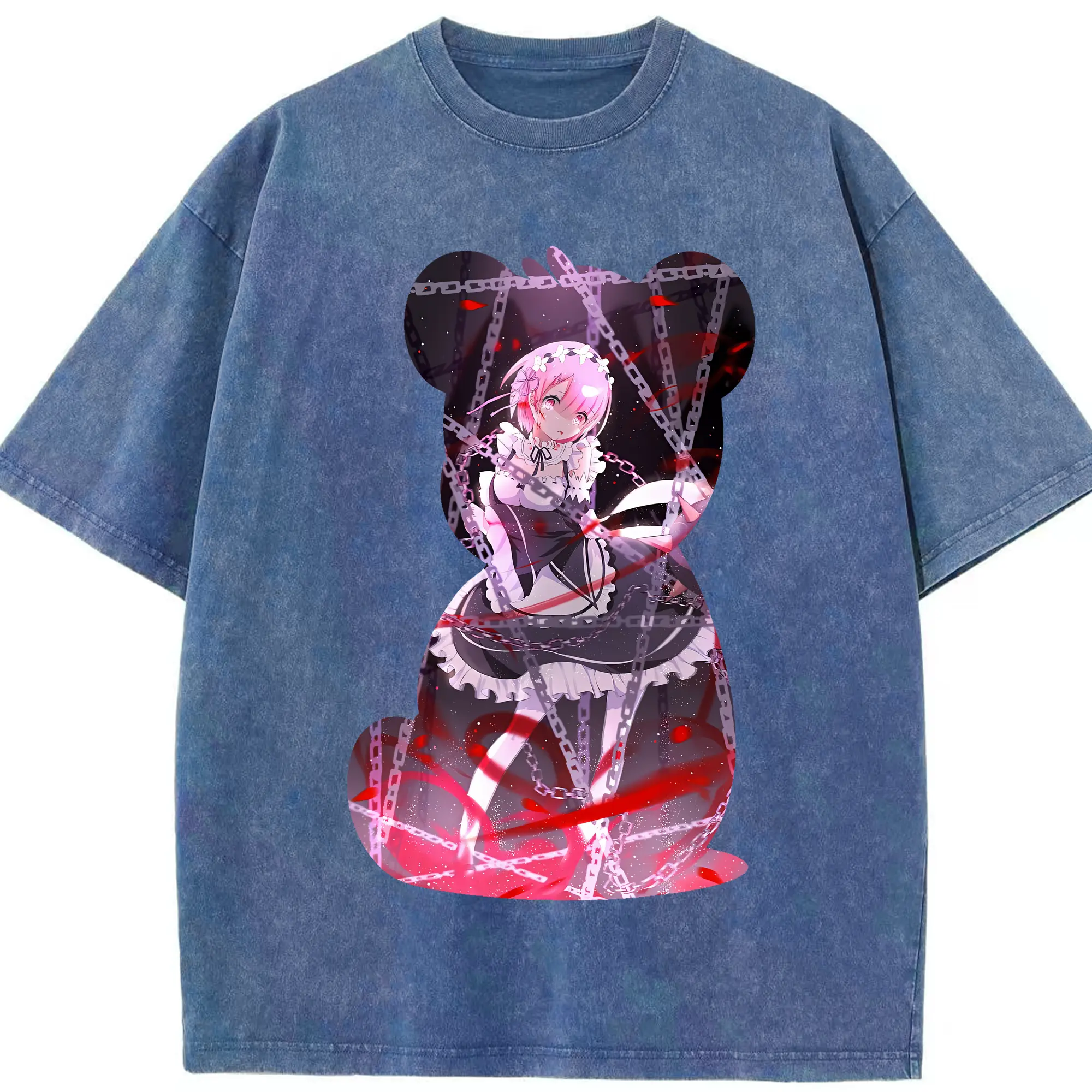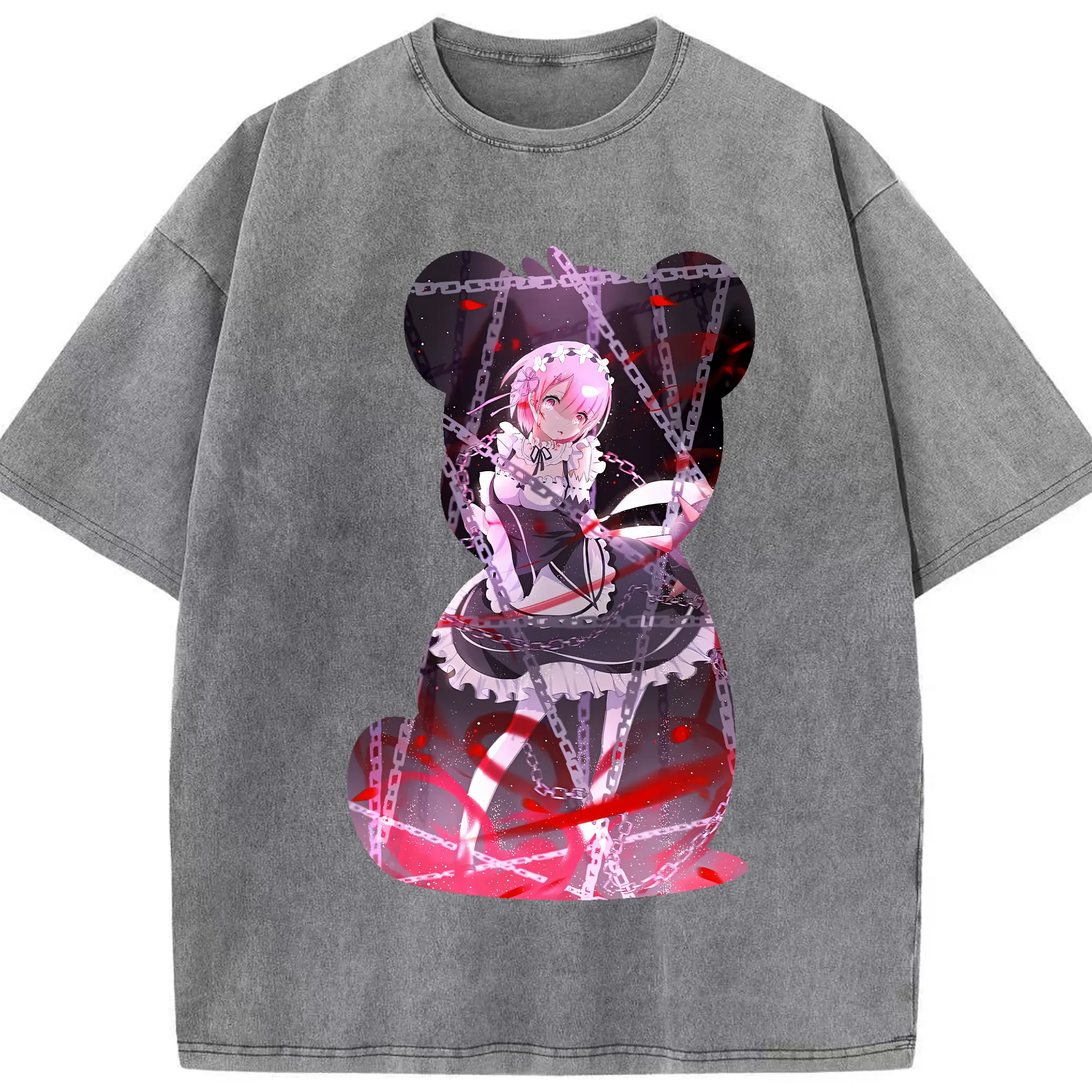 リゼロ グッズ ラム - 綿100% ヴィンテージ風 半袖Tシャツ ・ 背面プリント ・ 柔らか肌触り ・ 通気性 快適 ・ スポーツ カジュアル 外出用