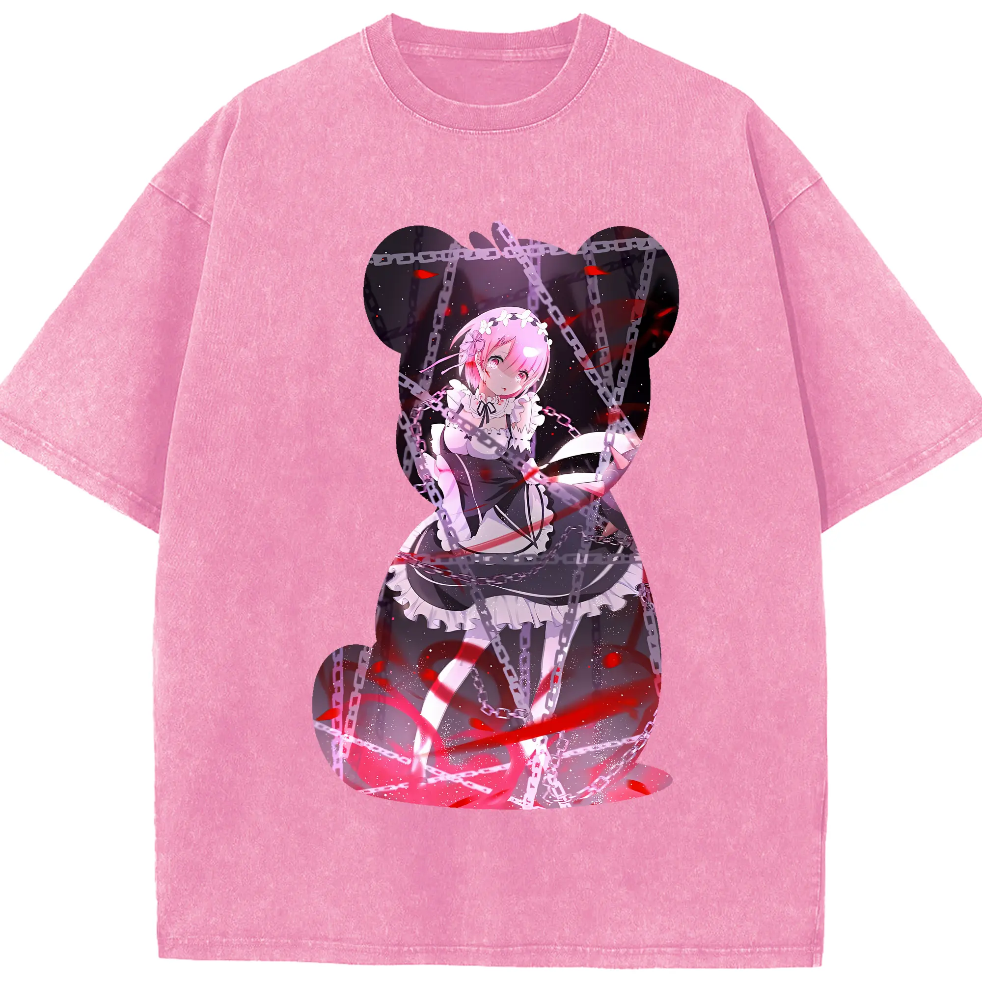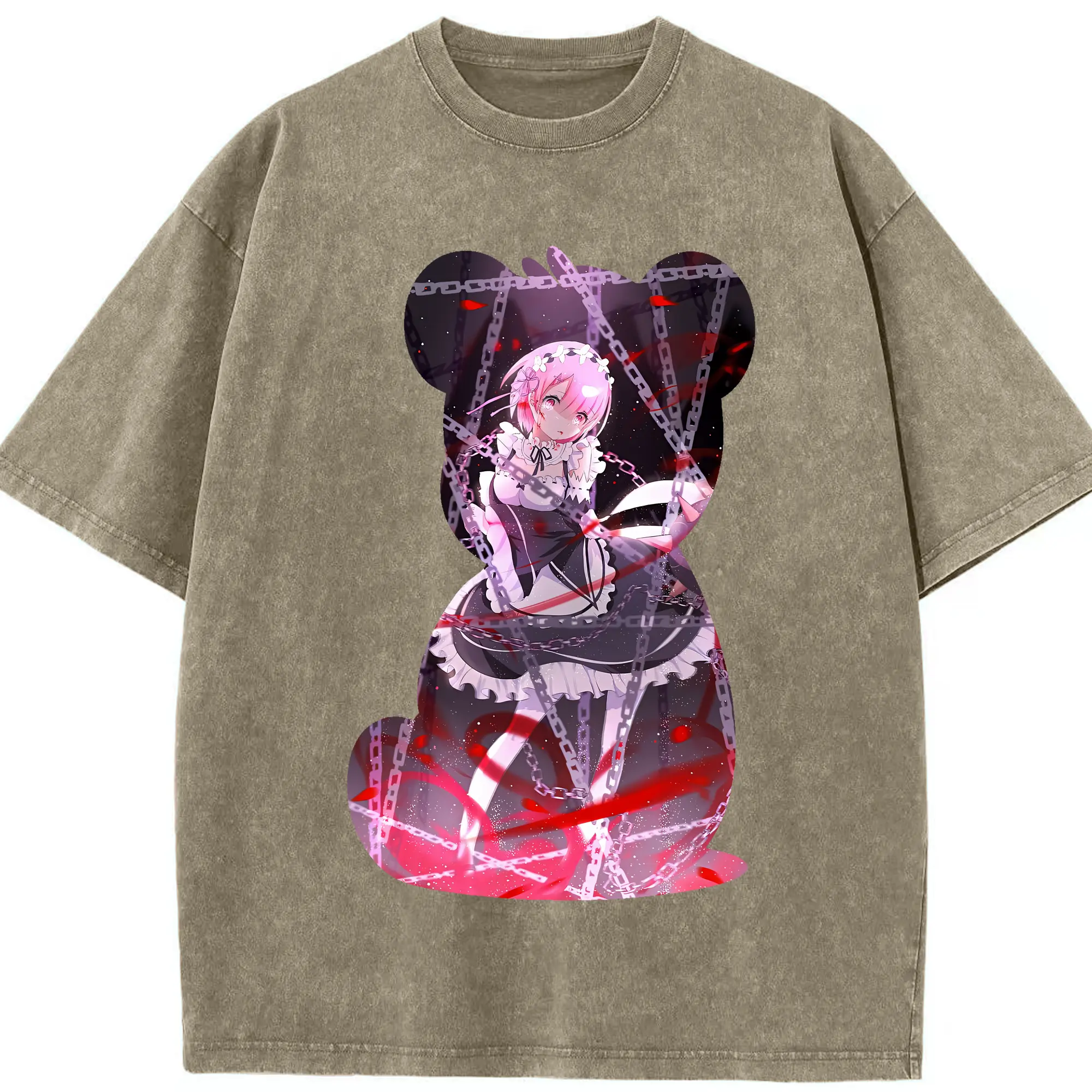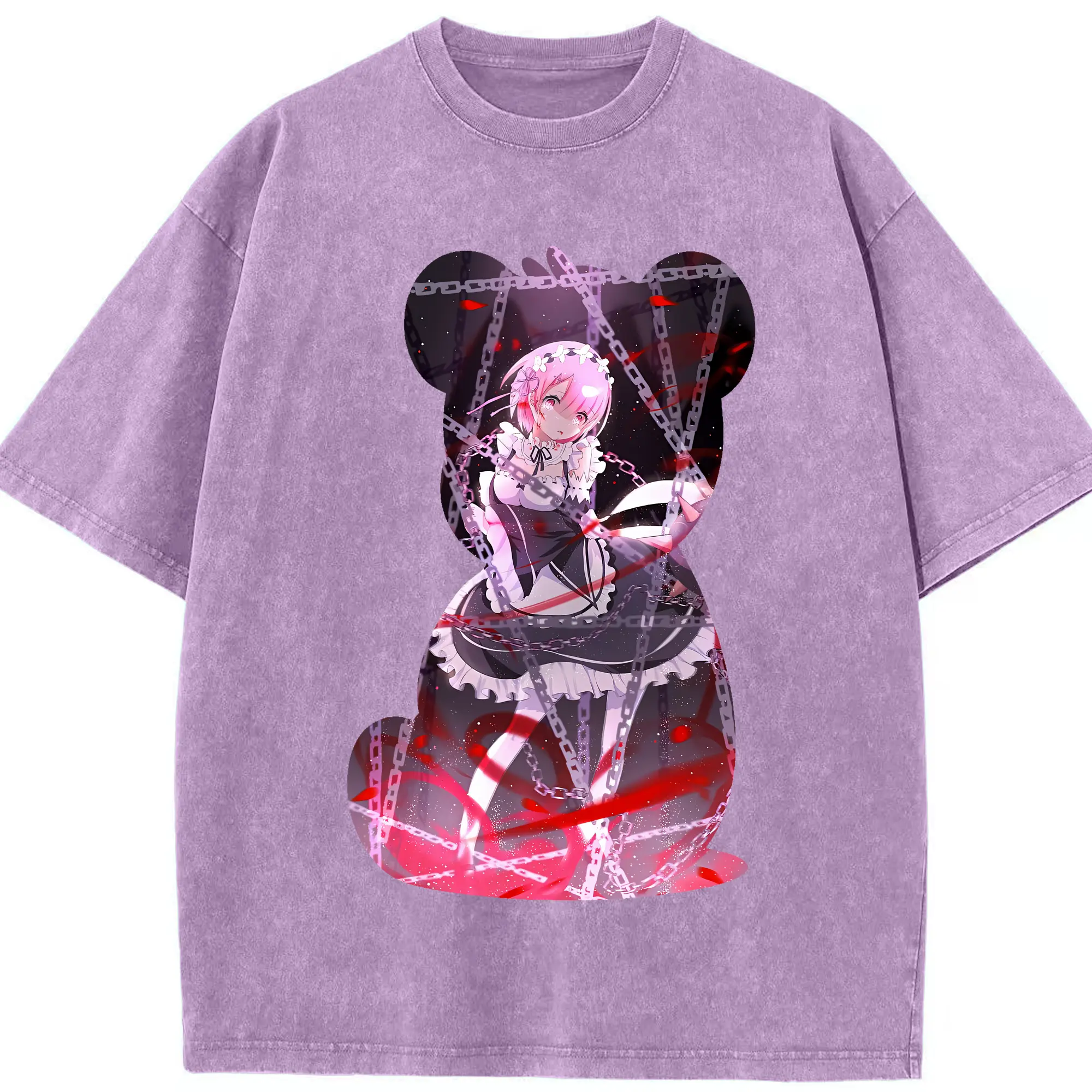 リゼロ グッズ ラム - 綿100% ヴィンテージ風 半袖Tシャツ ・ 背面プリント ・ 柔らか肌触り ・ 通気性 快適 ・ スポーツ カジュアル 外出用