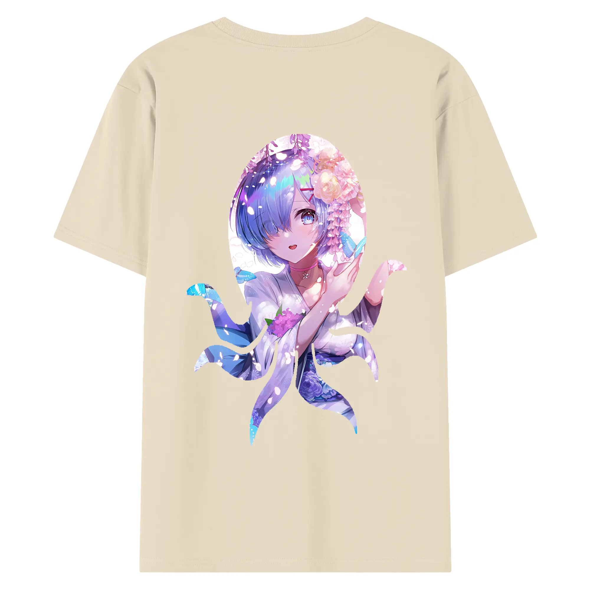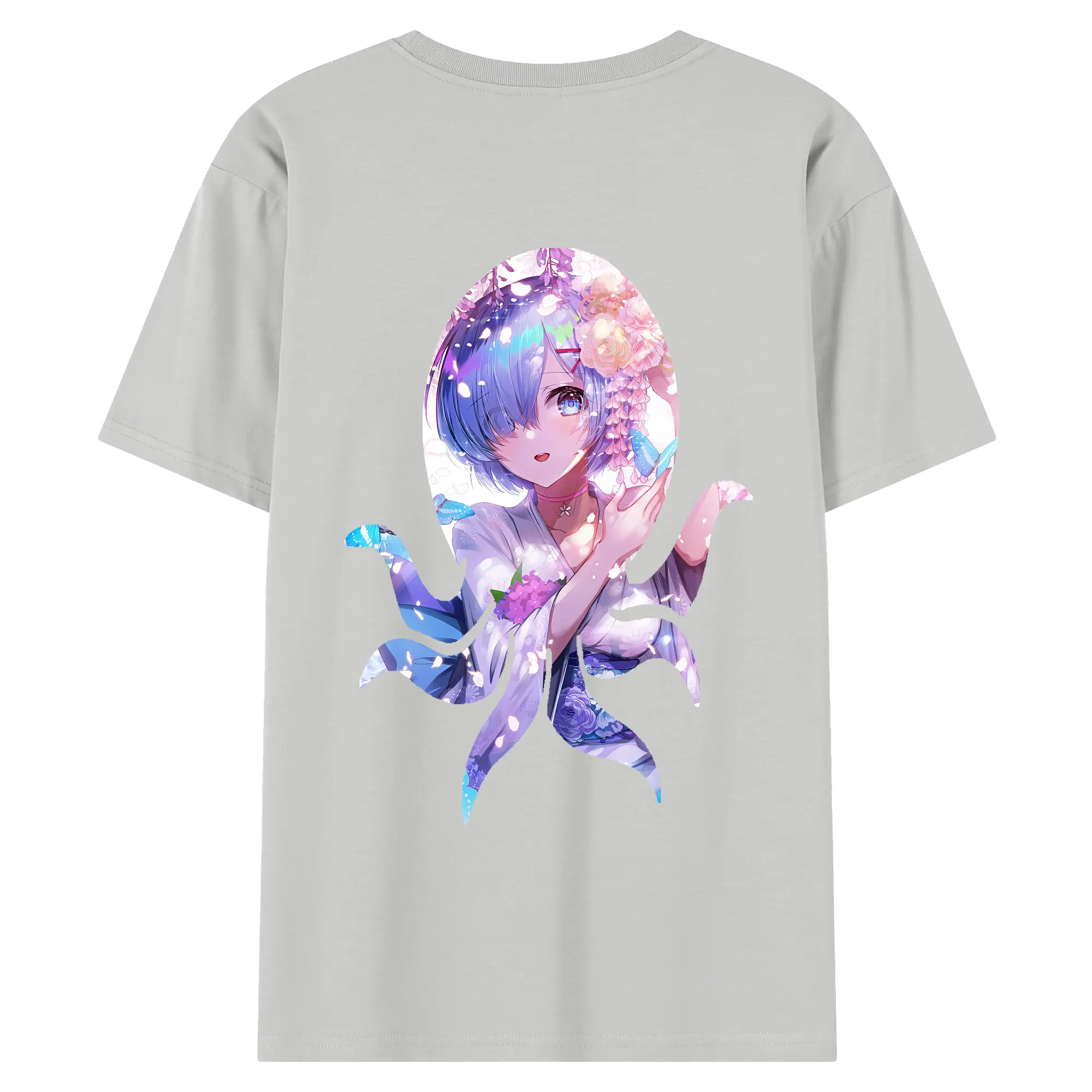 リゼロ グッズ レム - 綿100% ヴィンテージ風 半袖Tシャツ ・ 背面プリント ・ 柔らか肌触り ・ 通気性 快適 ・ スポーツ カジュアル 外出用