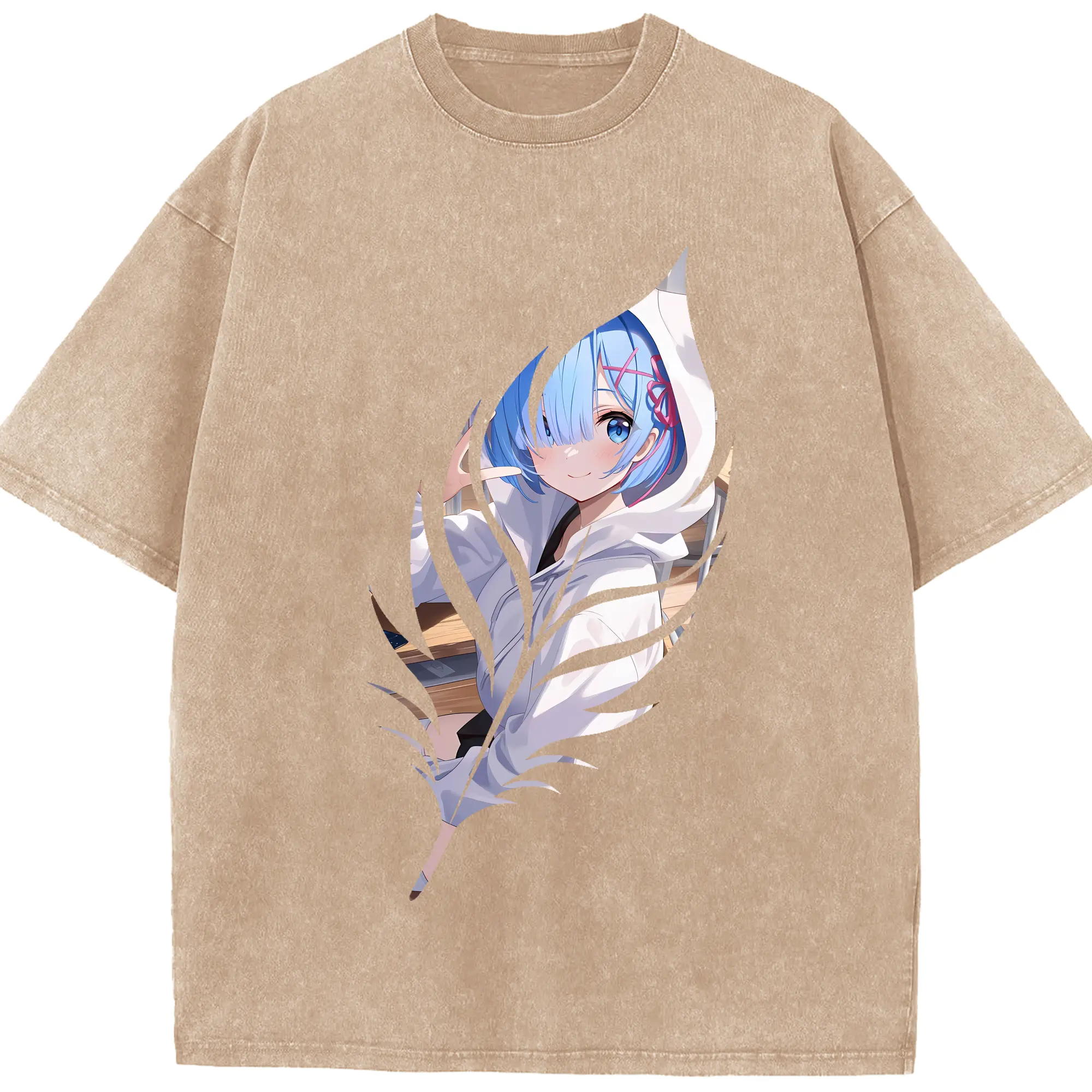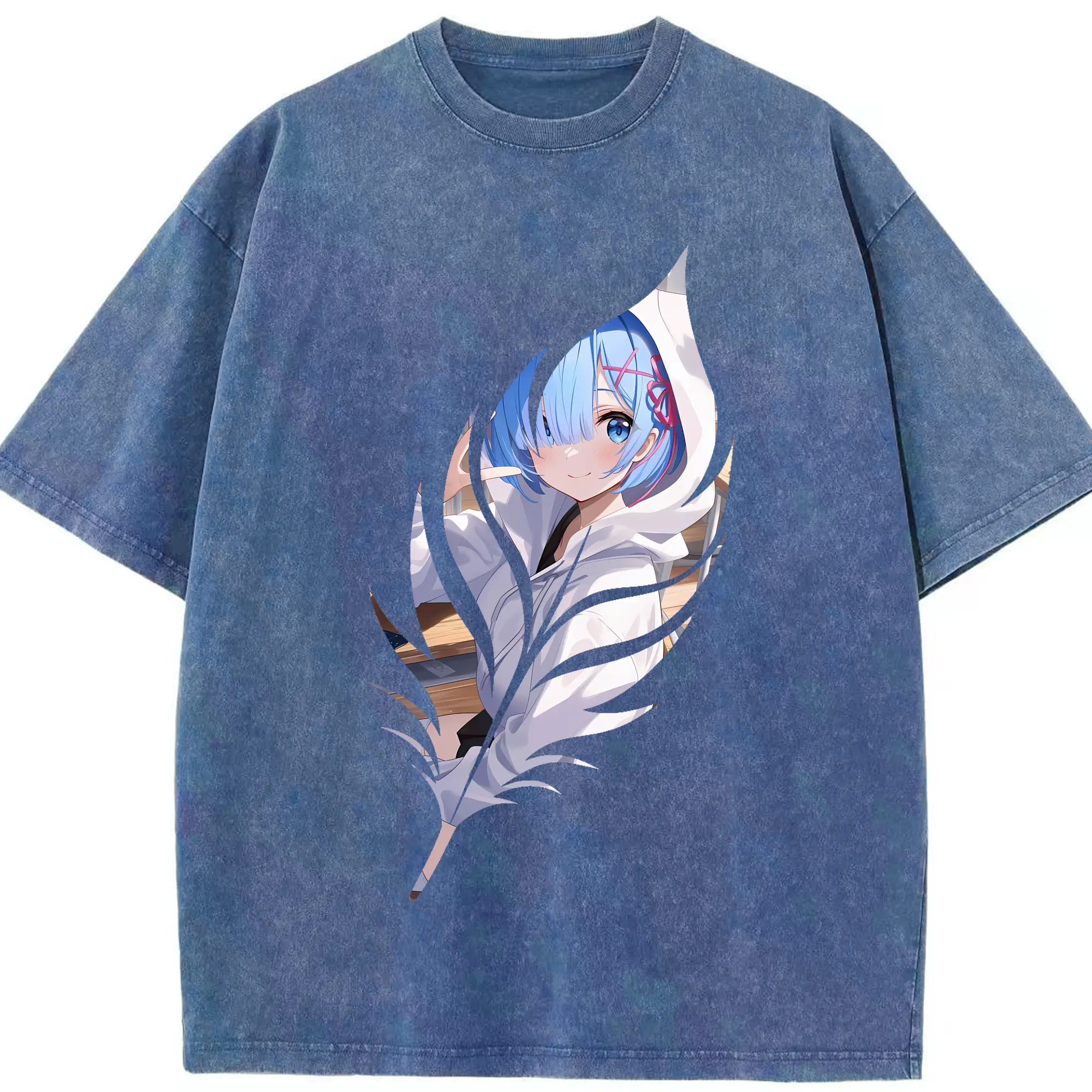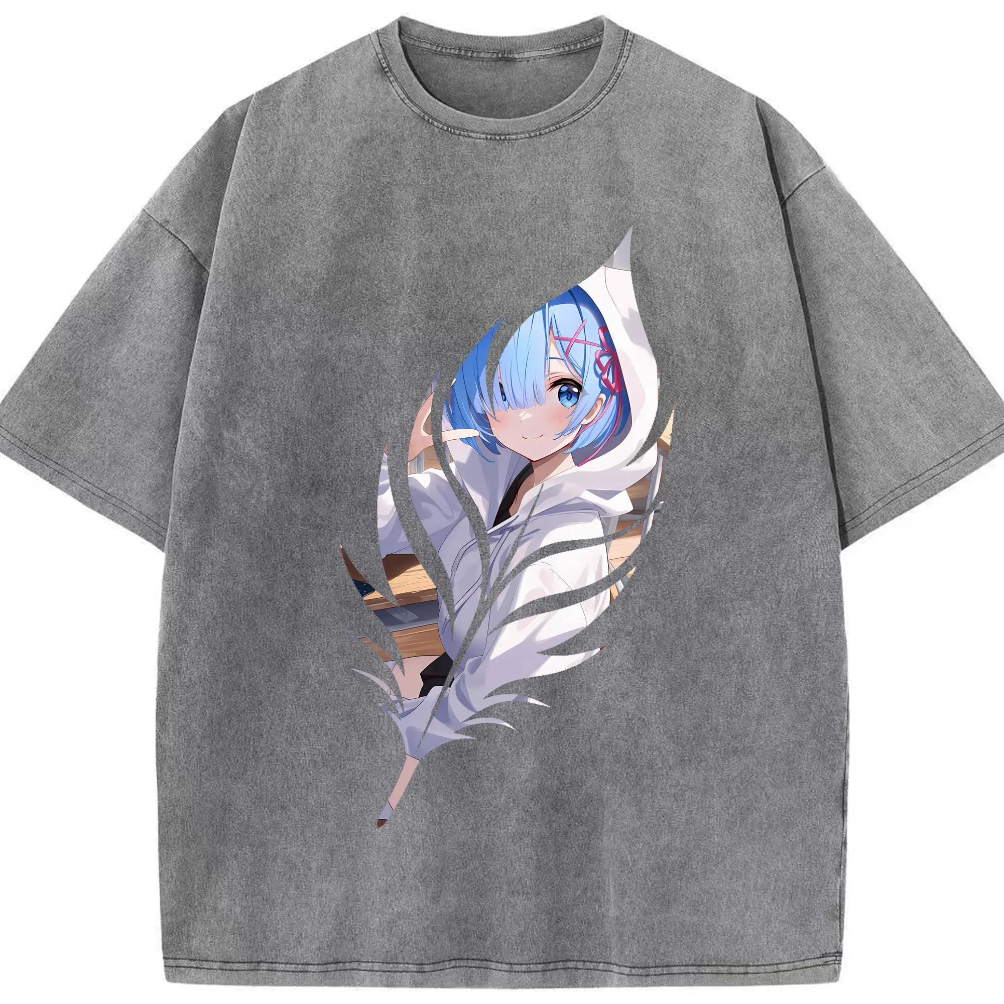 リゼロ グッズ レム - 綿100% ヴィンテージ風 半袖Tシャツ ・ 背面プリント ・ 柔らか肌触り ・ 通気性 快適 ・ スポーツ カジュアル 外出用