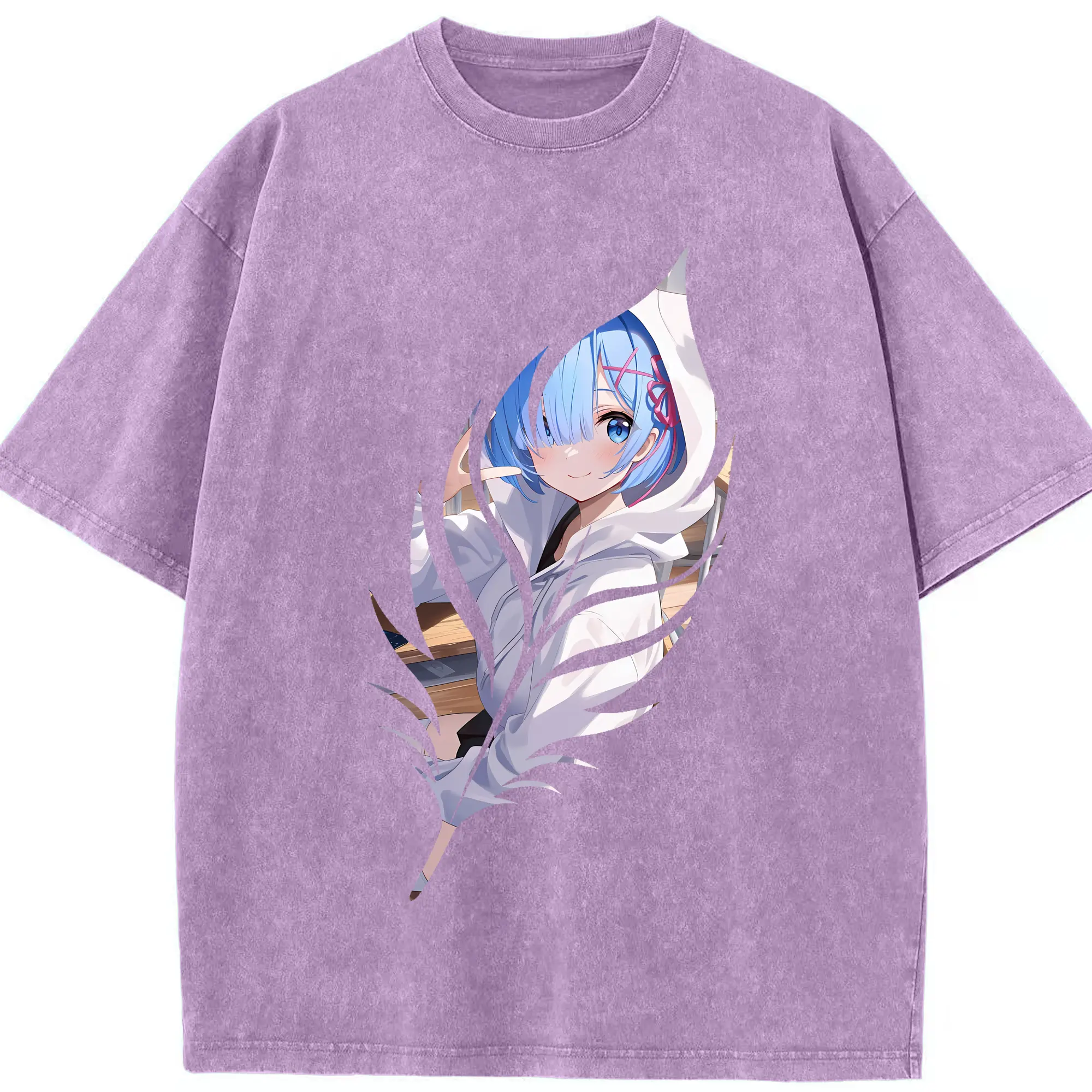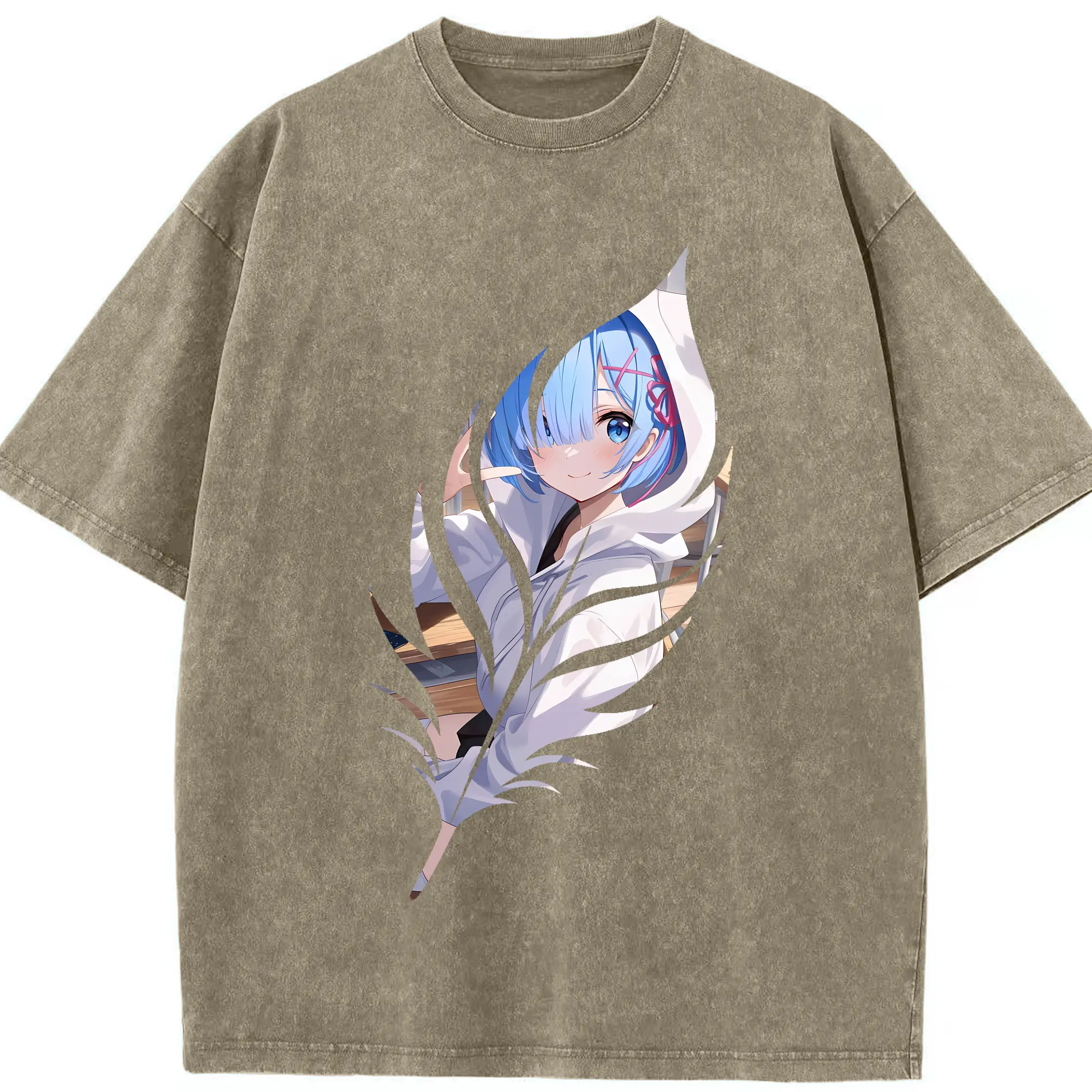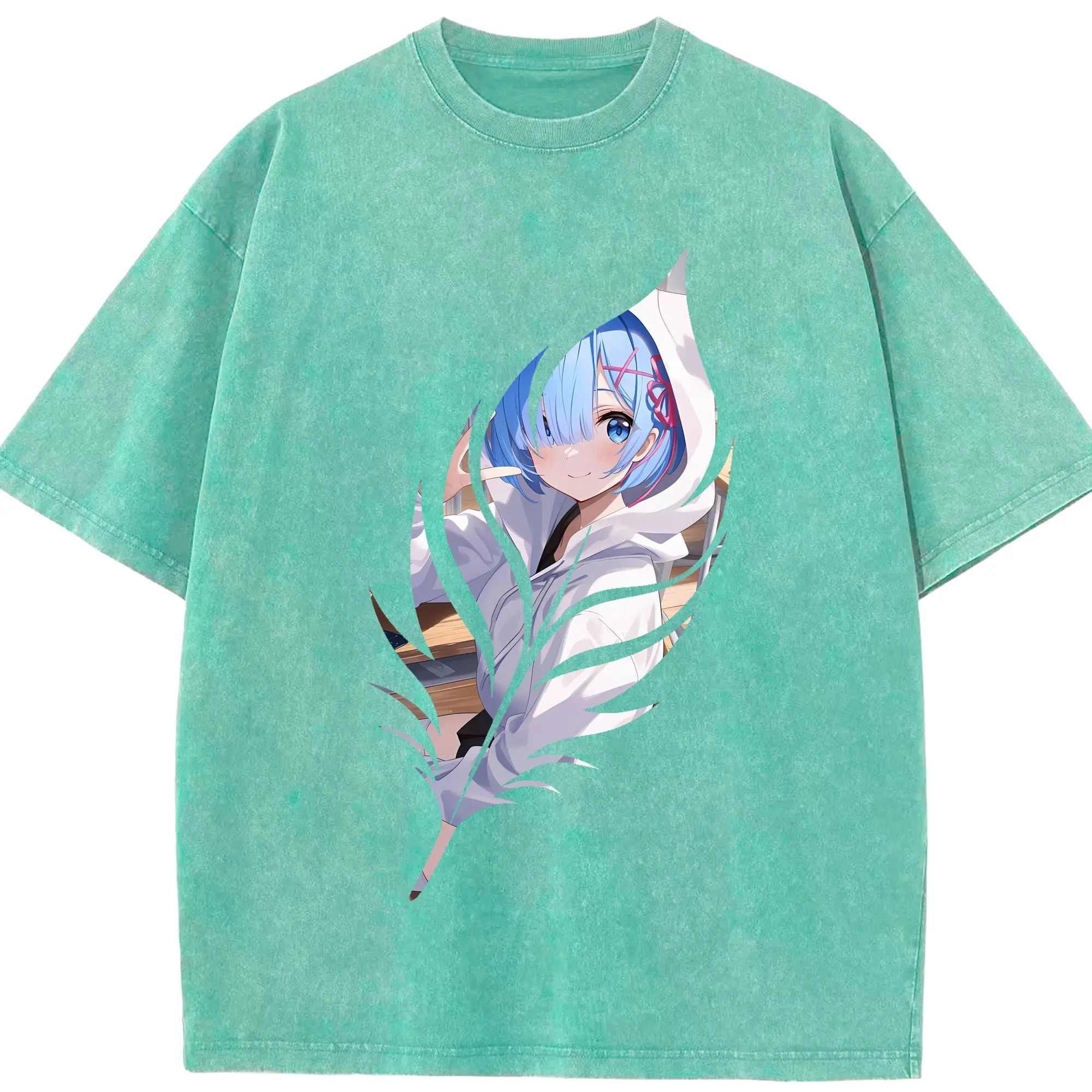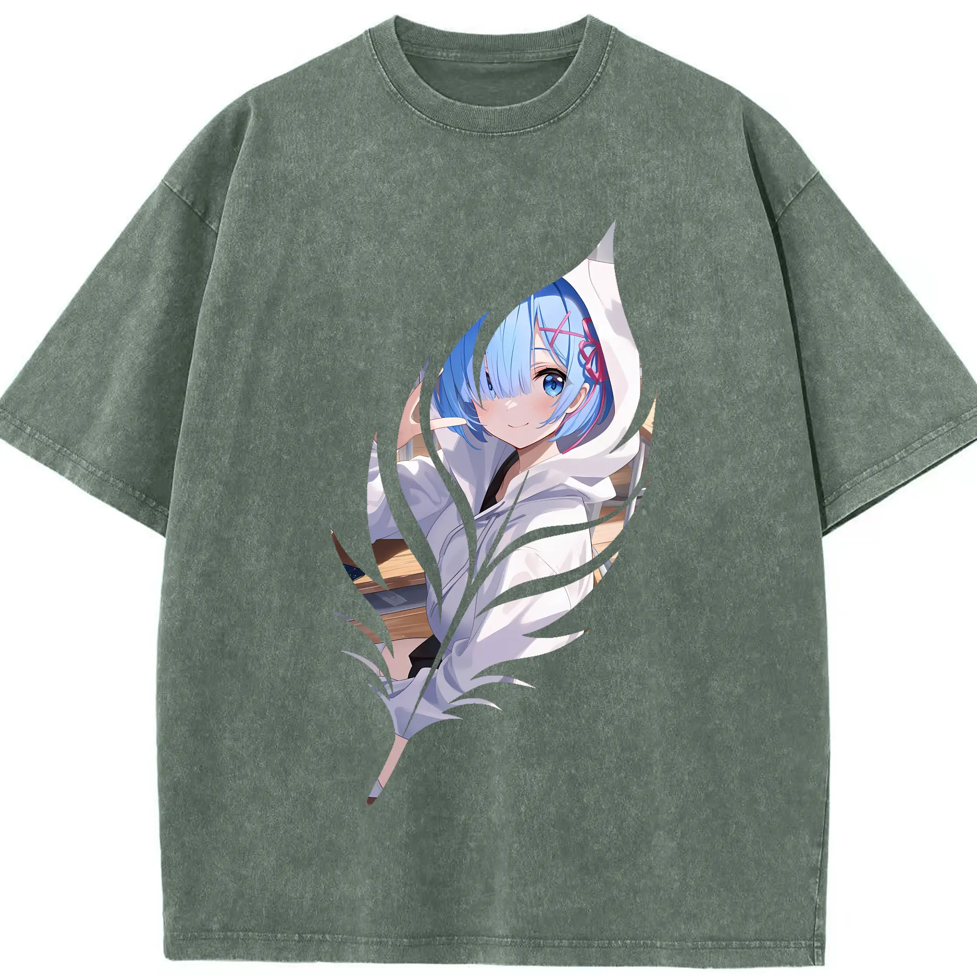 リゼロ グッズ レム - 綿100% ヴィンテージ風 半袖Tシャツ ・ 背面プリント ・ 柔らか肌触り ・ 通気性 快適 ・ スポーツ カジュアル 外出用