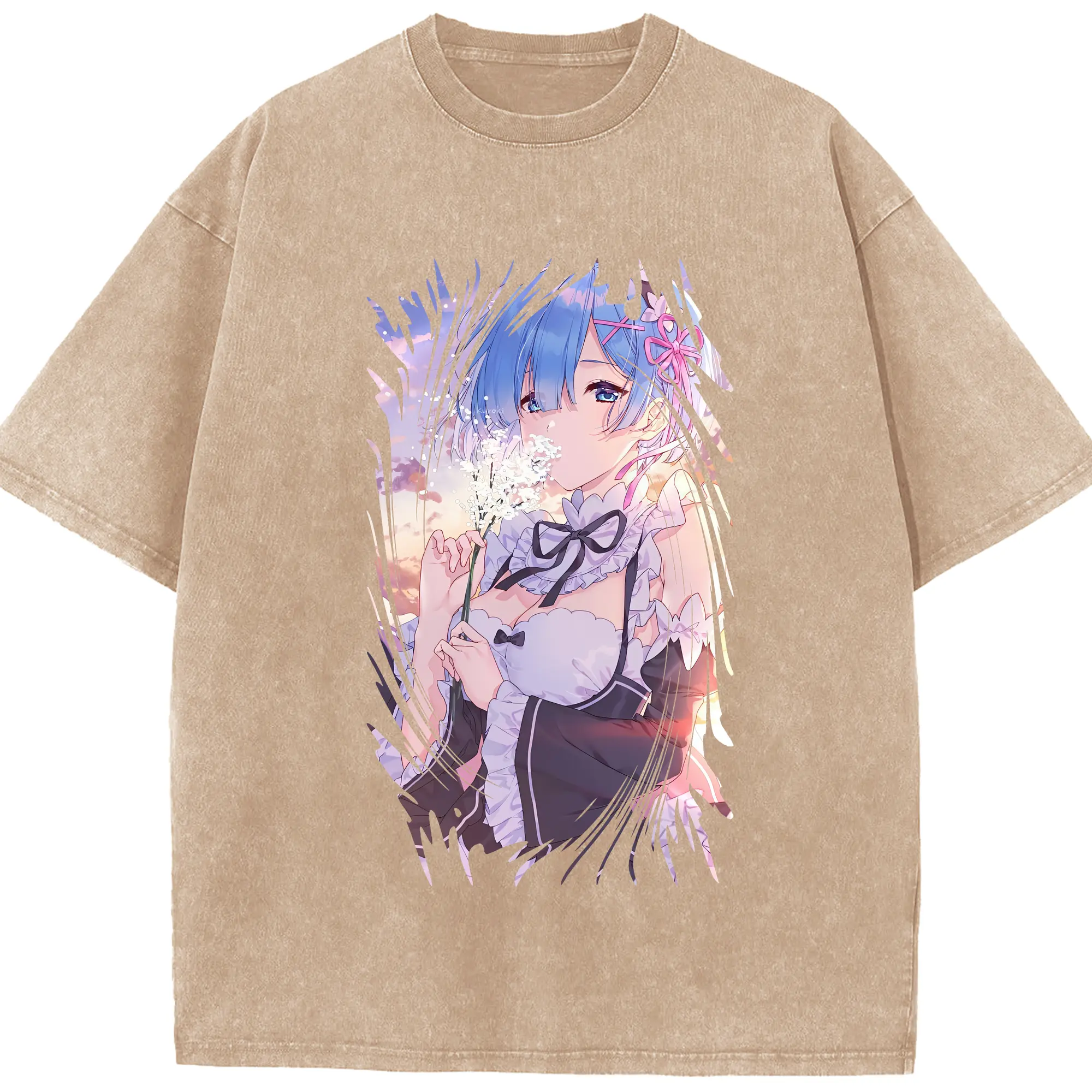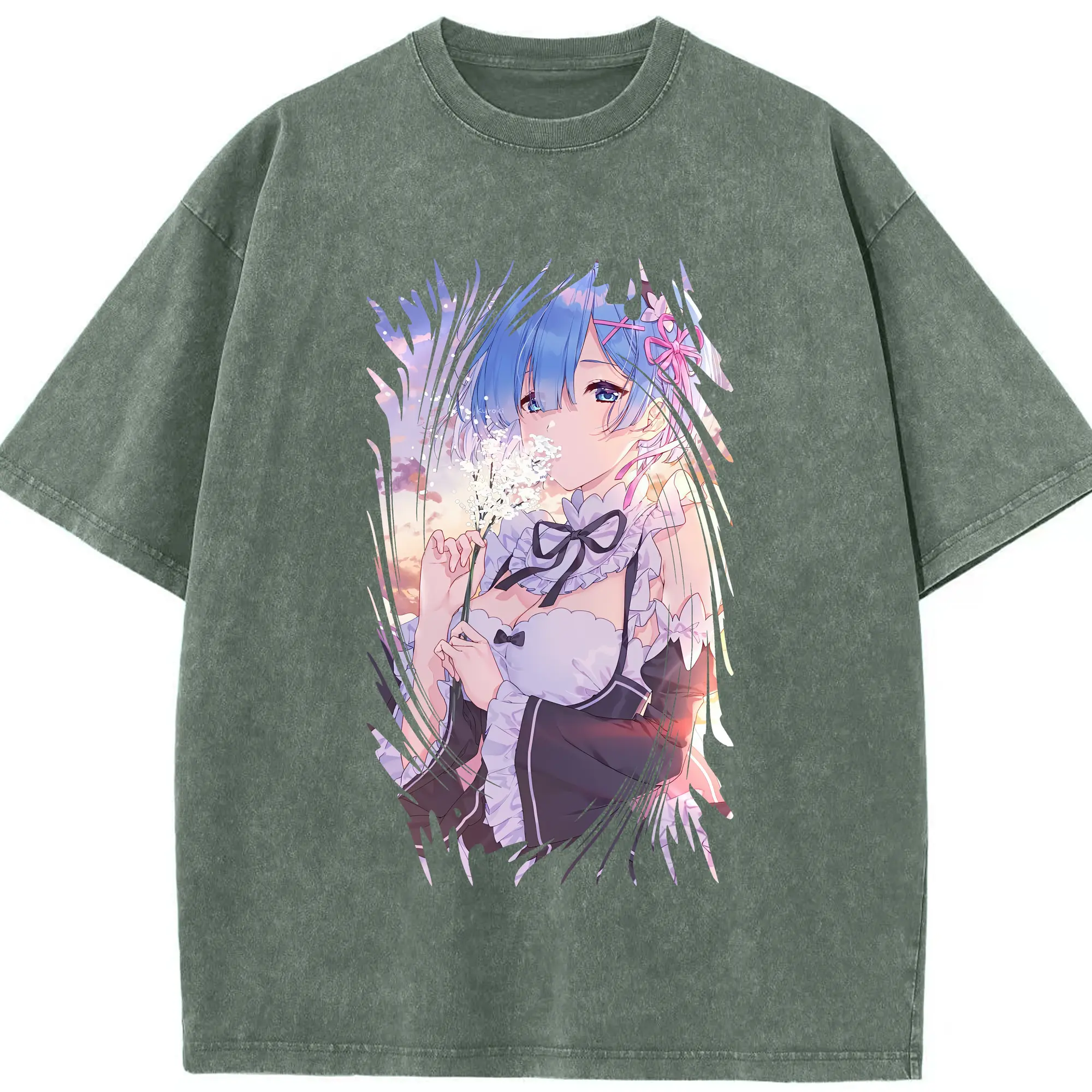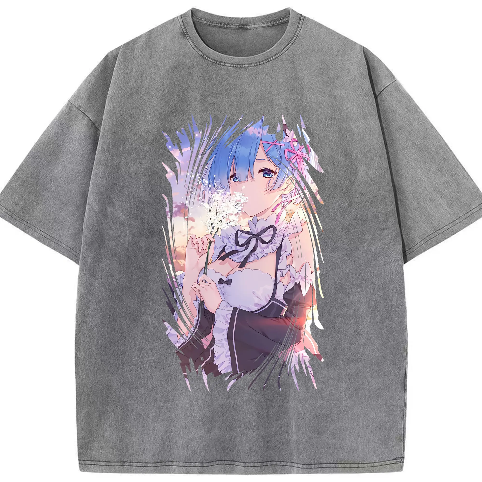 リゼロ グッズ レム - 綿100% ヴィンテージ風 半袖Tシャツ ・ 背面プリント ・ 柔らか肌触り ・ 通気性 快適 ・ スポーツ カジュアル 外出用