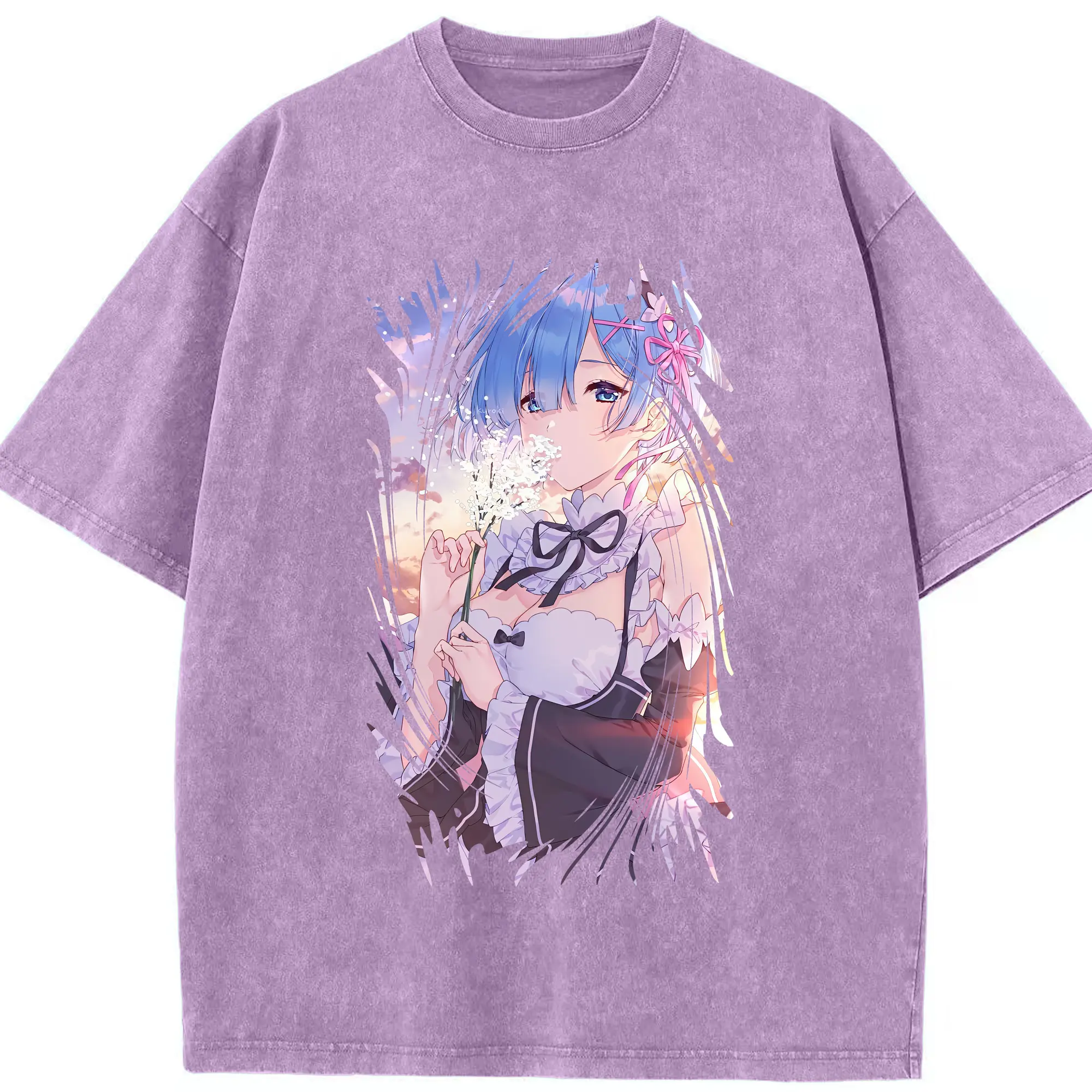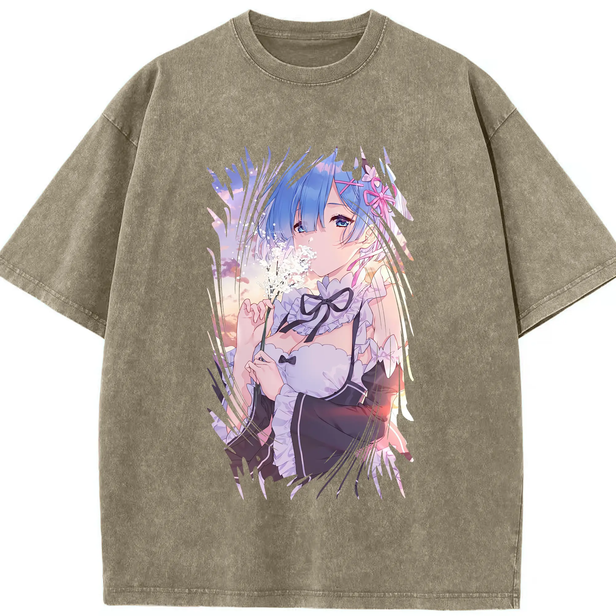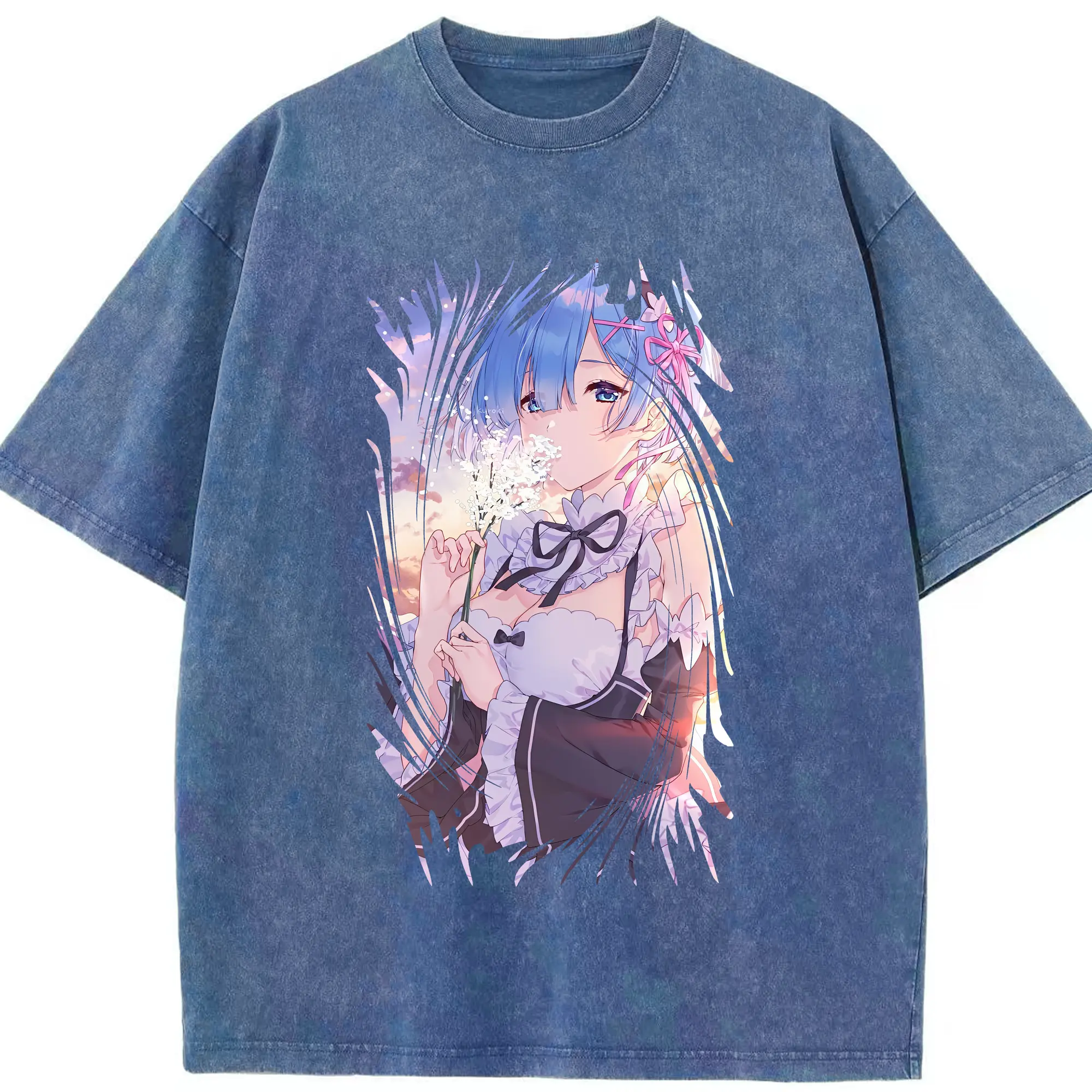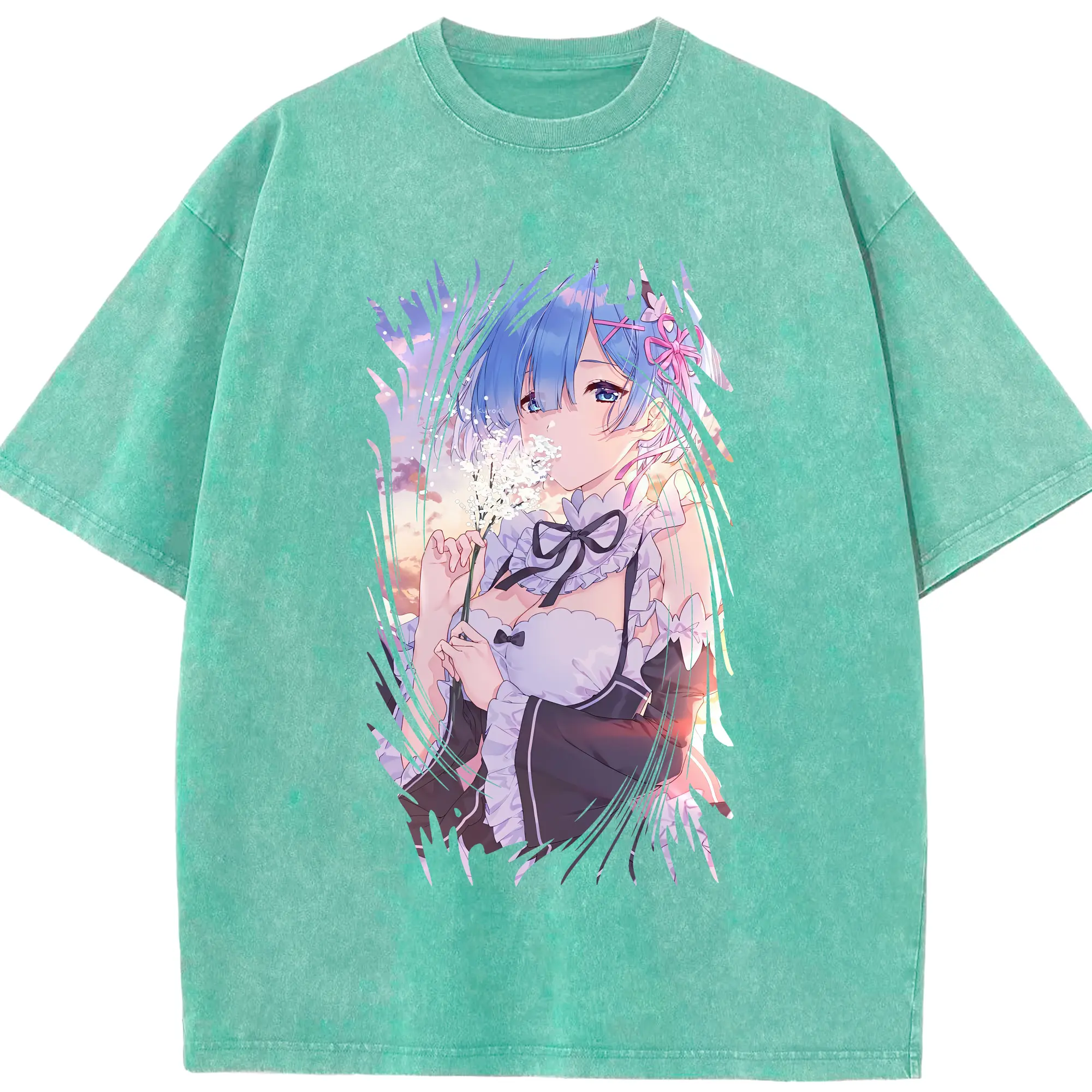 リゼロ グッズ レム - 綿100% ヴィンテージ風 半袖Tシャツ ・ 背面プリント ・ 柔らか肌触り ・ 通気性 快適 ・ スポーツ カジュアル 外出用