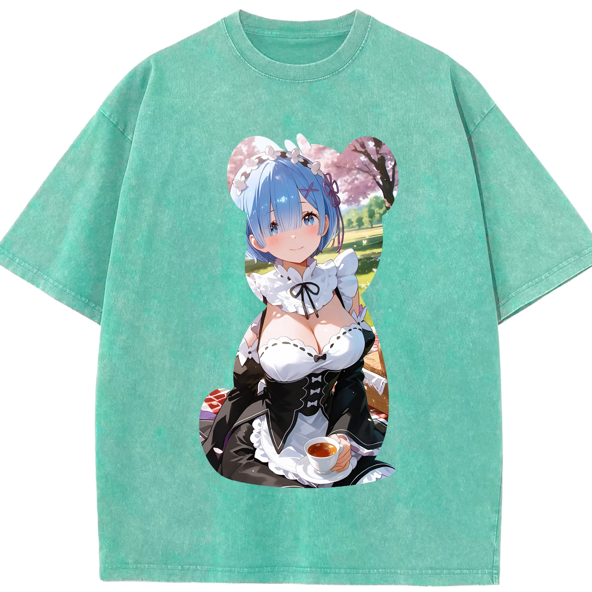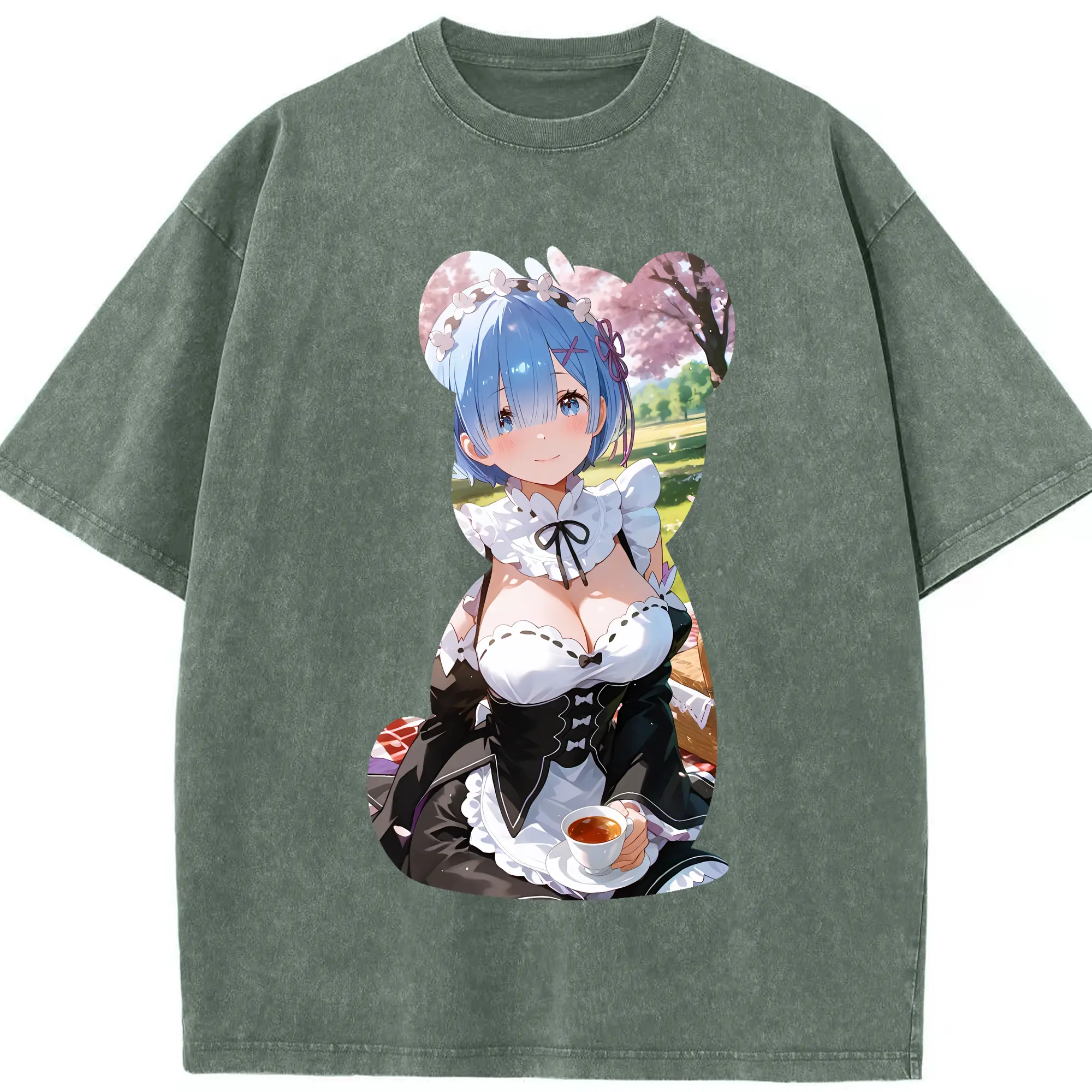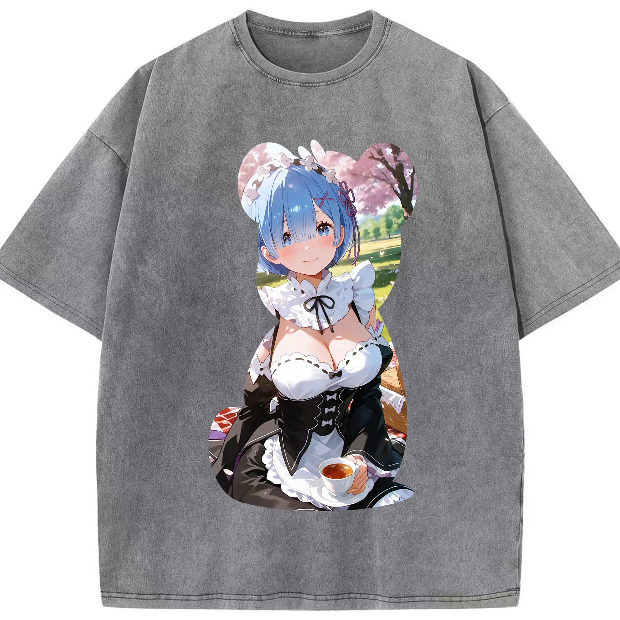 リゼロ グッズ レム - 綿100% ヴィンテージ風 半袖Tシャツ ・ 背面プリント ・ 柔らか肌触り ・ 通気性 快適 ・ スポーツ カジュアル 外出用