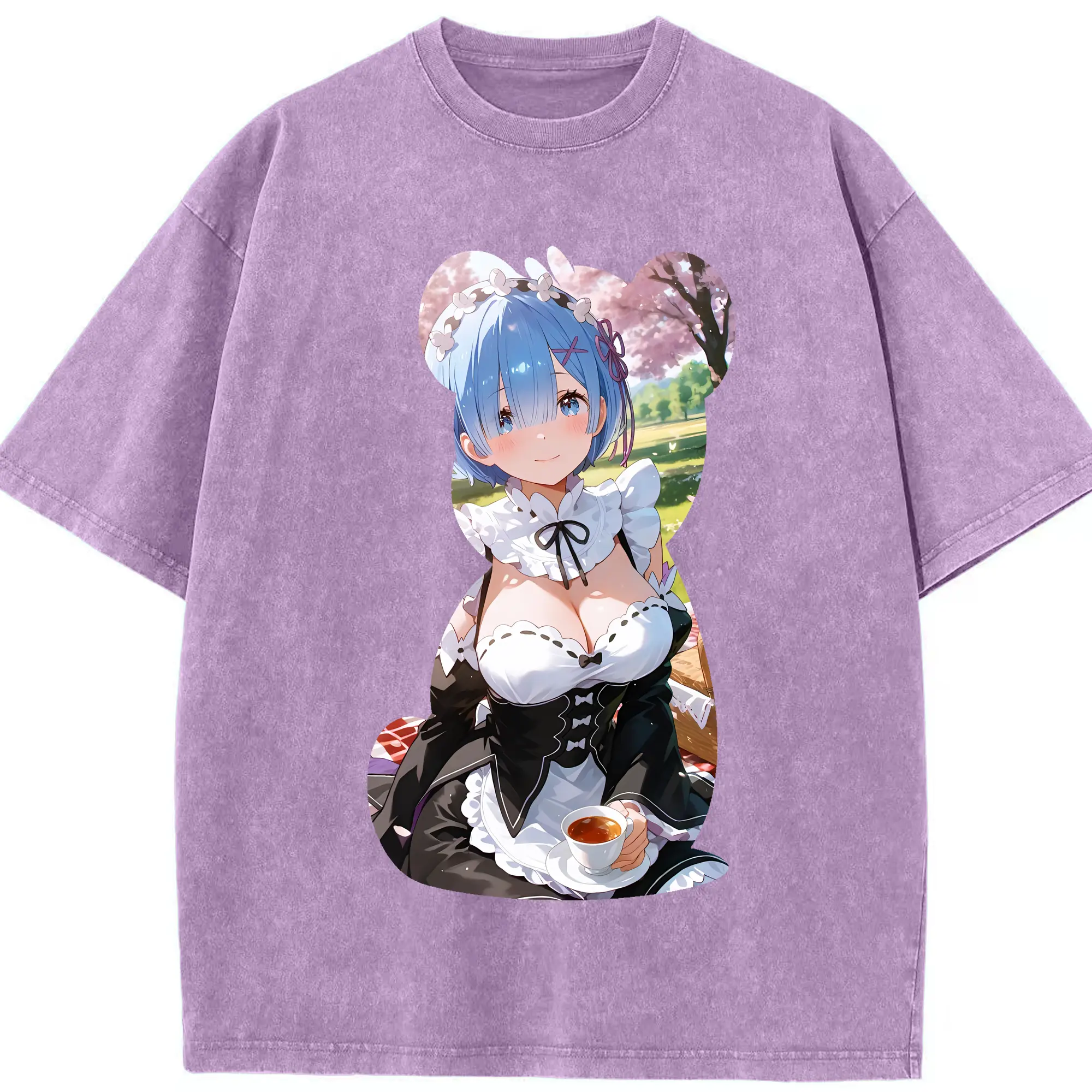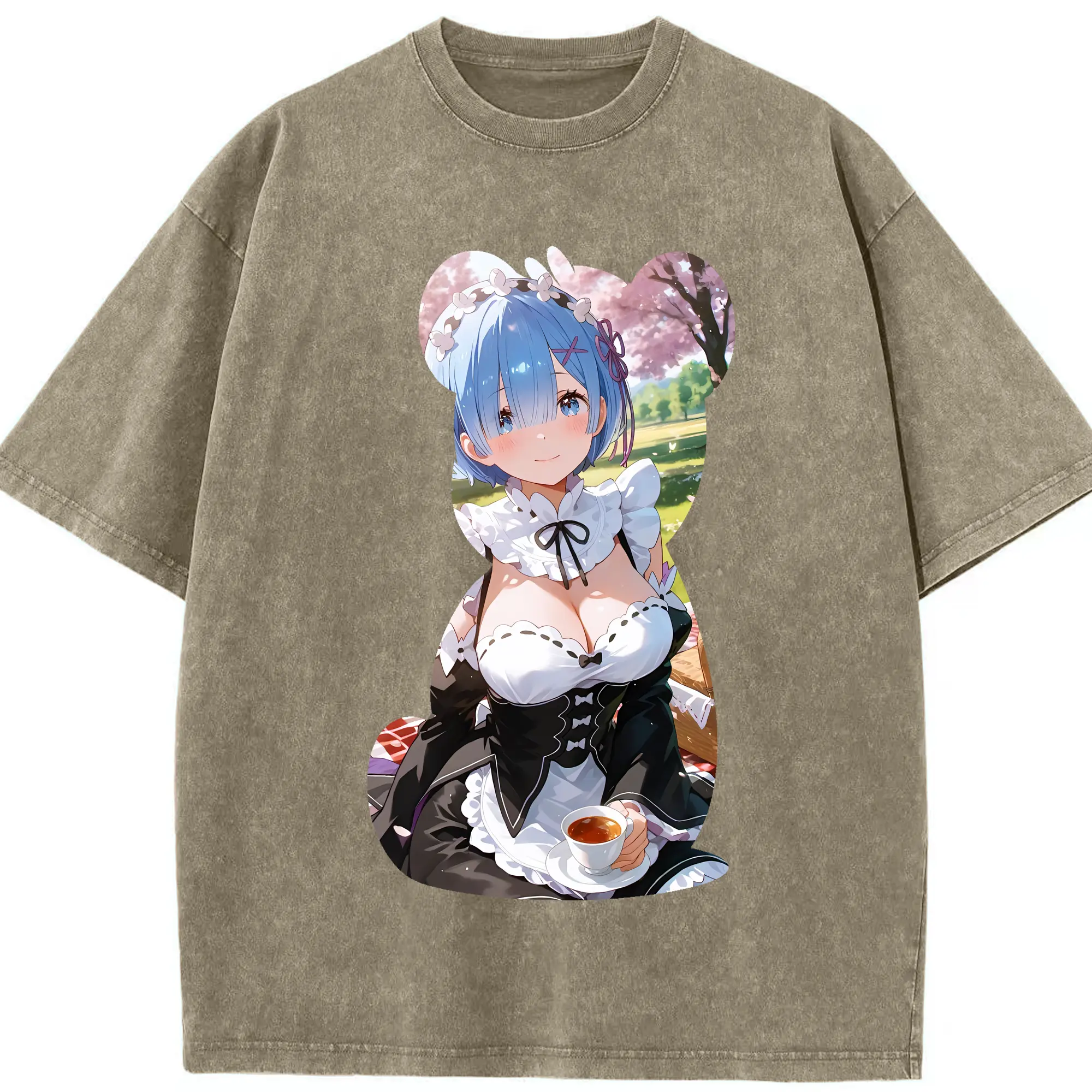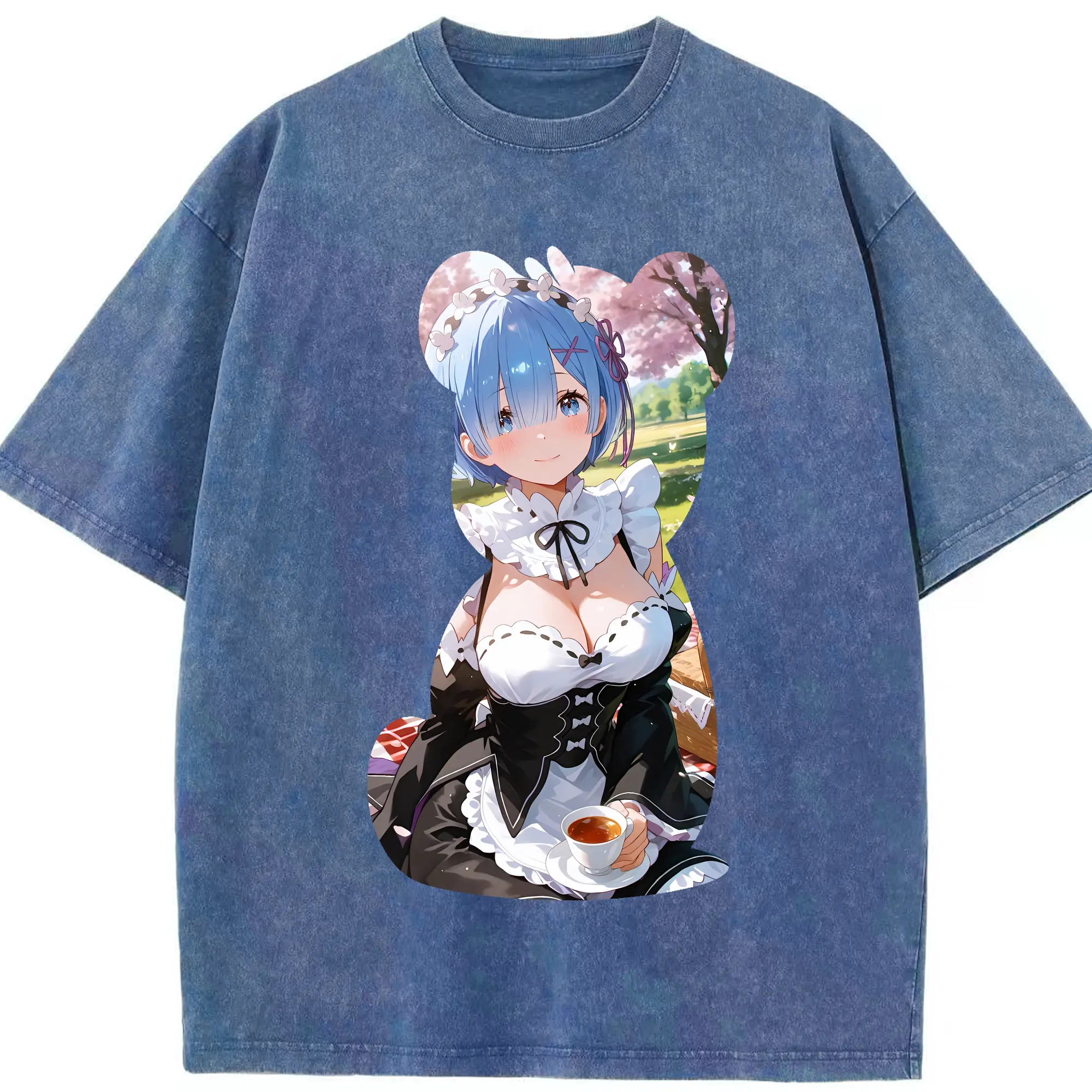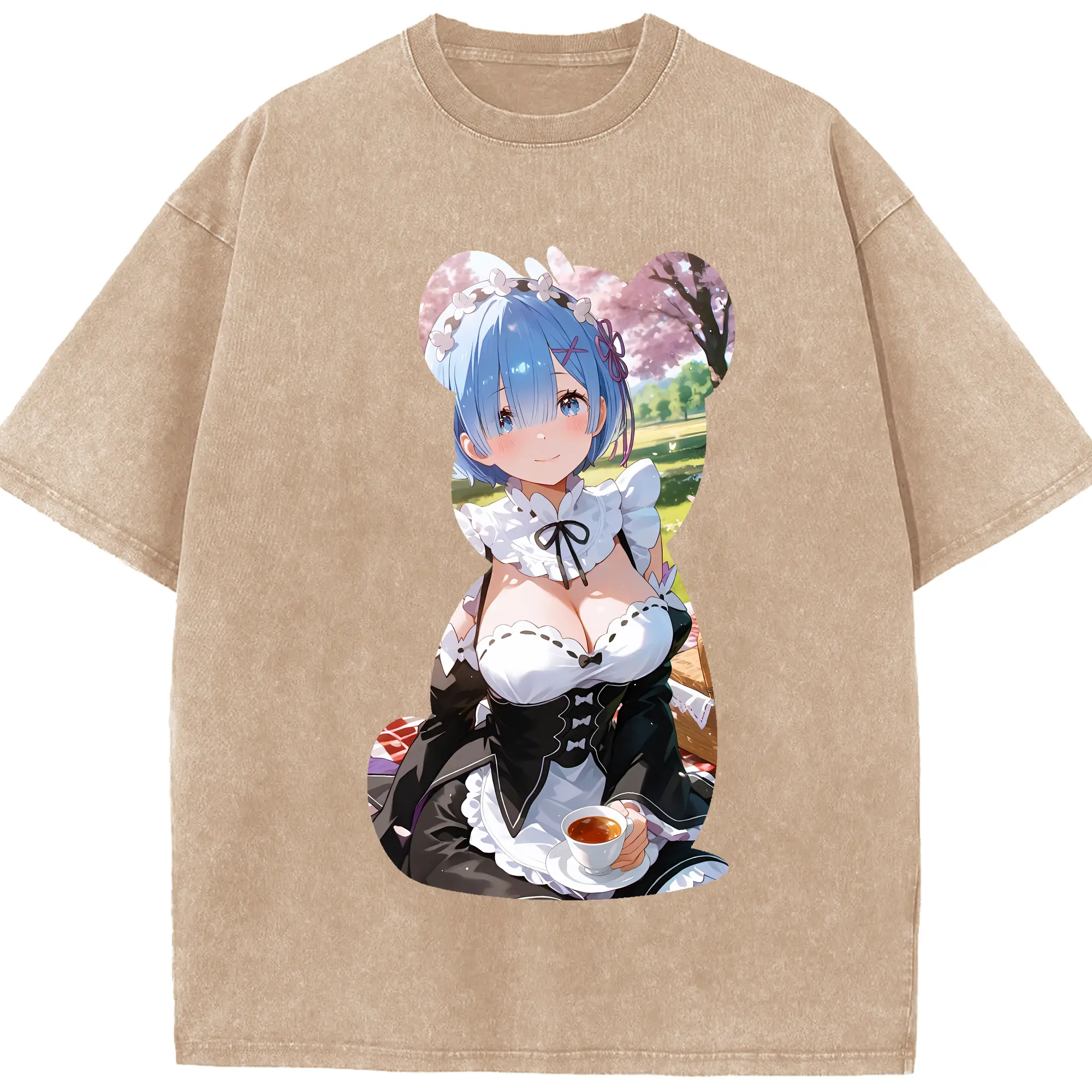 リゼロ グッズ レム - 綿100% ヴィンテージ風 半袖Tシャツ ・ 背面プリント ・ 柔らか肌触り ・ 通気性 快適 ・ スポーツ カジュアル 外出用