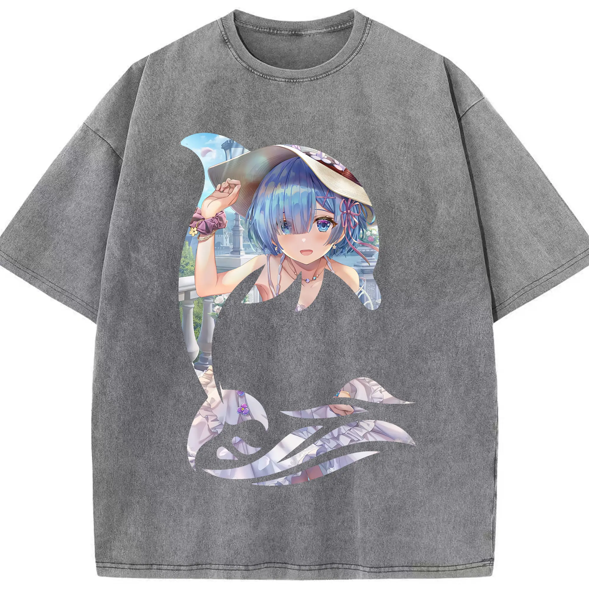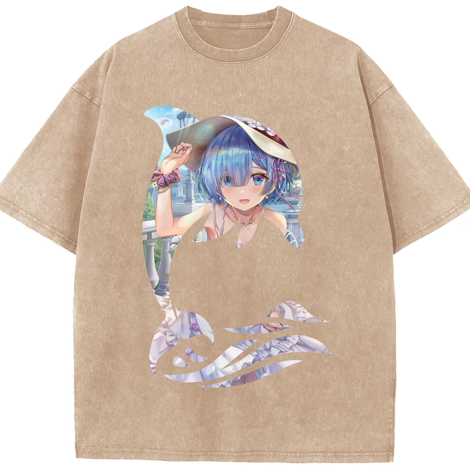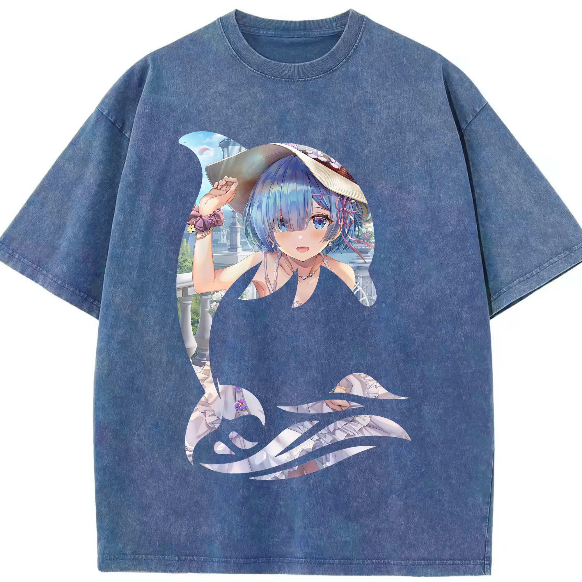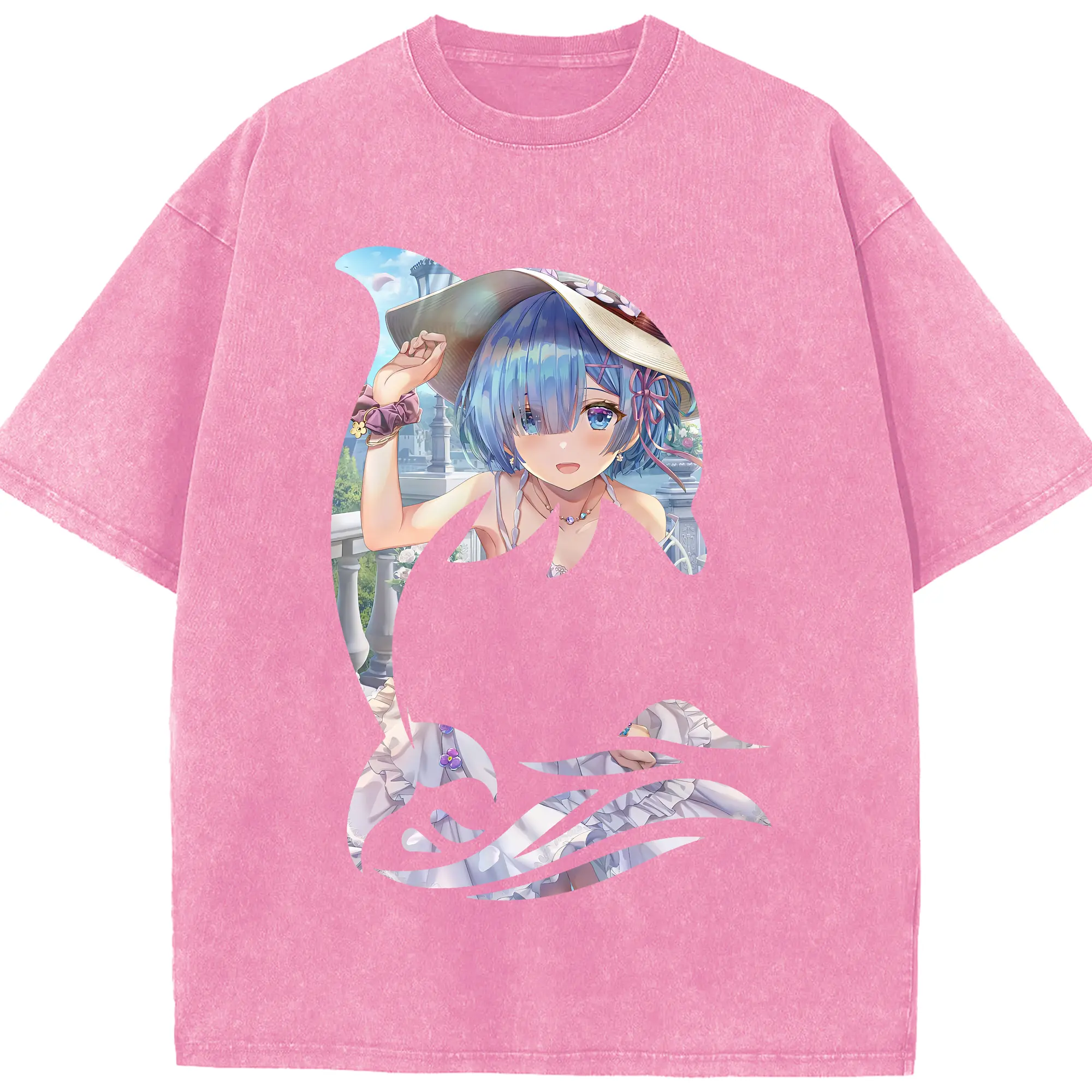 リゼロ グッズ レム - 綿100% ヴィンテージ風 半袖Tシャツ ・ 背面プリント ・ 柔らか肌触り ・ 通気性 快適 ・ スポーツ カジュアル 外出用