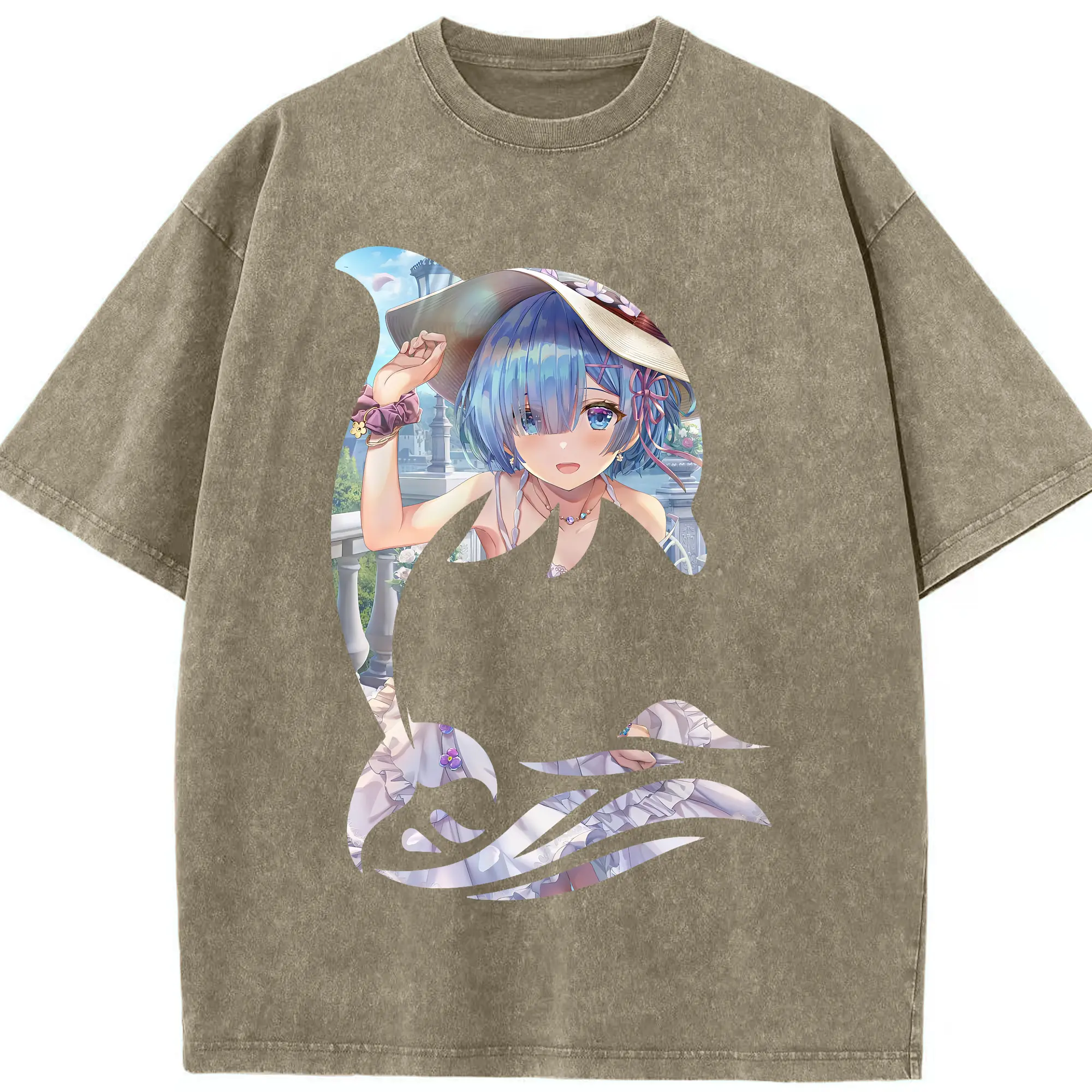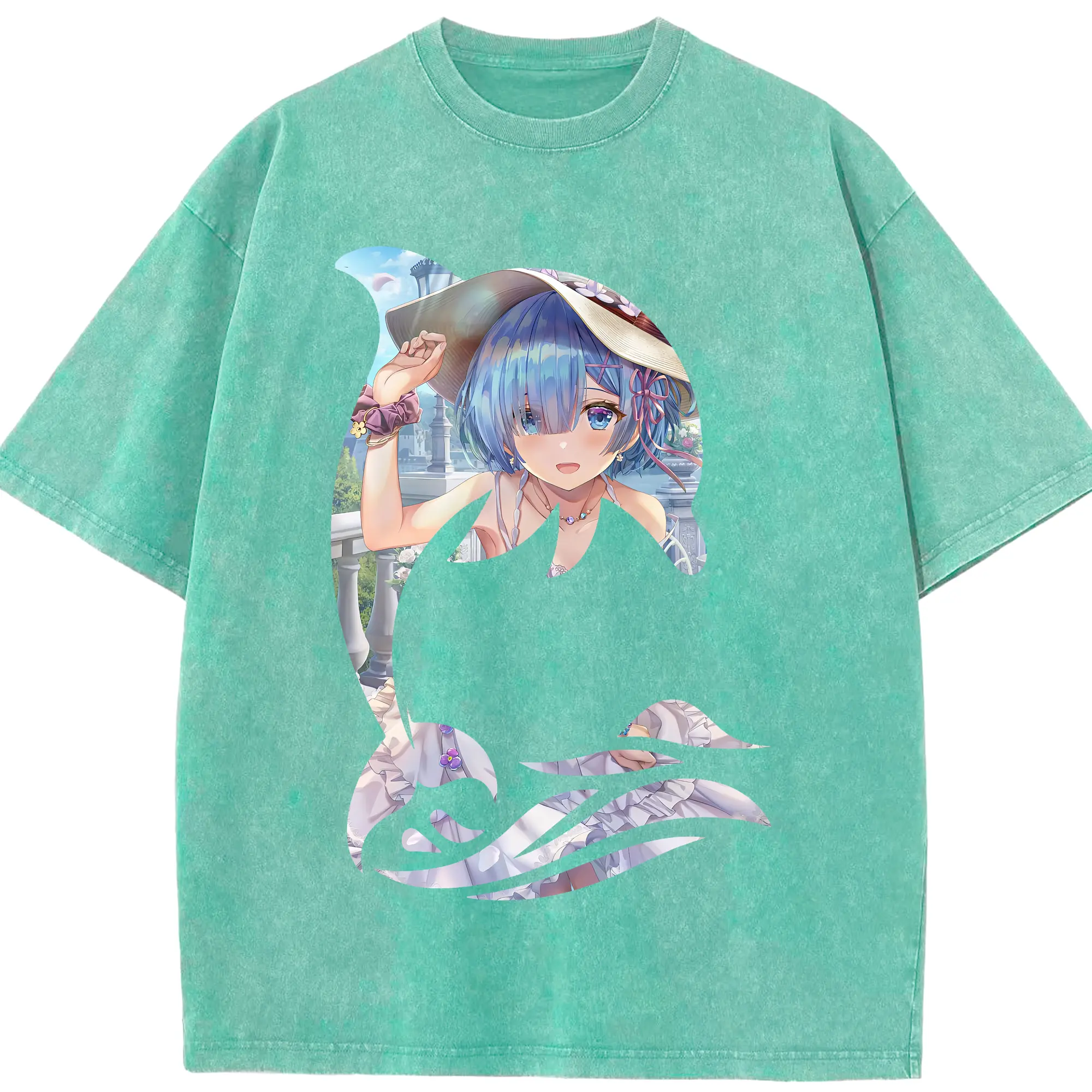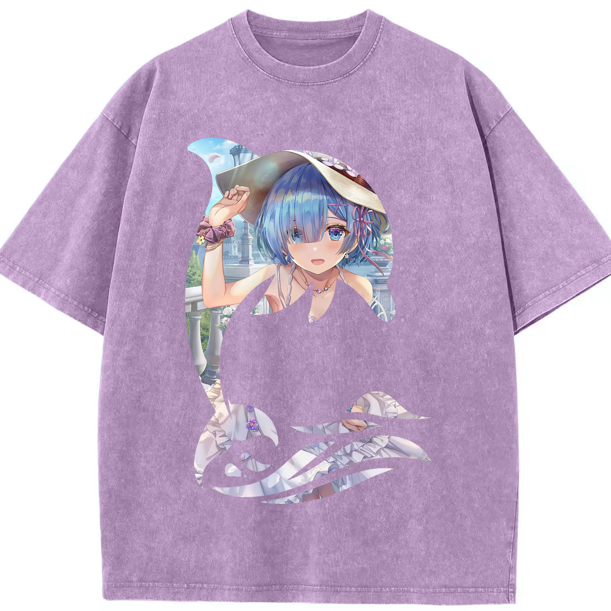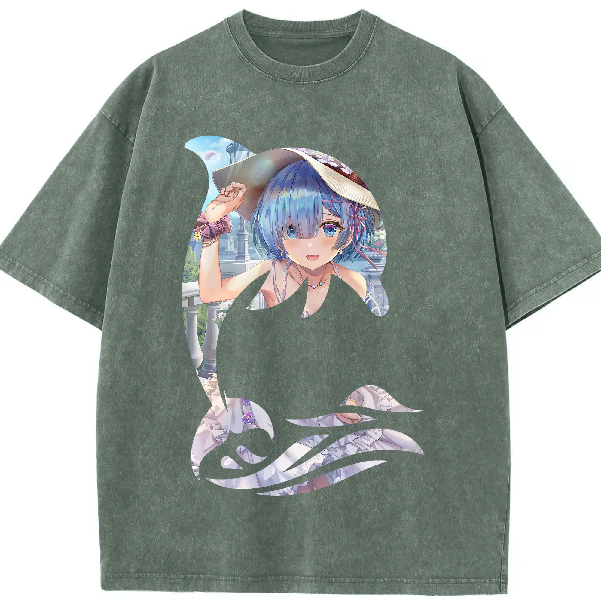 リゼロ グッズ レム - 綿100% ヴィンテージ風 半袖Tシャツ ・ 背面プリント ・ 柔らか肌触り ・ 通気性 快適 ・ スポーツ カジュアル 外出用