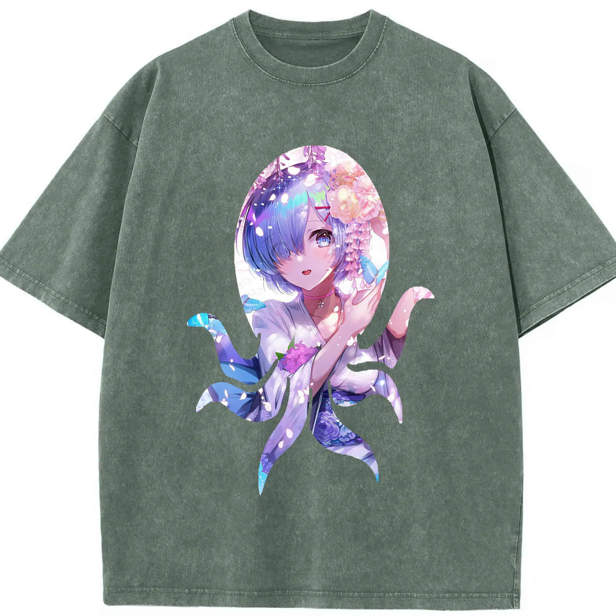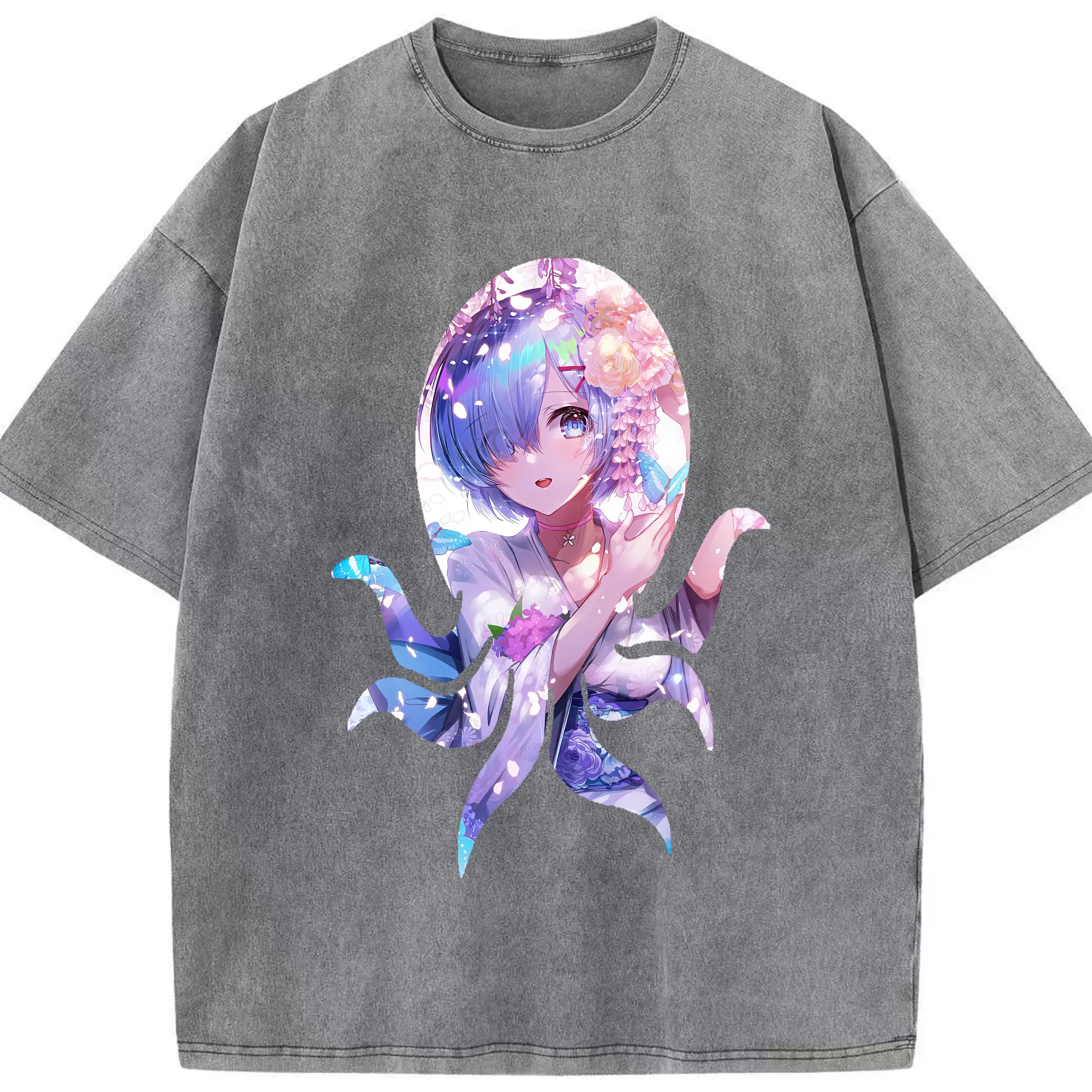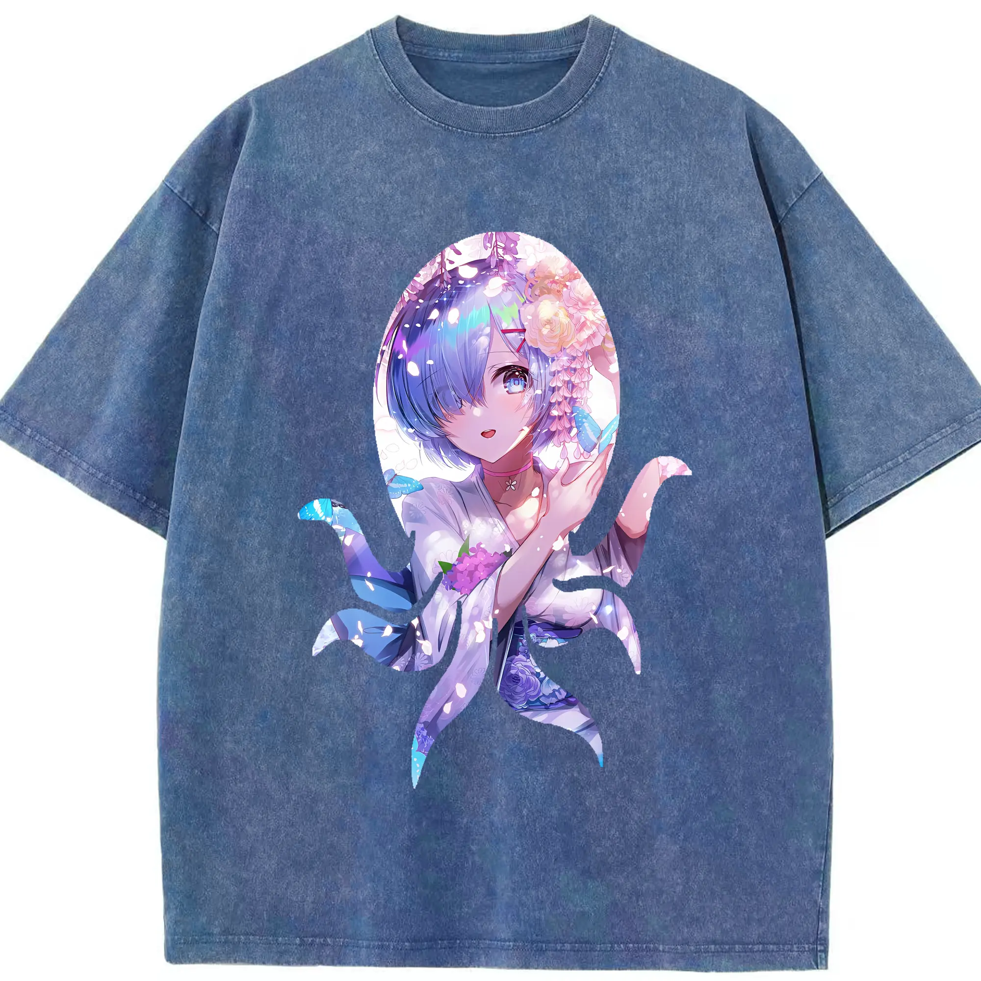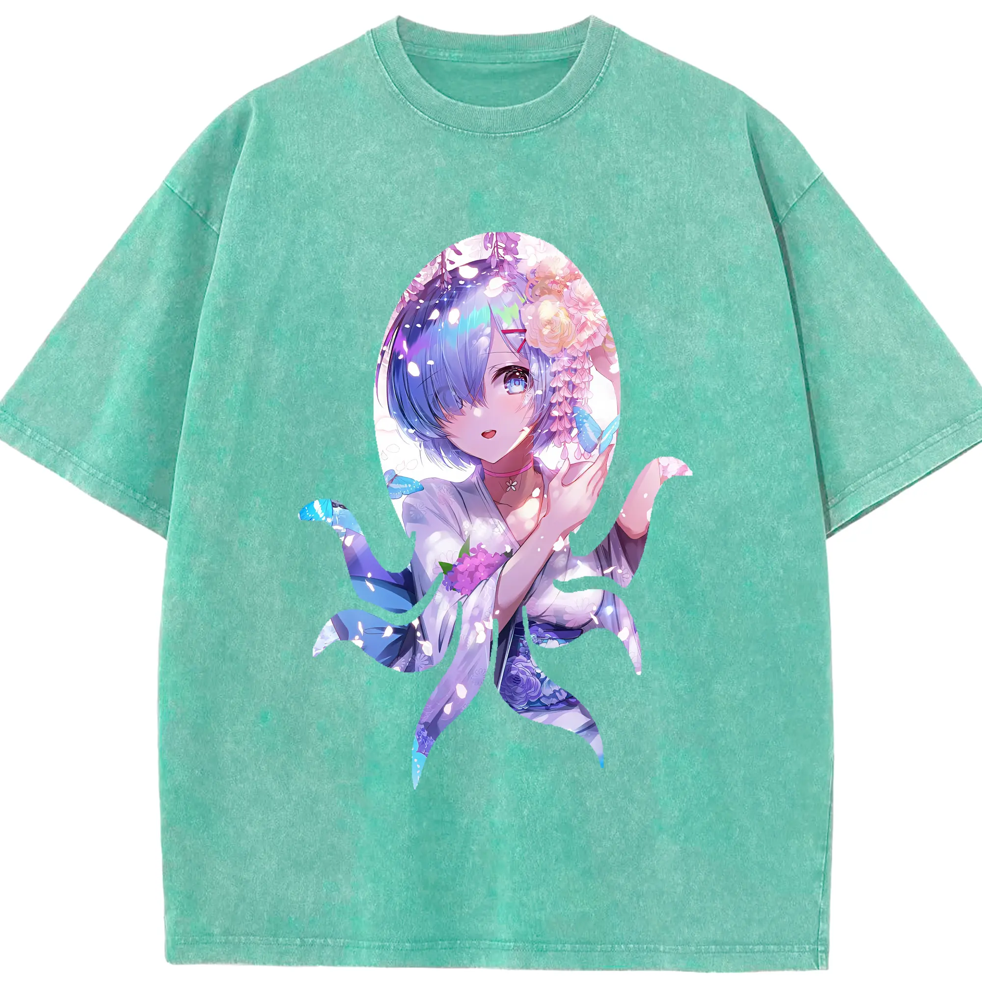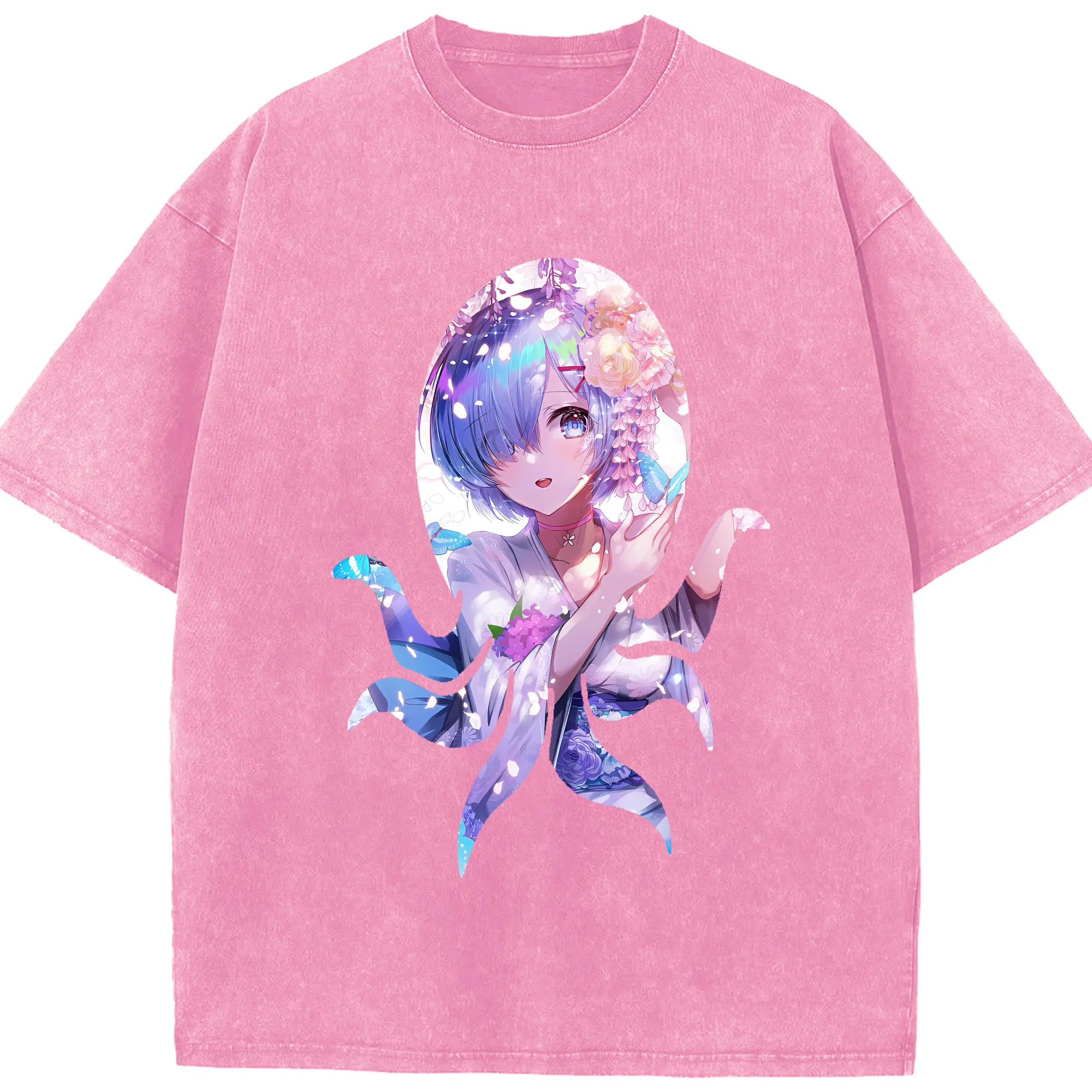 リゼロ グッズ レム - 綿100% ヴィンテージ風 半袖Tシャツ ・ 背面プリント ・ 柔らか肌触り ・ 通気性 快適 ・ スポーツ カジュアル 外出用