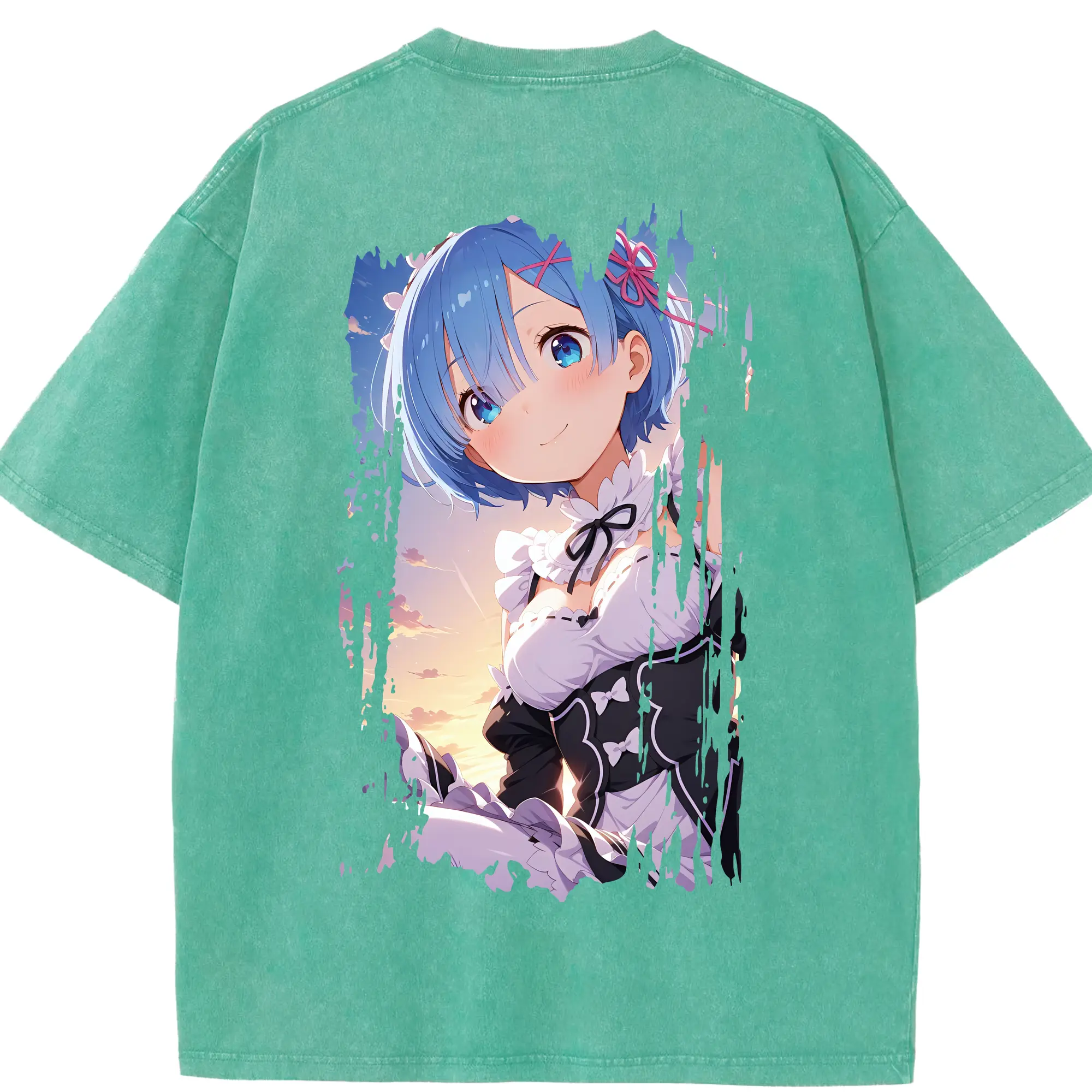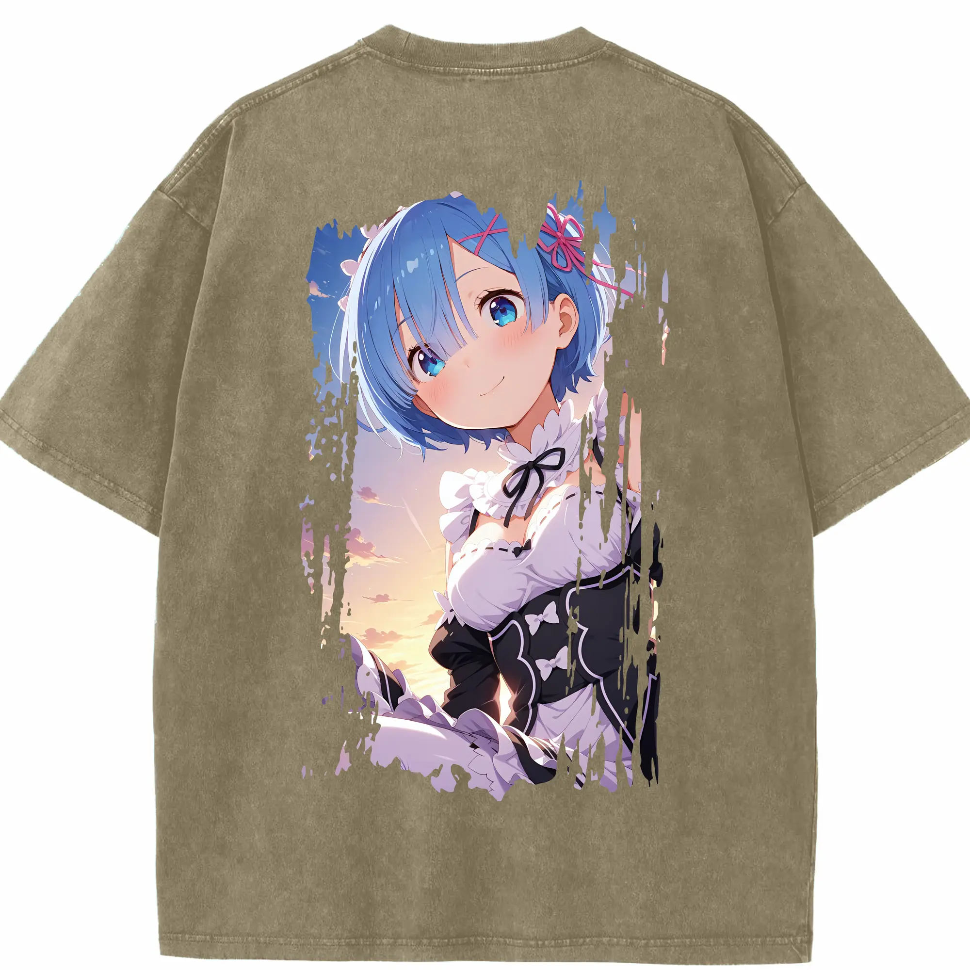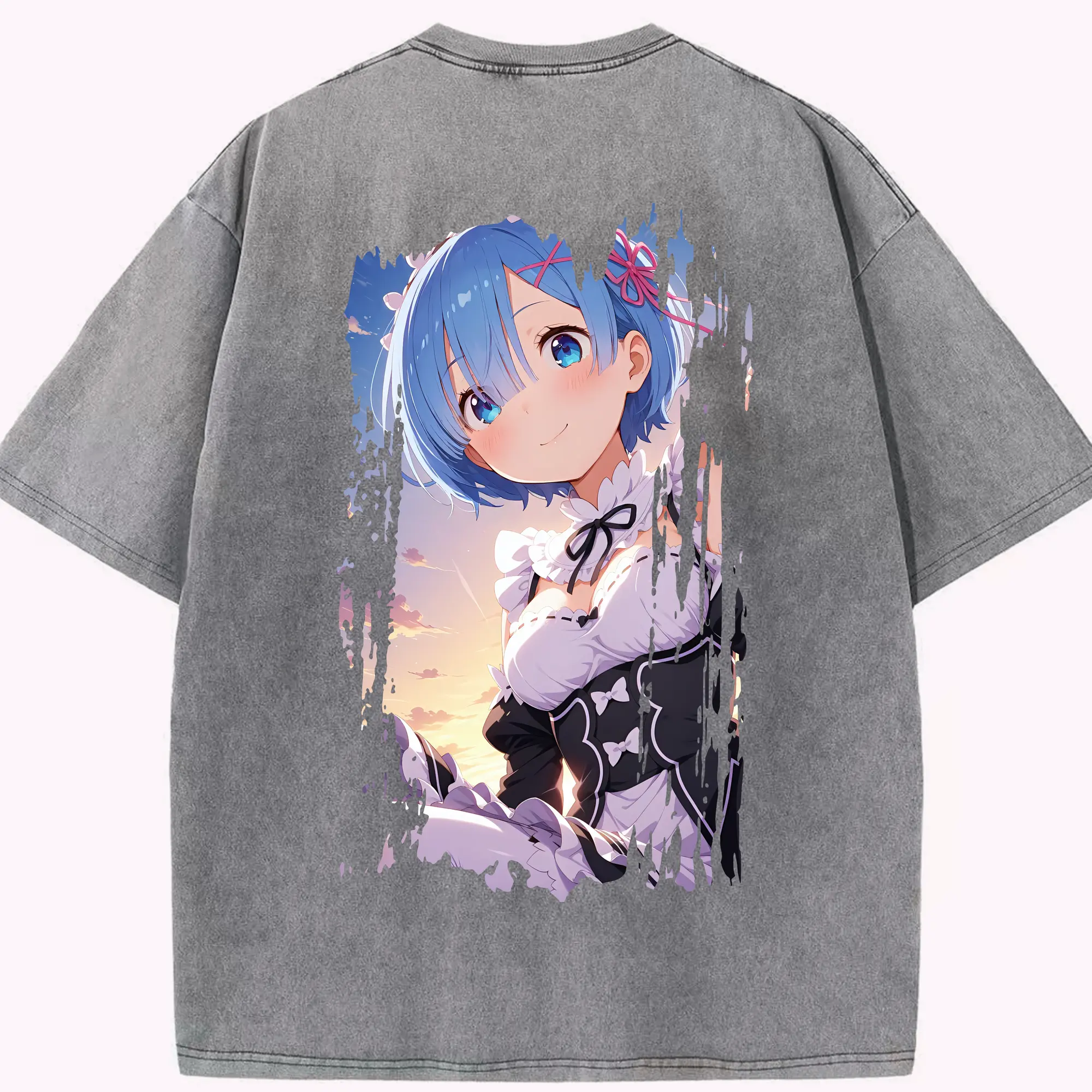 リゼロ グッズ レム - 綿100% ヴィンテージ風 半袖Tシャツ ・ フロントプリント ・ 柔らか肌触り ・ 通気性 快適 ・ スポーツ カジュアル 外出用