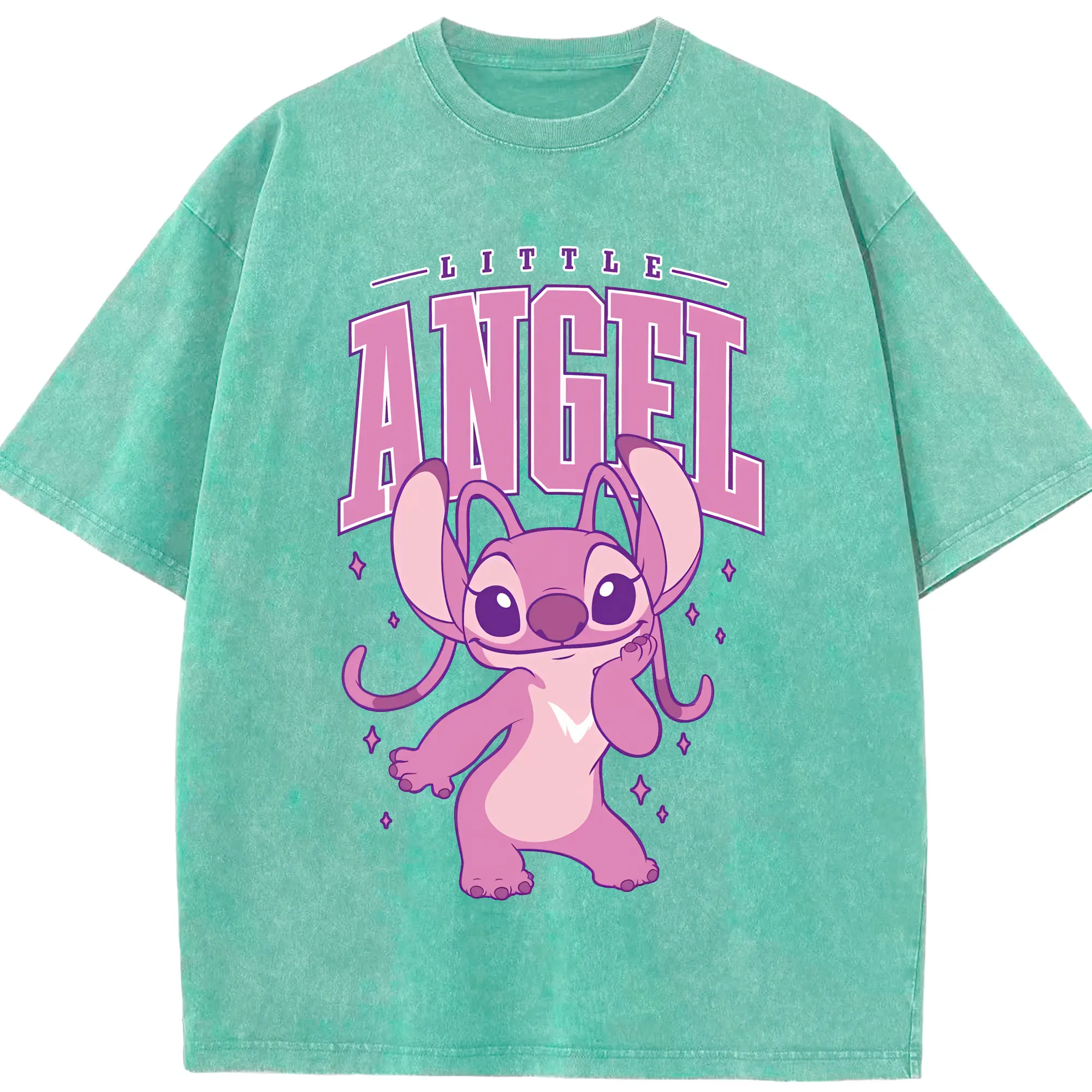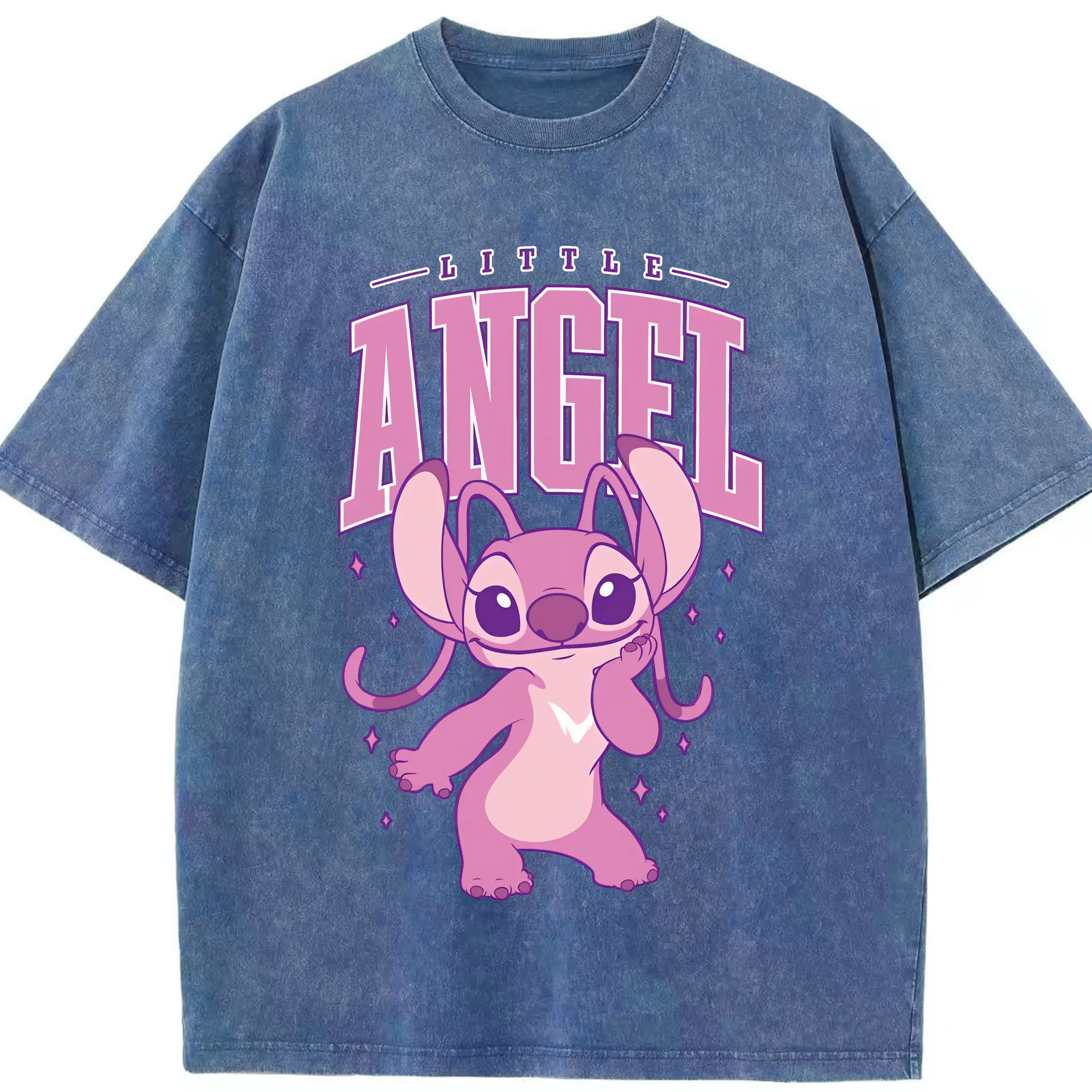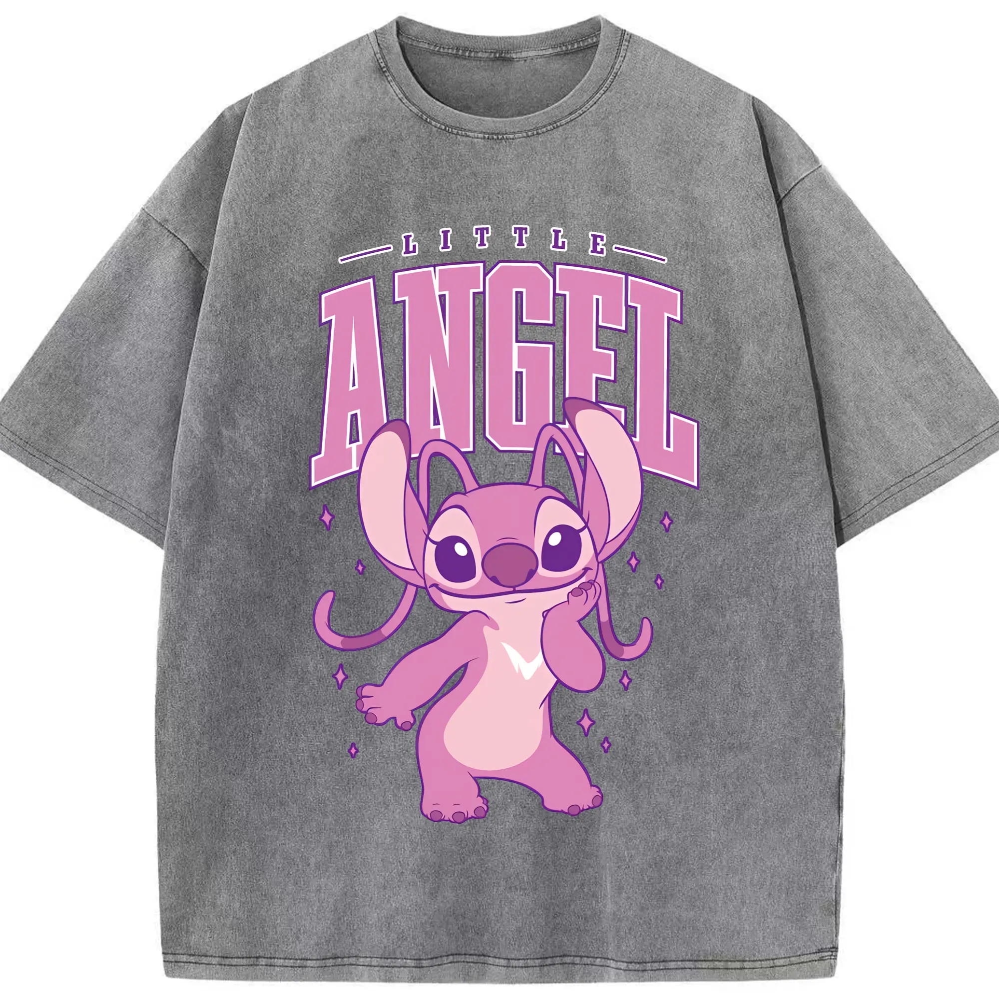 リロ&スティッチ グッズ エンジェル - 綿100% ヴィンテージ風 半袖Tシャツ ・ 背面プリント ・ 柔らか肌触り ・ 通気性 快適 ・ スポーツ カジュアル 外出用