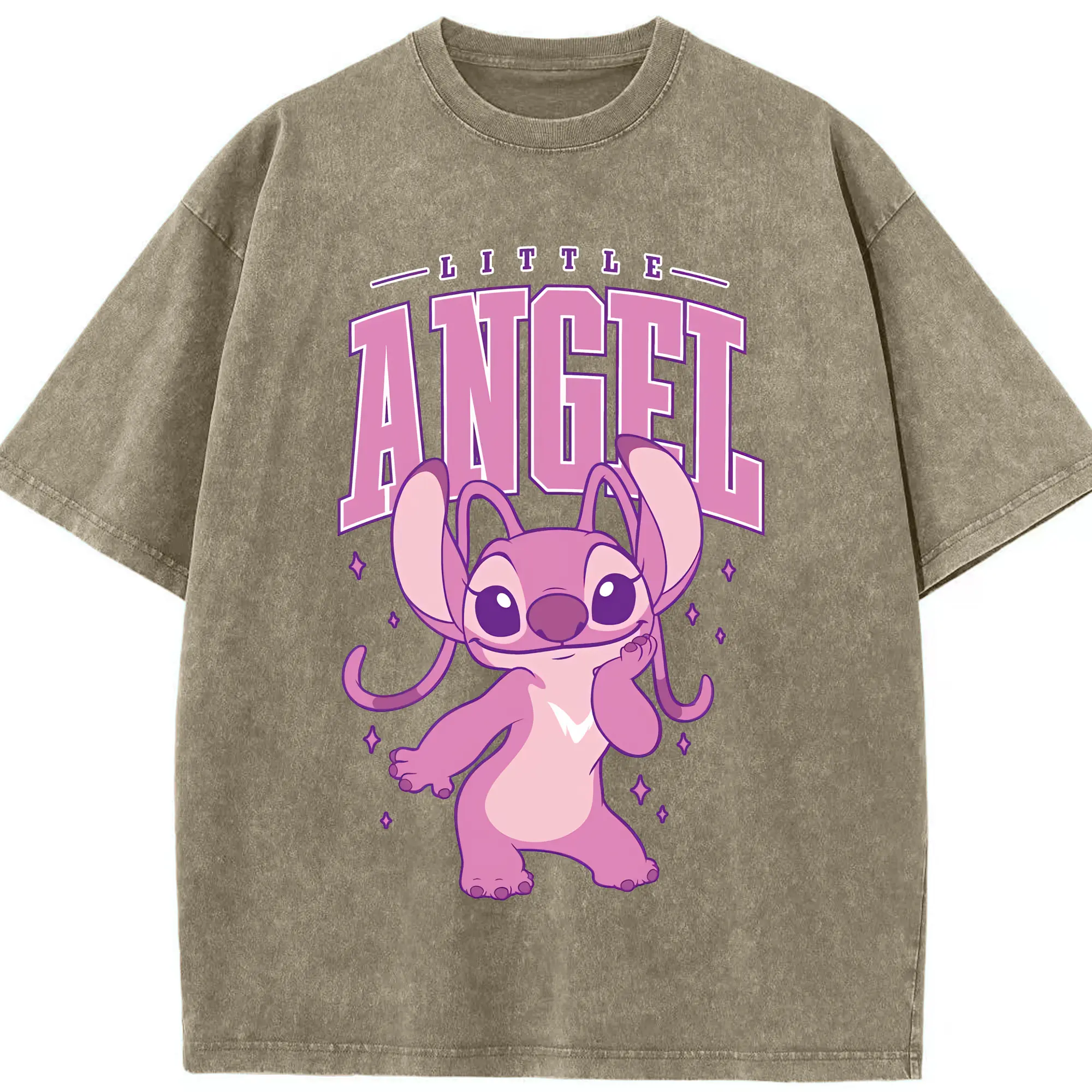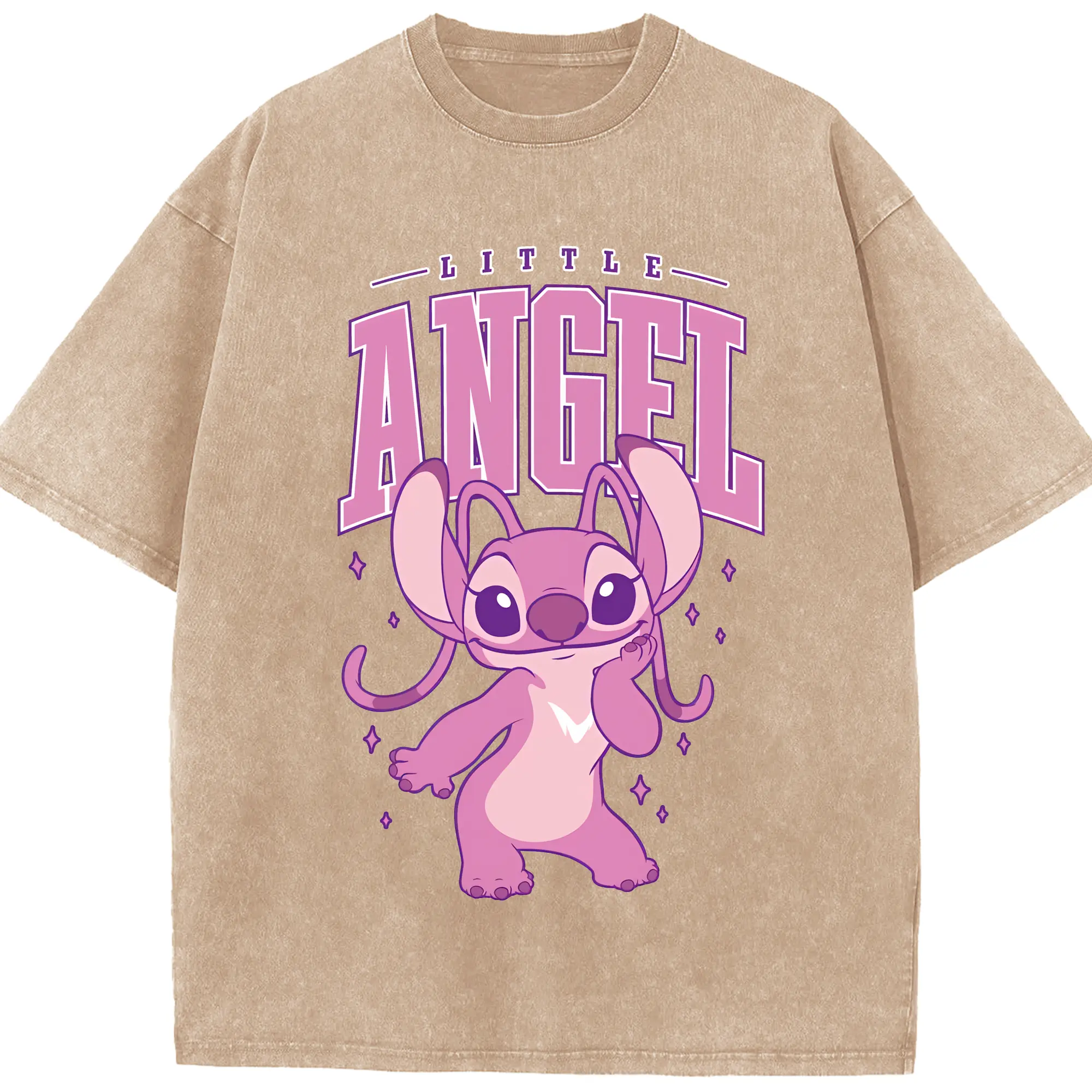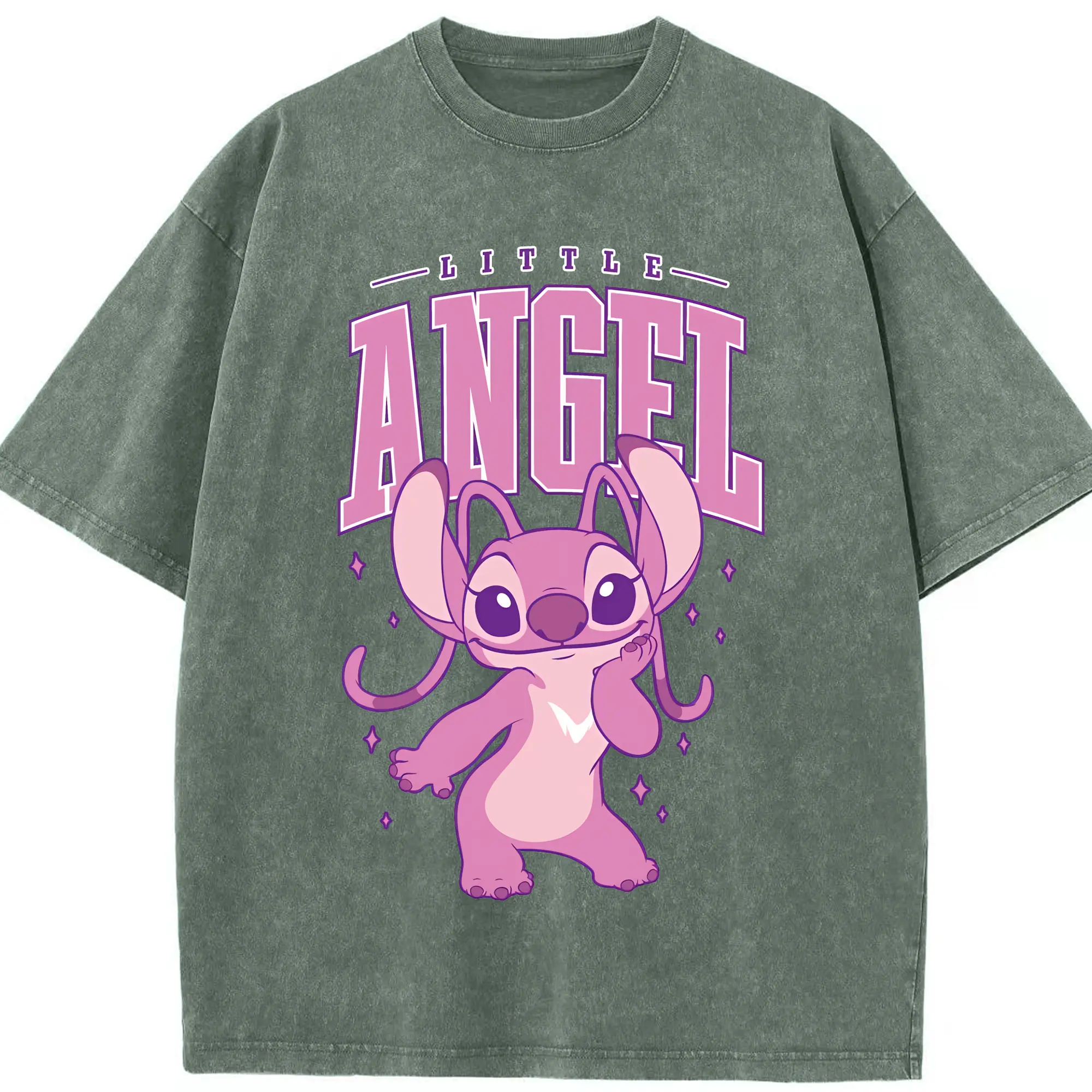 リロ&スティッチ グッズ エンジェル - 綿100% ヴィンテージ風 半袖Tシャツ ・ 背面プリント ・ 柔らか肌触り ・ 通気性 快適 ・ スポーツ カジュアル 外出用