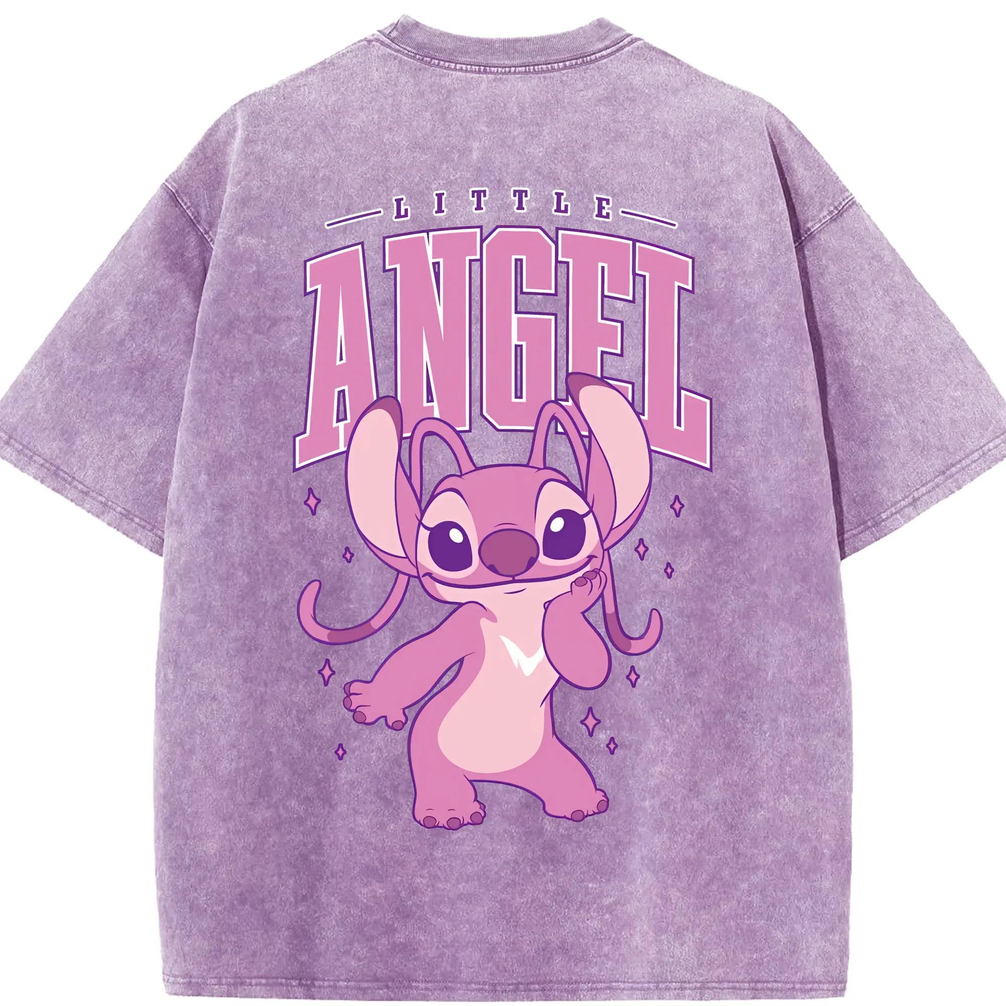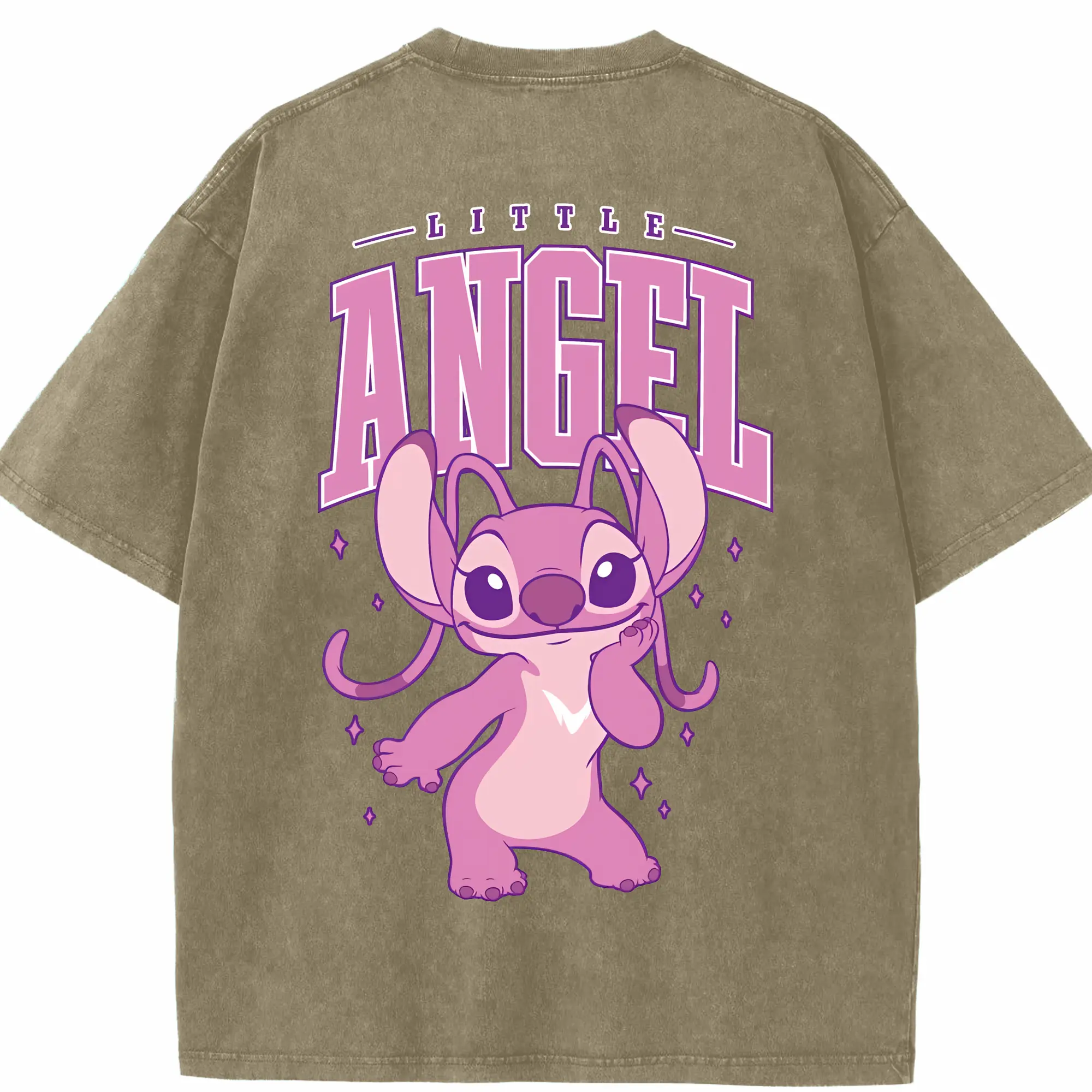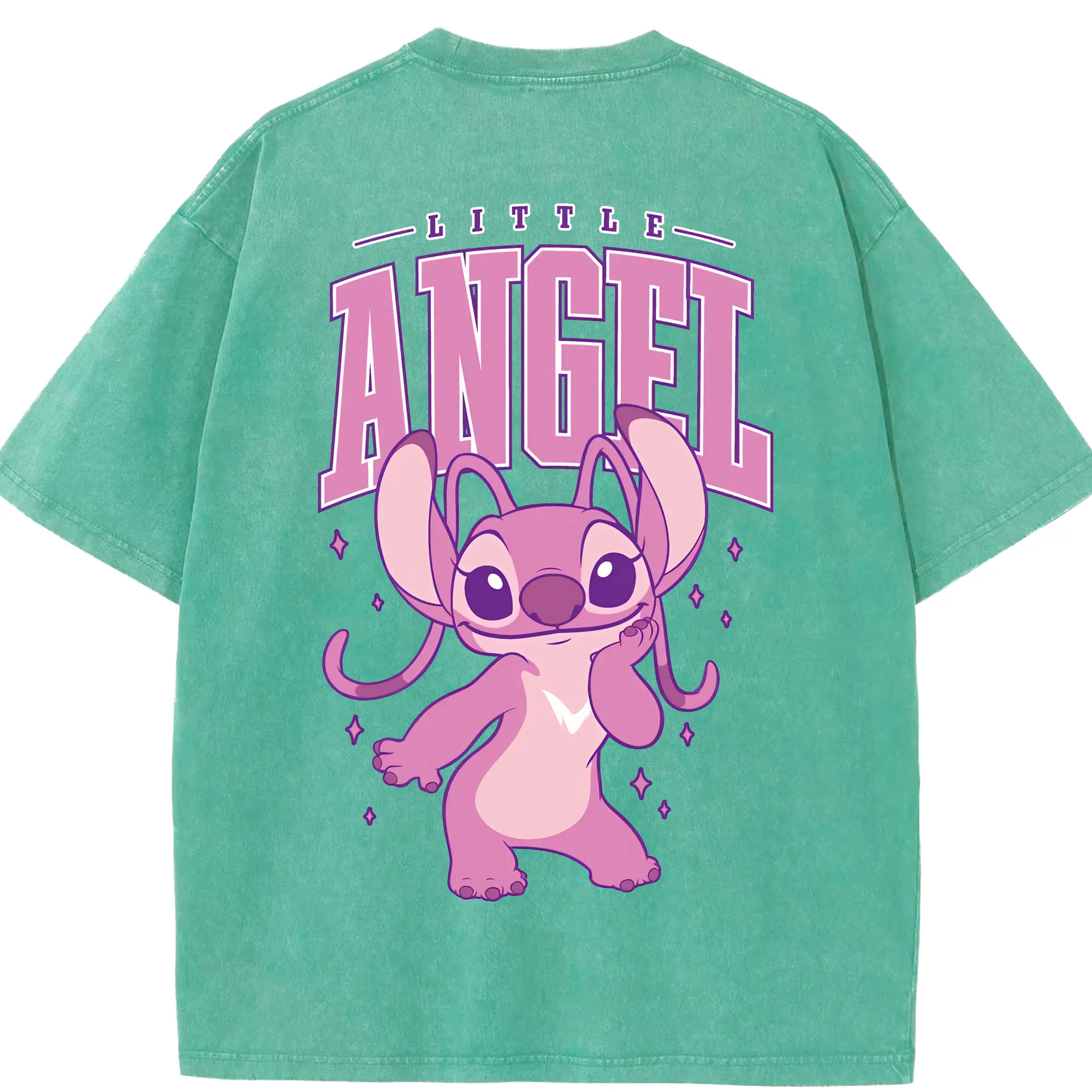 リロ&スティッチ グッズ エンジェル - 綿100% ヴィンテージ風 半袖Tシャツ ・ フロントプリント ・ 柔らか肌触り ・ 通気性 快適 ・ スポーツ カジュアル 外出用
