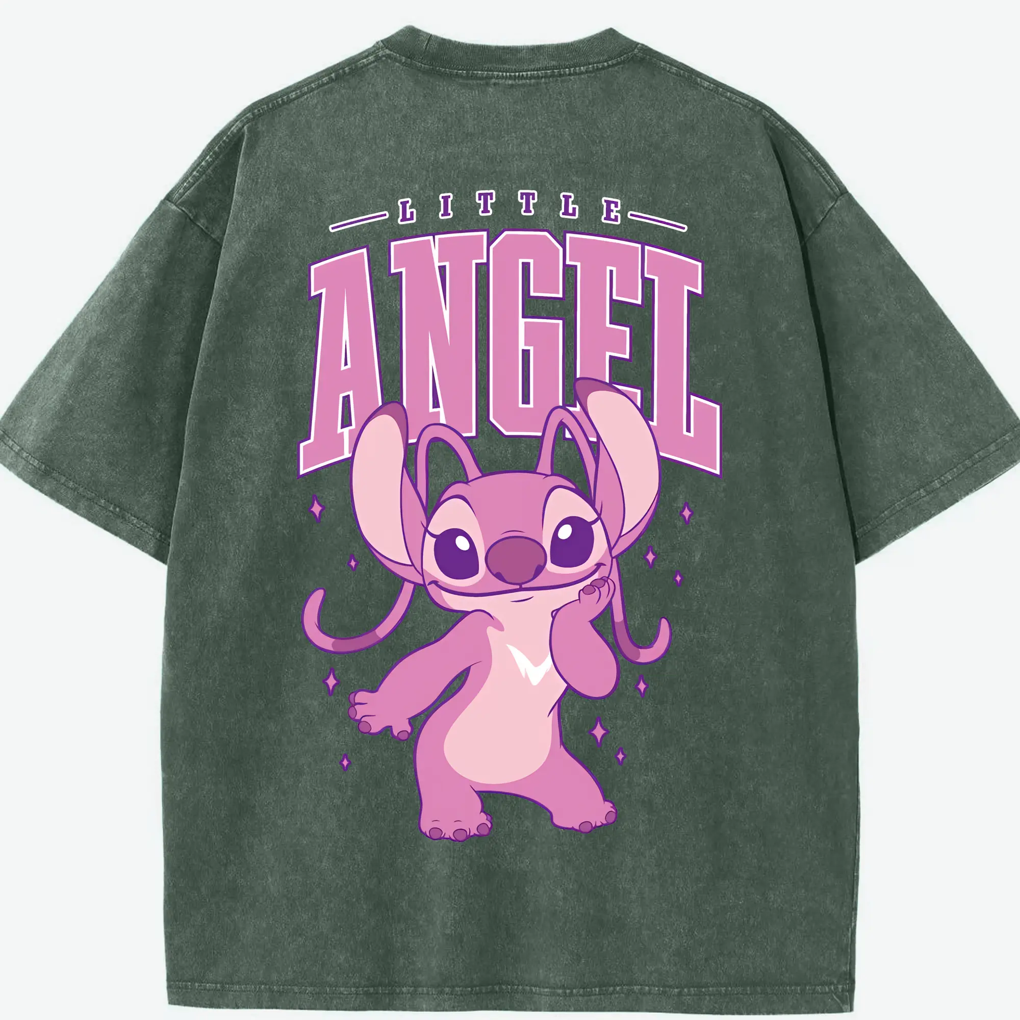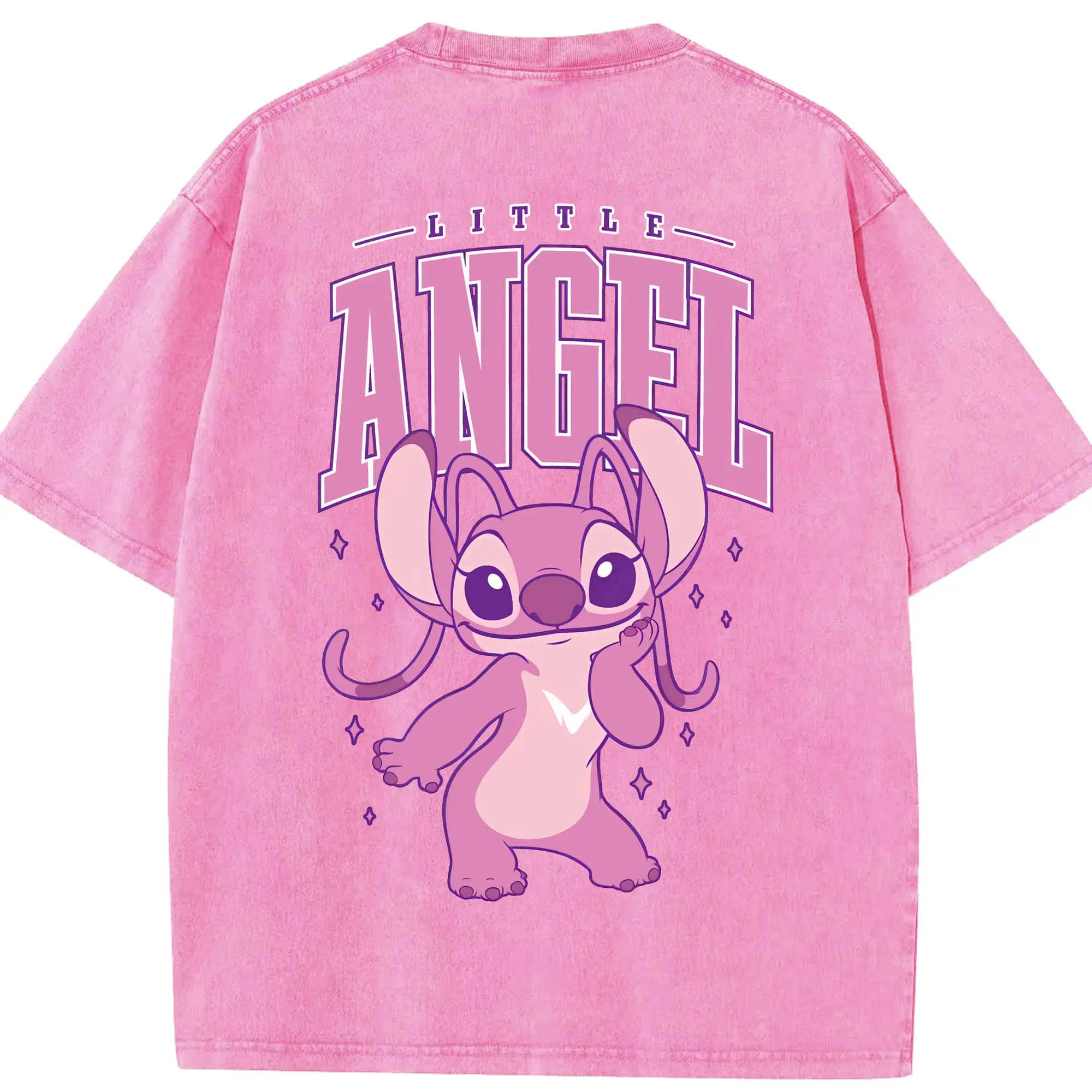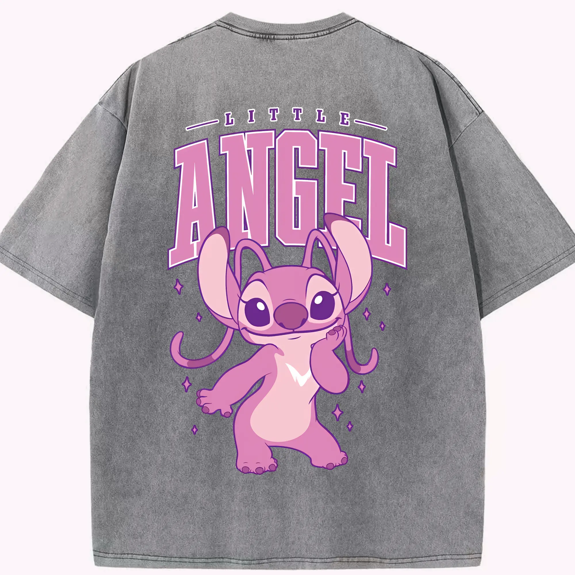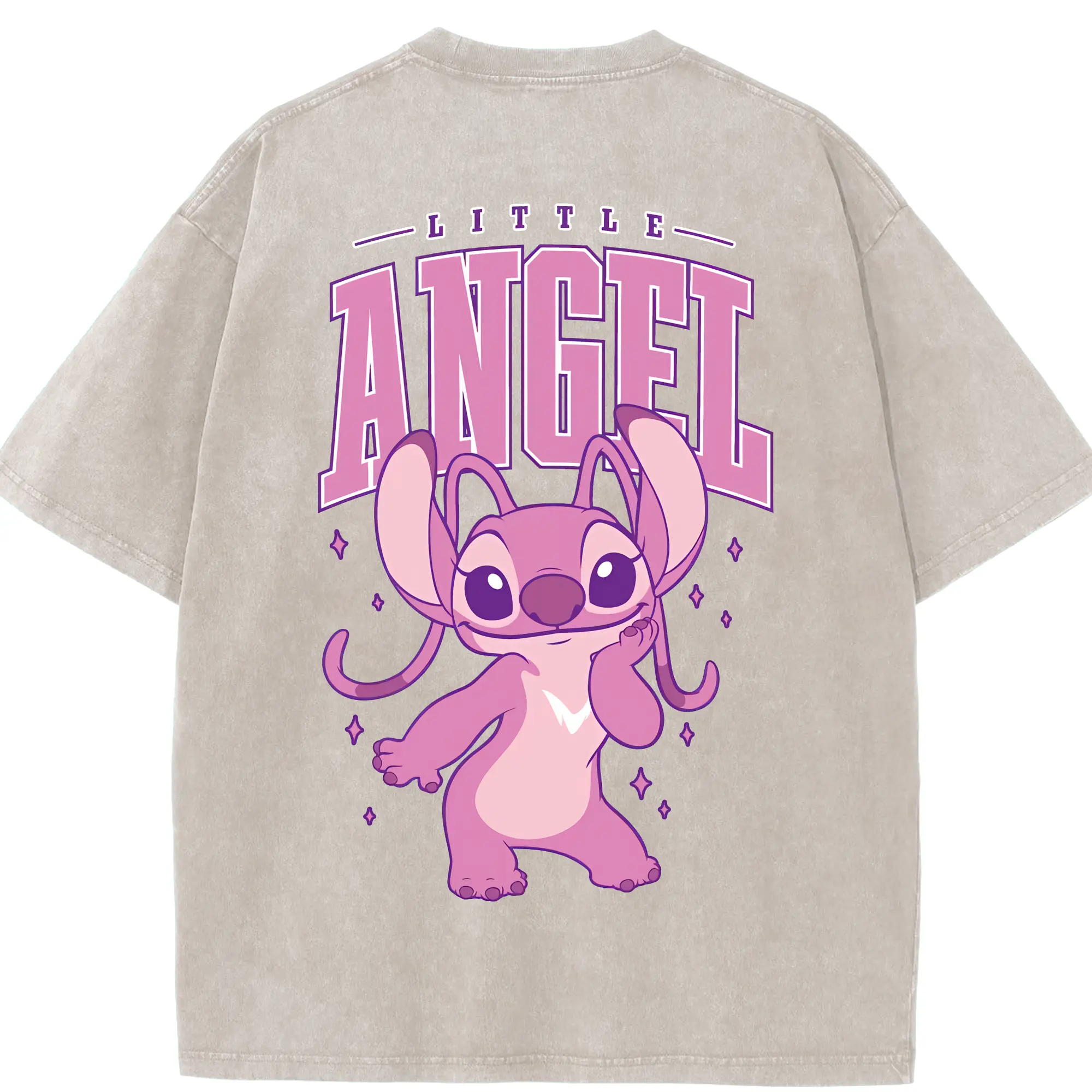 リロ&スティッチ グッズ エンジェル - 綿100% ヴィンテージ風 半袖Tシャツ ・ フロントプリント ・ 柔らか肌触り ・ 通気性 快適 ・ スポーツ カジュアル 外出用
