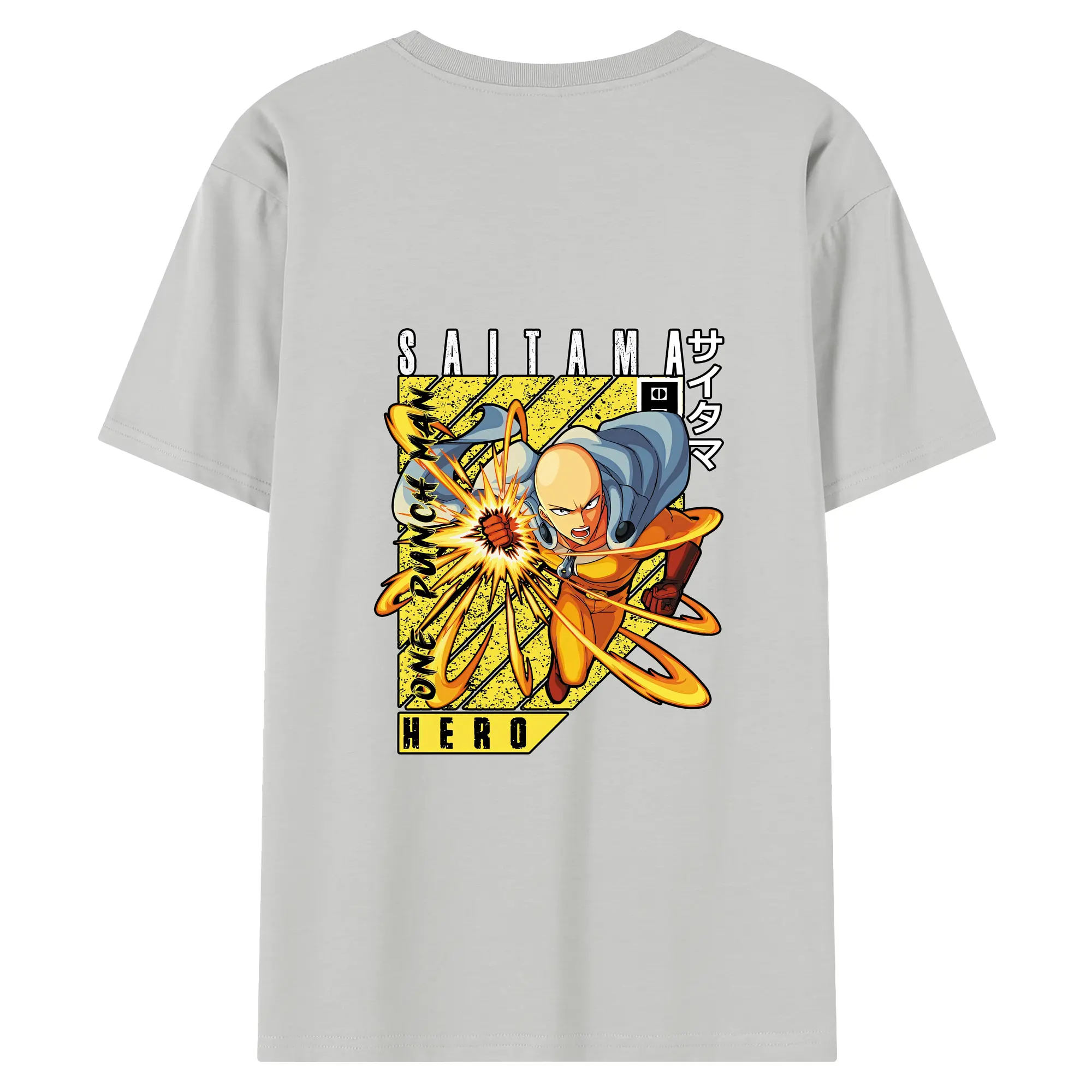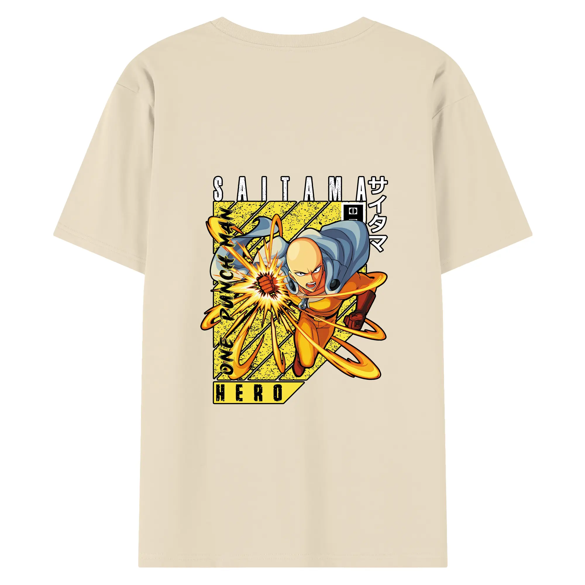 ワンパンマン グッズ サイタマ - 綿100% ヴィンテージ風 半袖Tシャツ ・ 背面プリント ・ 柔らか肌触り ・ 通気性 快適 ・ スポーツ カジュアル 外出用