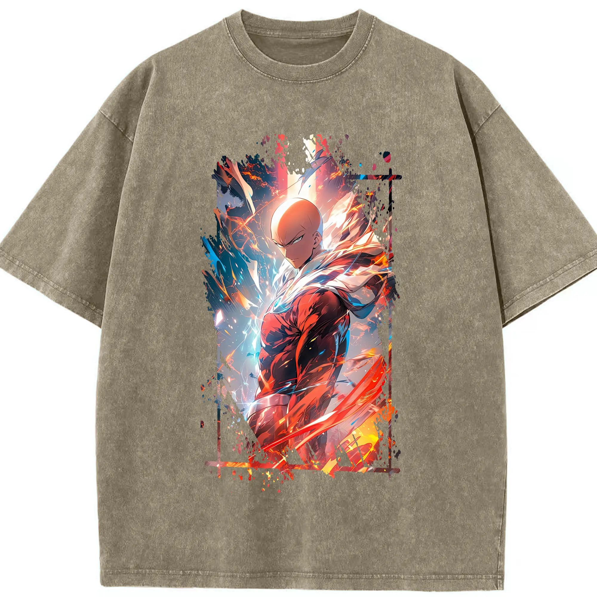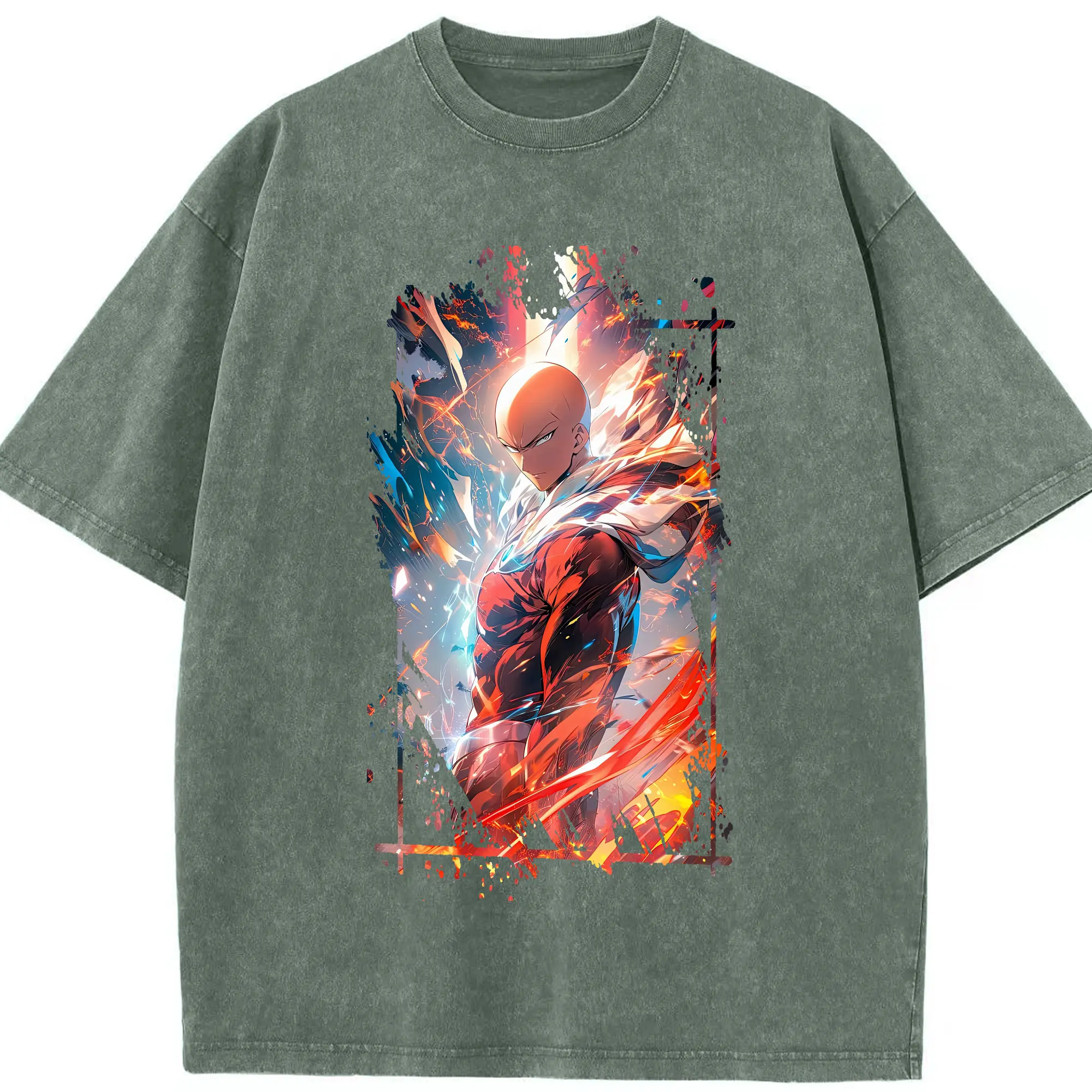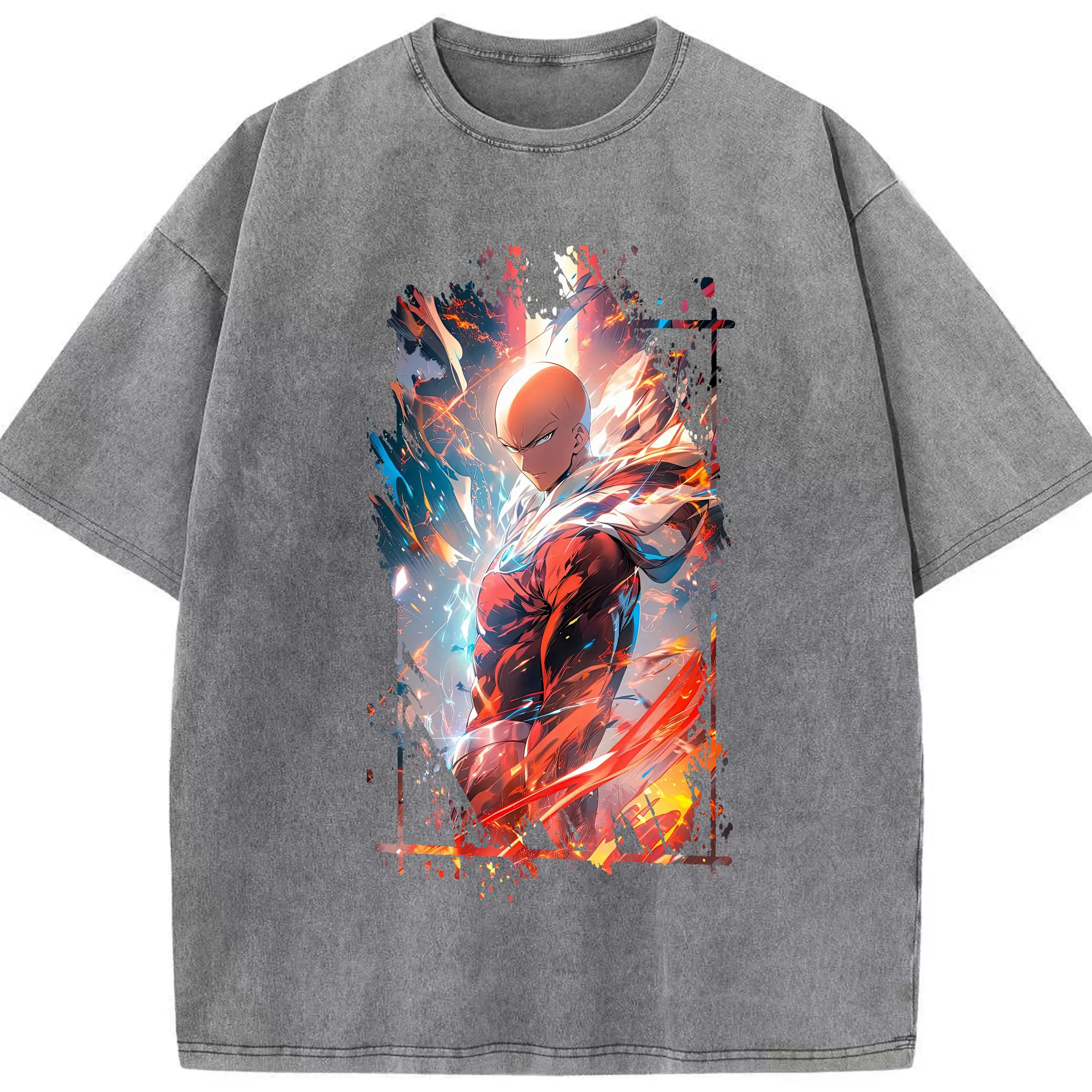 ワンパンマン グッズ サイタマ - 綿100% ヴィンテージ風 半袖Tシャツ ・ 背面プリント ・ 柔らか肌触り ・ 通気性 快適 ・ スポーツ カジュアル 外出用
