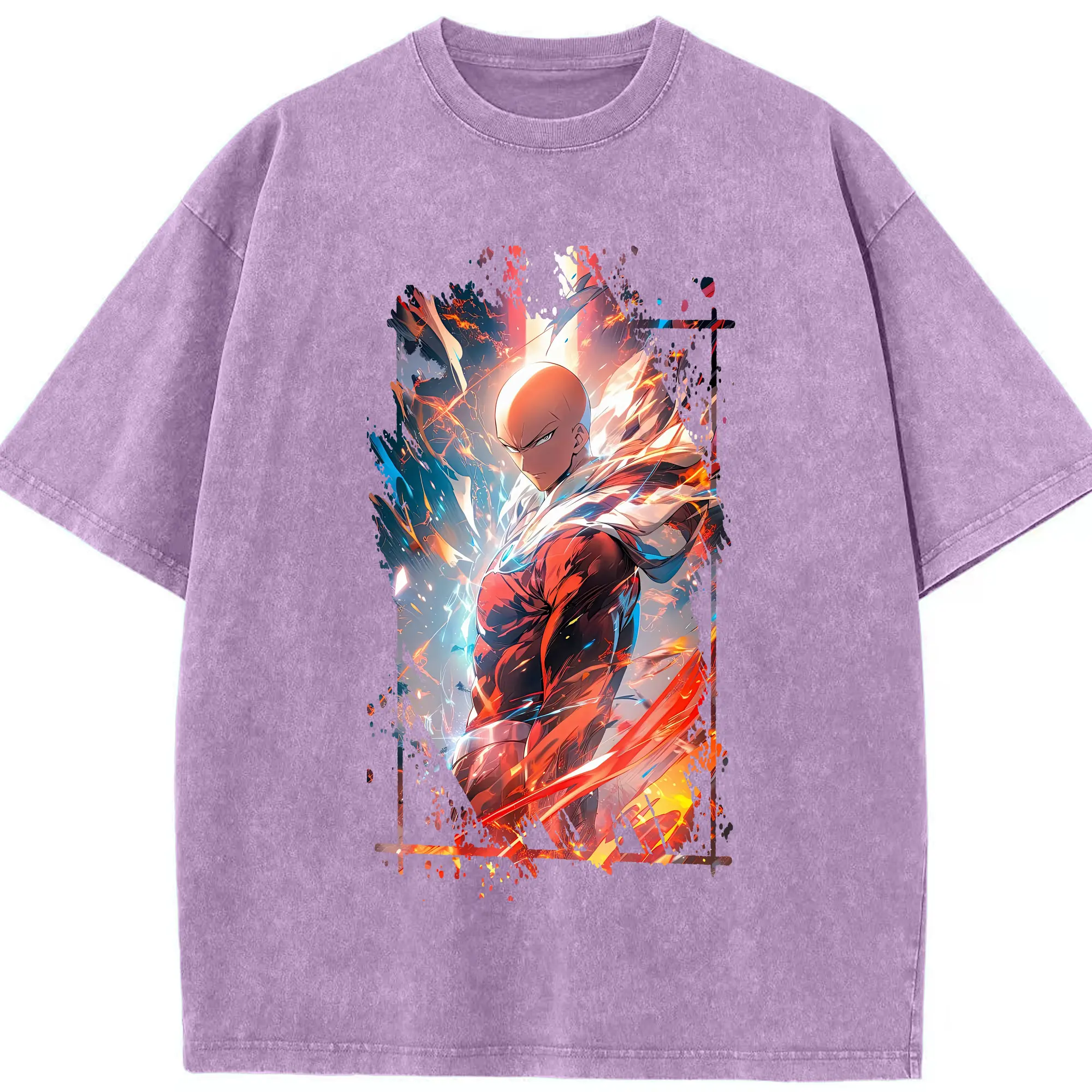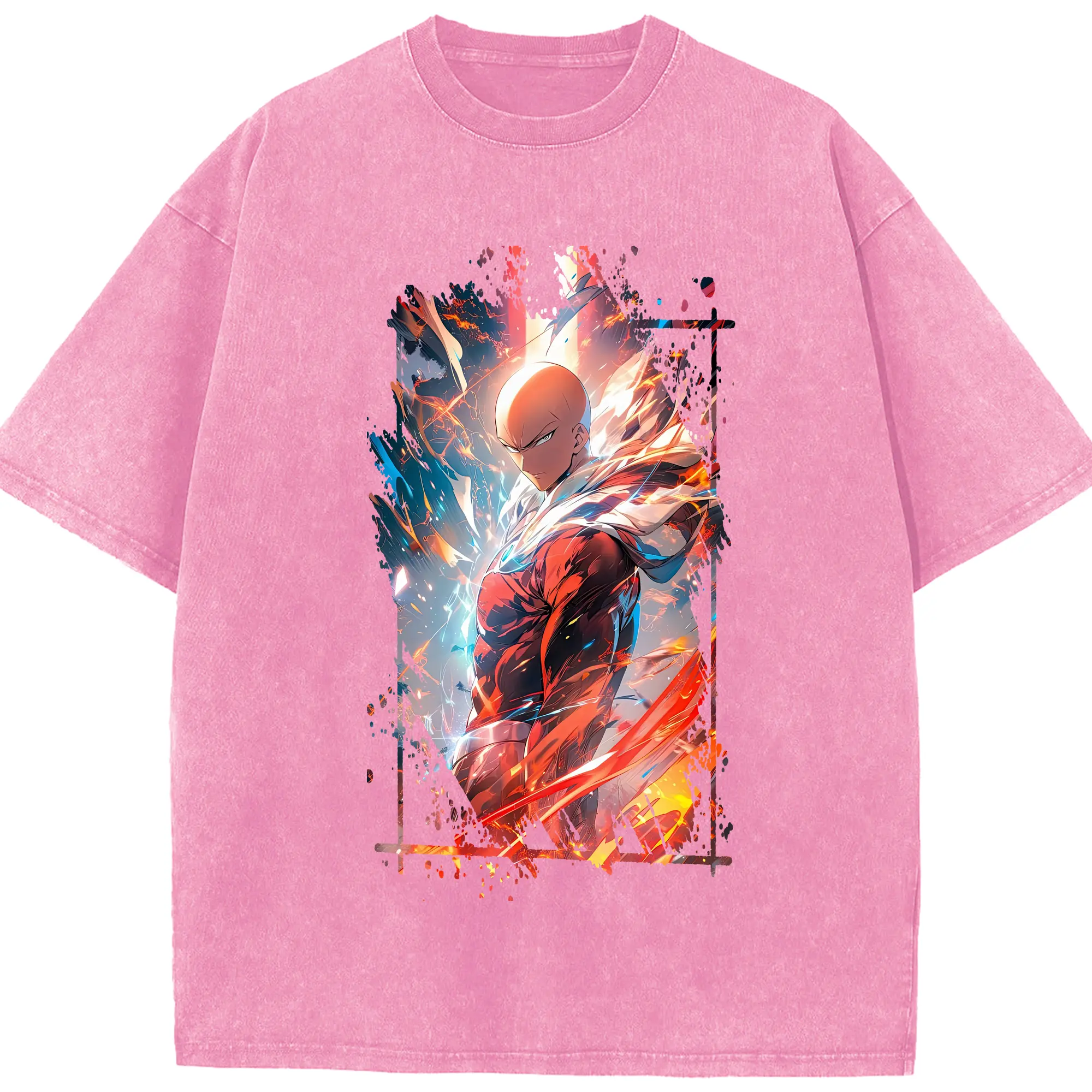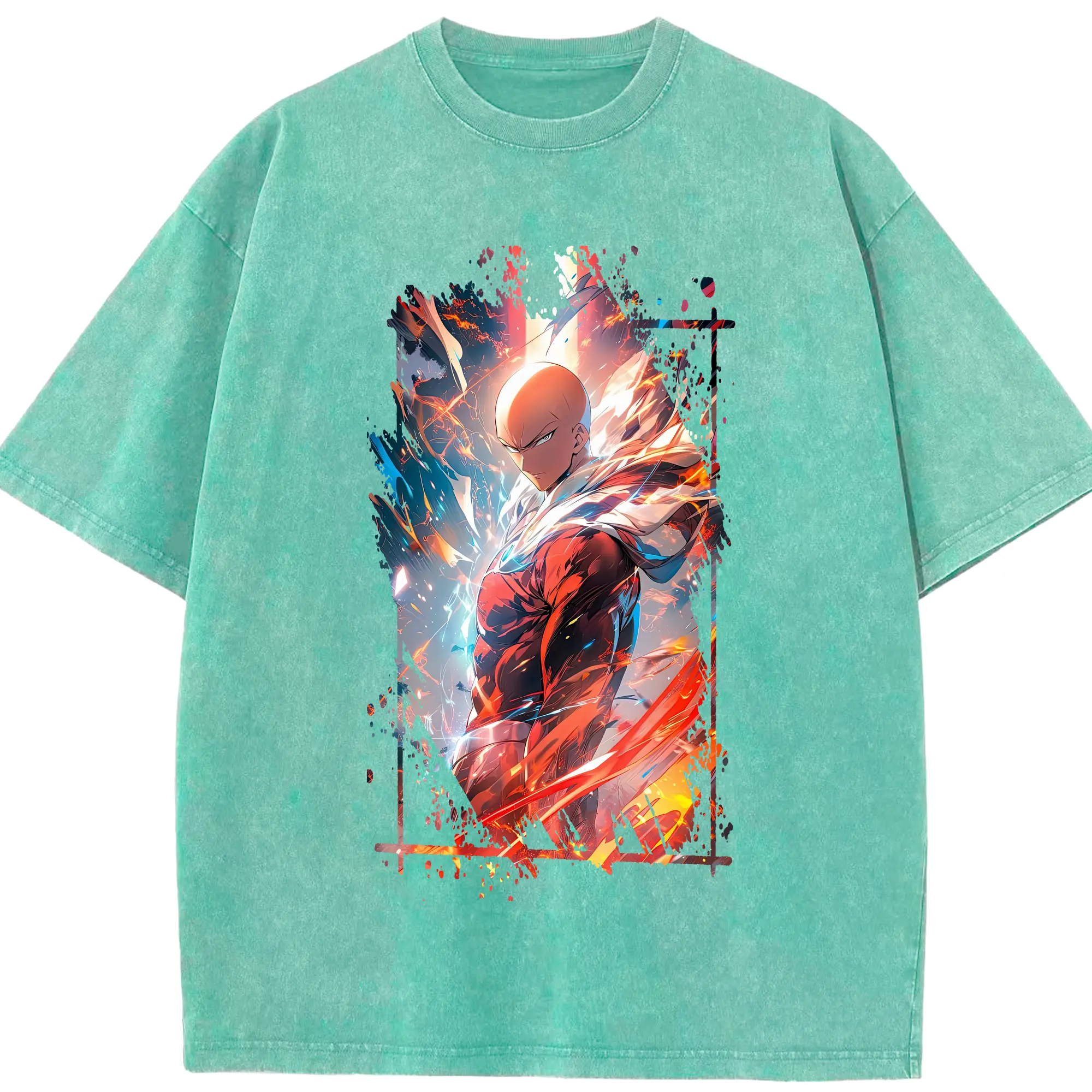 ワンパンマン グッズ サイタマ - 綿100% ヴィンテージ風 半袖Tシャツ ・ 背面プリント ・ 柔らか肌触り ・ 通気性 快適 ・ スポーツ カジュアル 外出用