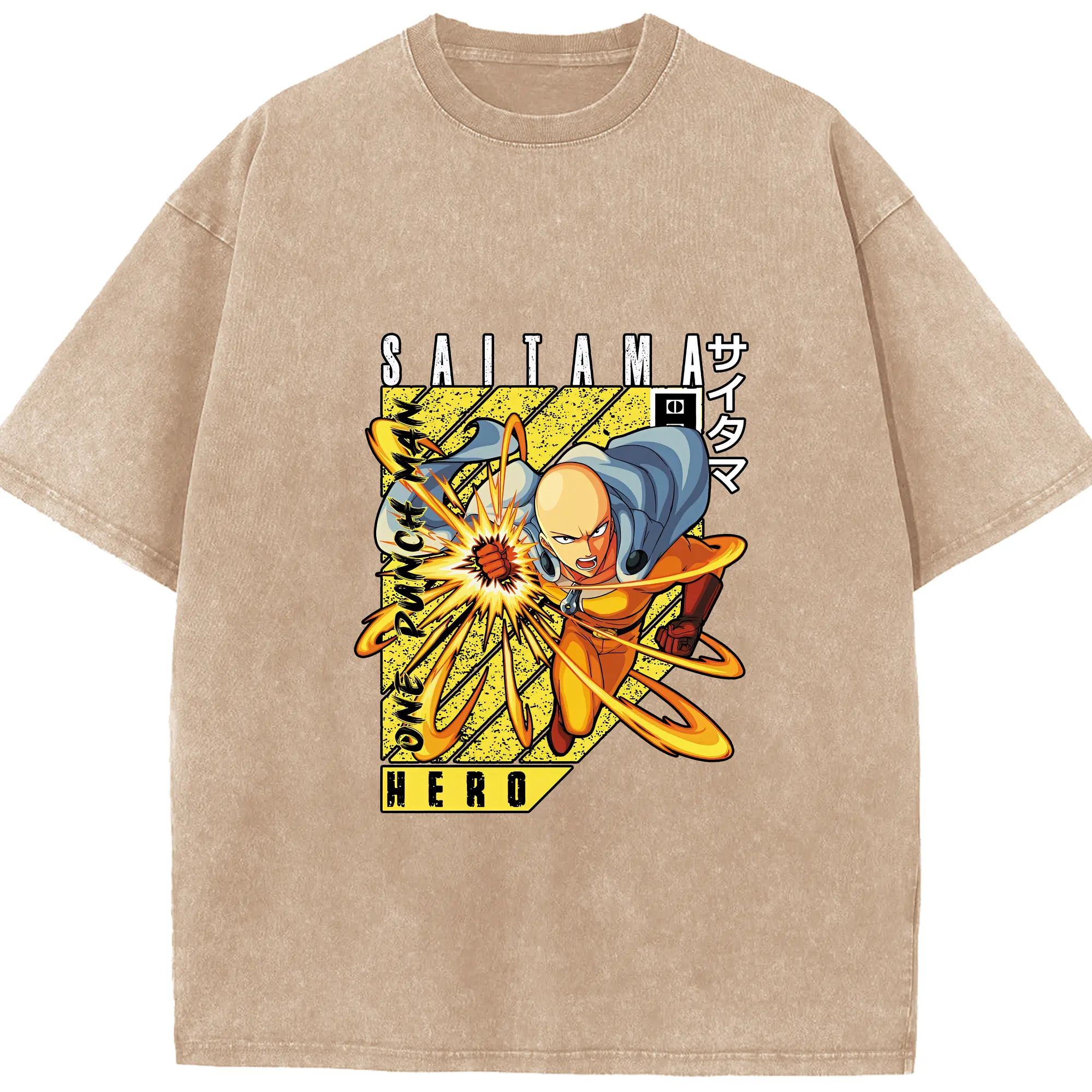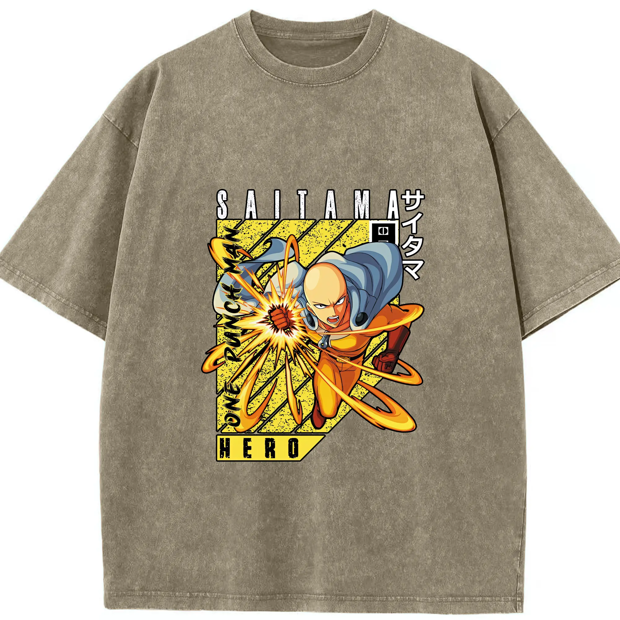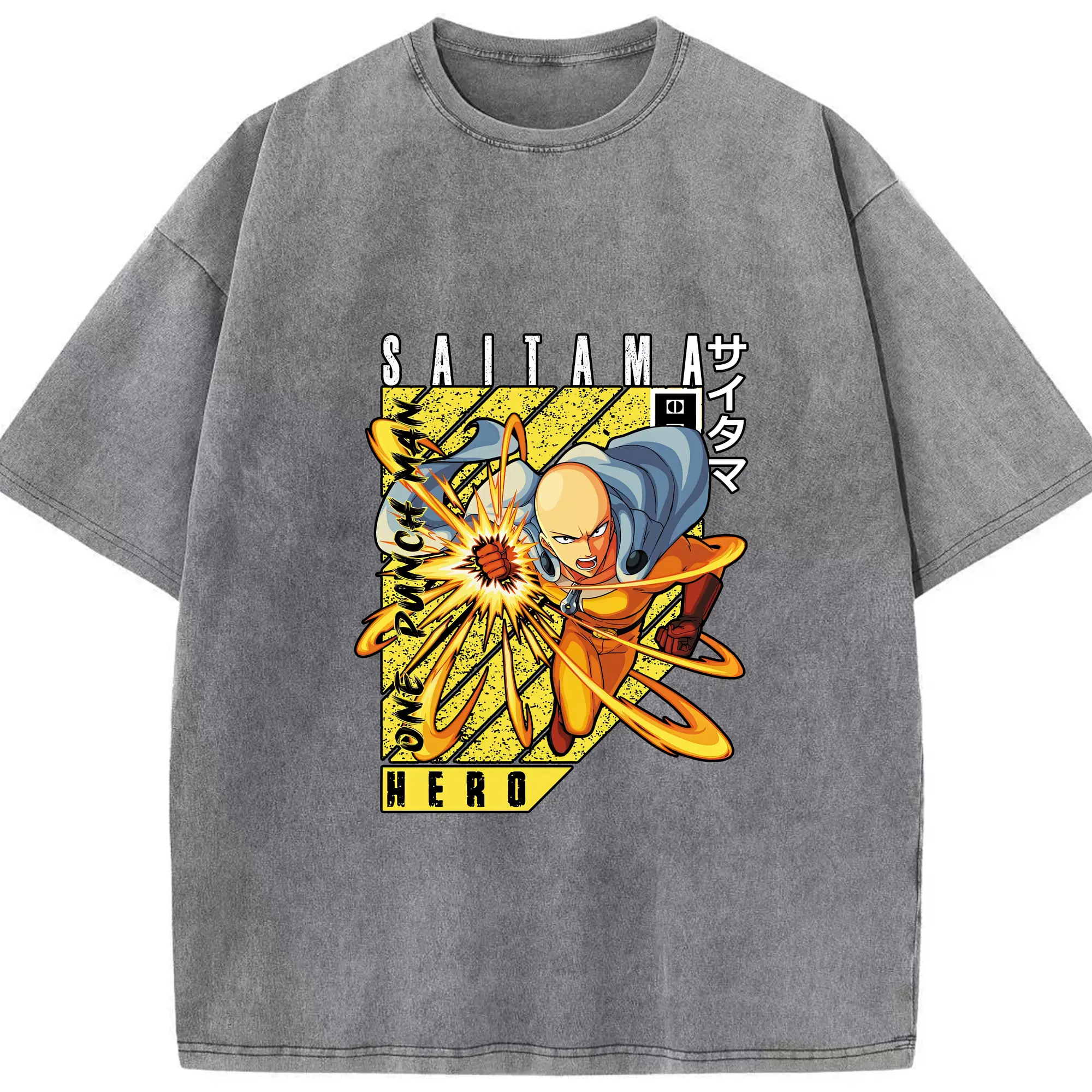 ワンパンマン グッズ サイタマ - 綿100% ヴィンテージ風 半袖Tシャツ ・ 背面プリント ・ 柔らか肌触り ・ 通気性 快適 ・ スポーツ カジュアル 外出用