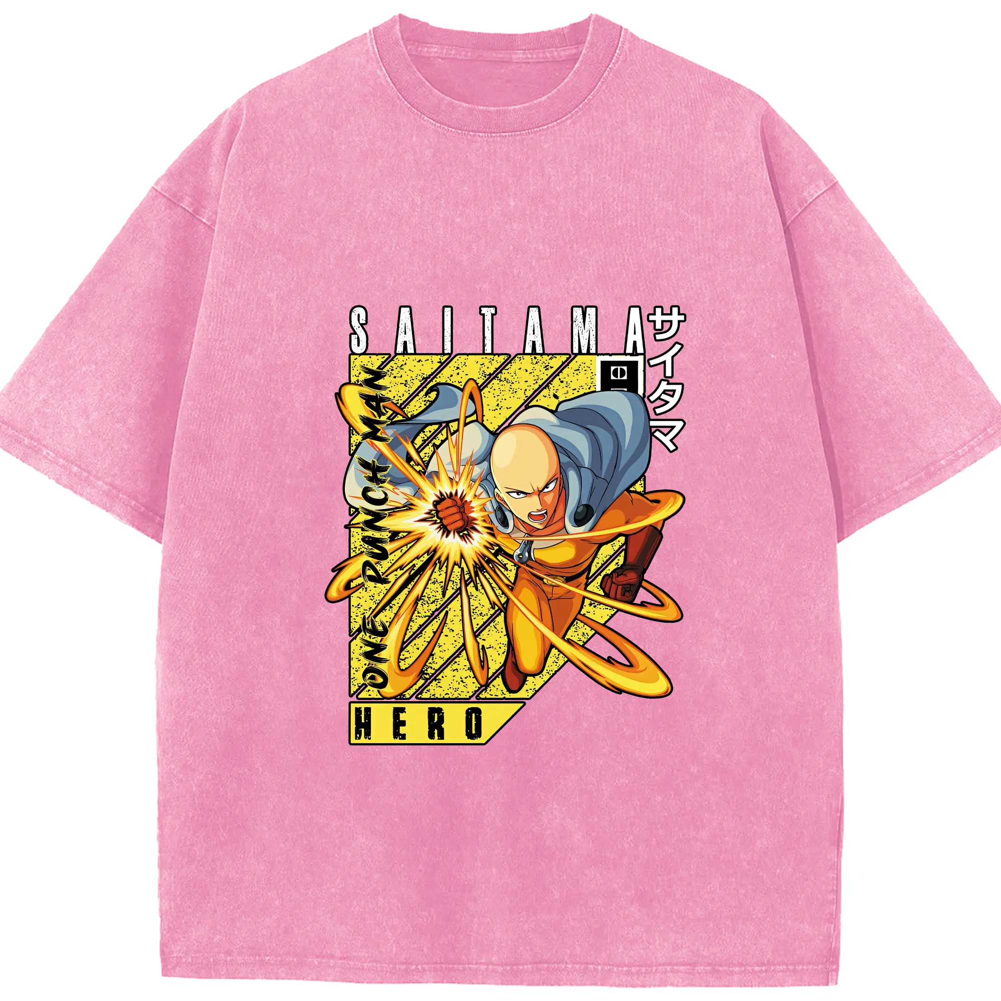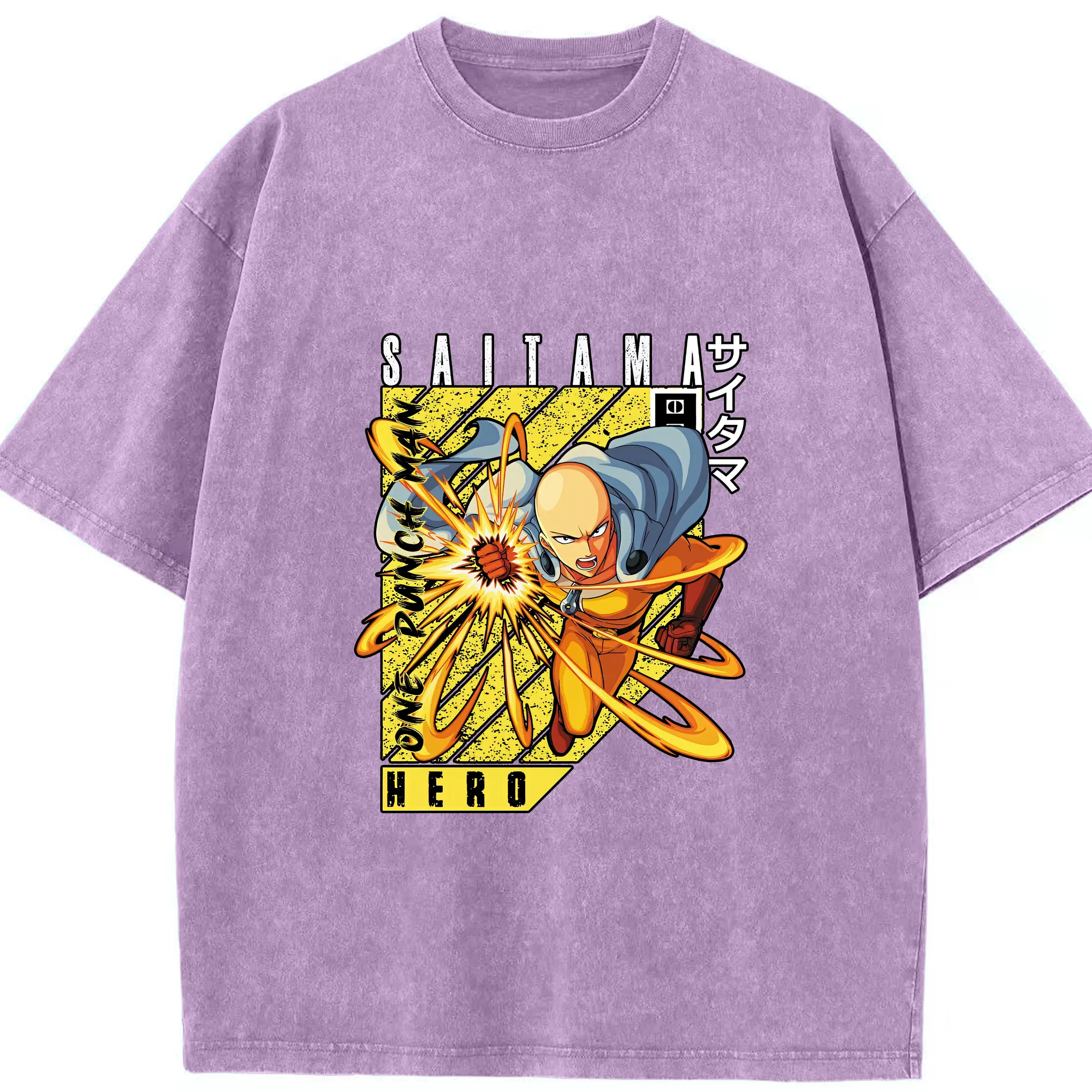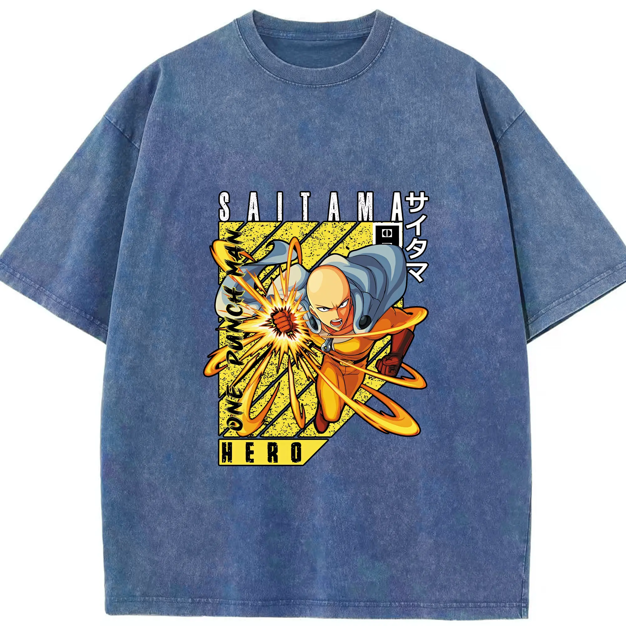 ワンパンマン グッズ サイタマ - 綿100% ヴィンテージ風 半袖Tシャツ ・ 背面プリント ・ 柔らか肌触り ・ 通気性 快適 ・ スポーツ カジュアル 外出用