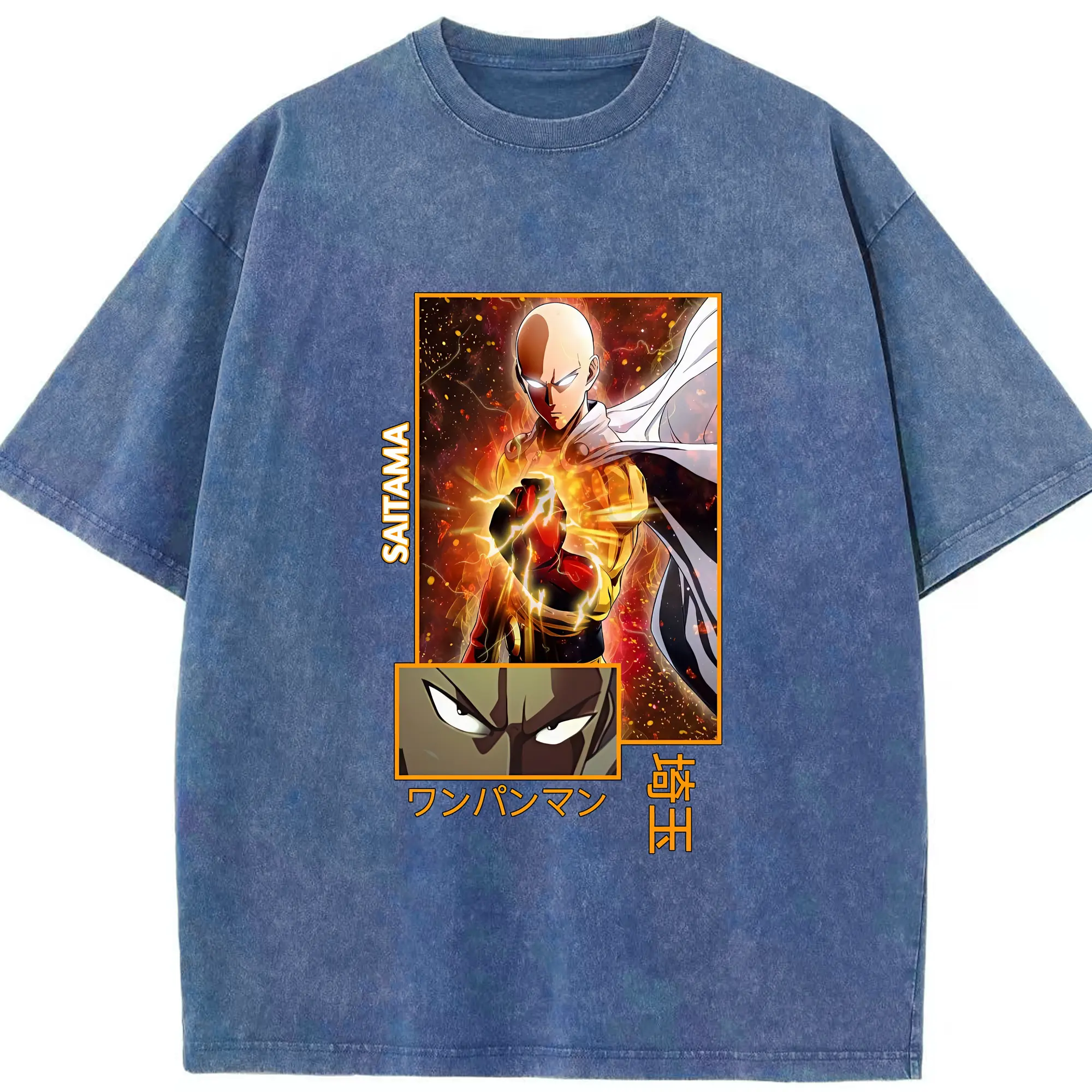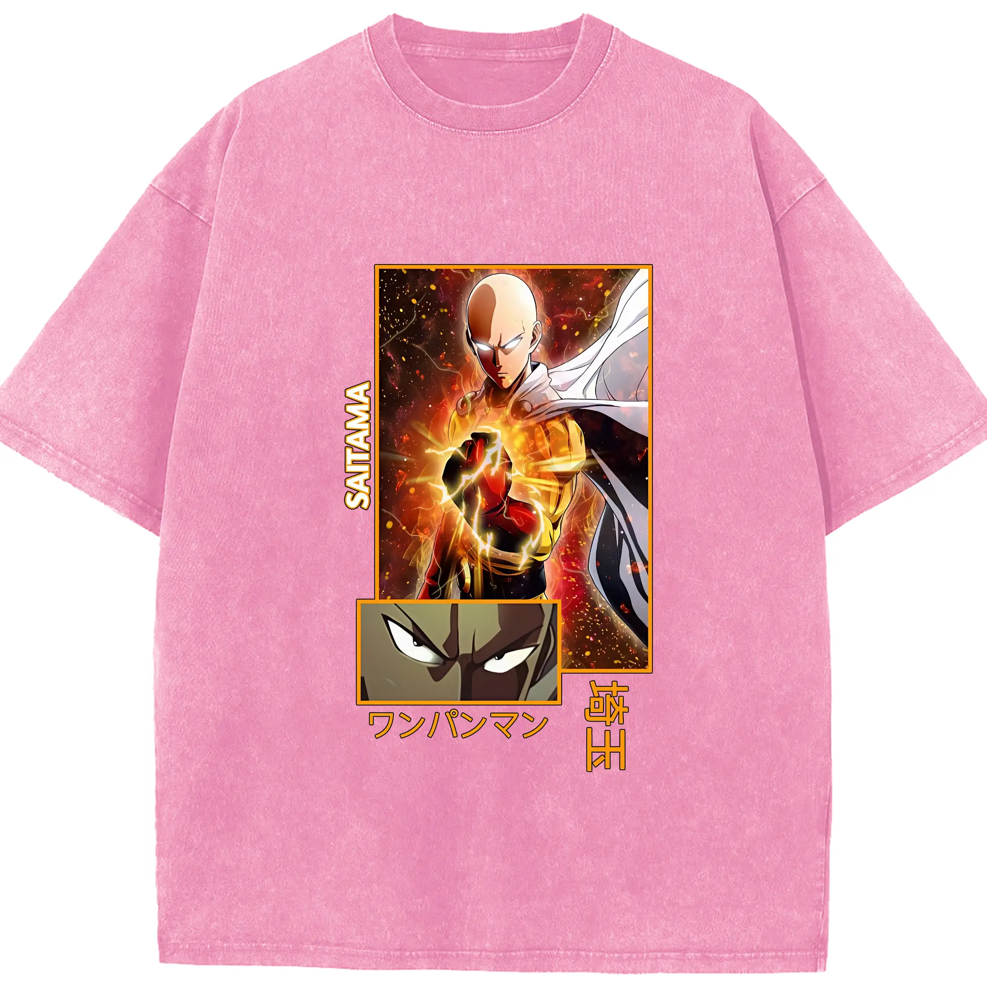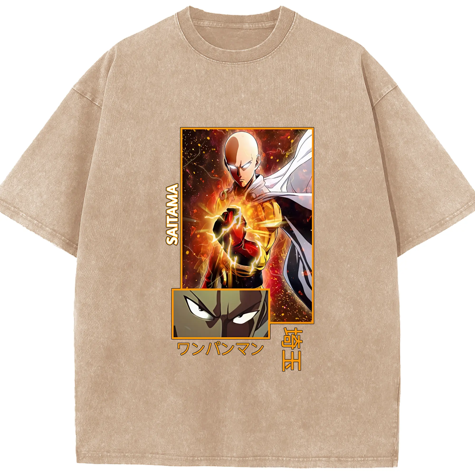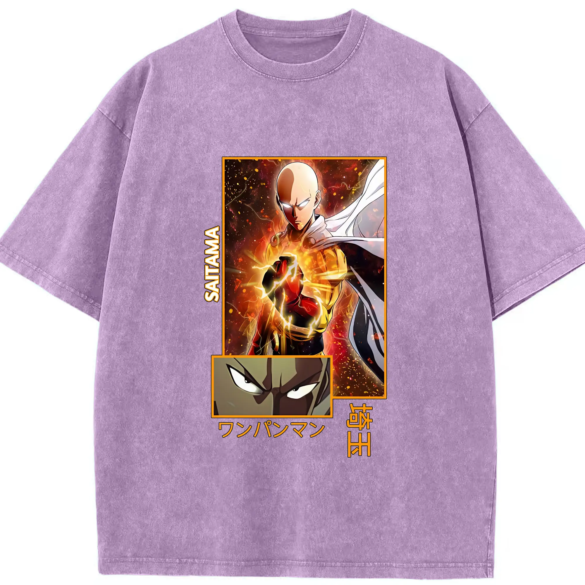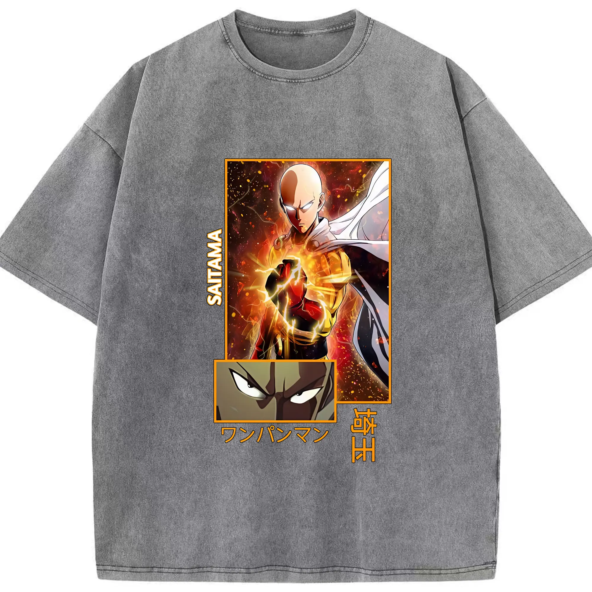 ワンパンマン グッズ サイタマ - 綿100% ヴィンテージ風 半袖Tシャツ ・ 背面プリント ・ 柔らか肌触り ・ 通気性 快適 ・ スポーツ カジュアル 外出用