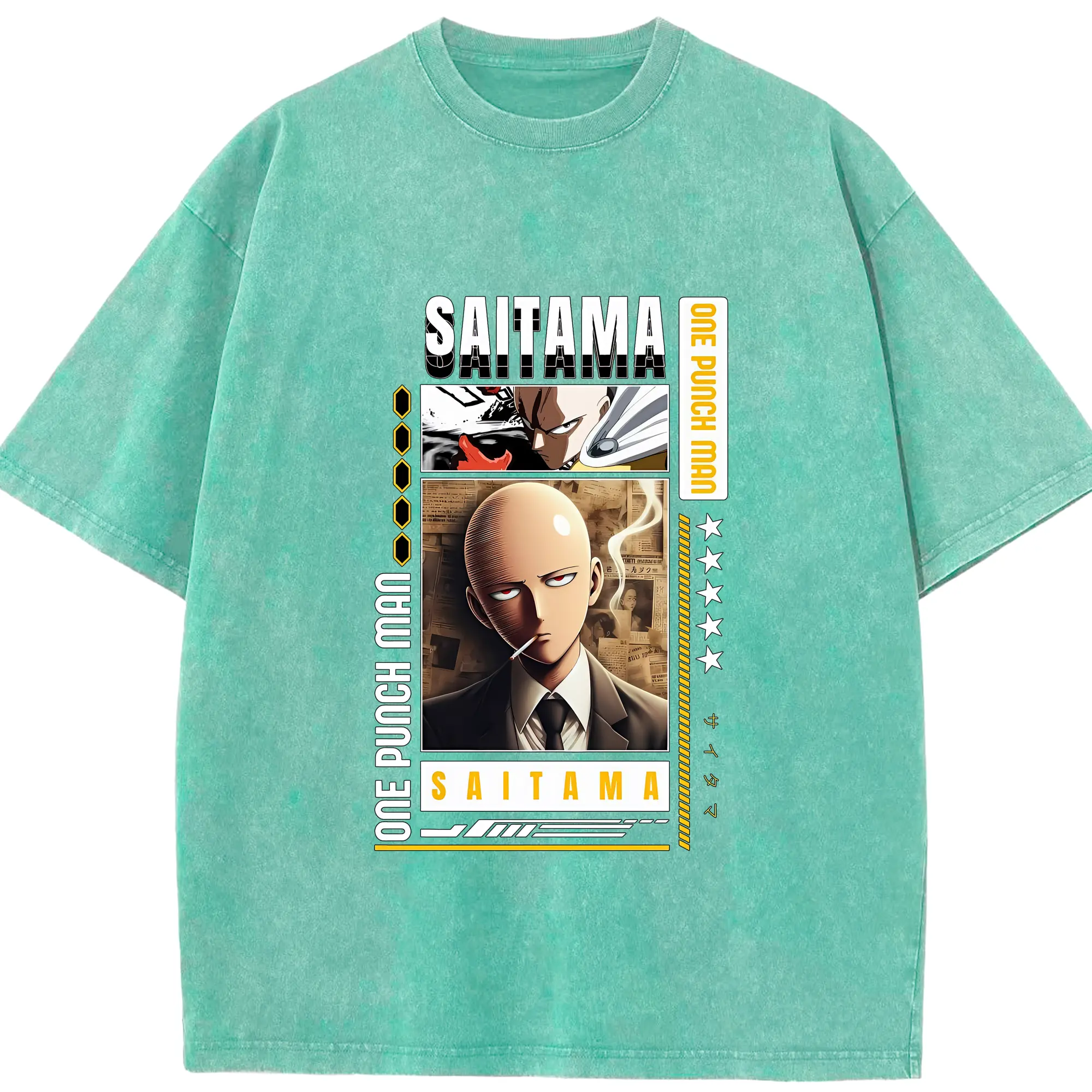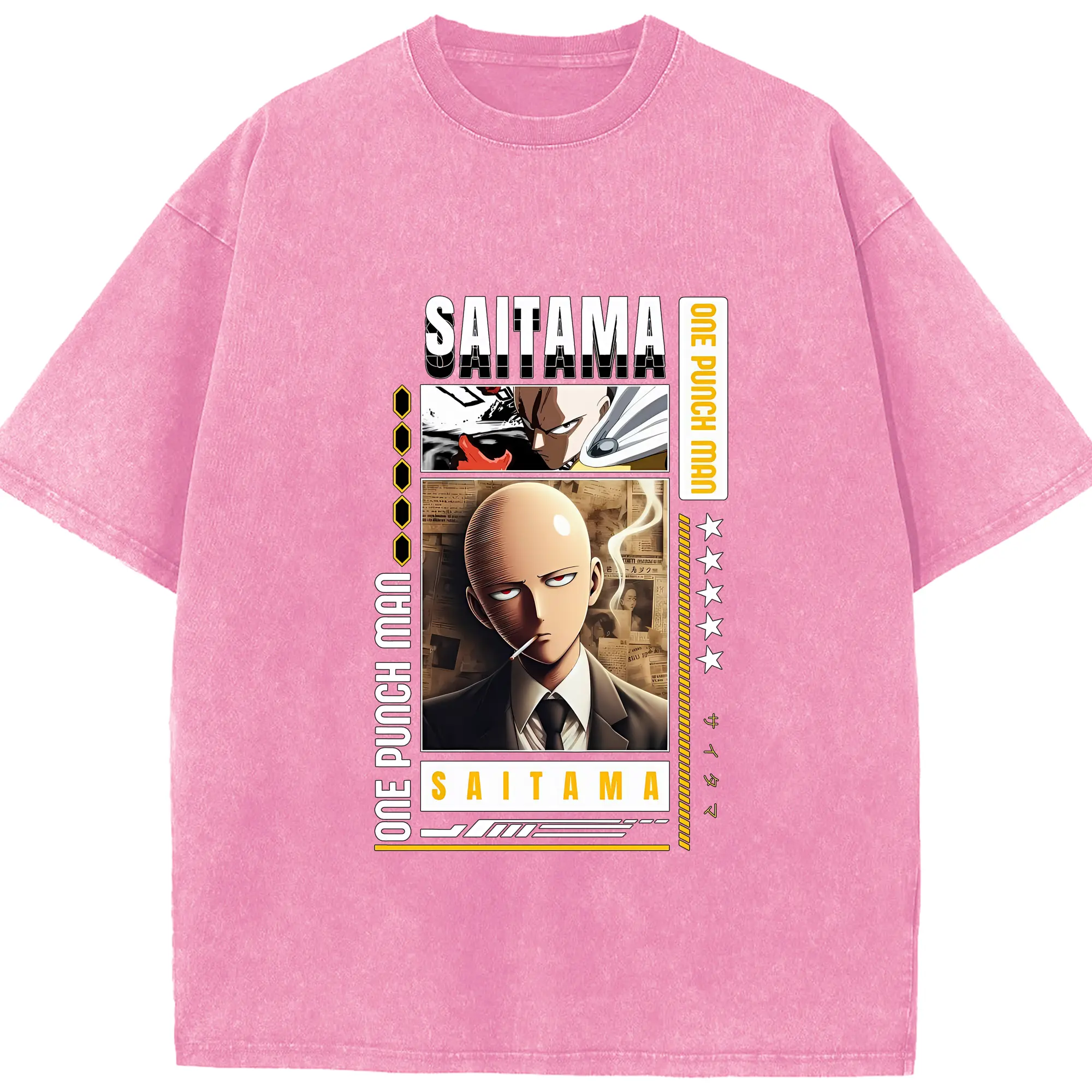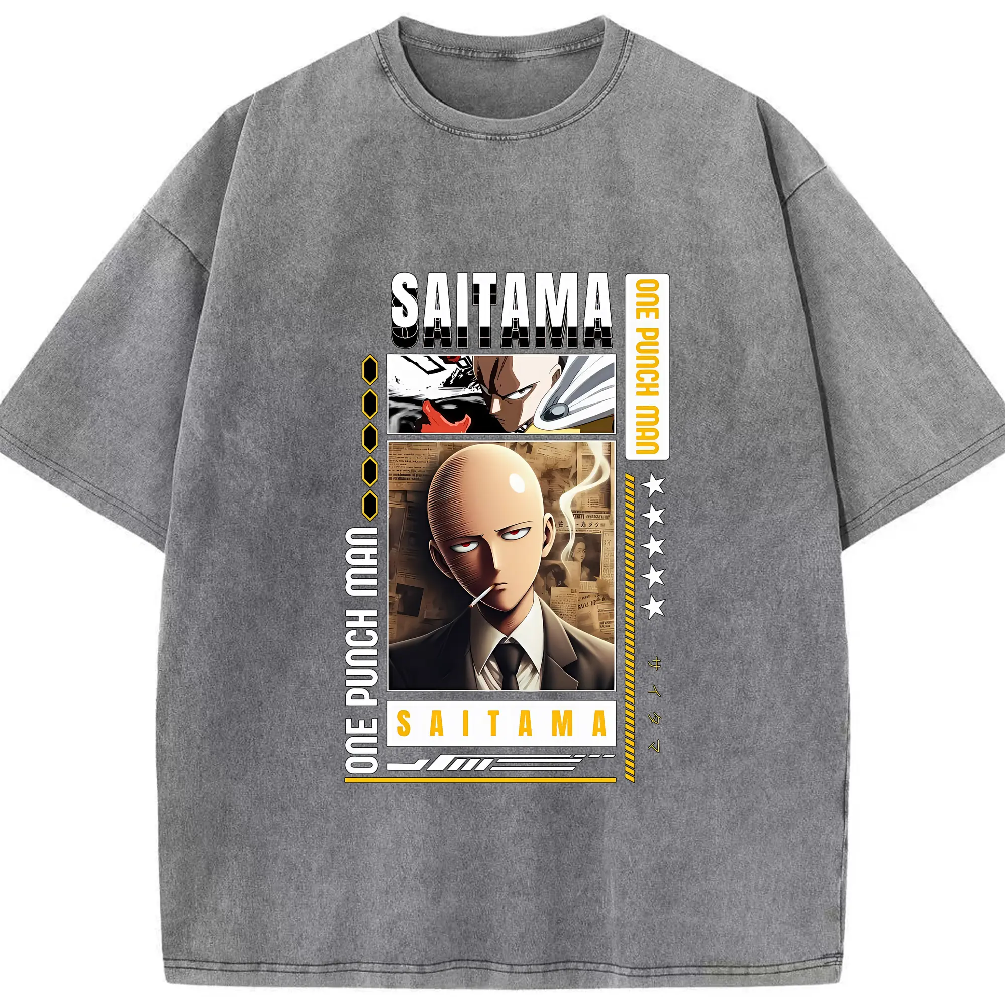 ワンパンマン グッズ サイタマ - 綿100% ヴィンテージ風 半袖Tシャツ ・ 背面プリント ・ 柔らか肌触り ・ 通気性 快適 ・ スポーツ カジュアル 外出用