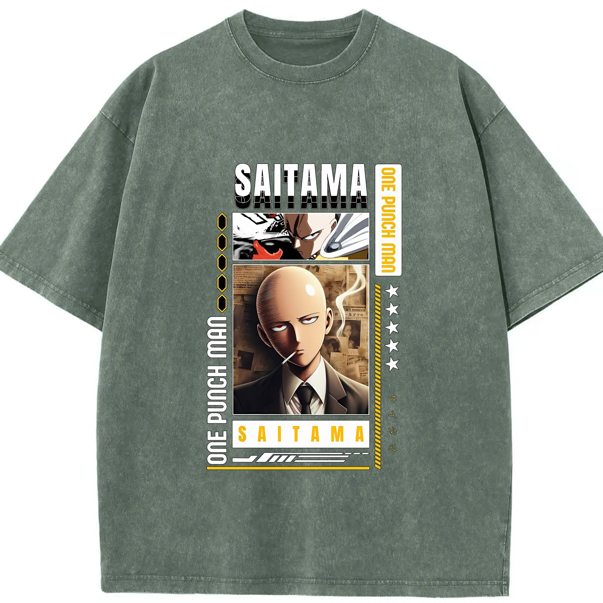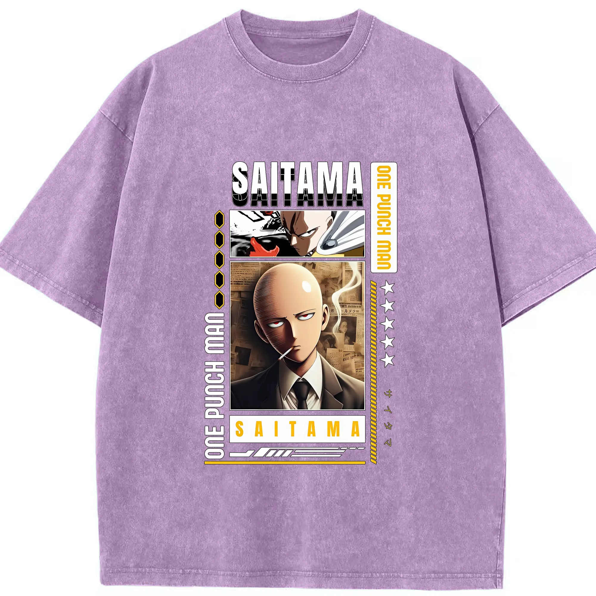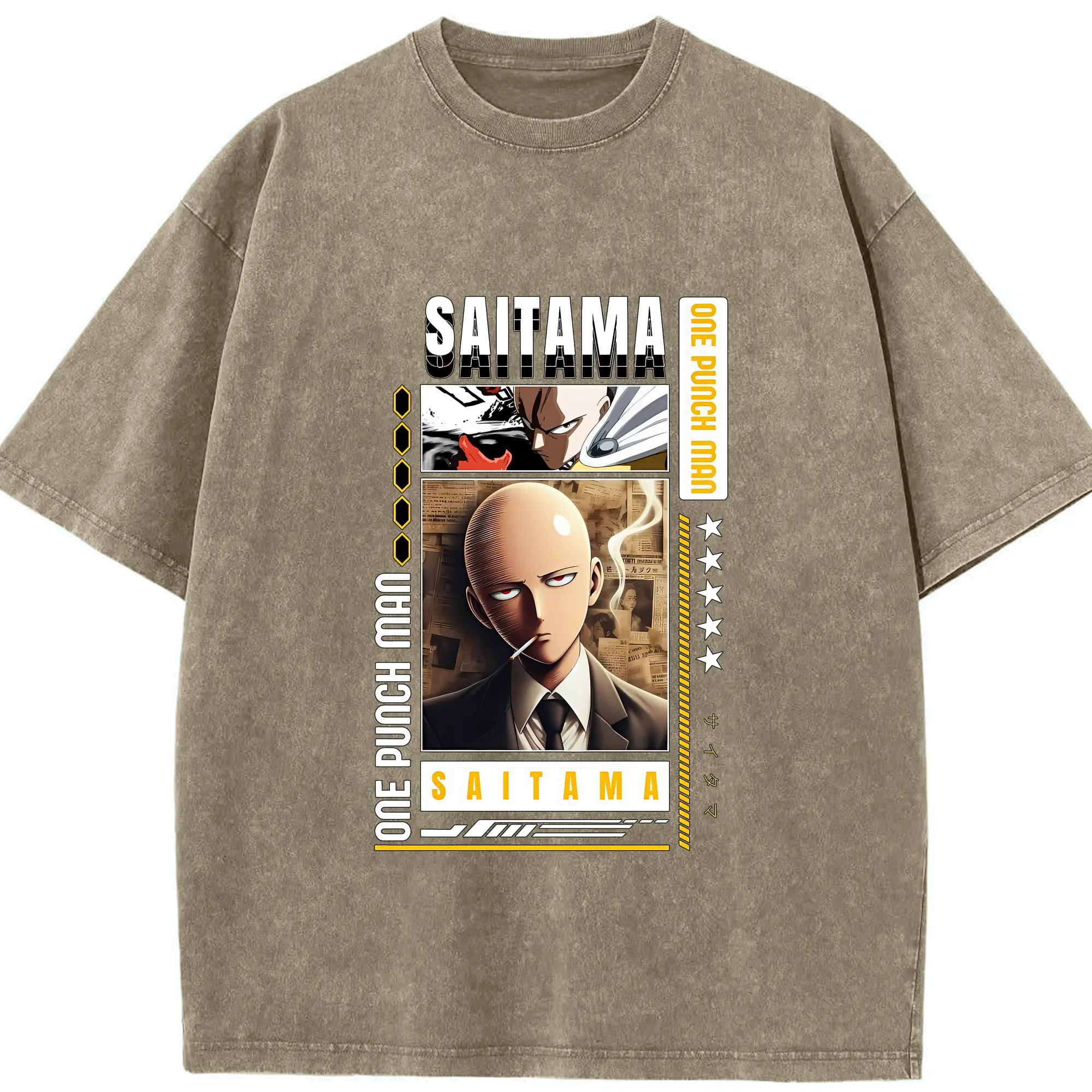 ワンパンマン グッズ サイタマ - 綿100% ヴィンテージ風 半袖Tシャツ ・ 背面プリント ・ 柔らか肌触り ・ 通気性 快適 ・ スポーツ カジュアル 外出用