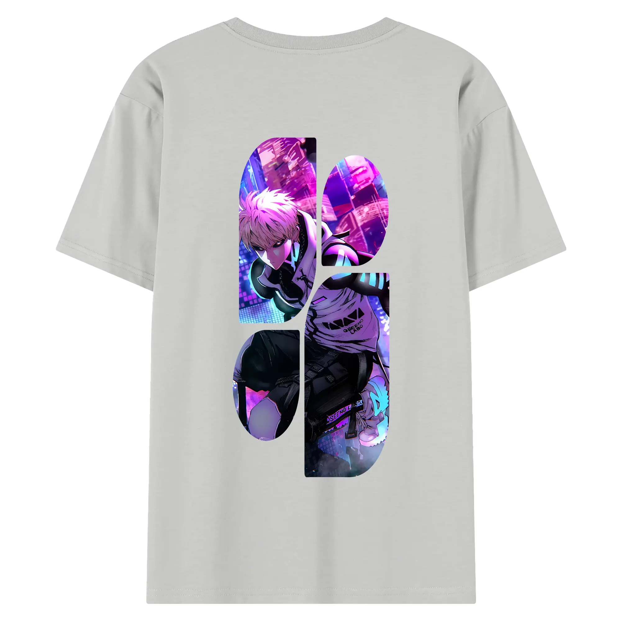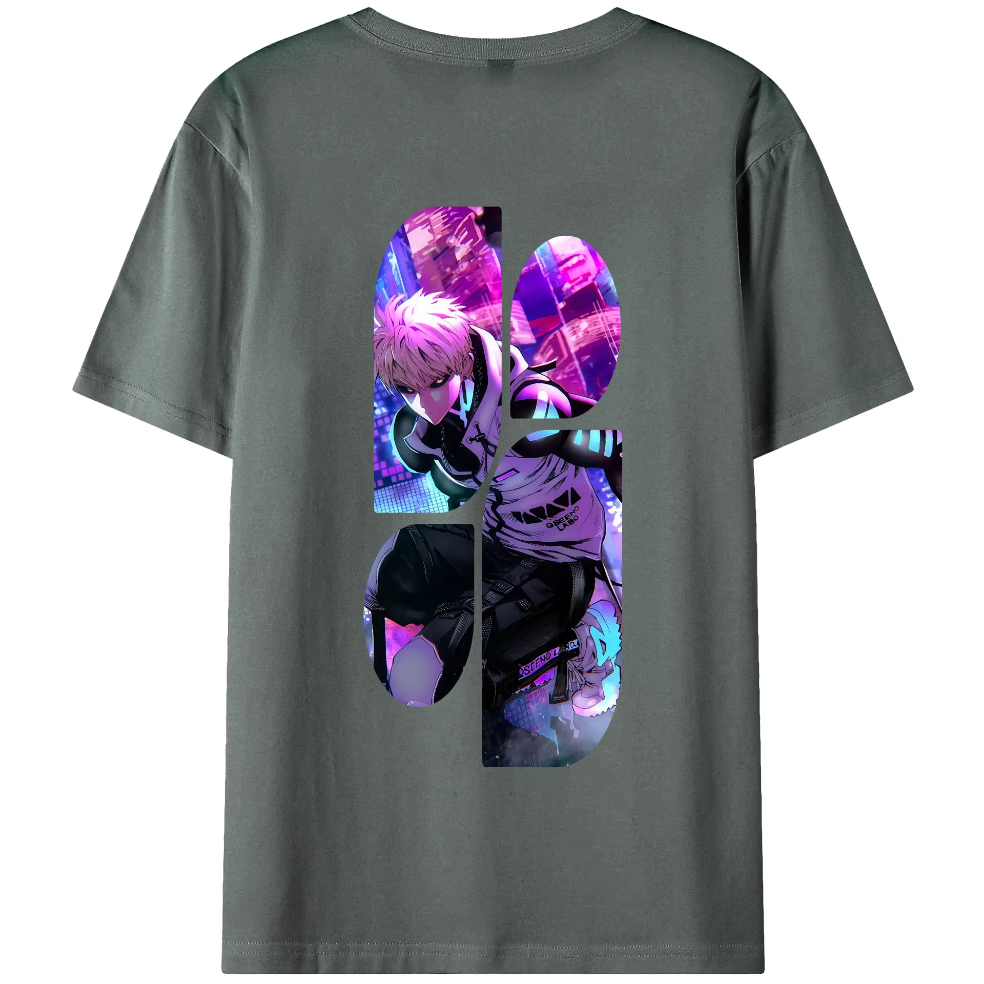 ワンパンマン グッズ ジェノス - 綿100% ヴィンテージ風 半袖Tシャツ ・ 背面プリント ・ 柔らか肌触り ・ 通気性 快適 ・ スポーツ カジュアル 外出用