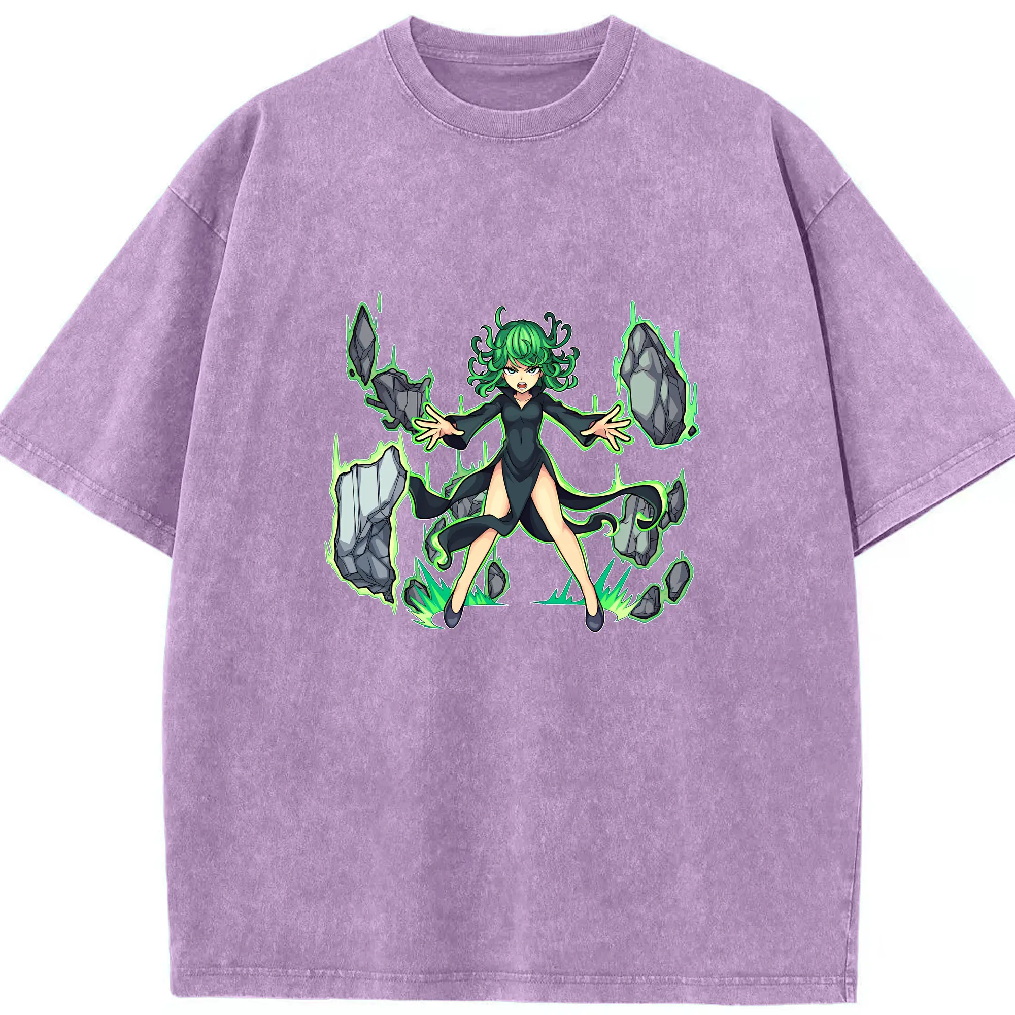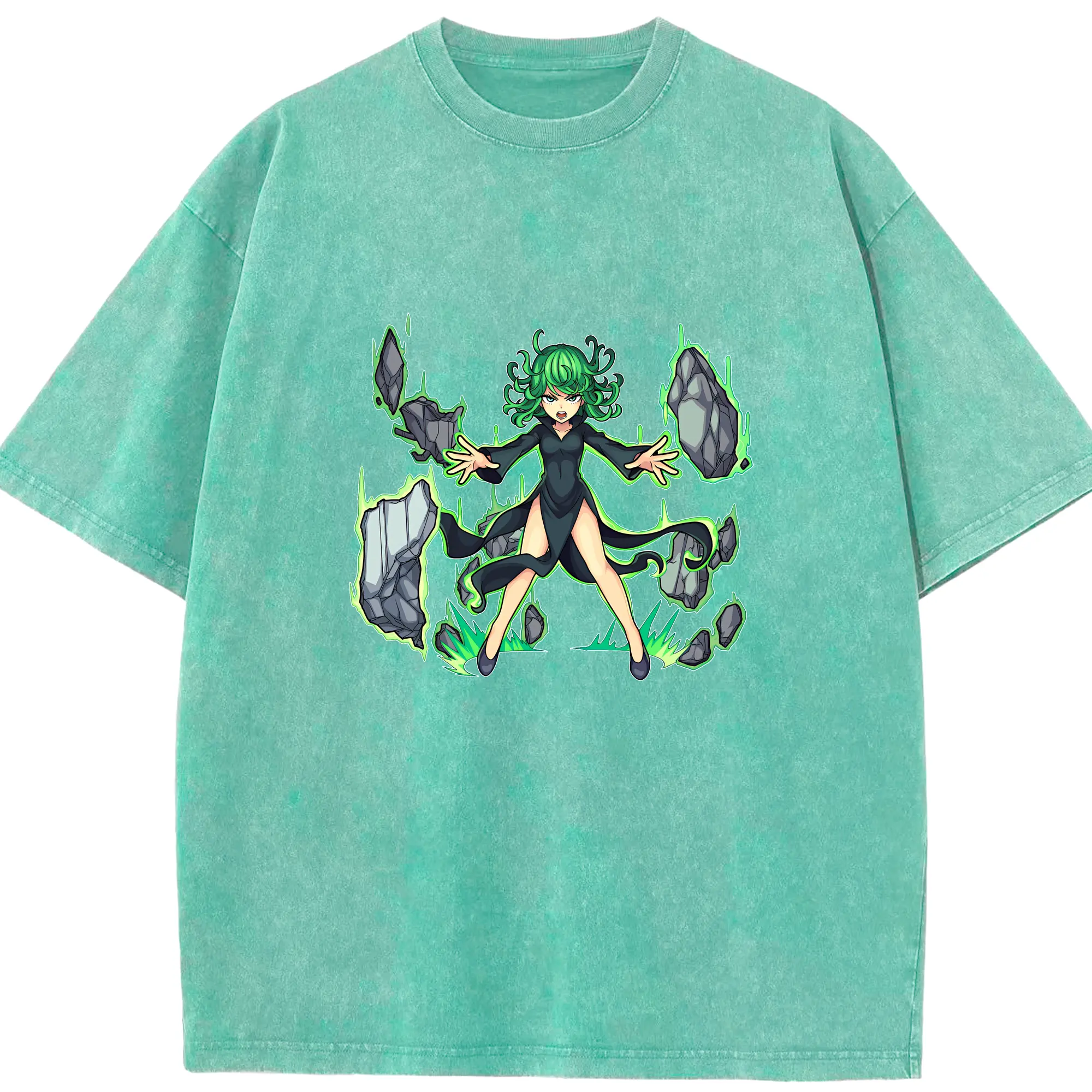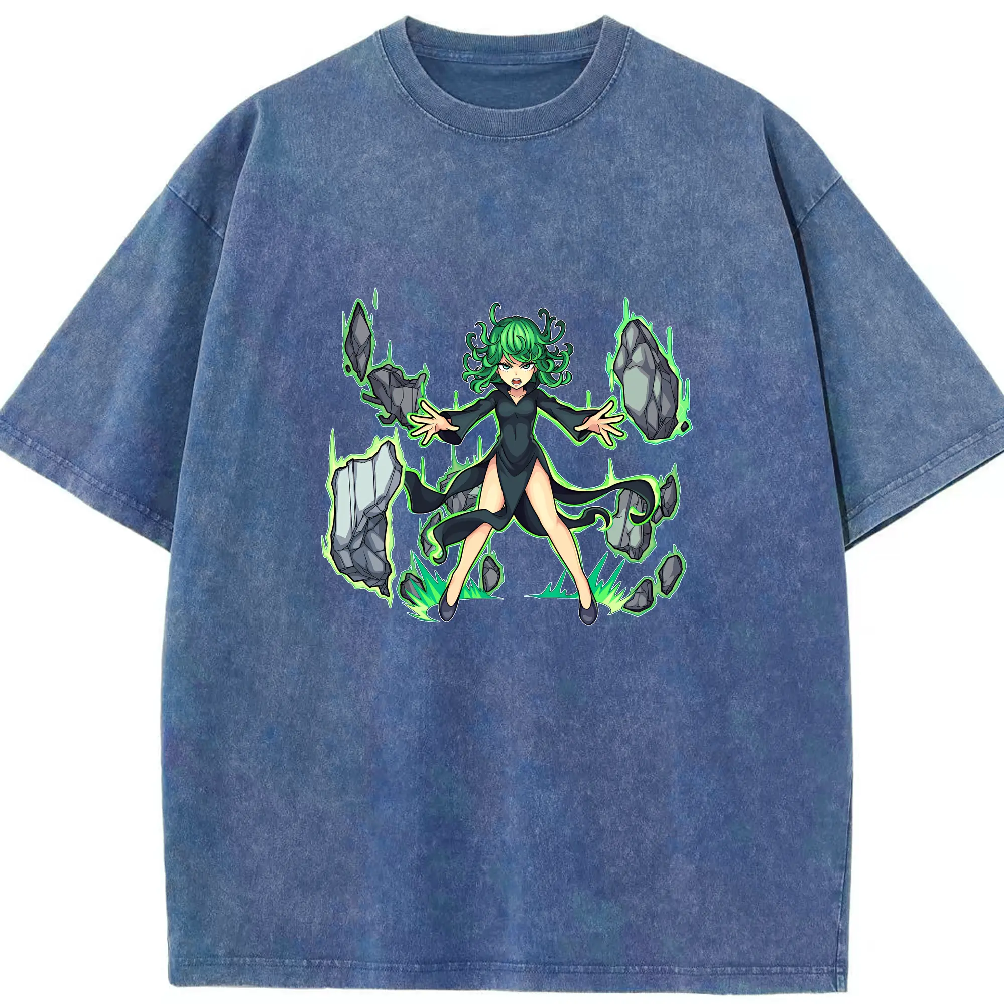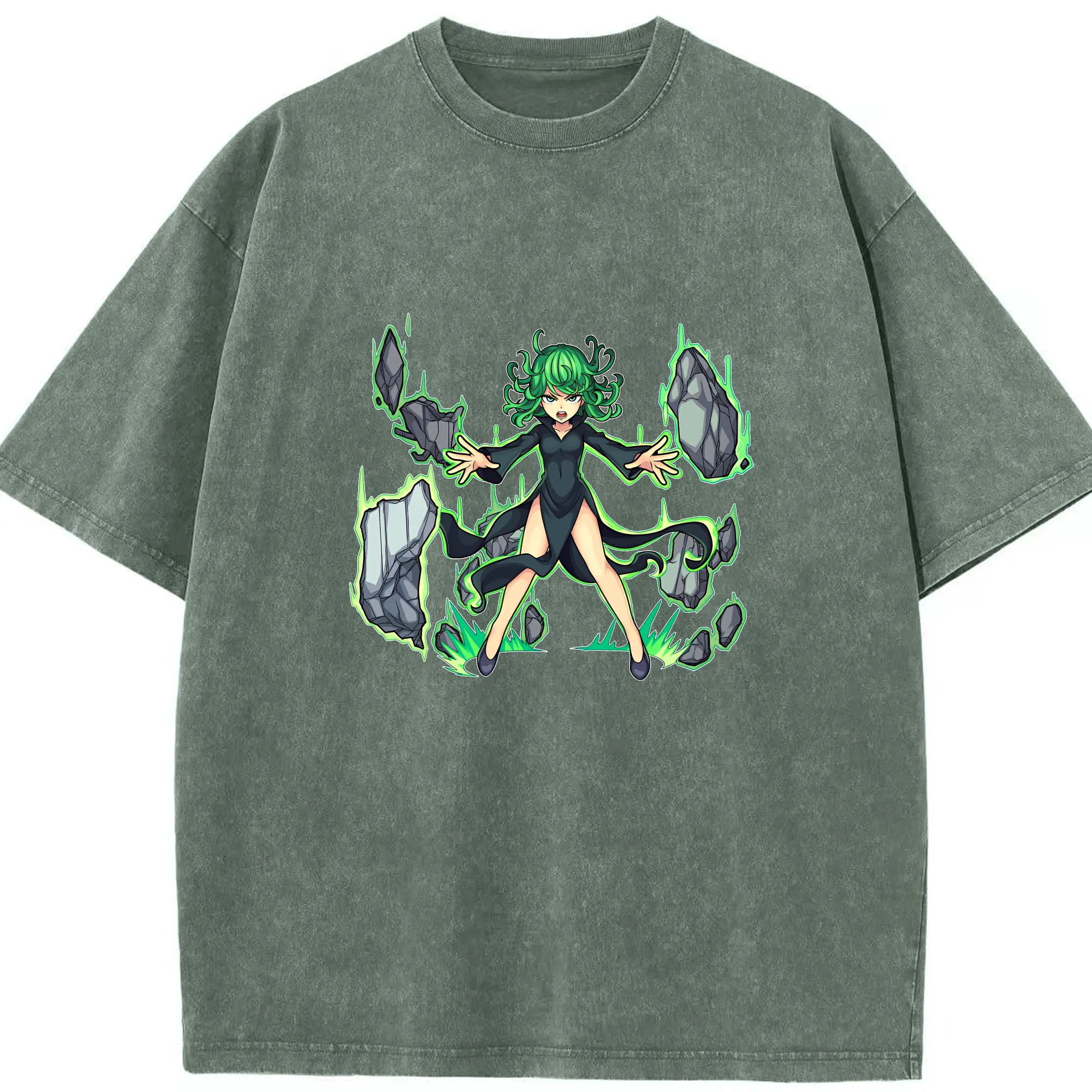 ワンパンマン グッズ 戦慄のタツマキ - 綿100% ヴィンテージ風 半袖Tシャツ ・ 背面プリント ・ 柔らか肌触り ・ 通気性 快適 ・ スポーツ カジュアル 外出用