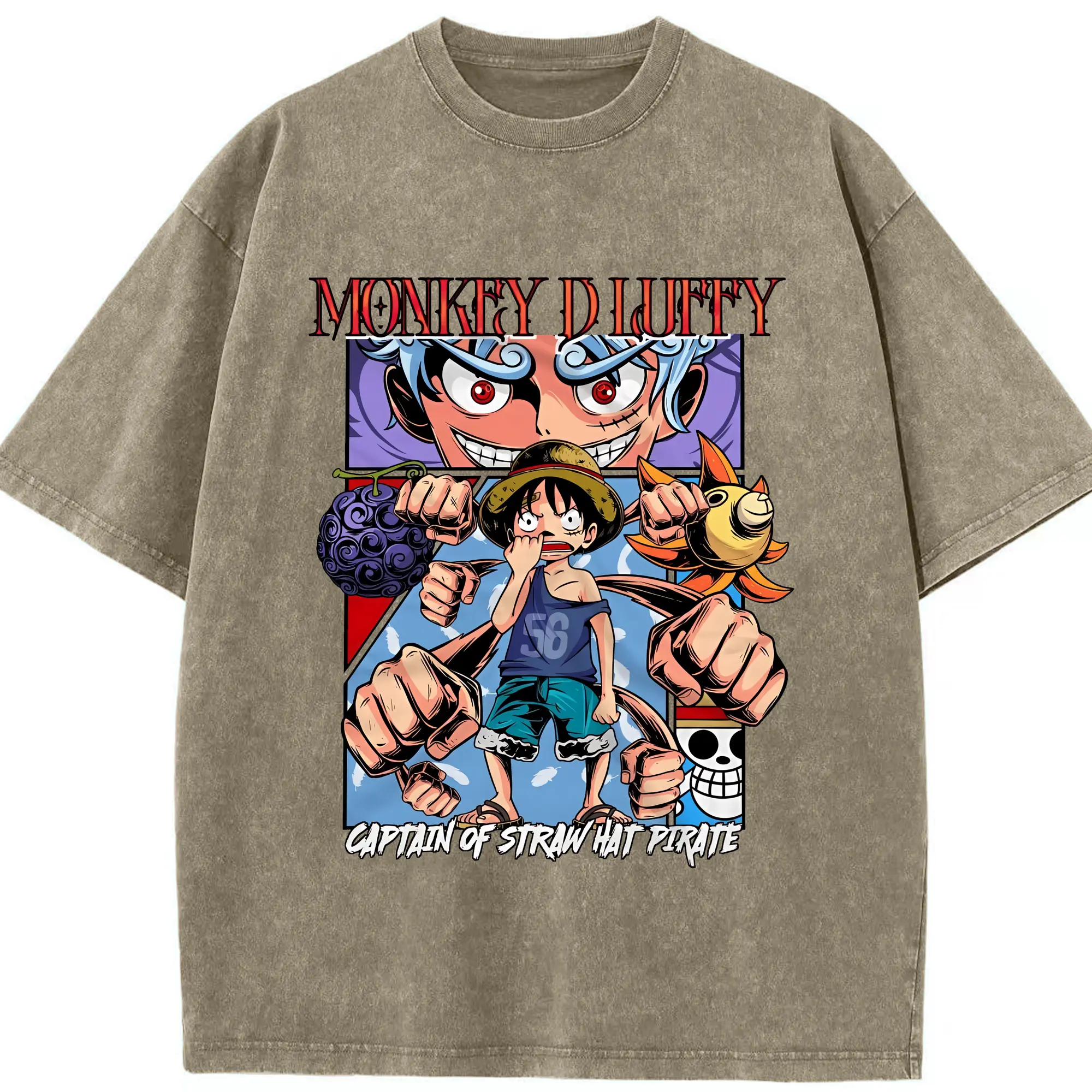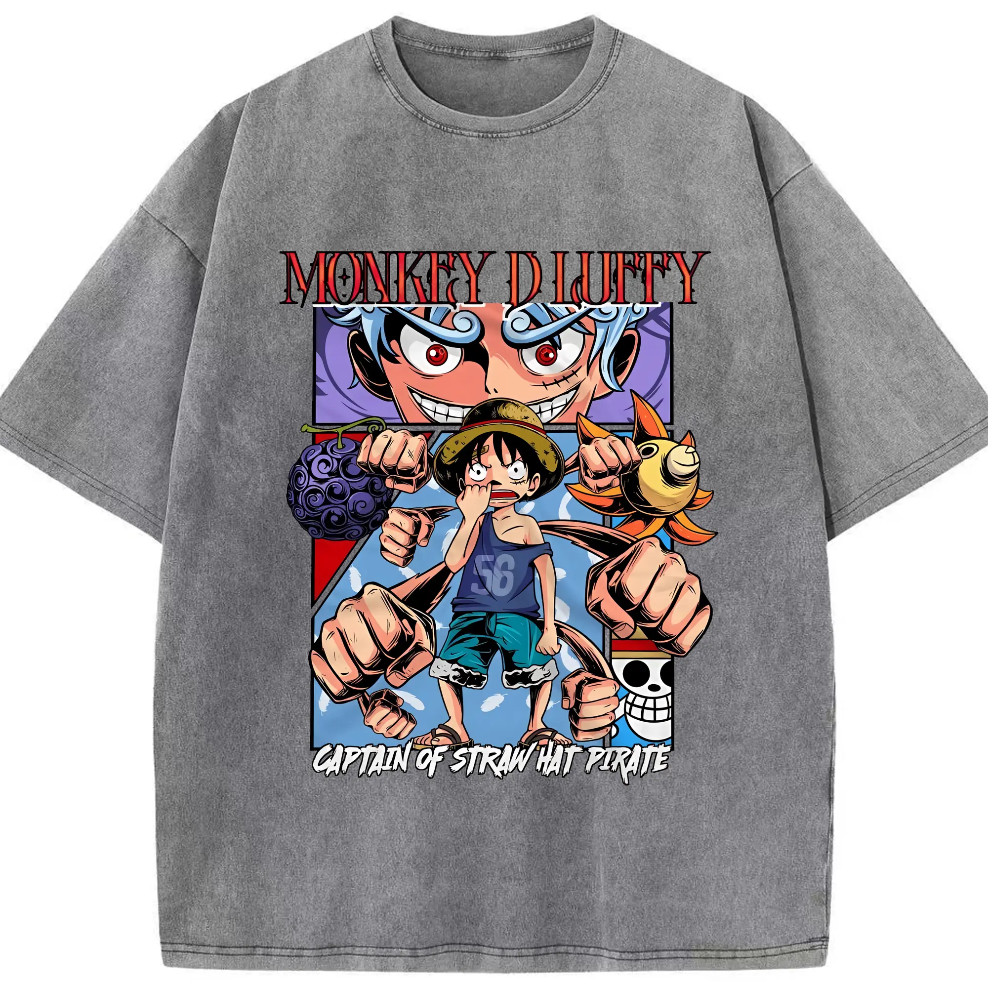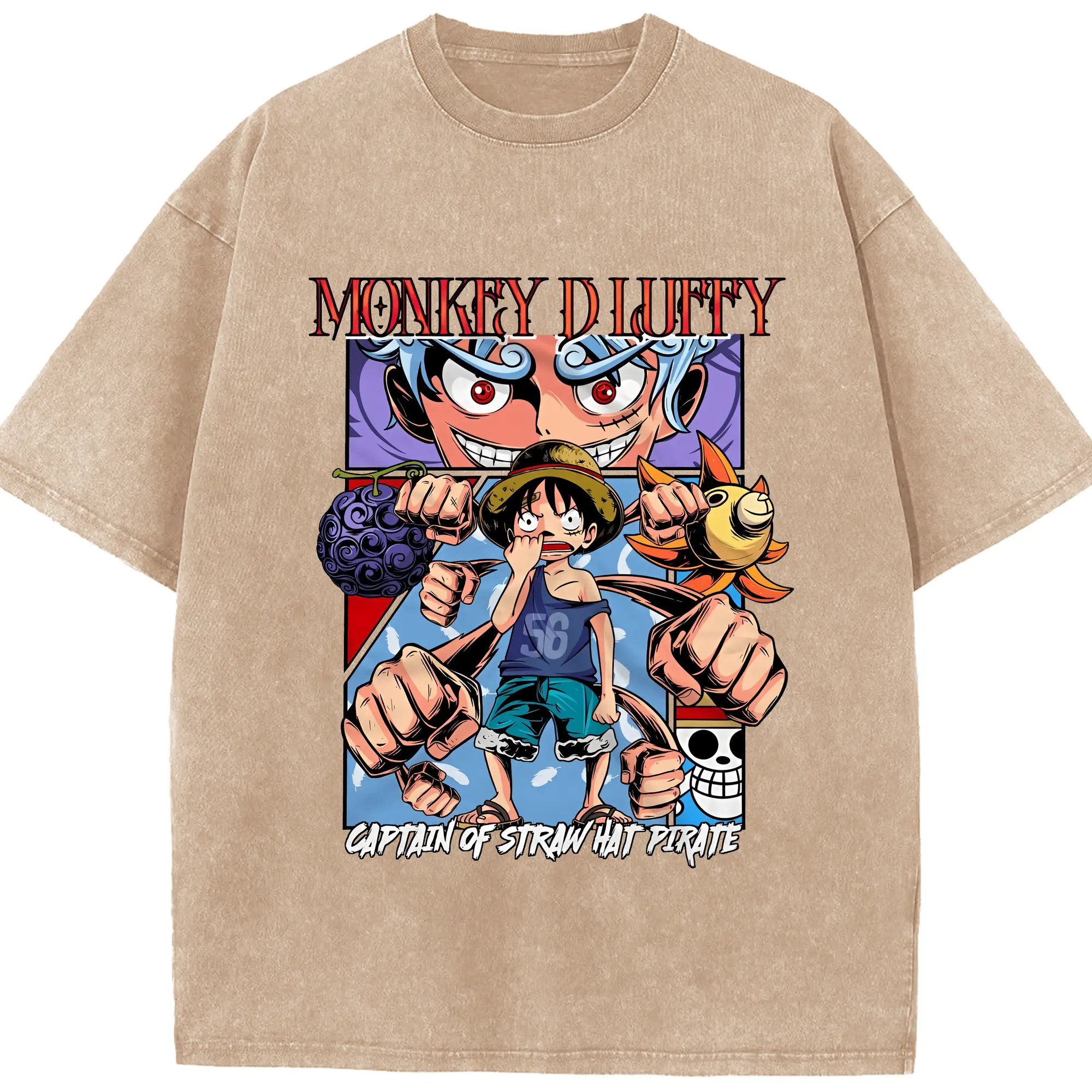 ワンピース グッズ モンキー・D・ルフィ - 綿100% ヴィンテージ風 半袖Tシャツ ・ 背面プリント ・ 柔らか肌触り ・ 通気性 快適 ・ スポーツ カジュアル 外出用