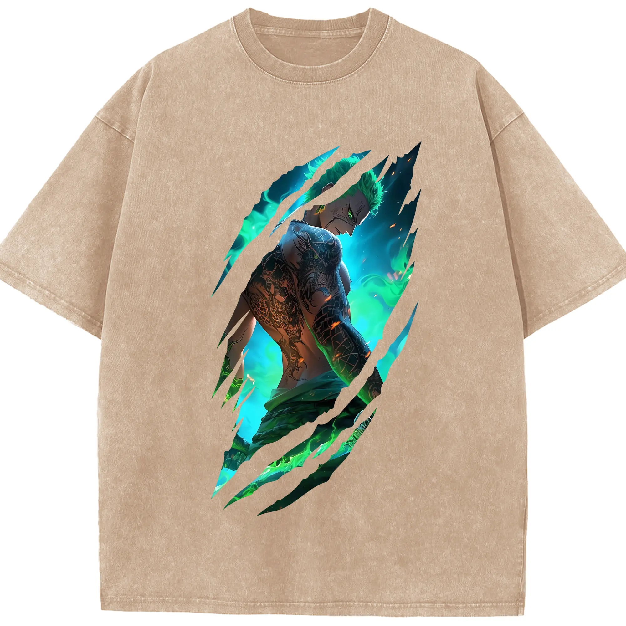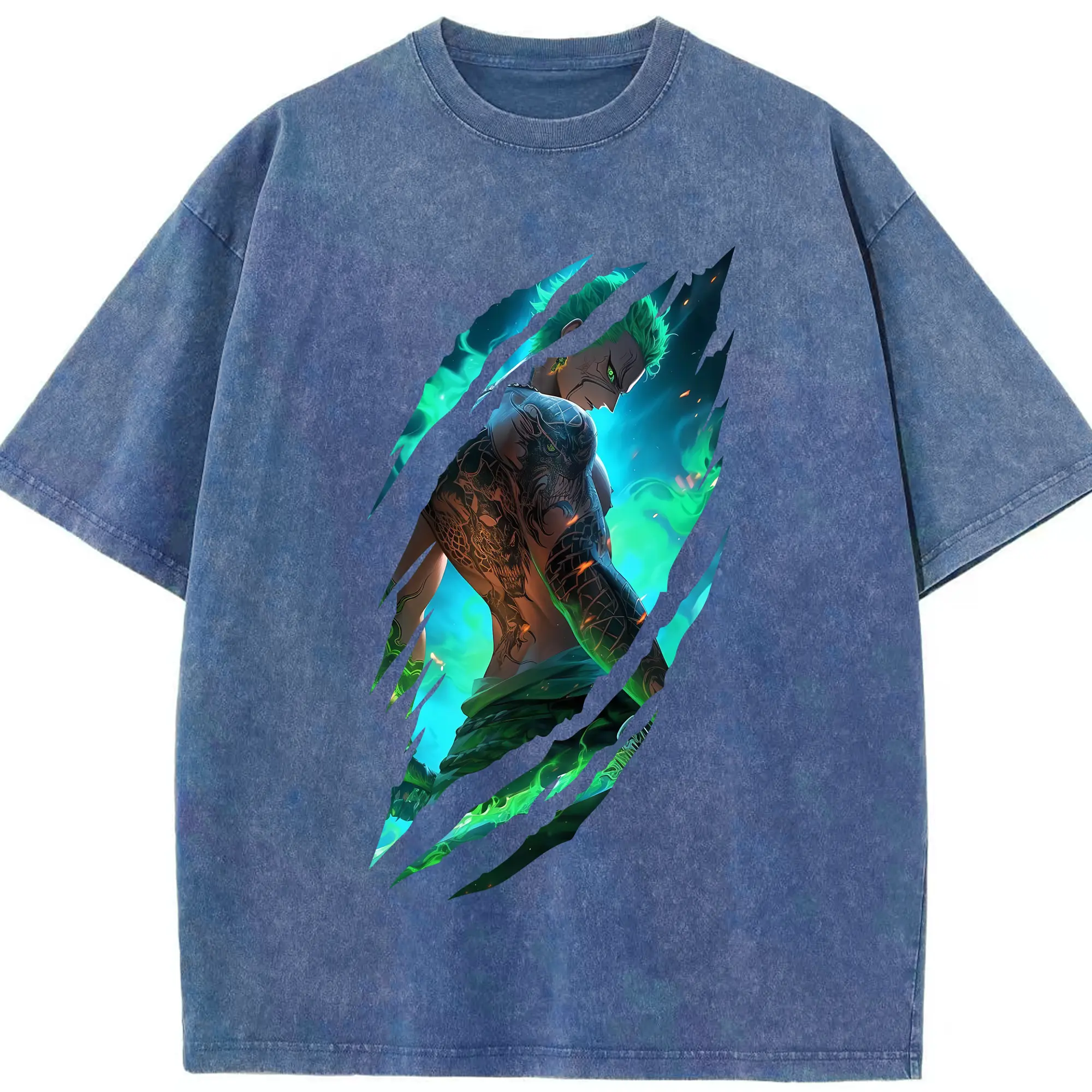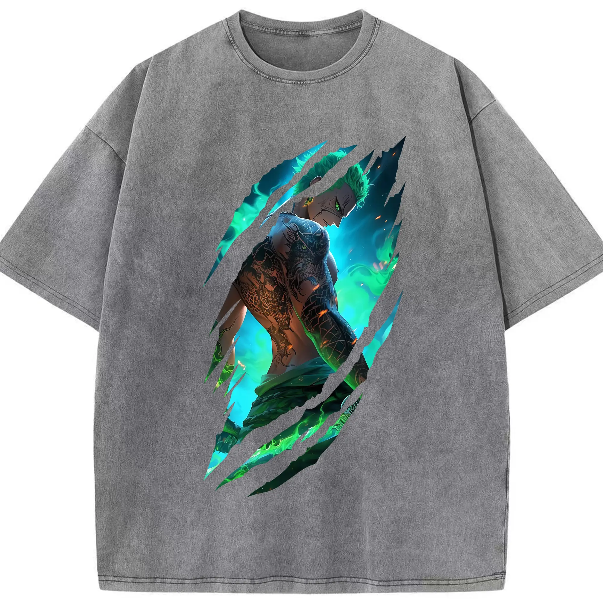ワンピース グッズ ロロノア・ゾロ - 綿100% ヴィンテージ風 半袖Tシャツ ・ 背面プリント ・ 柔らか肌触り ・ 通気性 快適 ・ スポーツ カジュアル 外出用