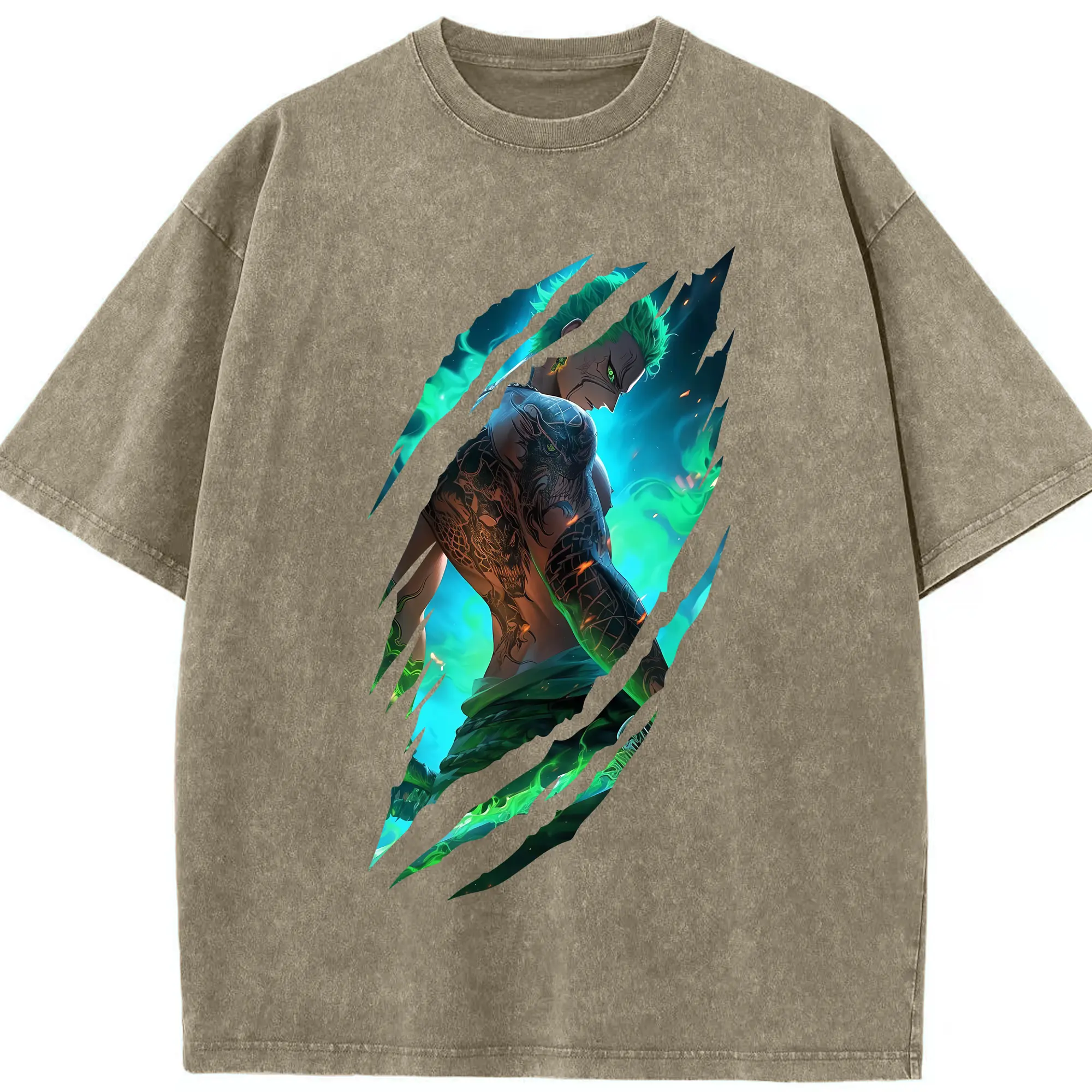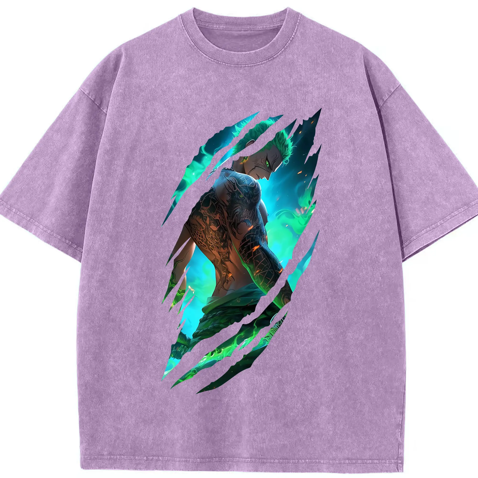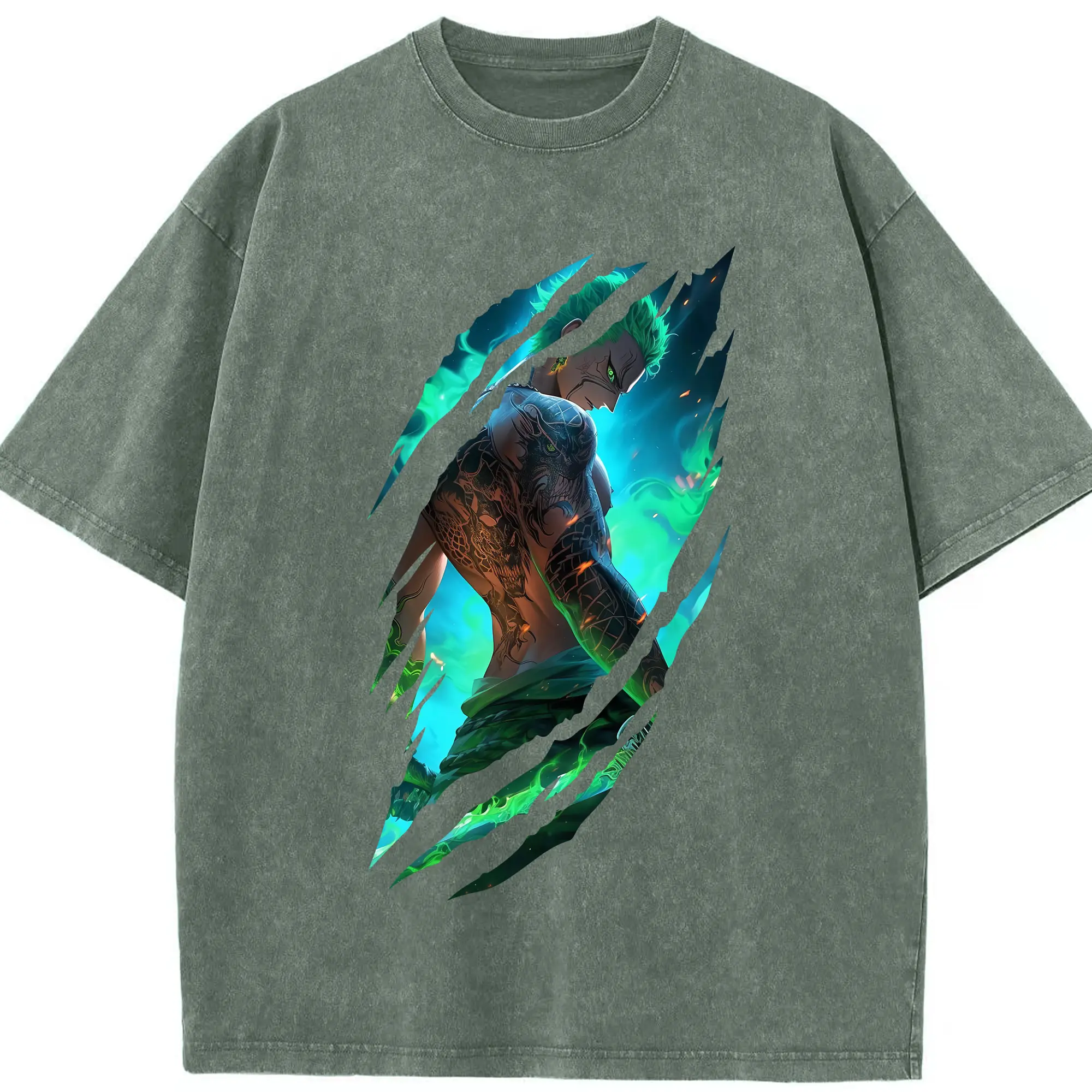 ワンピース グッズ ロロノア・ゾロ - 綿100% ヴィンテージ風 半袖Tシャツ ・ 背面プリント ・ 柔らか肌触り ・ 通気性 快適 ・ スポーツ カジュアル 外出用