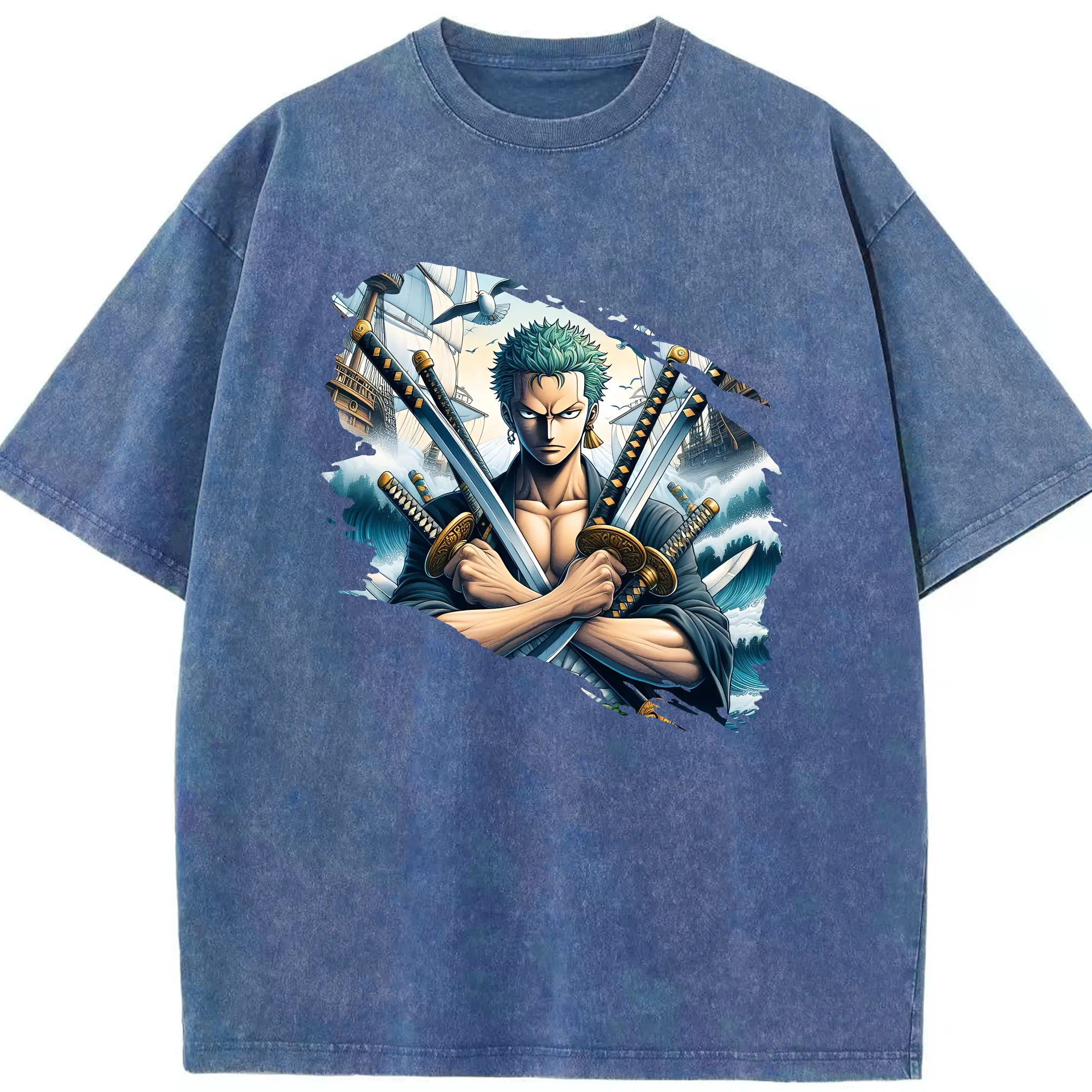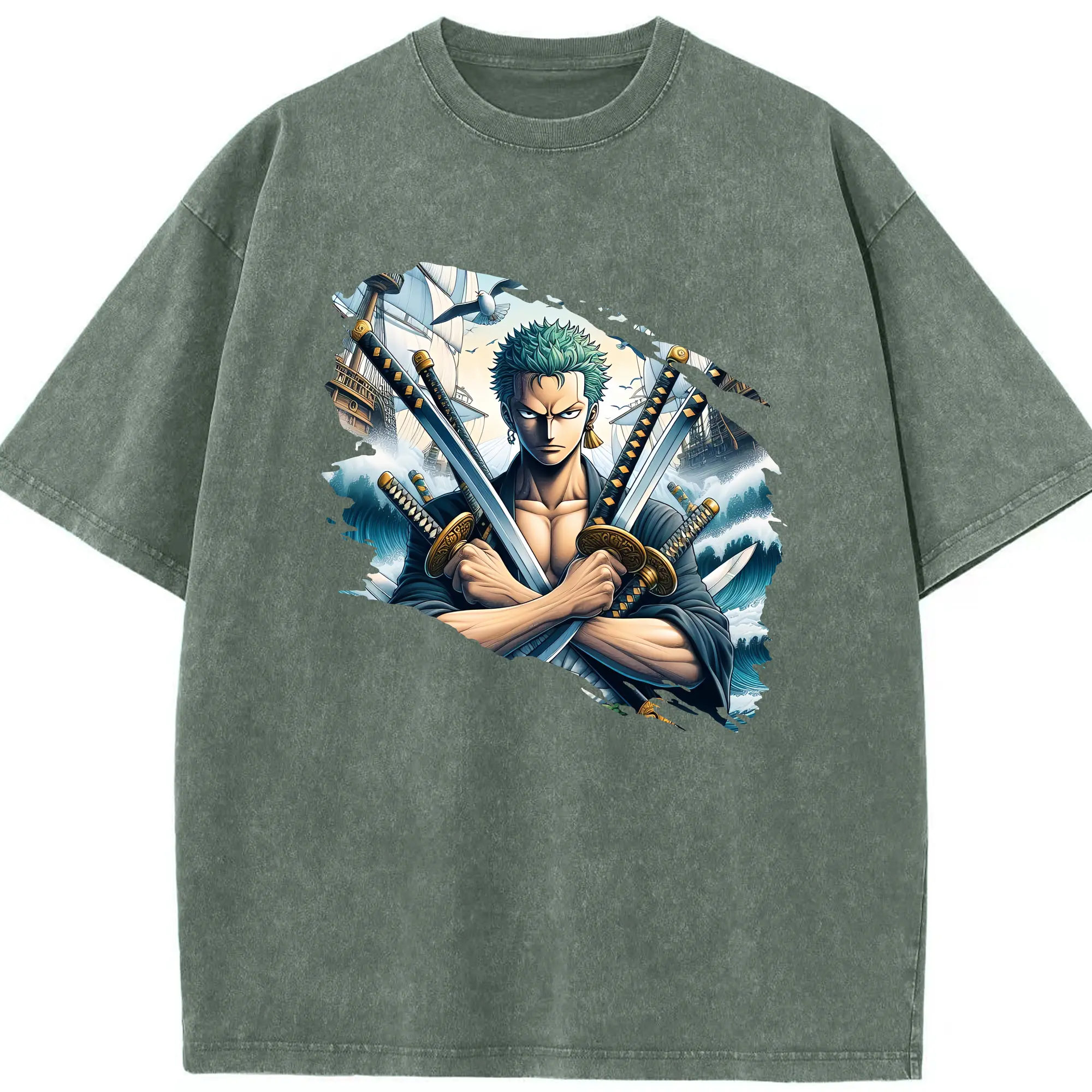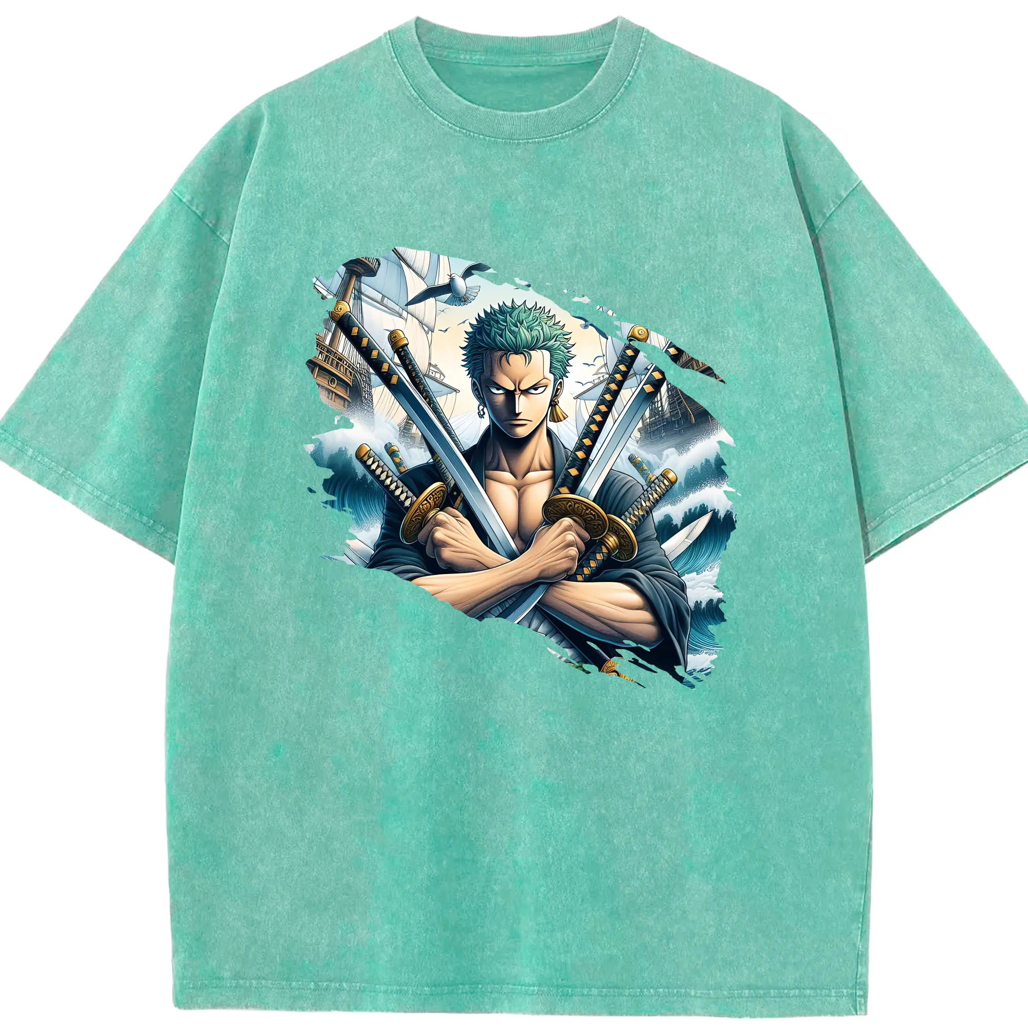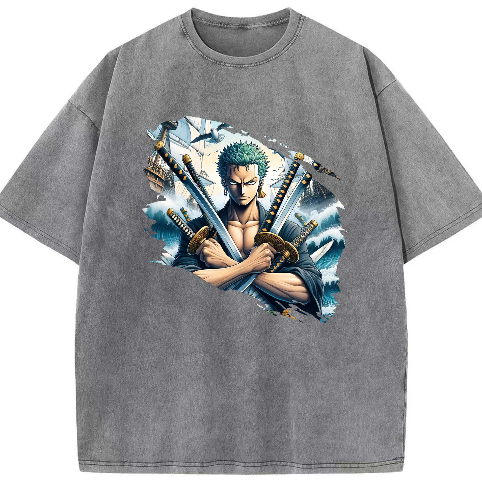 ワンピース グッズ ロロノア・ゾロ - 綿100% ヴィンテージ風 半袖Tシャツ ・ 背面プリント ・ 柔らか肌触り ・ 通気性 快適 ・ スポーツ カジュアル 外出用