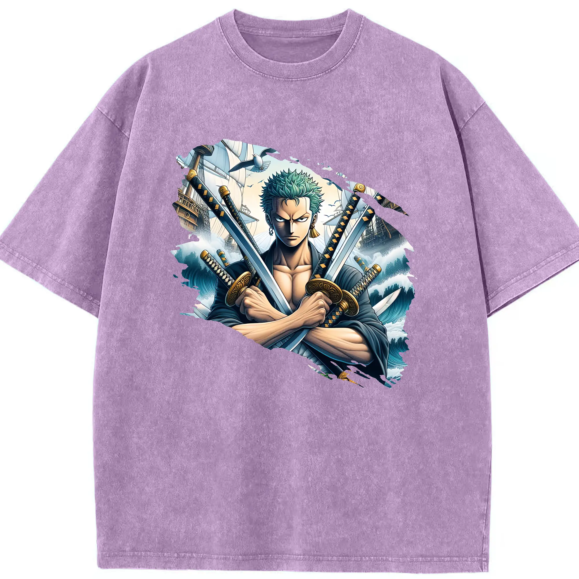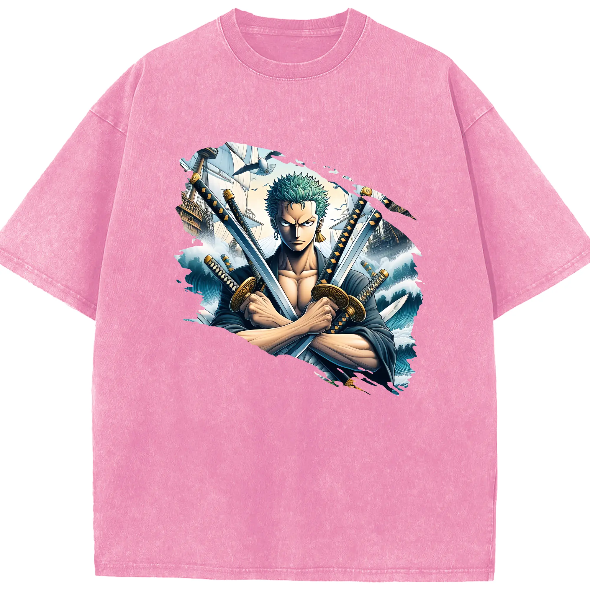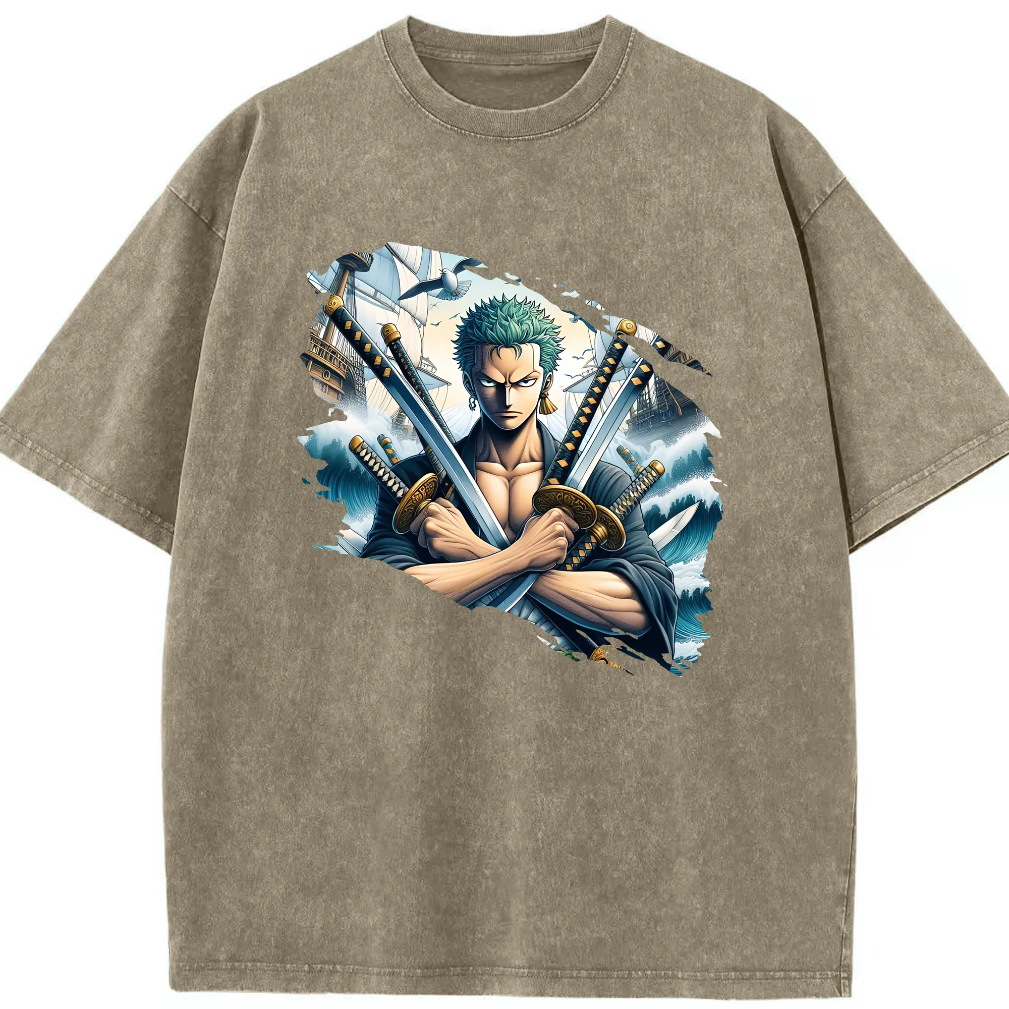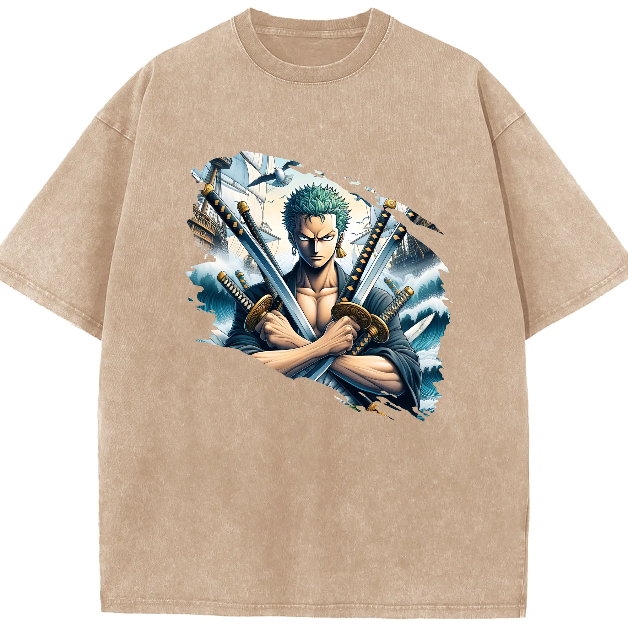 ワンピース グッズ ロロノア・ゾロ - 綿100% ヴィンテージ風 半袖Tシャツ ・ 背面プリント ・ 柔らか肌触り ・ 通気性 快適 ・ スポーツ カジュアル 外出用