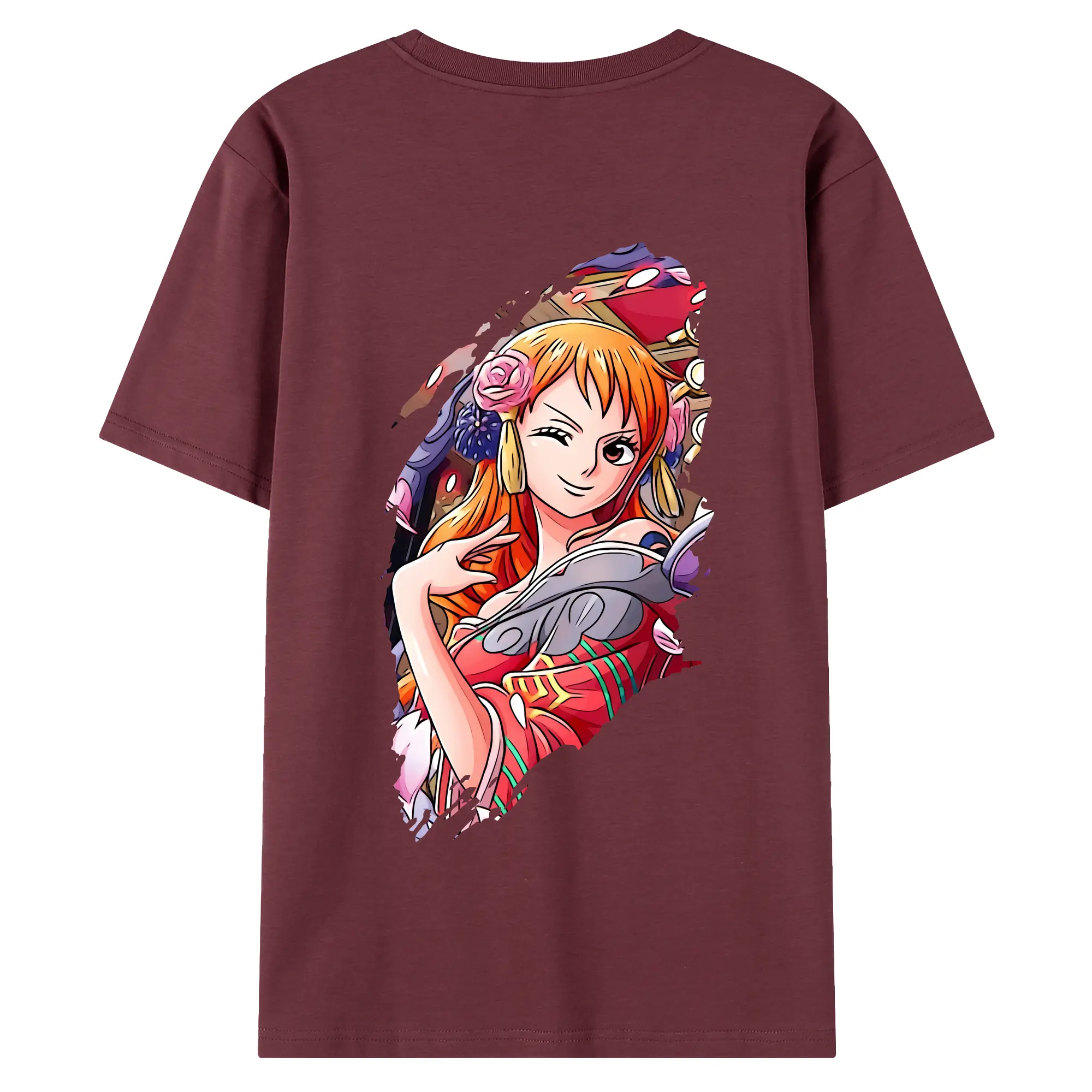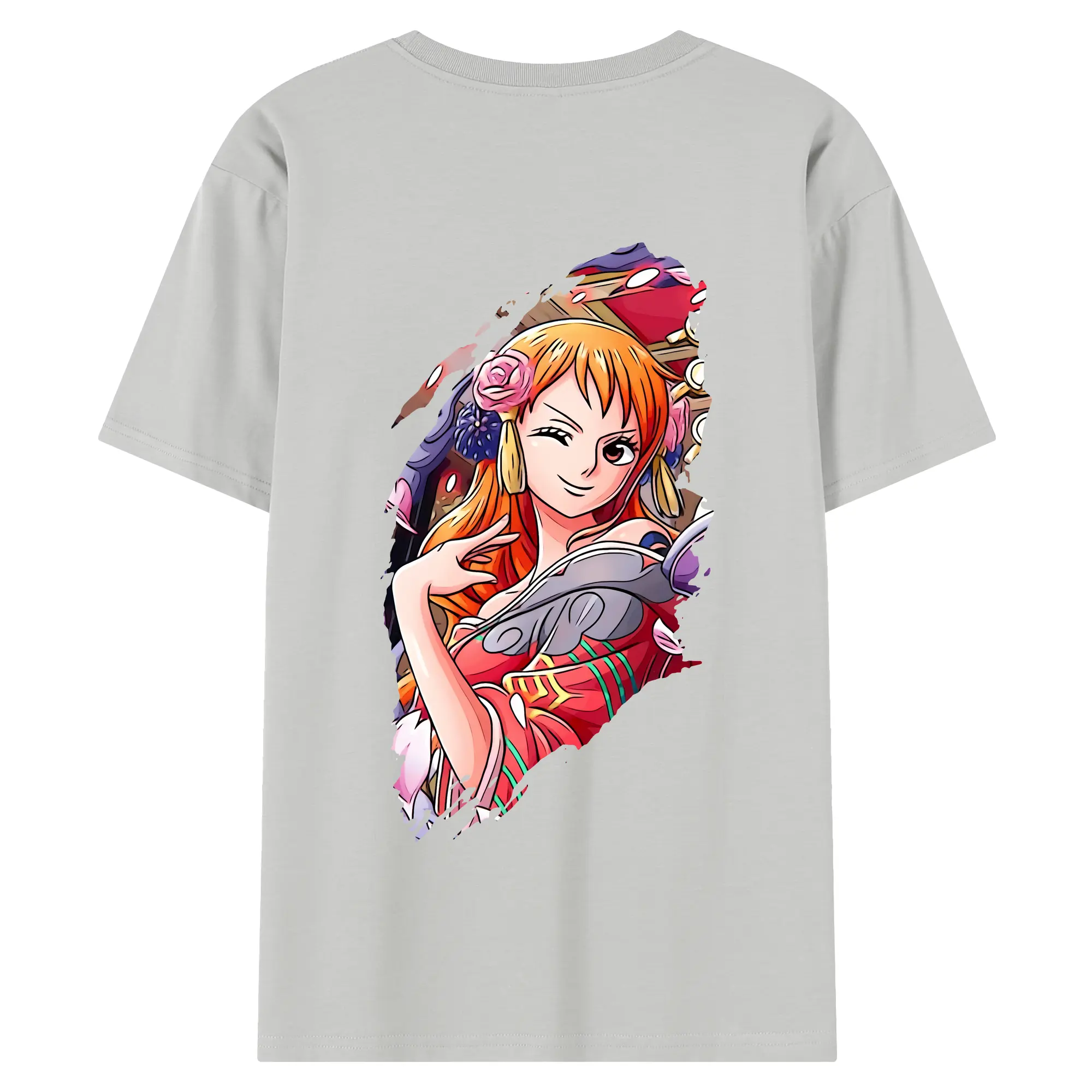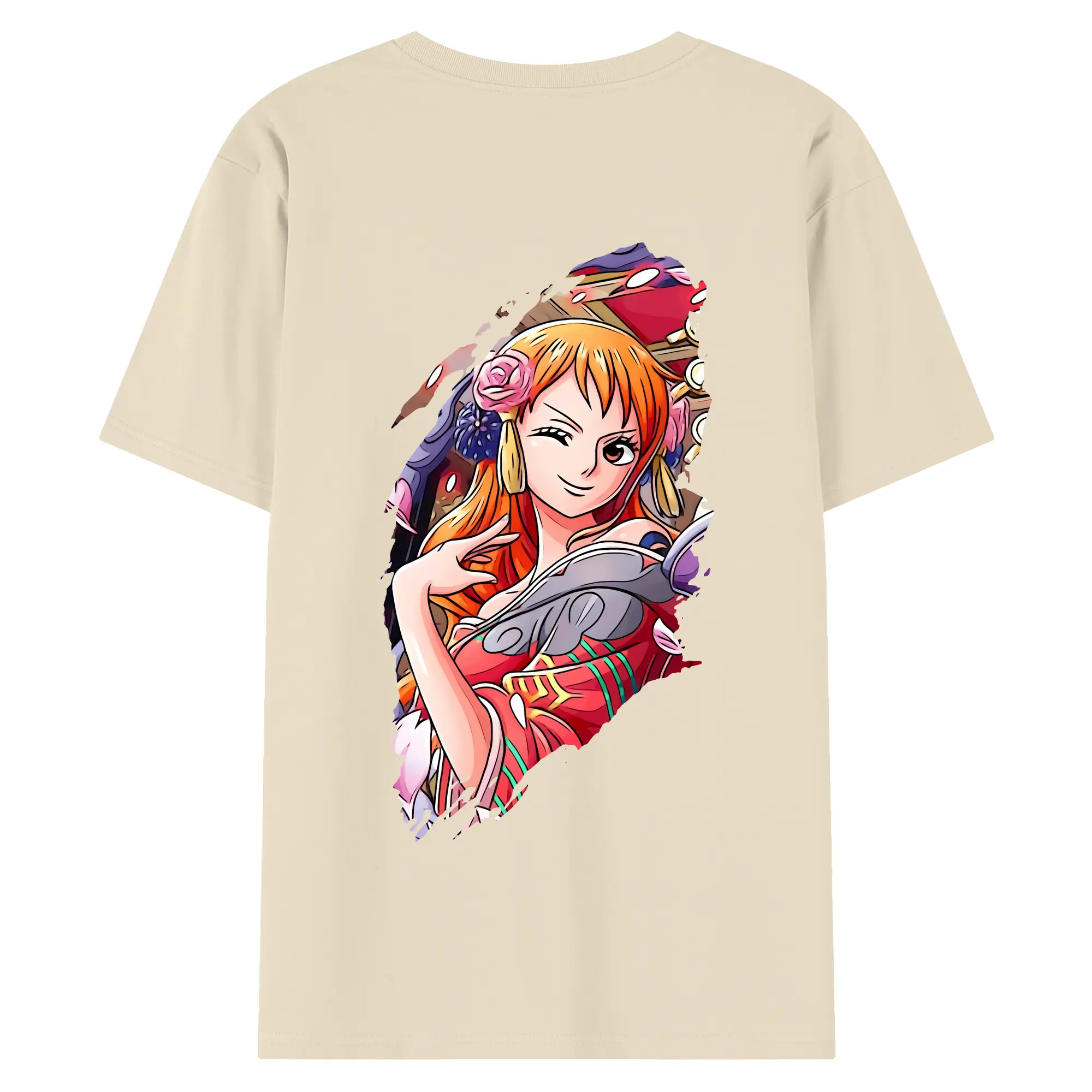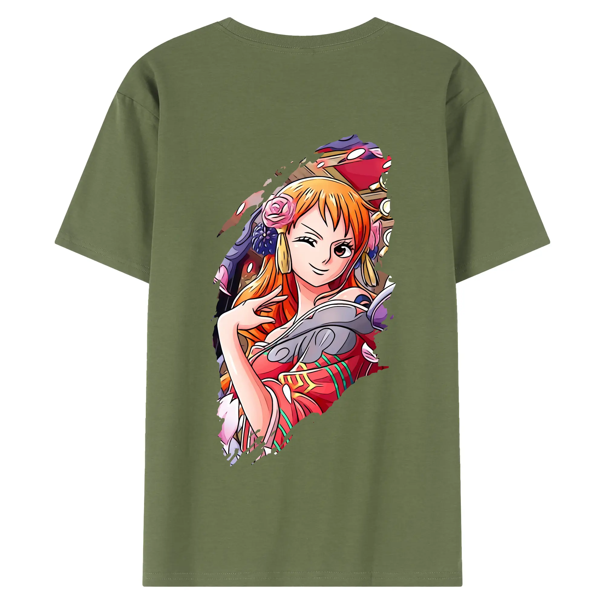 ワンピース グッズ ナミ - 綿100% ヴィンテージ風 半袖Tシャツ ・ 背面プリント ・ 柔らか肌触り ・ 通気性 快適 ・ スポーツ カジュアル 外出用