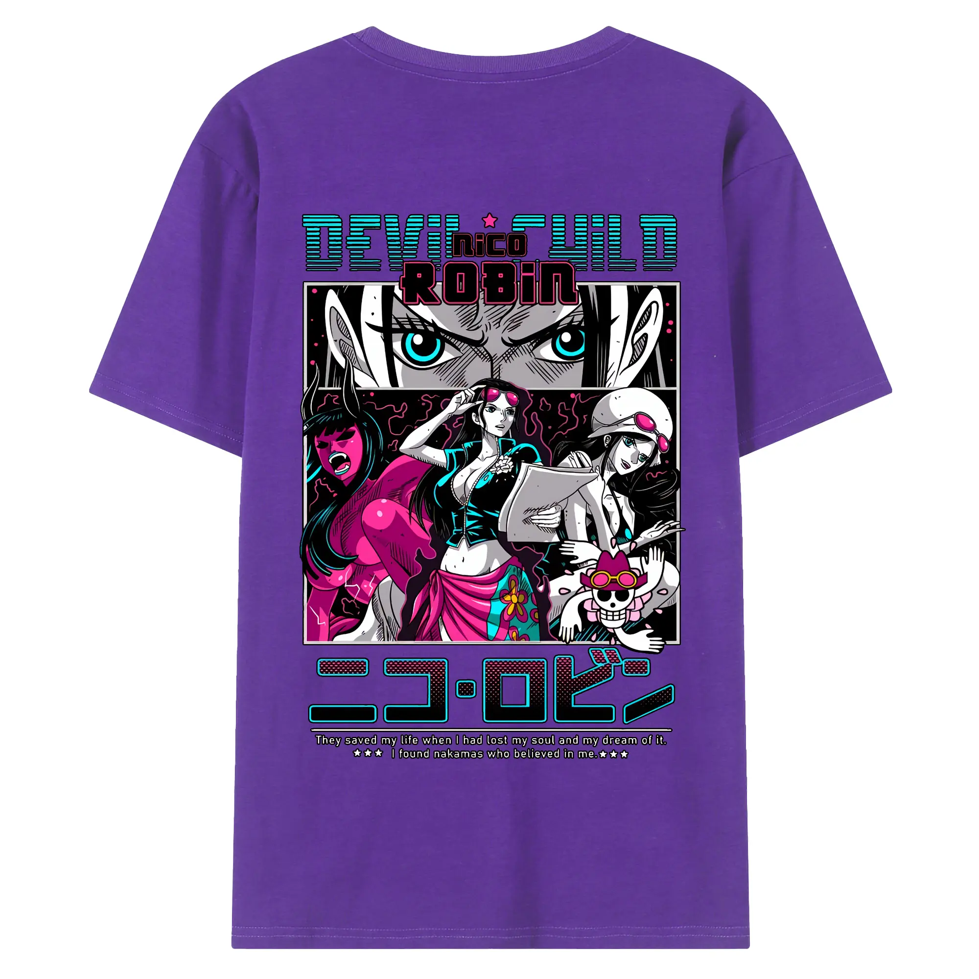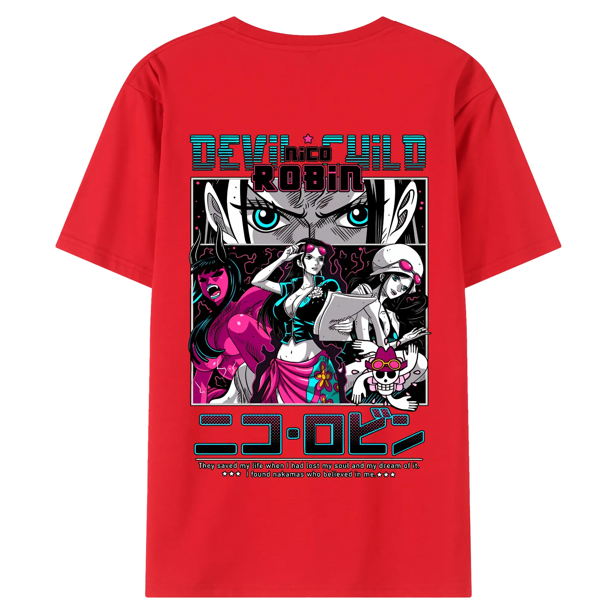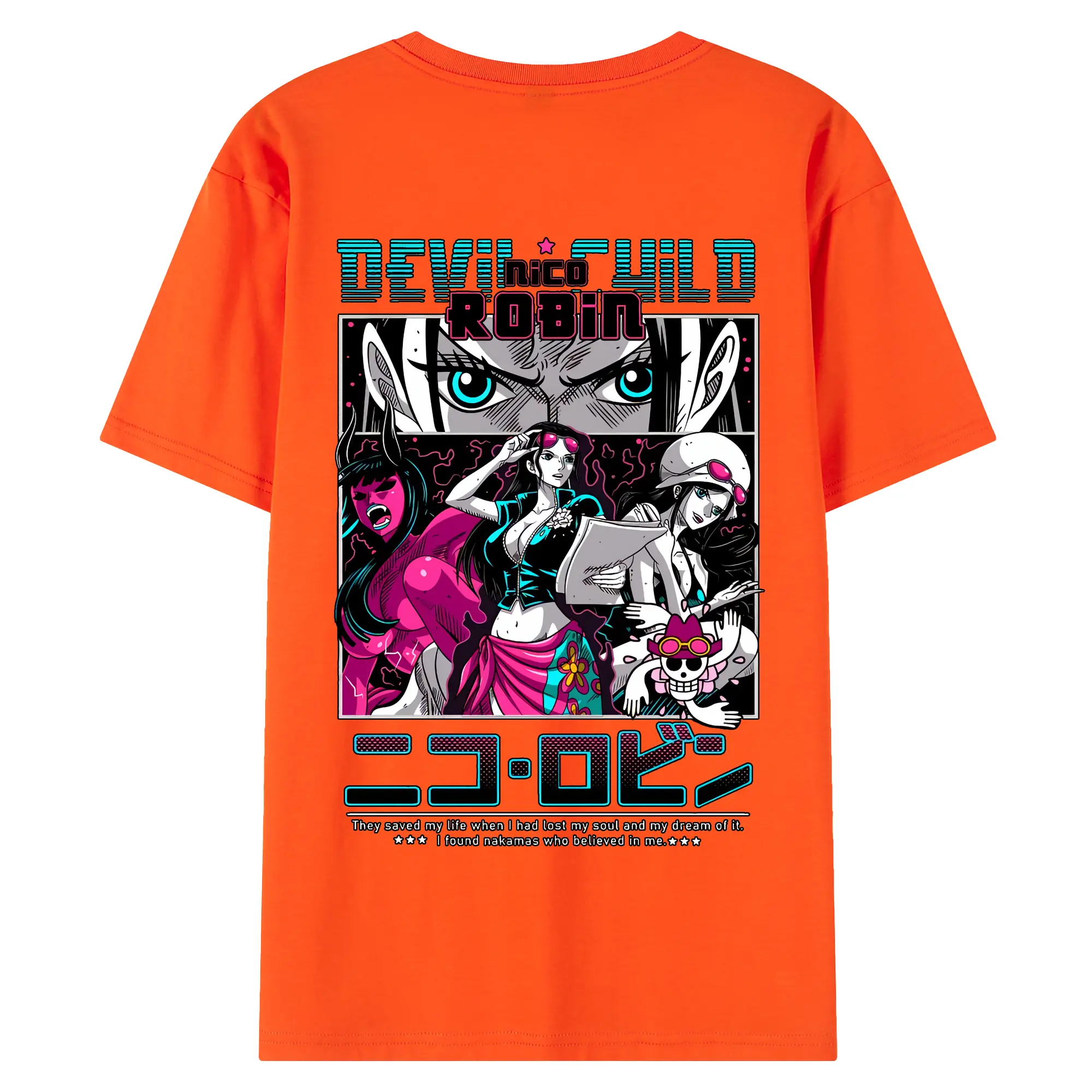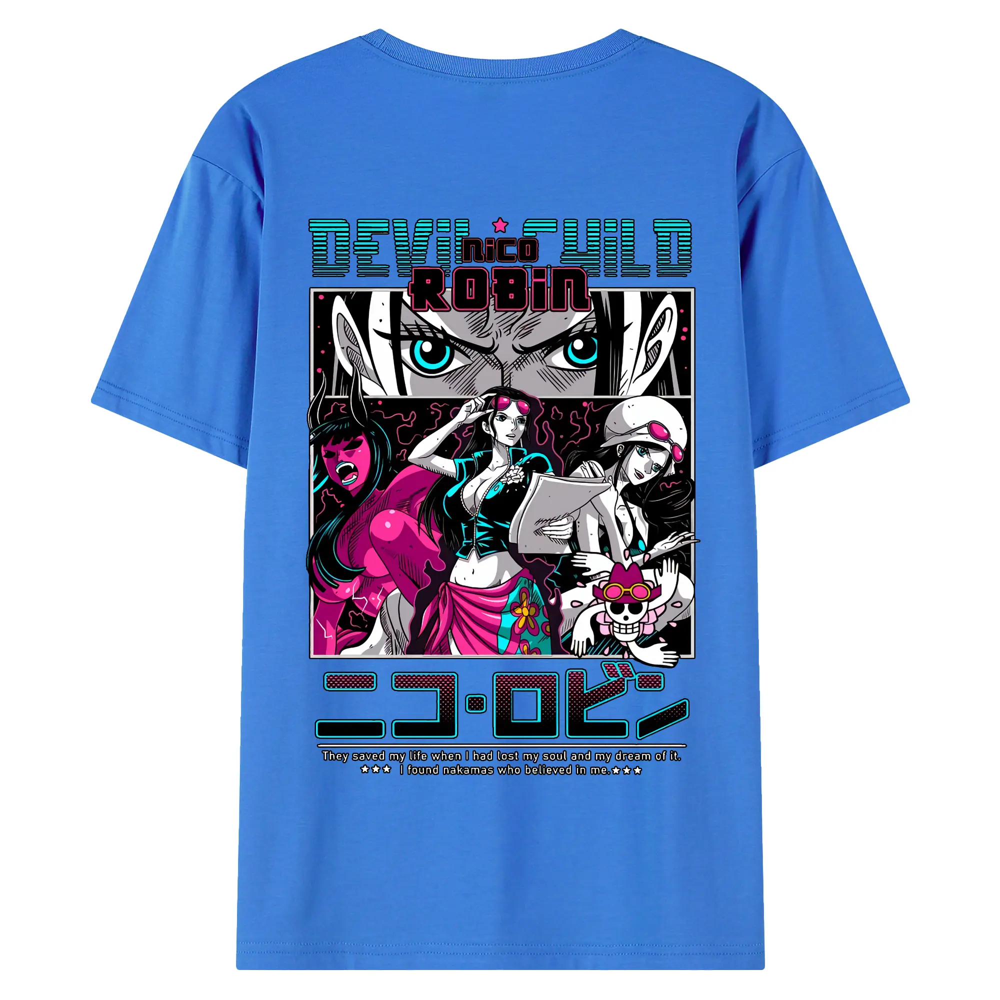 ワンピース グッズ ニコ・ロビン - 綿100% ヴィンテージ風 半袖Tシャツ ・ 背面プリント ・ 柔らか肌触り ・ 通気性 快適 ・ スポーツ カジュアル 外出用